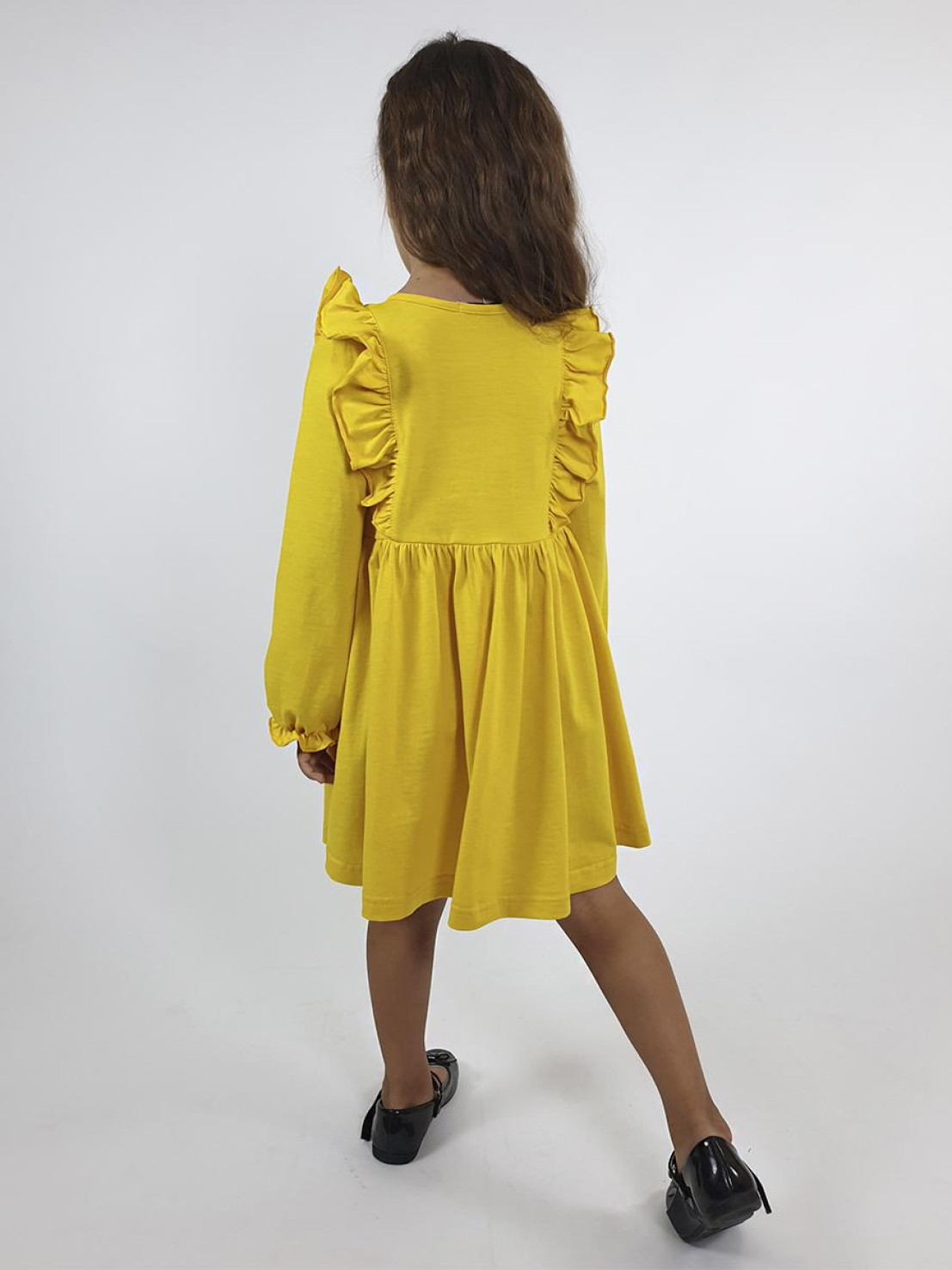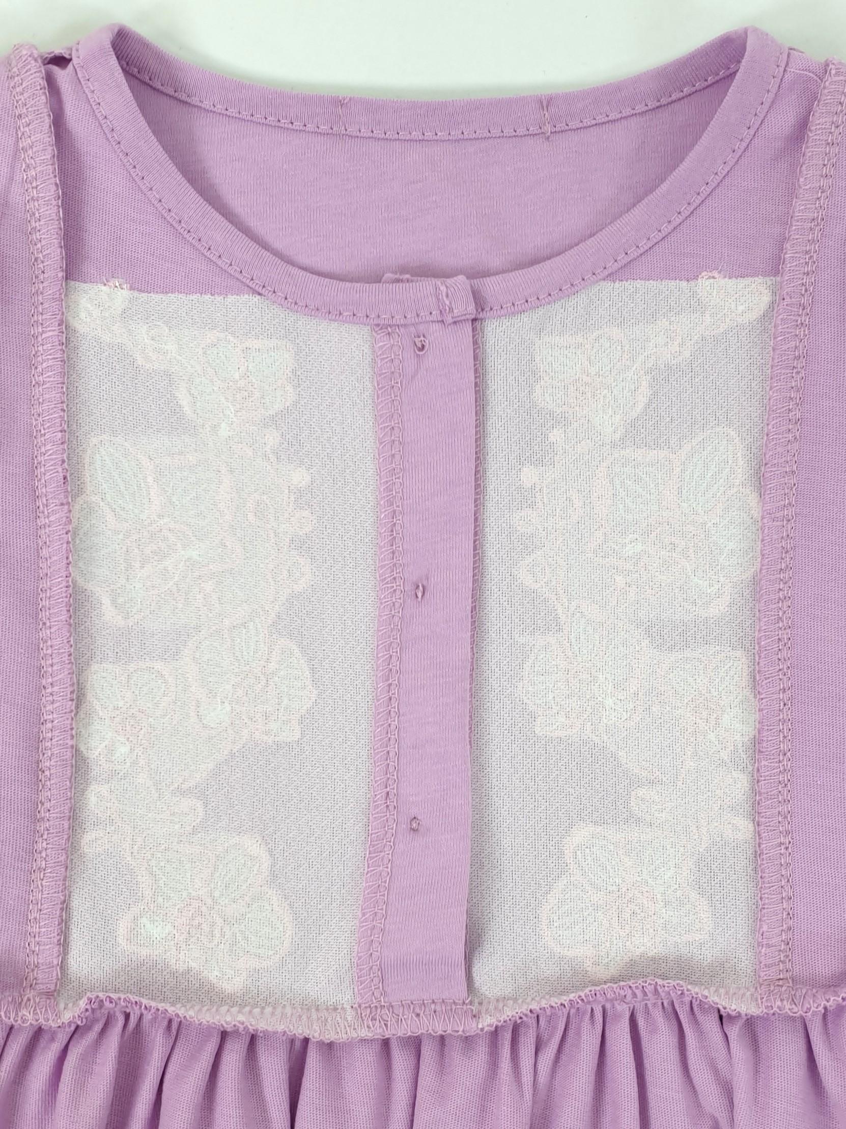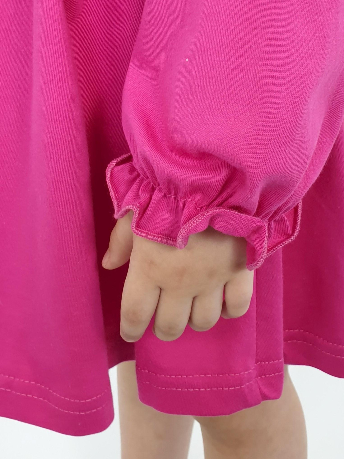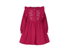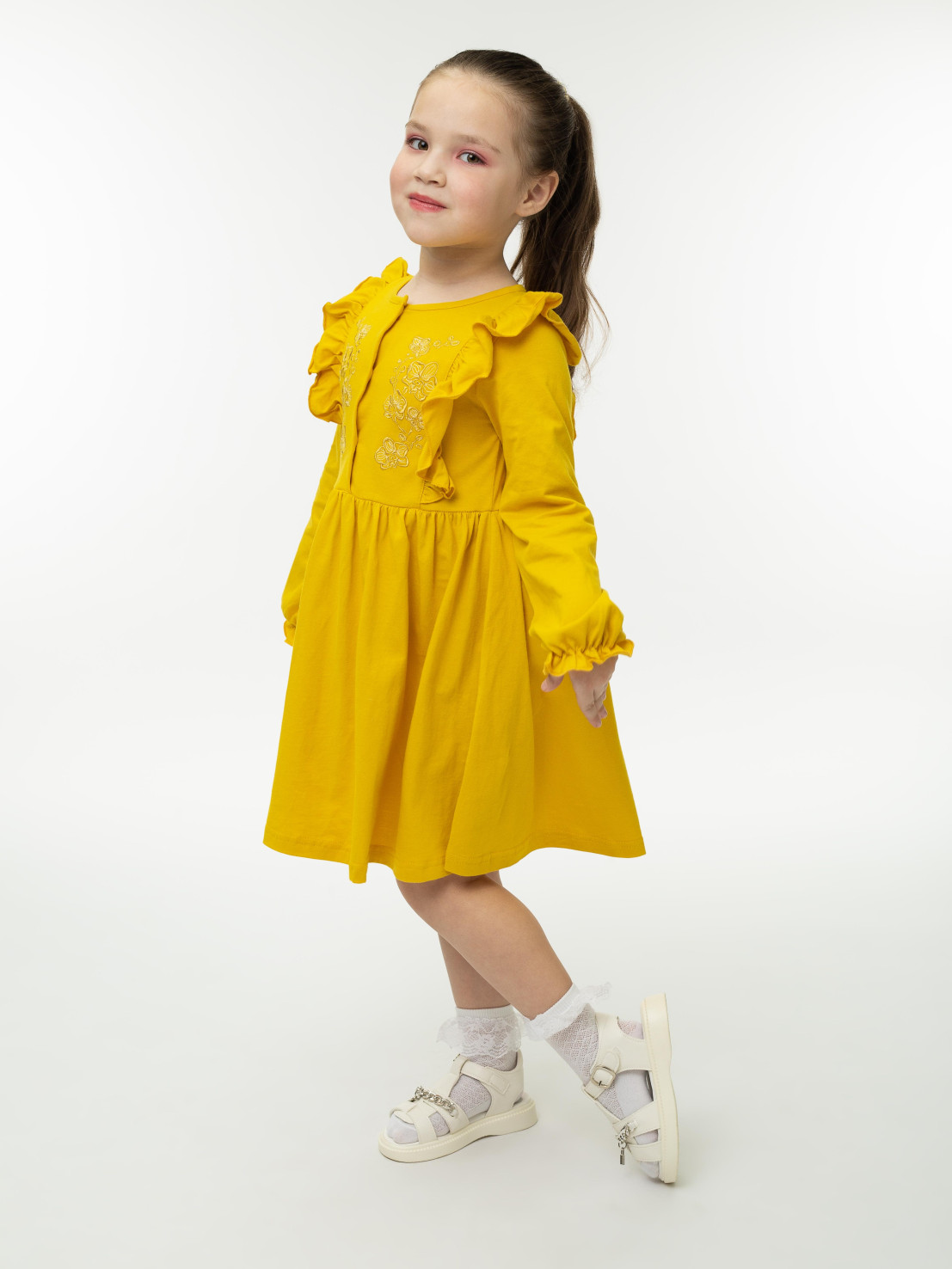Кулирное полотно:100% х/б. Платье-полуприлегающего силуэта,длинный рукав с резинкой "венгерка" внизу.Отрезная юбка со сборкой.рельефы с рюшей.Вышивка на переде.Горловина окантована.застежка центральная на пуговицы.