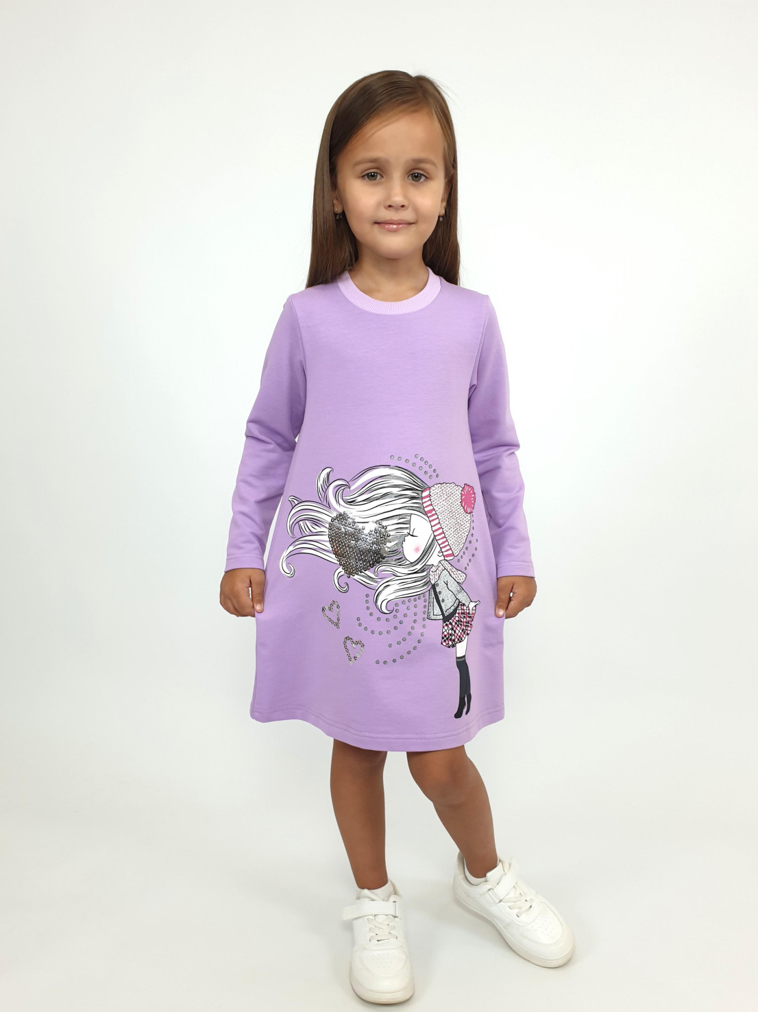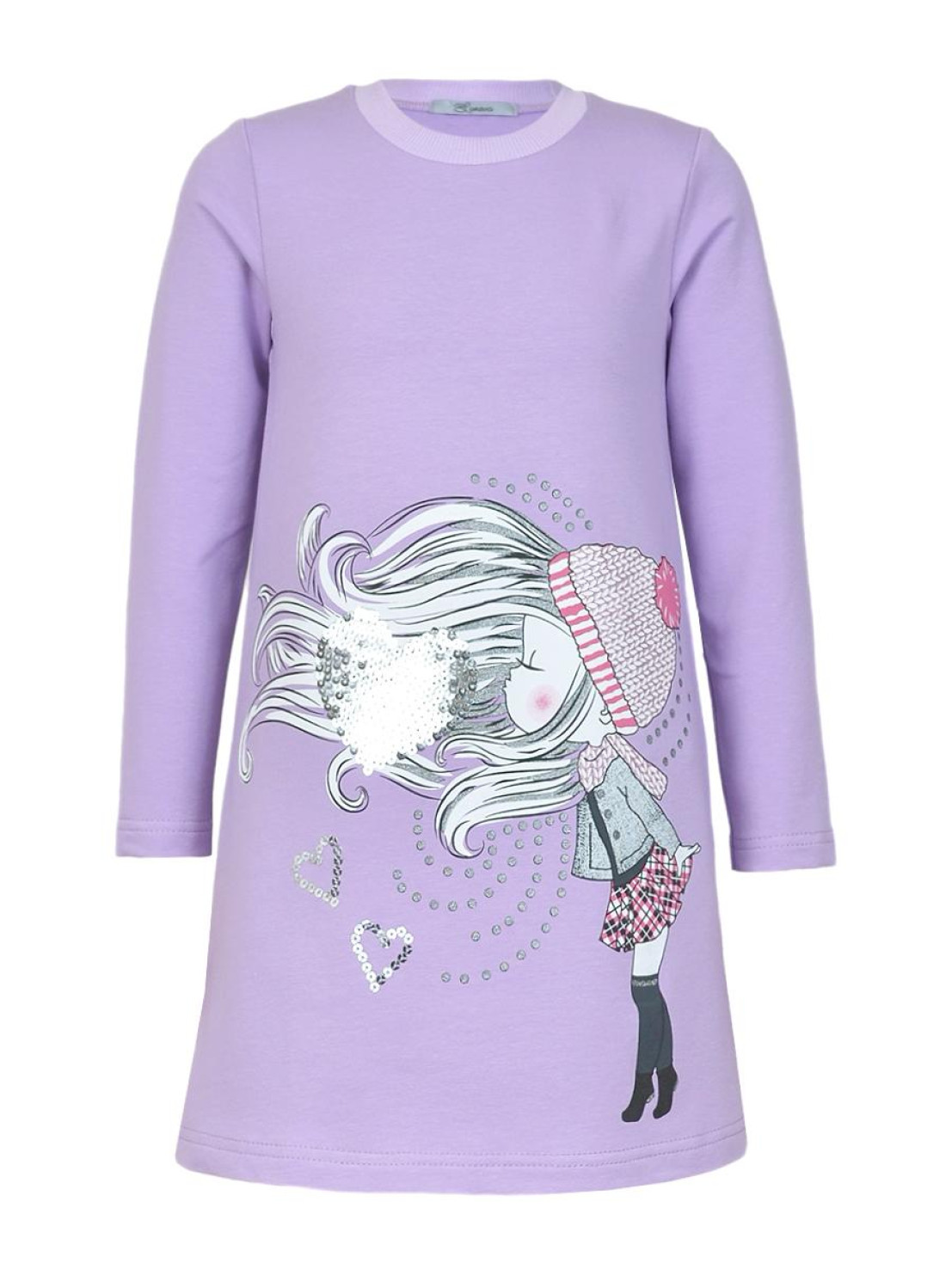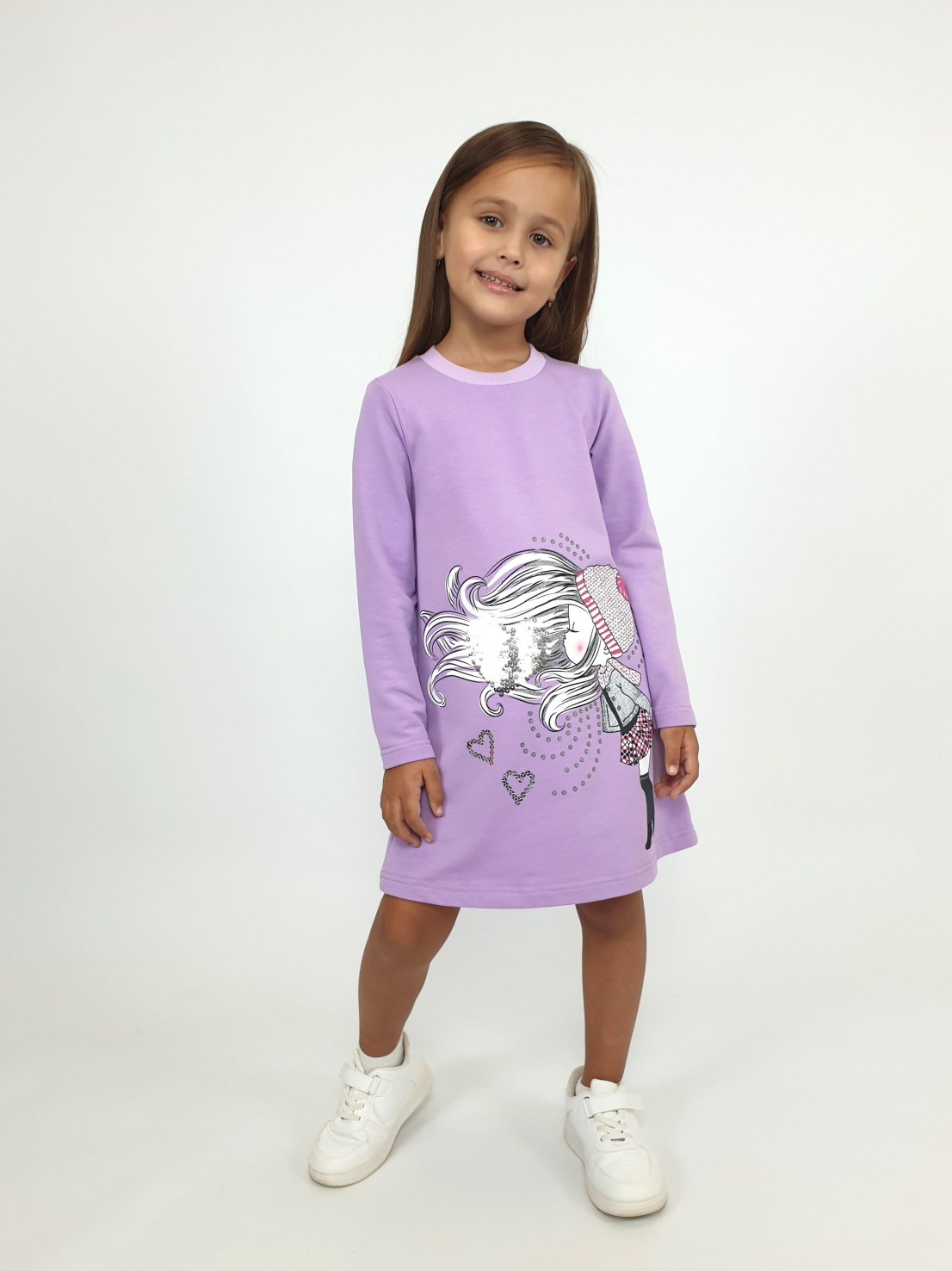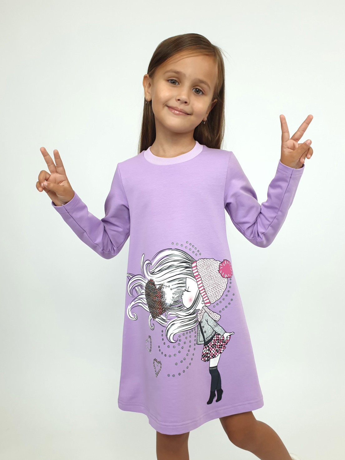Футер двухнитка:95% х/б,5% лайкра. Платье-силуэт трапеция,рукав втачной,длинный. Печать по переду и вышивка пайетки,горловина обработана ластиком.