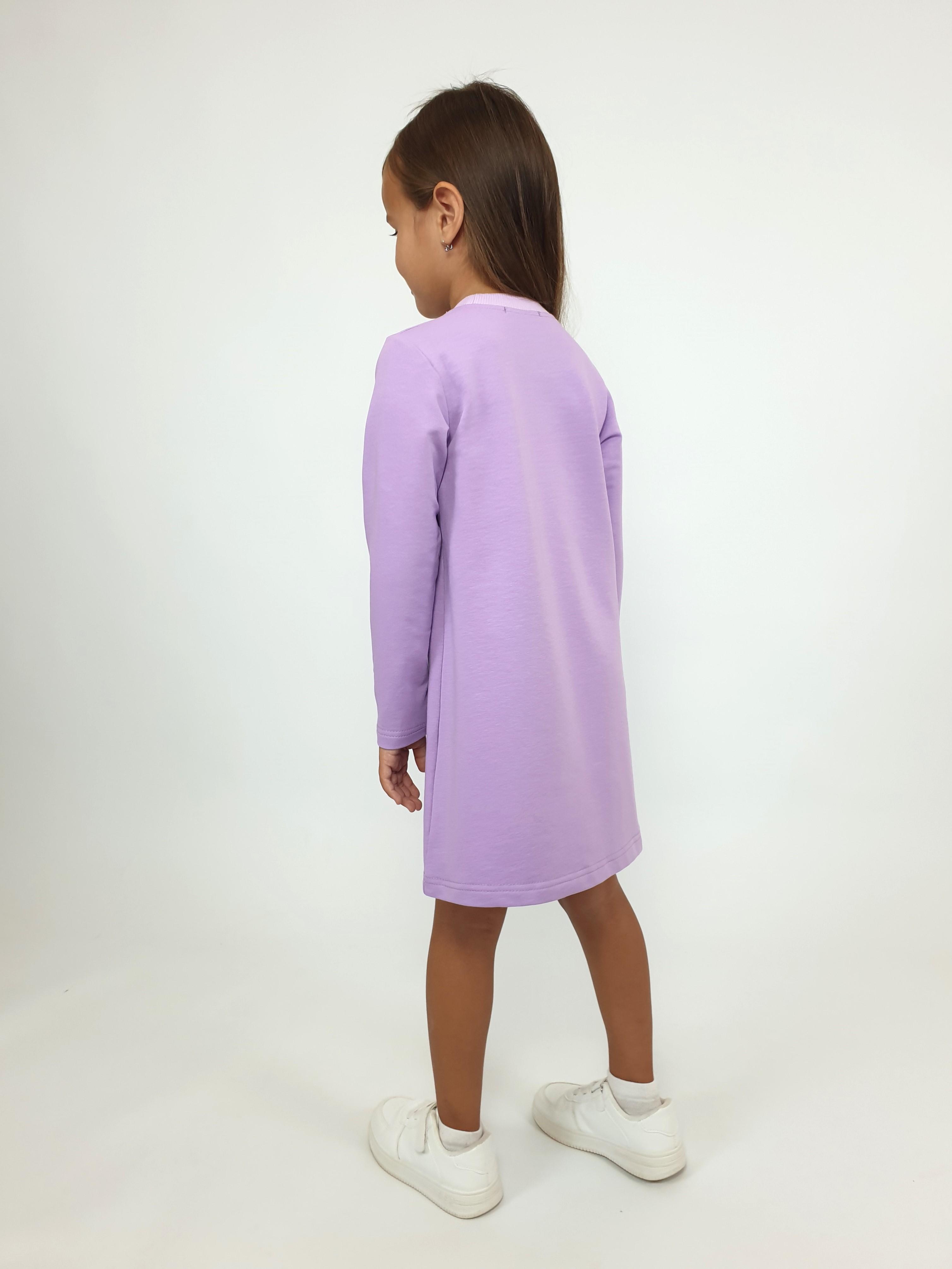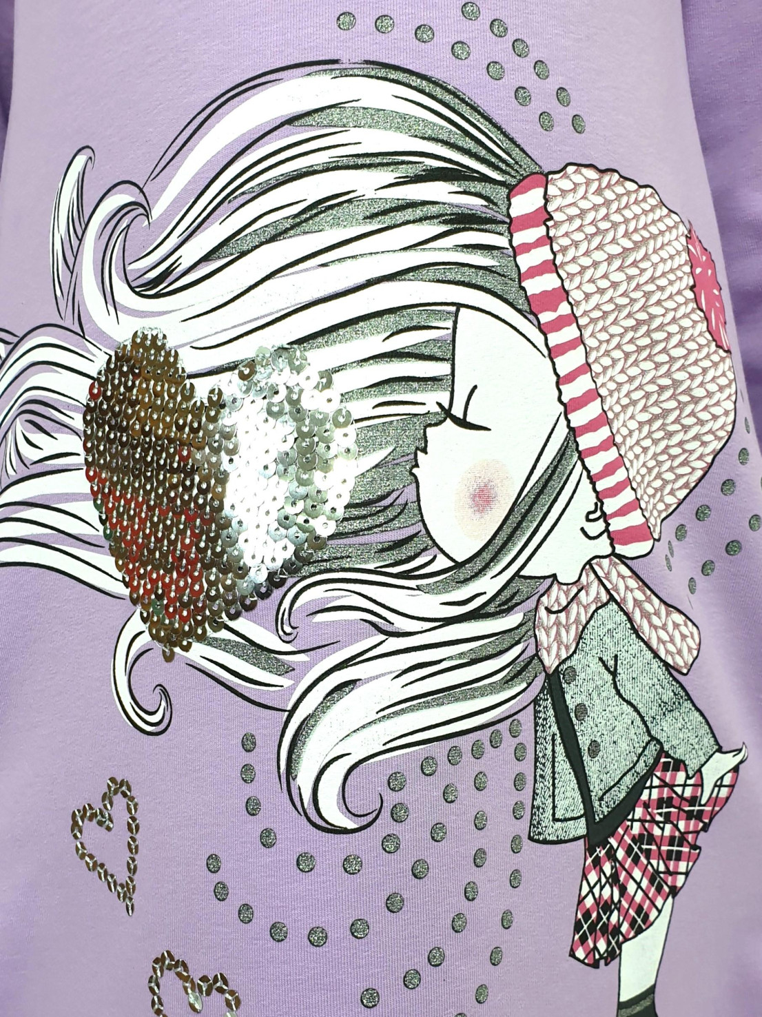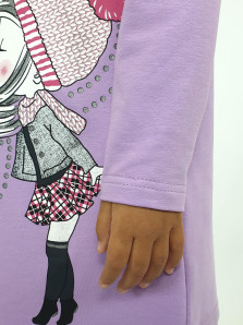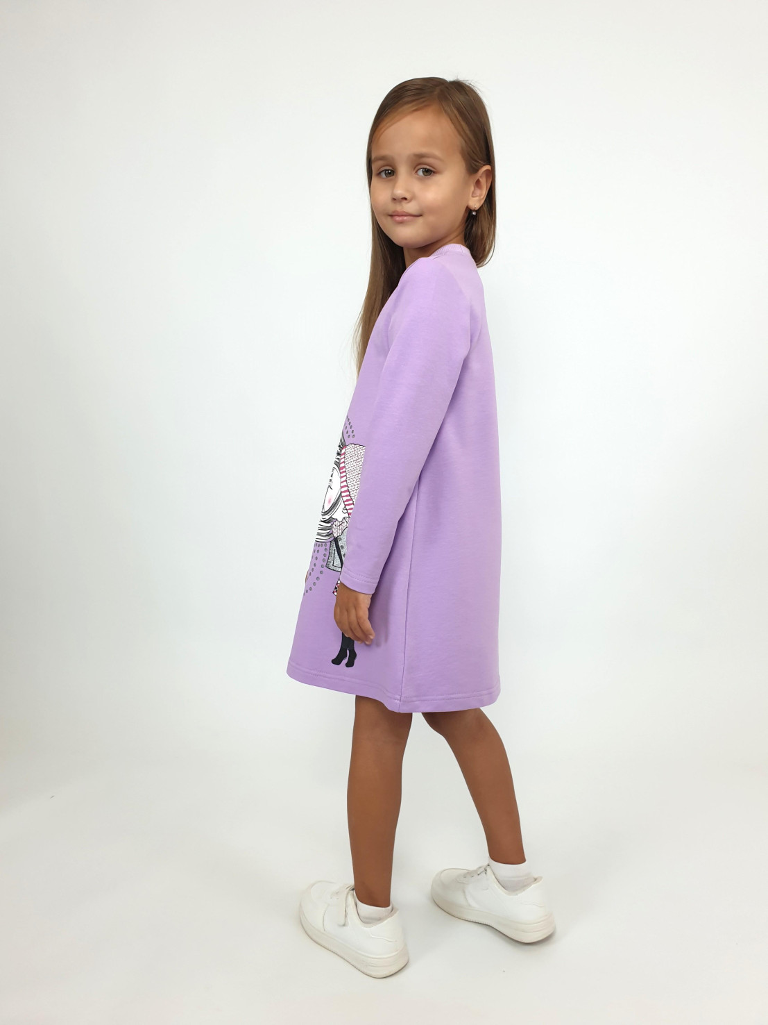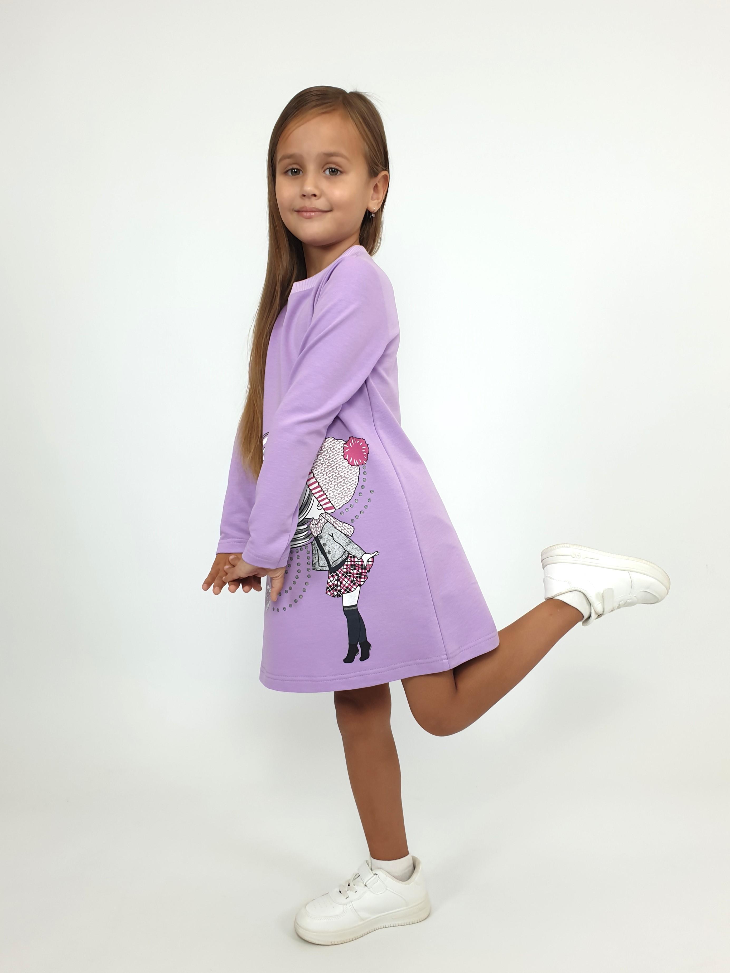 Футер двухнитка:95% х/б,5% лайкра. Платье-силуэт трапеция,рукав втачной,длинный. Печать по переду и вышивка пайетки,горловина обработана ластиком.
