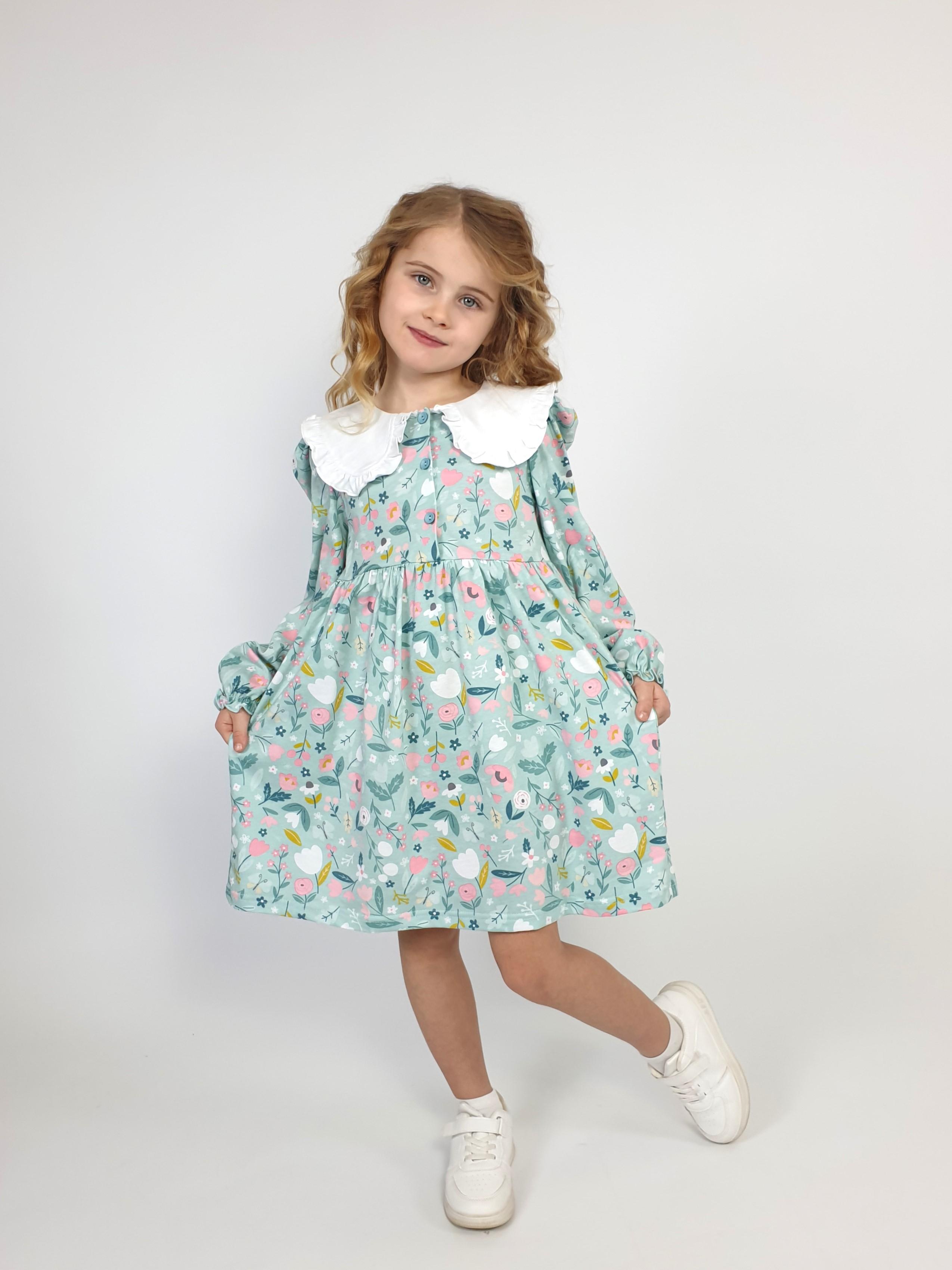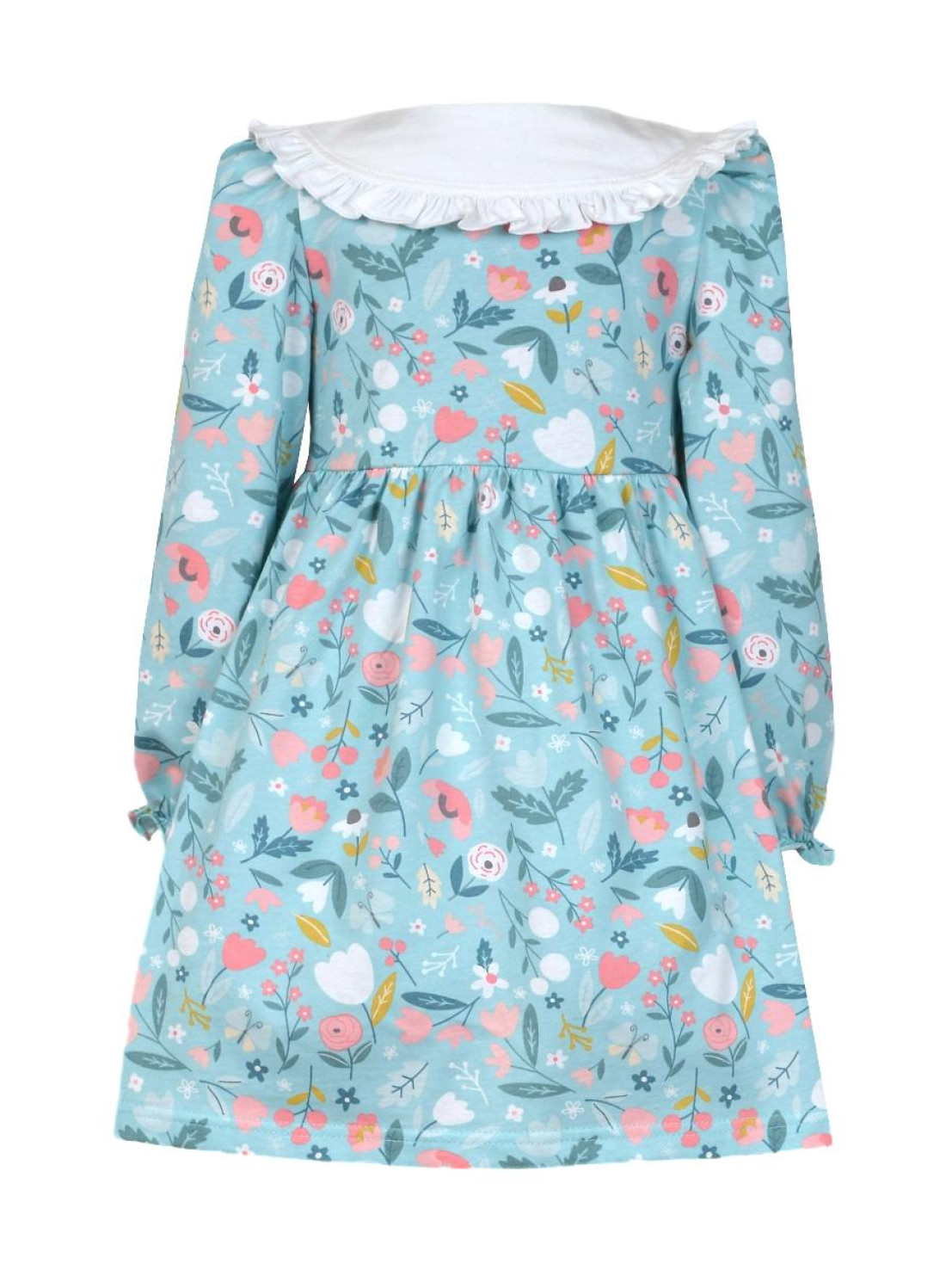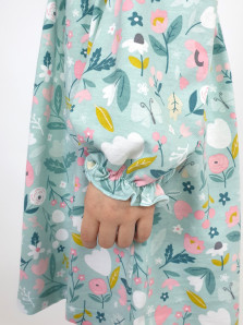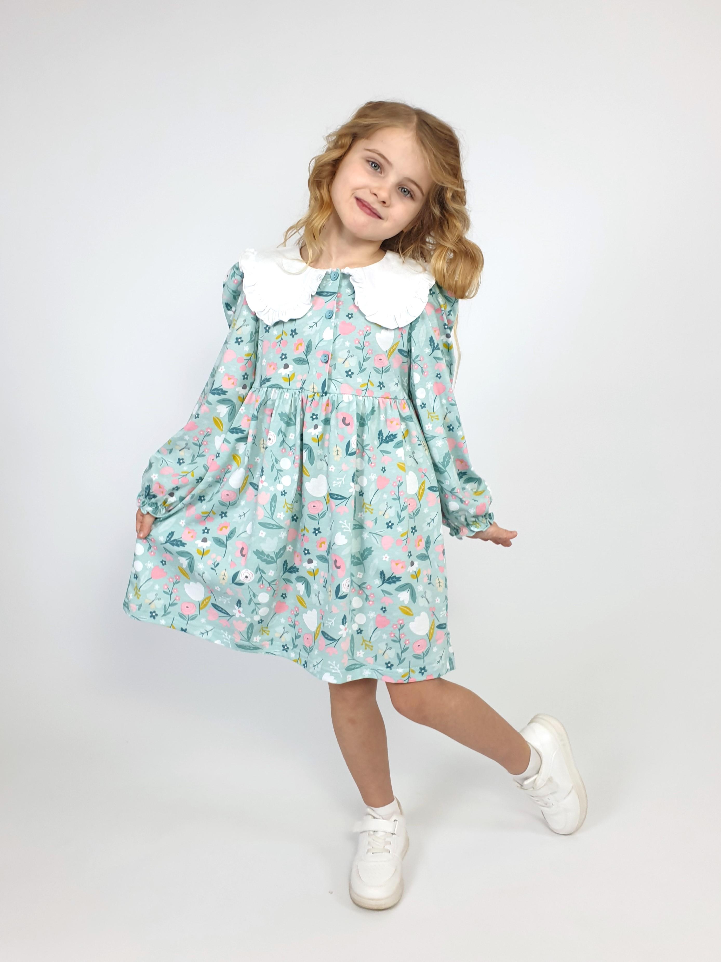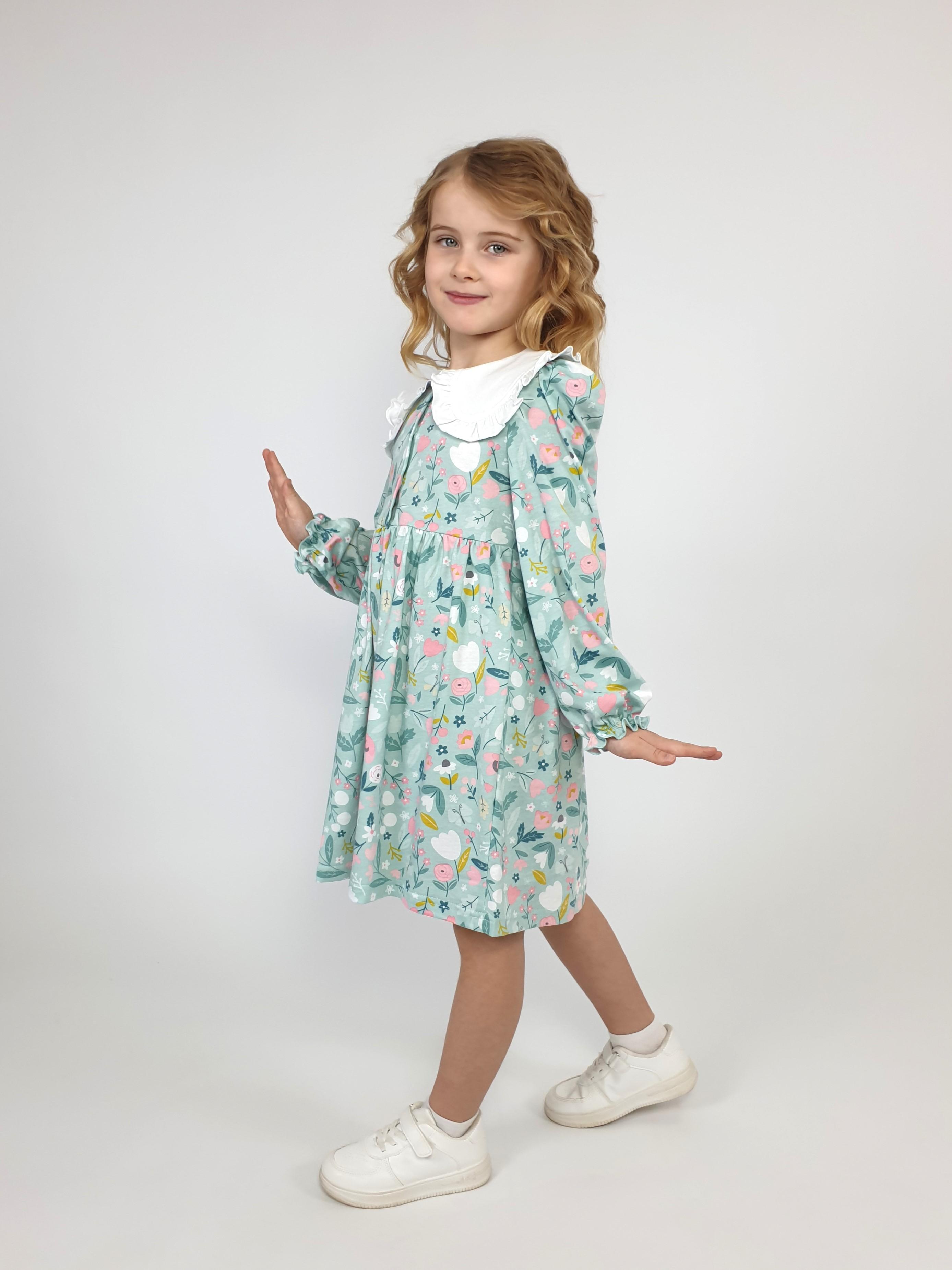 Кулирное полотно:100% х/б. Платье-полуприлегающий силуэт,длинный рукав с резинкой внизу,сборка по окату.Отрезная юбка в сборку.В горловине плосколежащий воротник с рюшей,застежка центральная на пуговицы.
