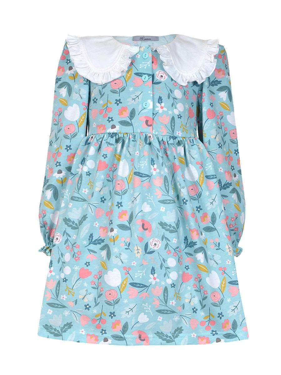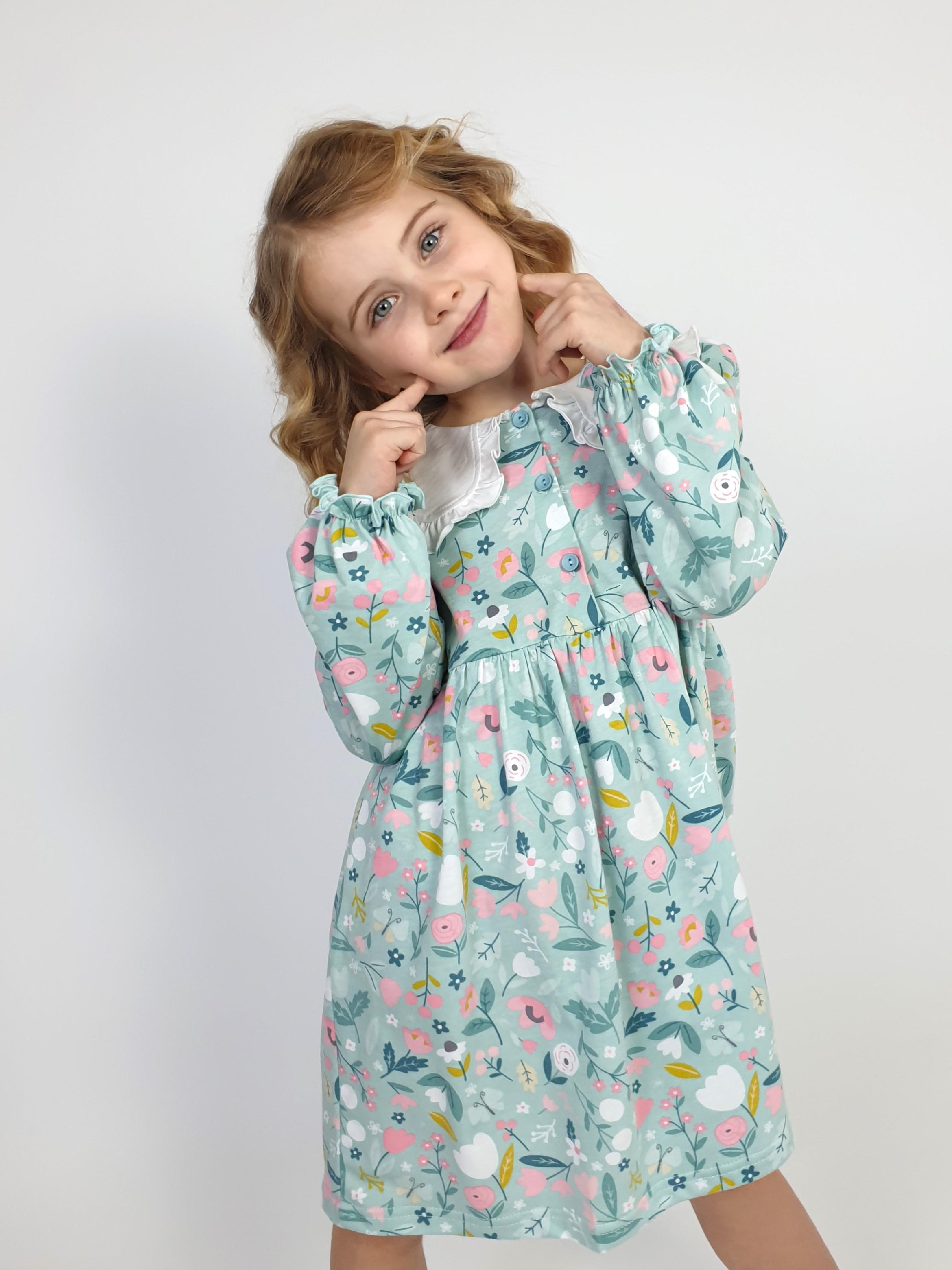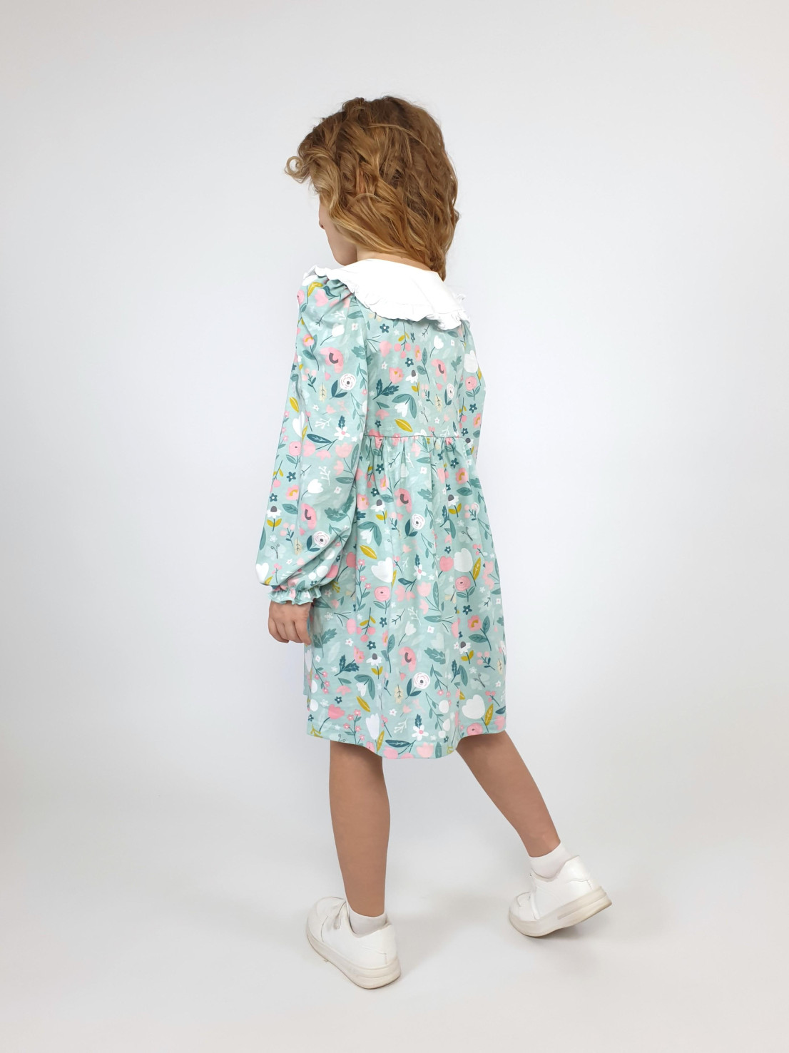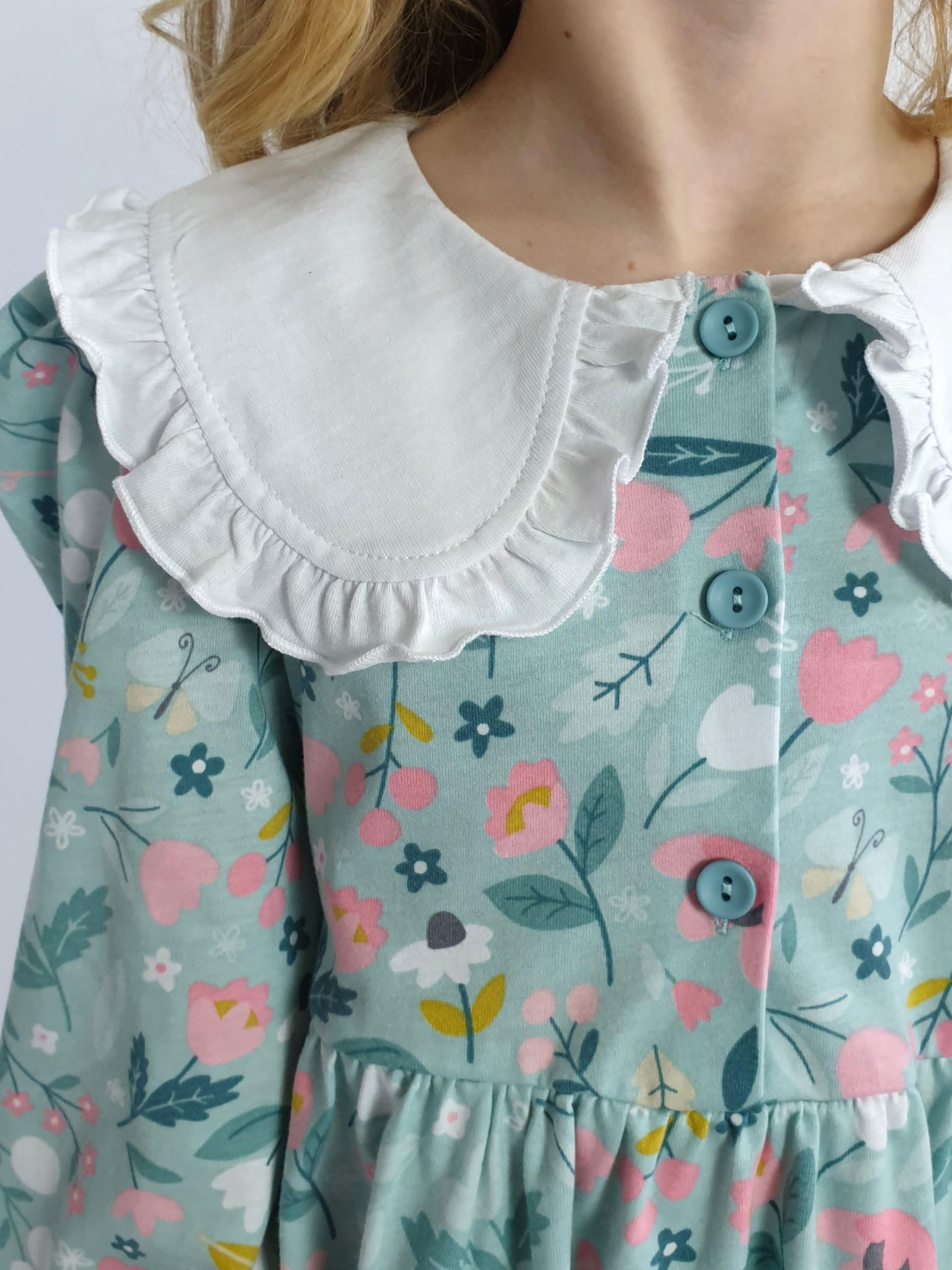 Кулирное полотно:100% х/б. Платье-полуприлегающий силуэт,длинный рукав с резинкой внизу,сборка по окату.Отрезная юбка в сборку.В горловине плосколежащий воротник с рюшей,застежка центральная на пуговицы.