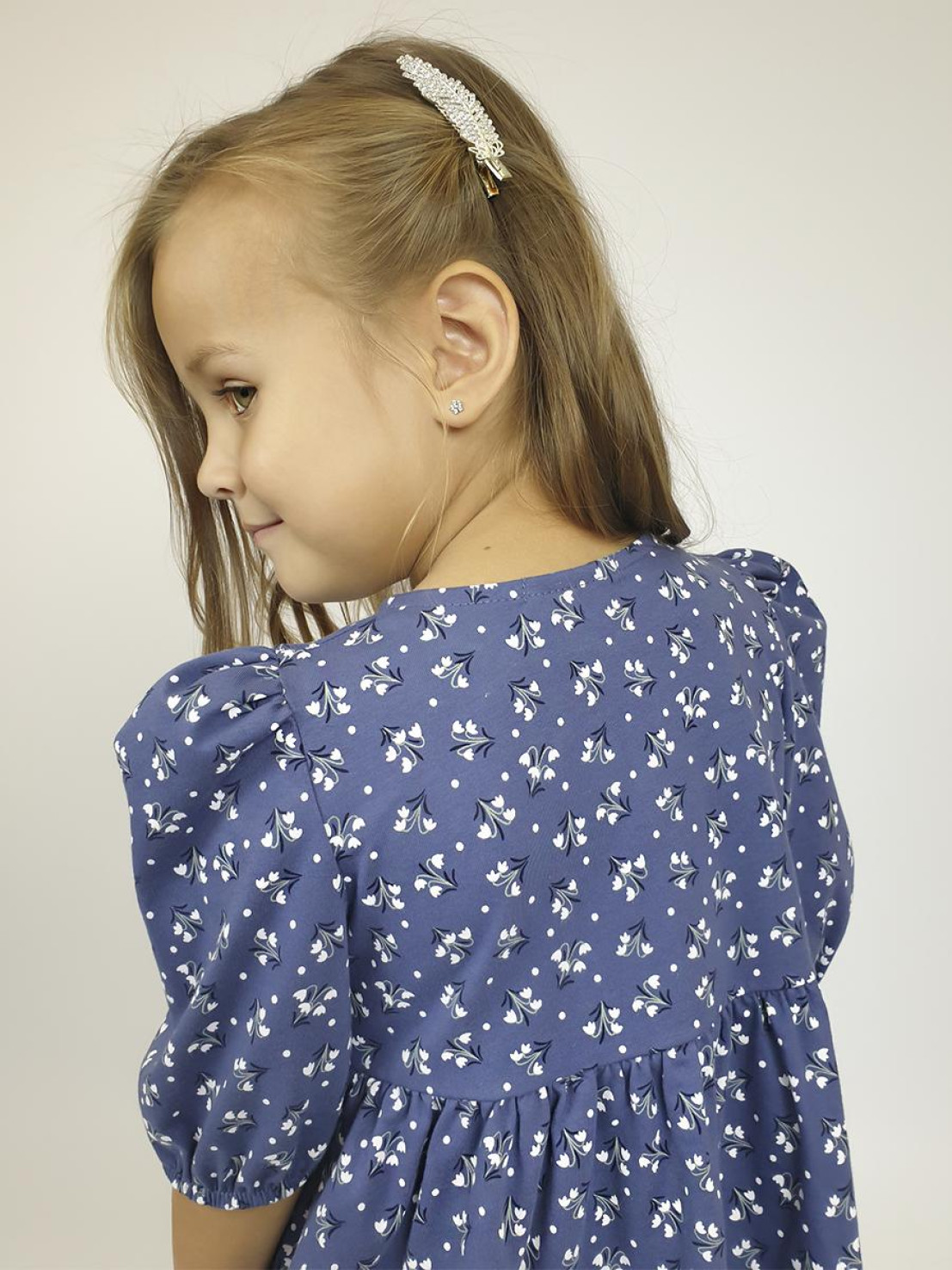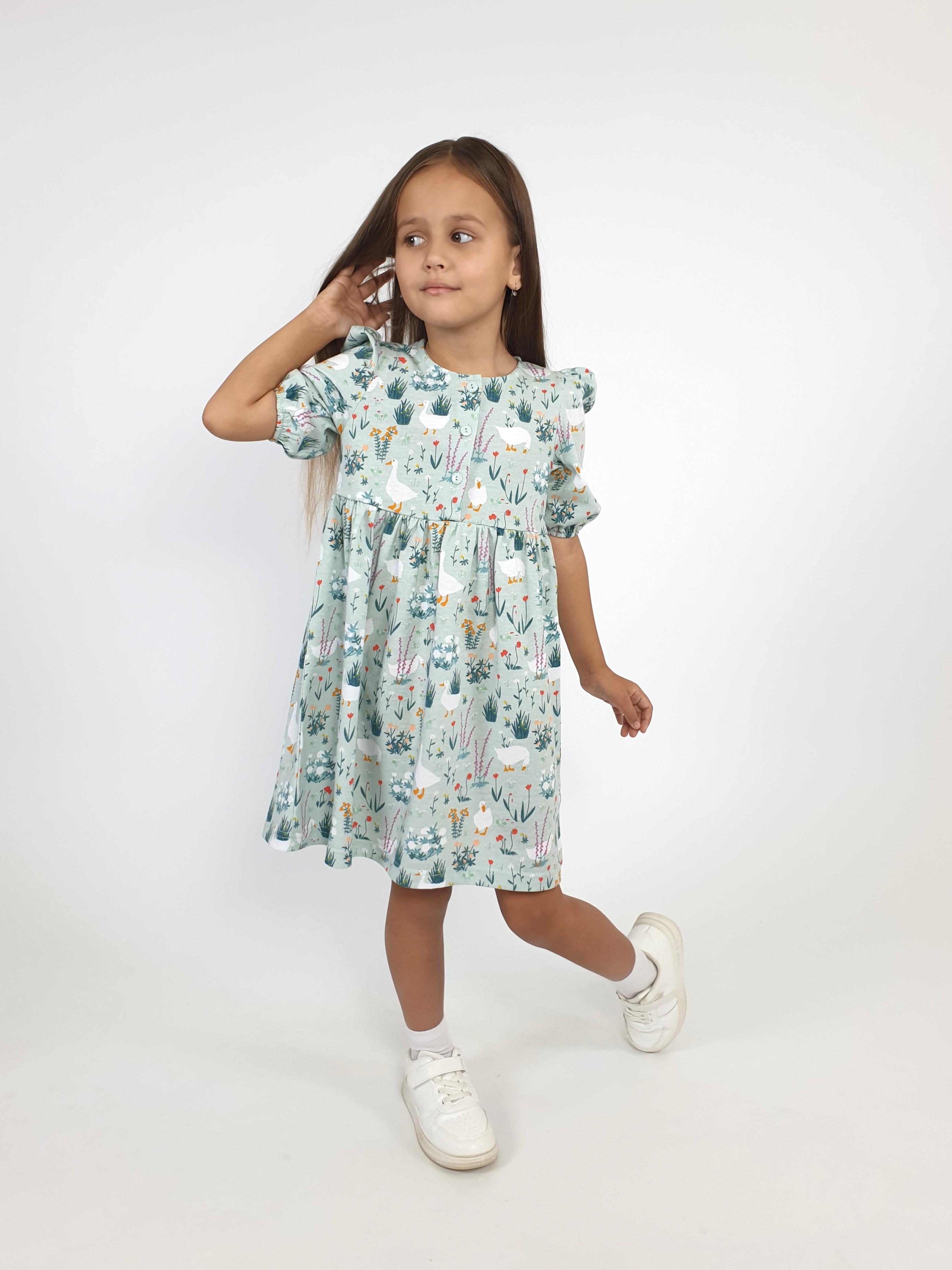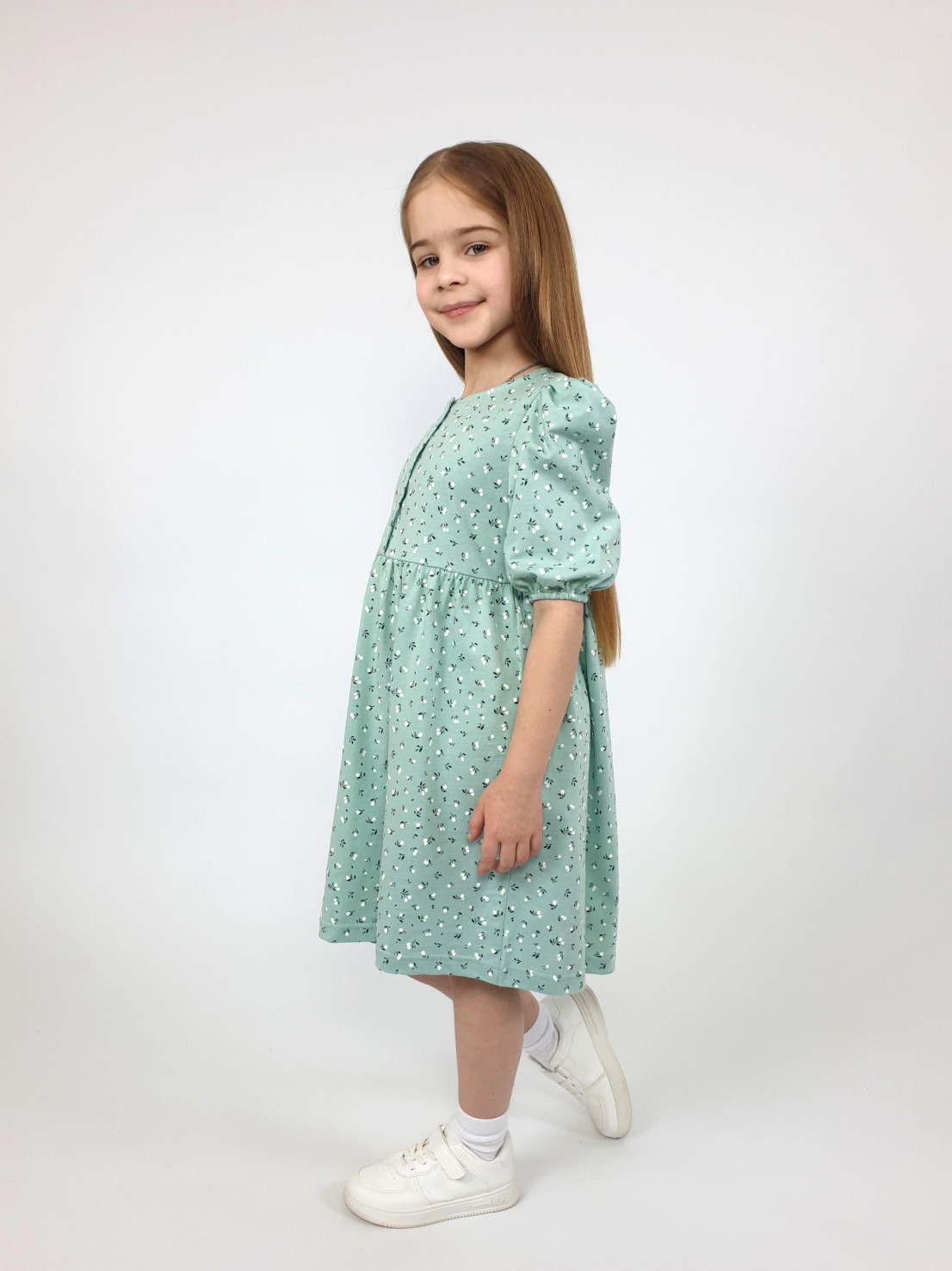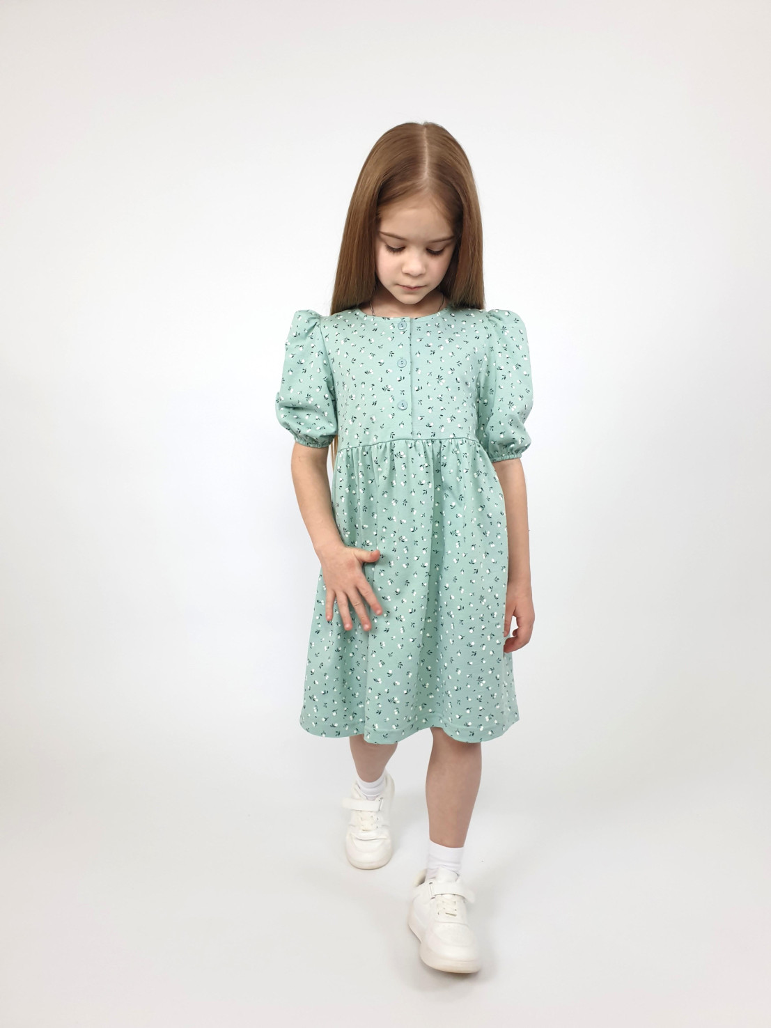 Кулирное полотно (набивка): 100% х/б. Платье-с отрезной юбкой в сборку.Короткий рукав с резинкой внизу,сборка по окату.Горловина окантована и подшита,застежка центральная на пуговицы.