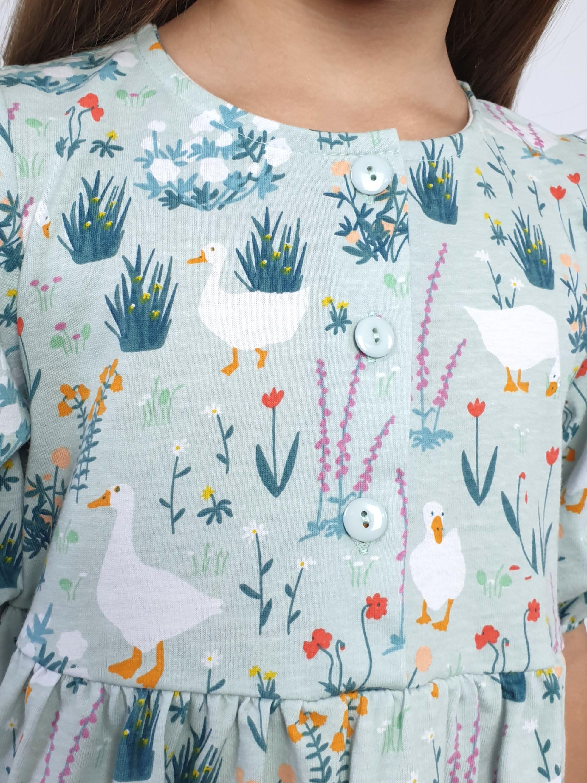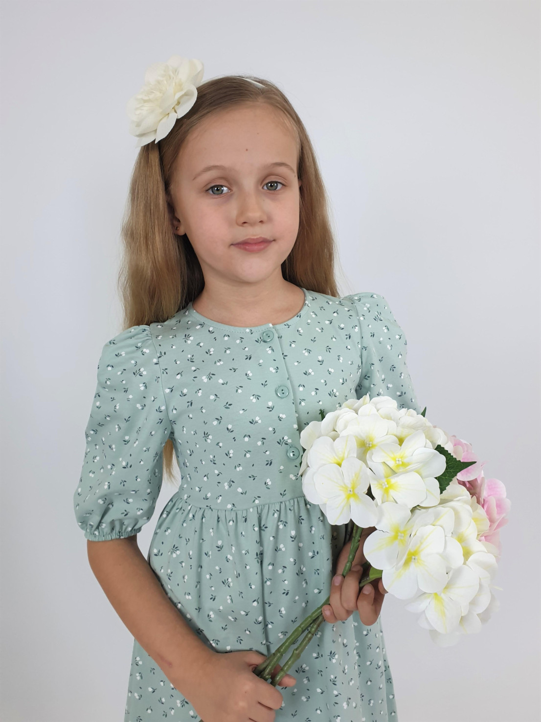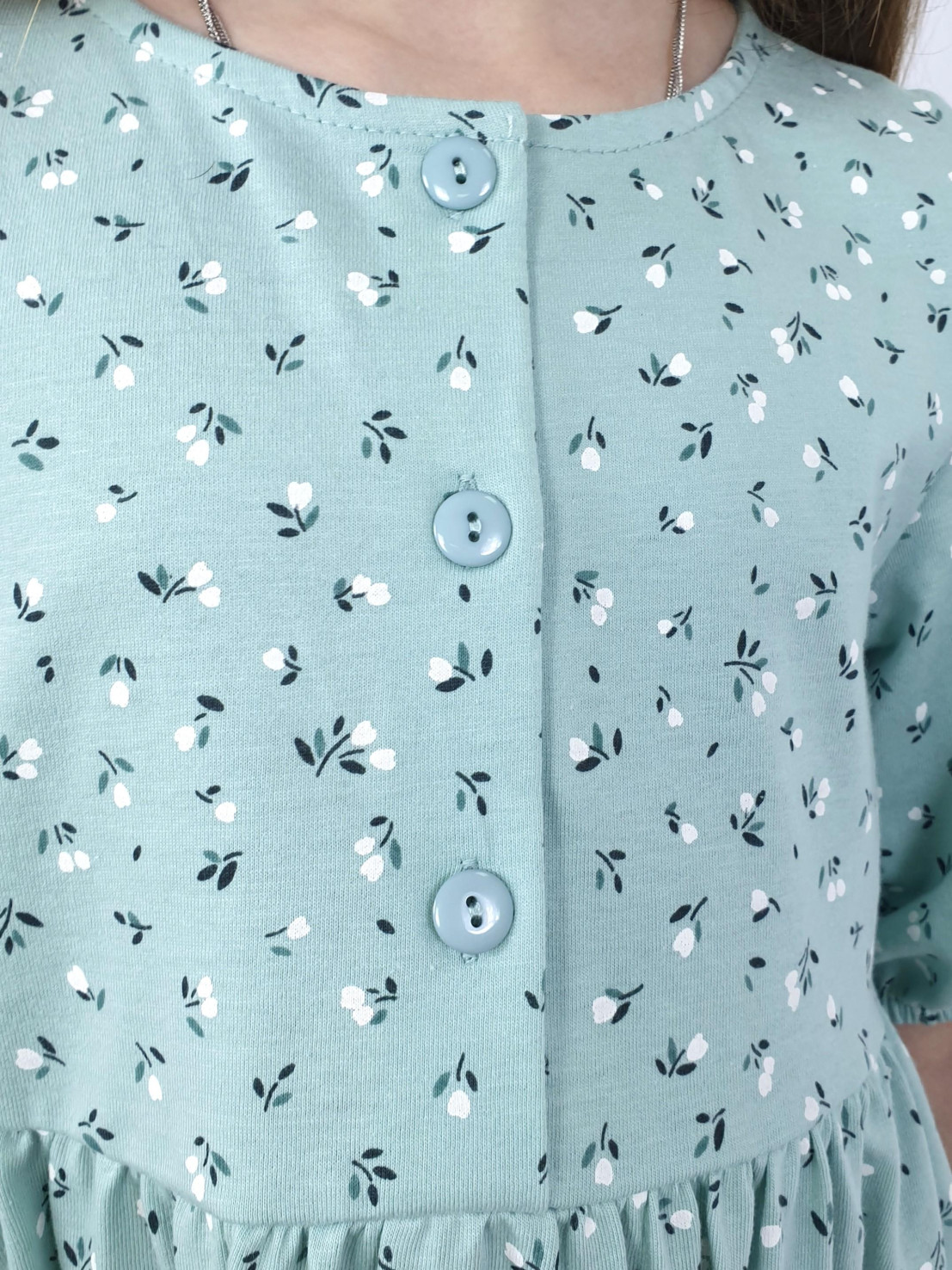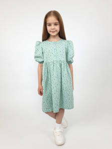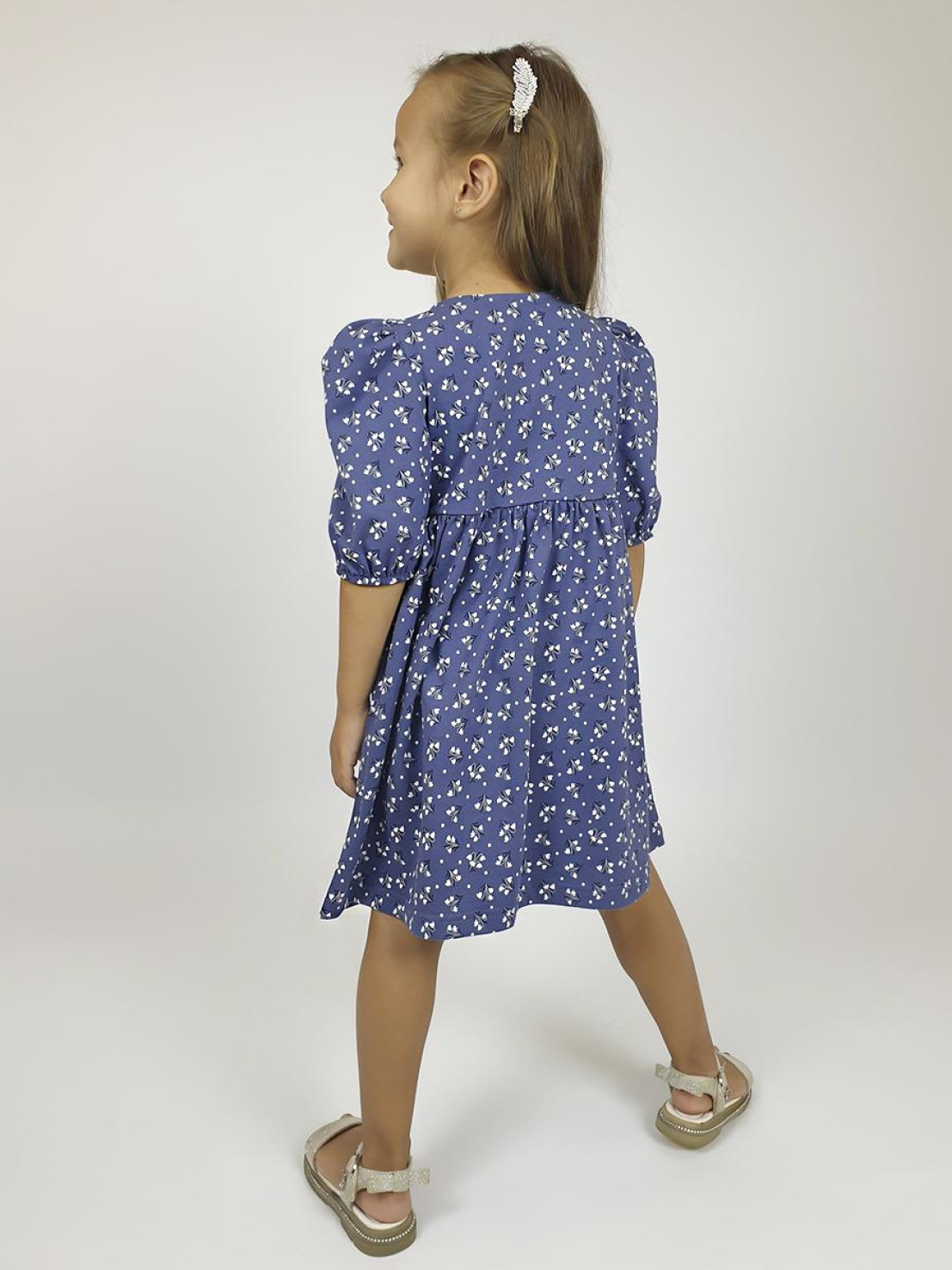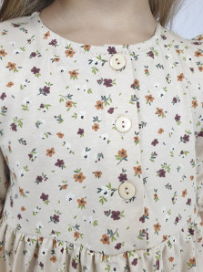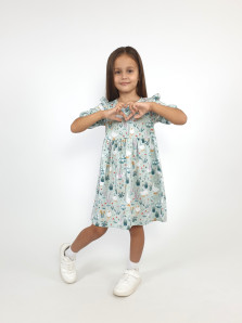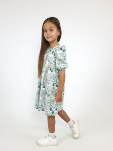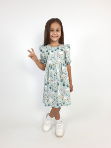 Кулирное полотно (набивка): 100% х/б. Платье-с отрезной юбкой в сборку.Короткий рукав с резинкой внизу,сборка по окату.Горловина окантована и подшита,застежка центральная на пуговицы.