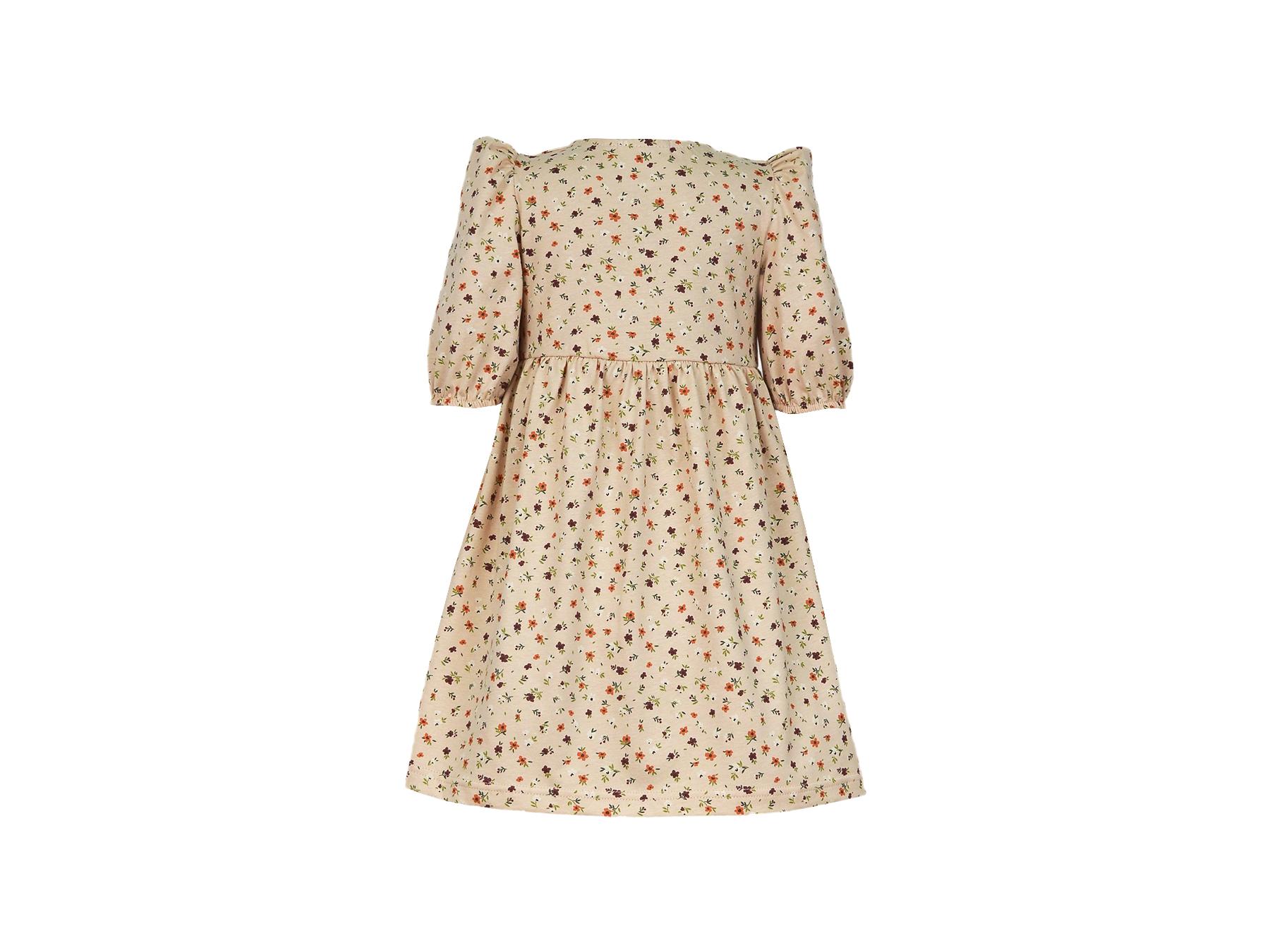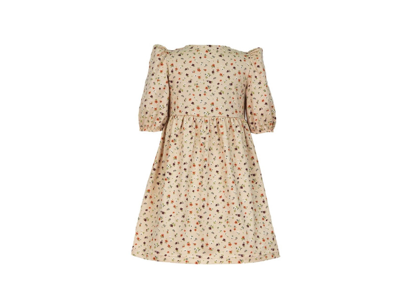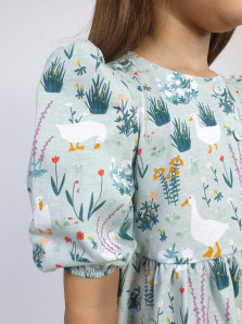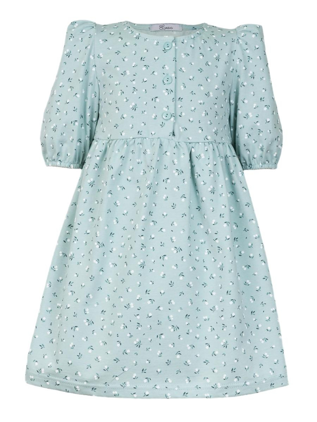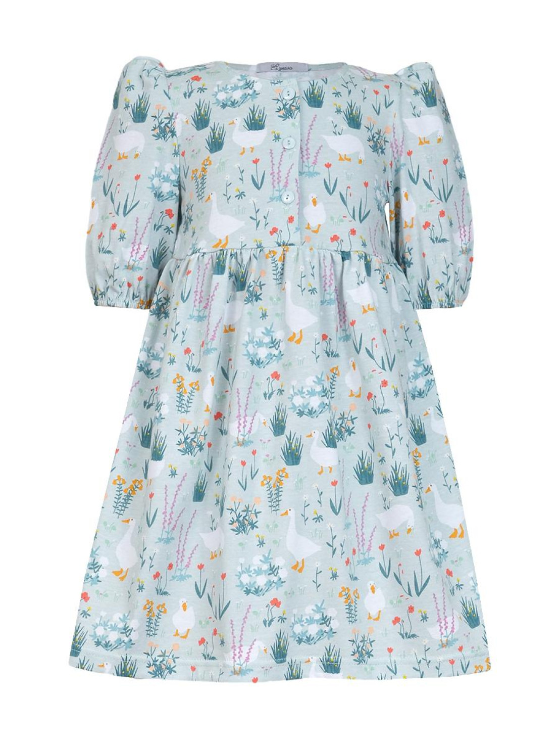 Кулирное полотно (набивка): 100% х/б. Платье-с отрезной юбкой в сборку.Короткий рукав с резинкой внизу,сборка по окату.Горловина окантована и подшита,застежка центральная на пуговицы.