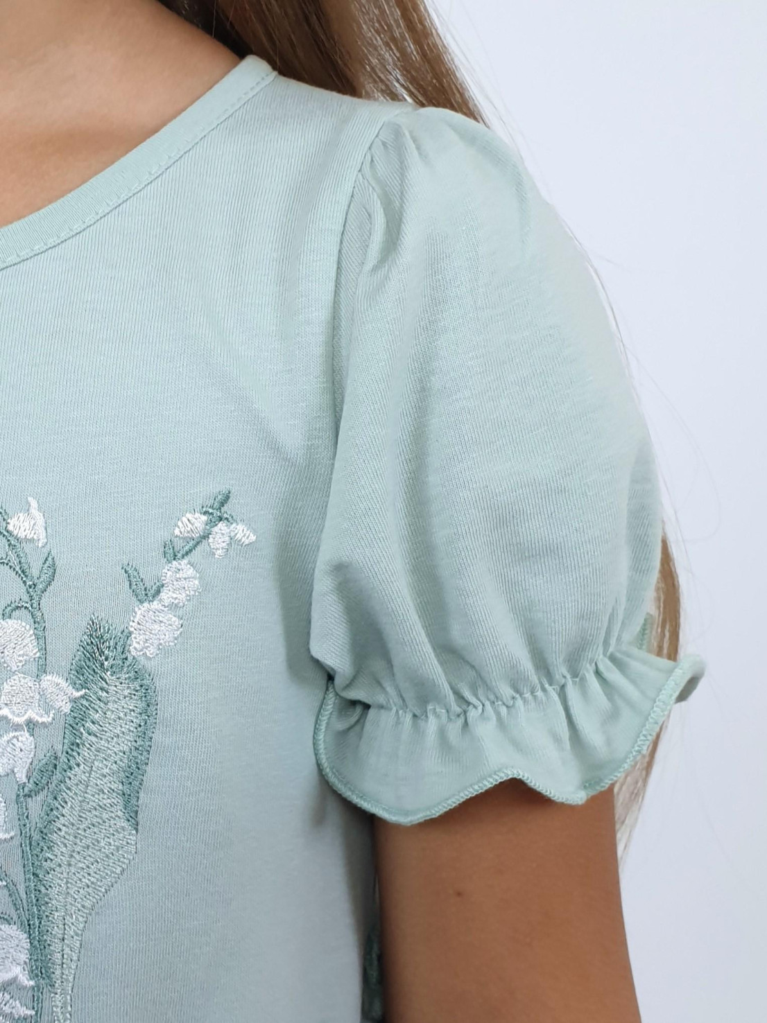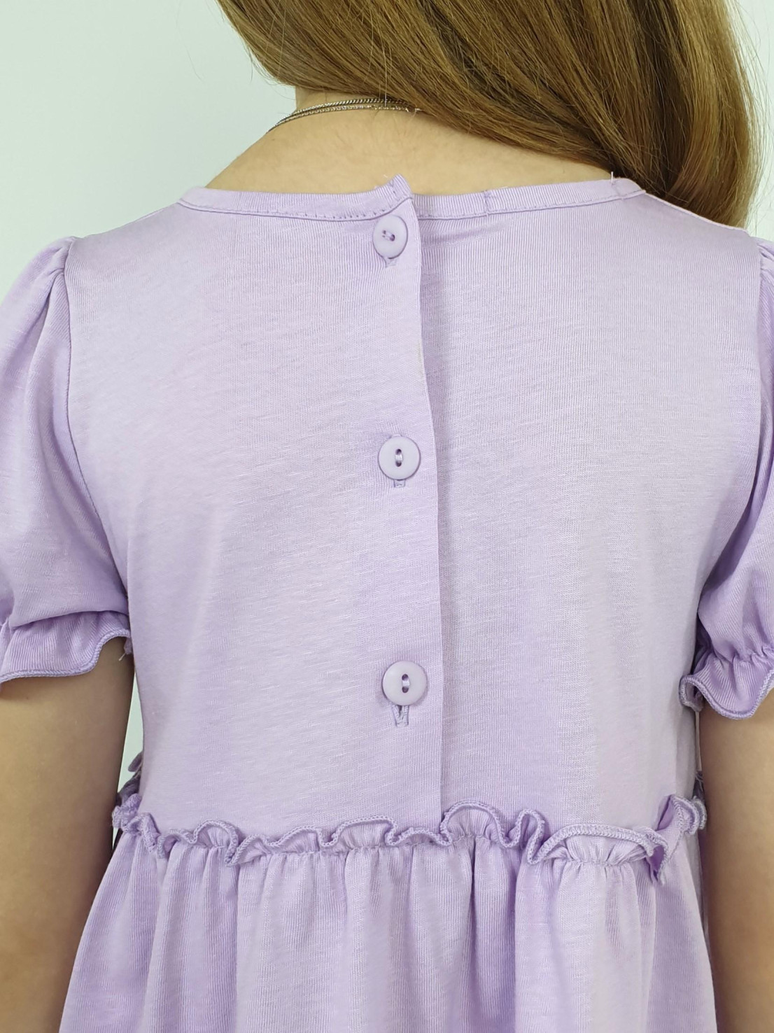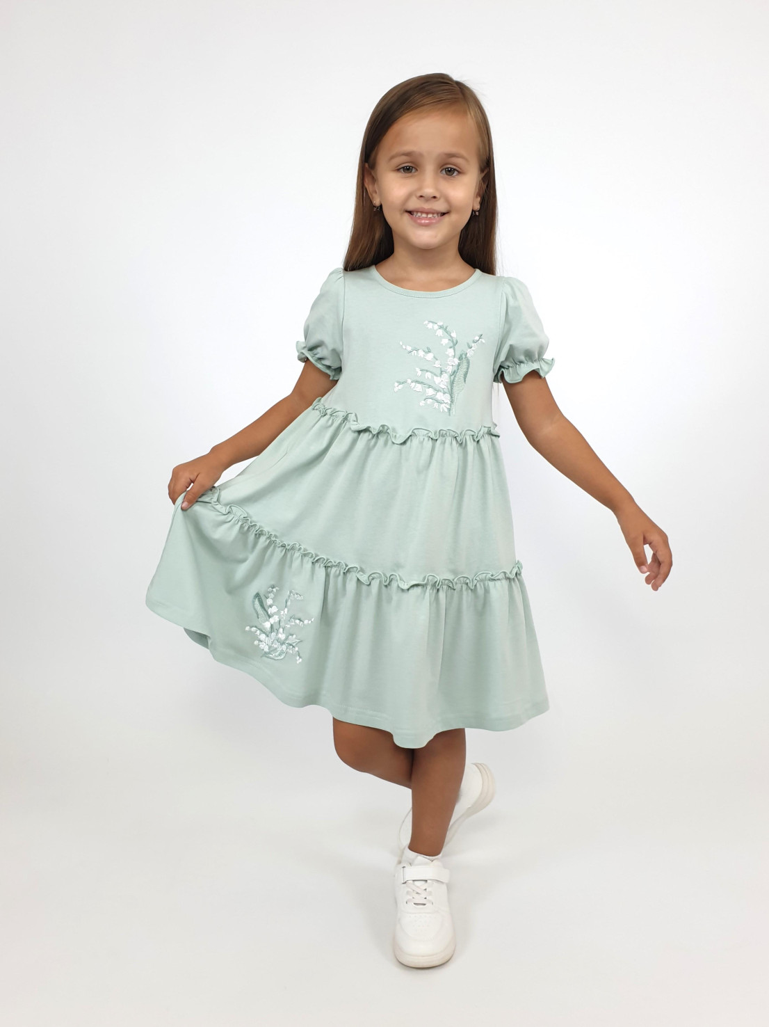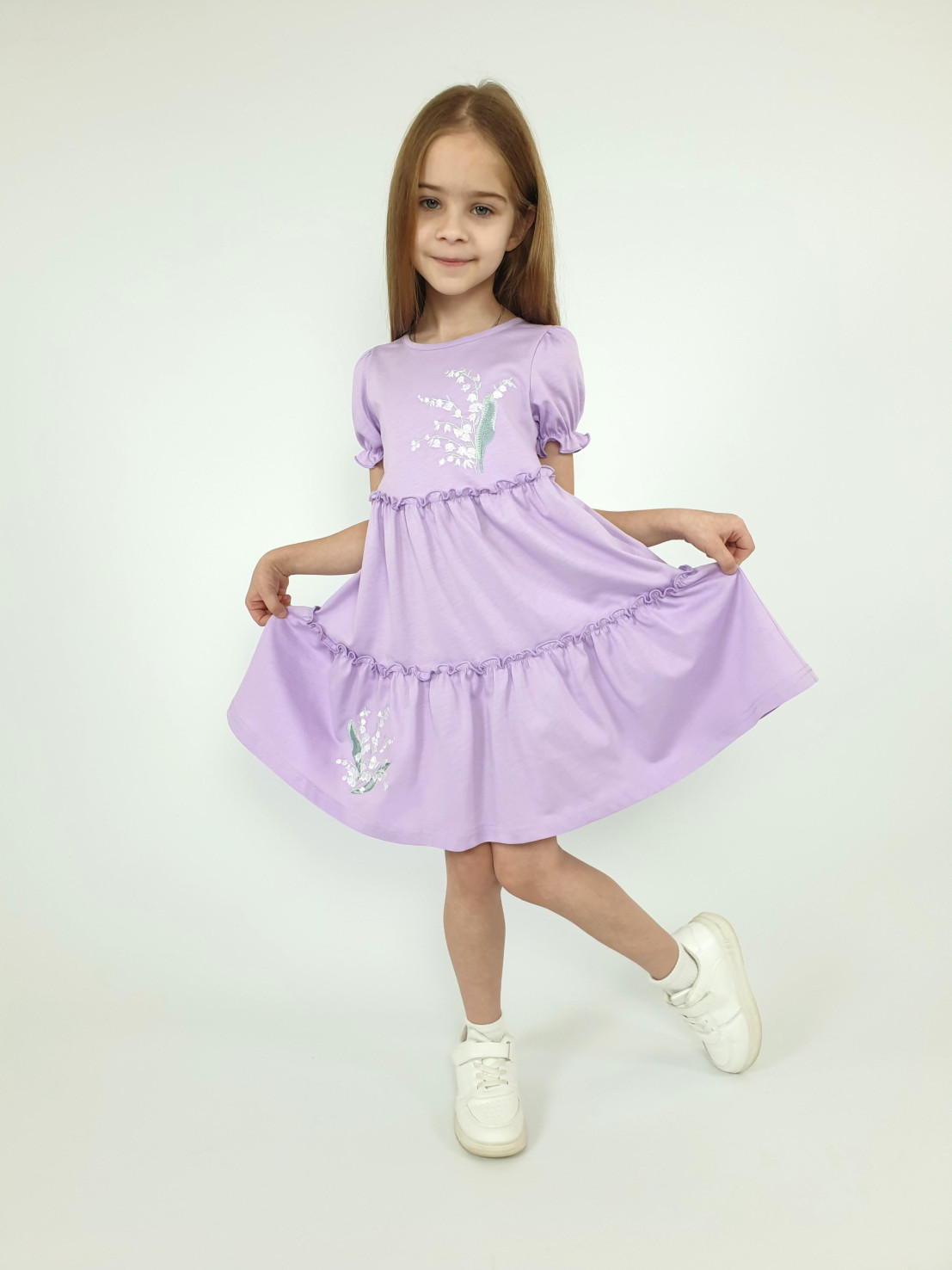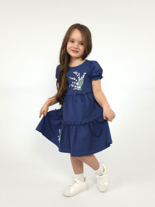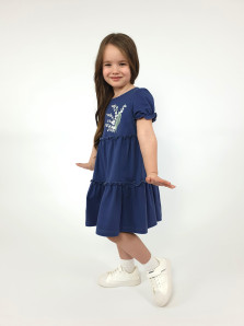 Кулирное полотно:100% х/б. Платье-силуэт трапеция,короткий рукав "фонарик".Юбка переда и спинки из двух воланов,по передднему нижнему волану вышивка.Кокетка переда с вышивкой,застежка по спинке на пуговицы.Горловина окантована.