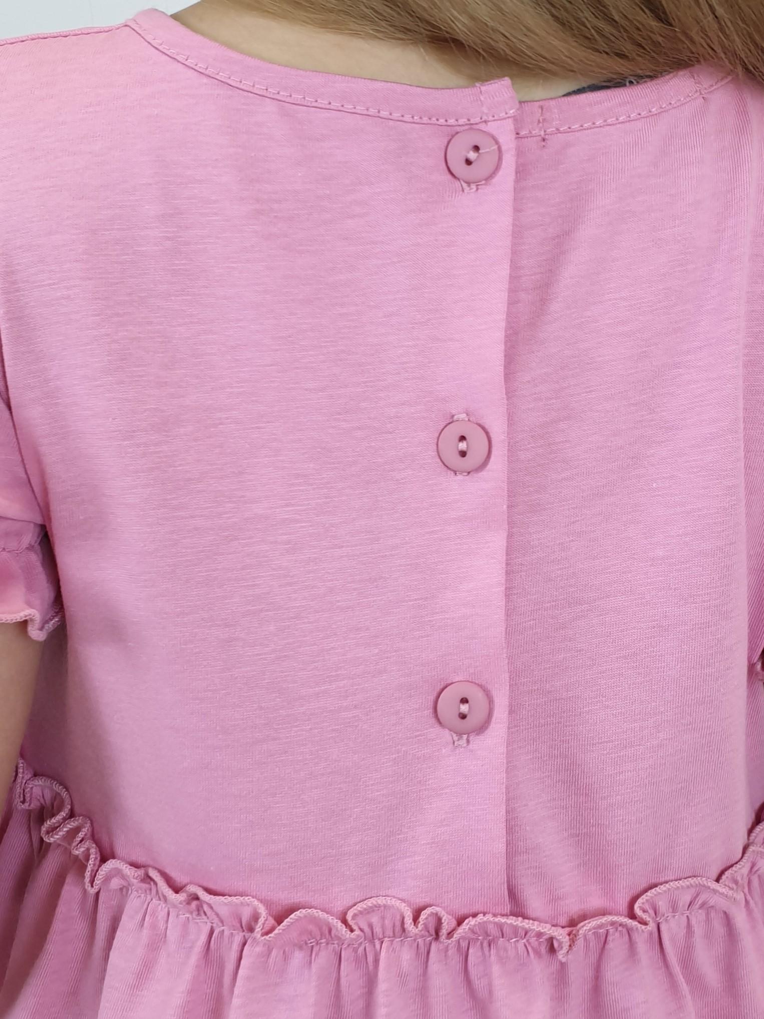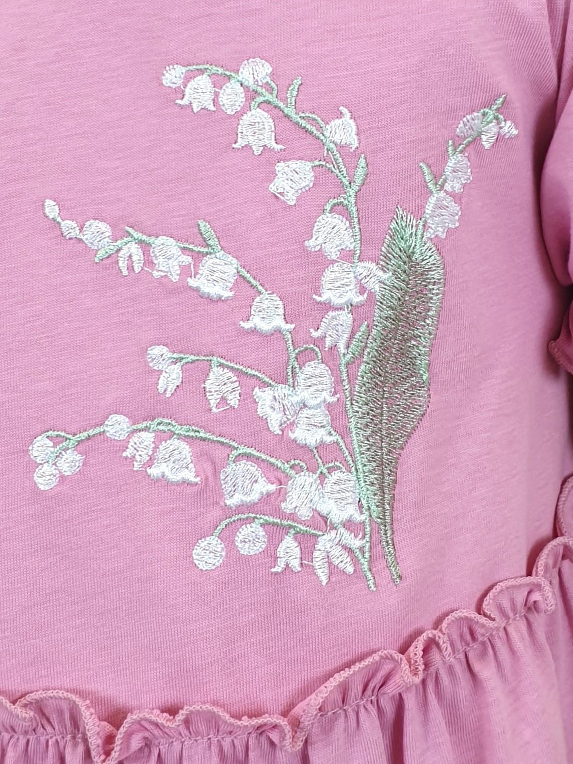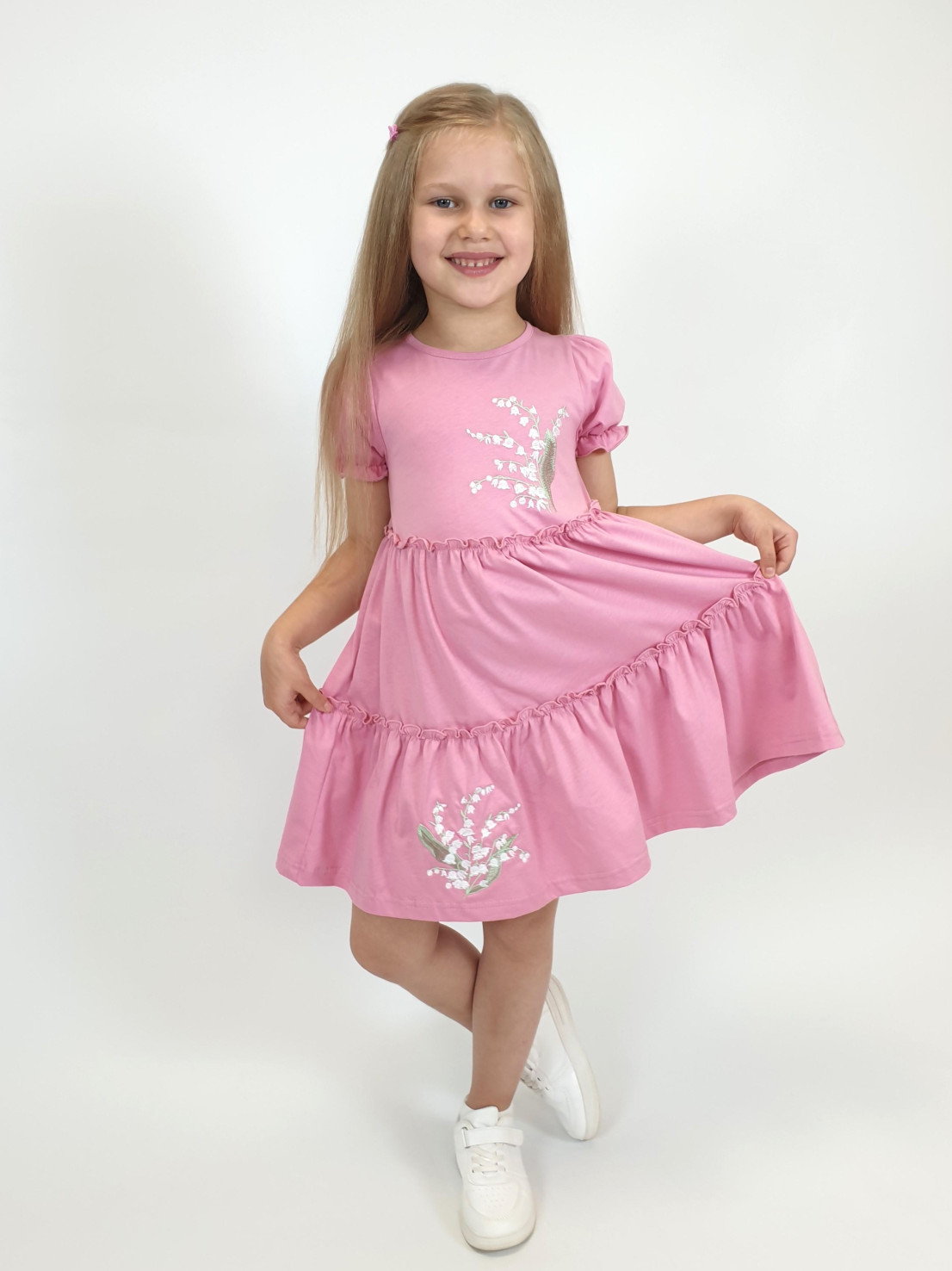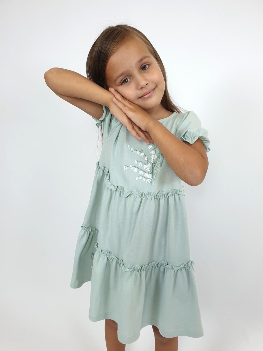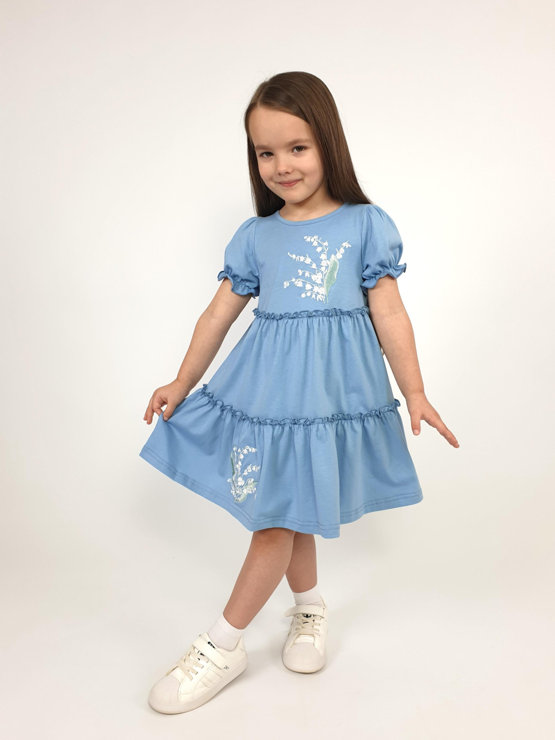 Кулирное полотно:100% х/б. Платье-силуэт трапеция,короткий рукав "фонарик".Юбка переда и спинки из двух воланов,по передднему нижнему волану вышивка.Кокетка переда с вышивкой,застежка по спинке на пуговицы.Горловина окантована.