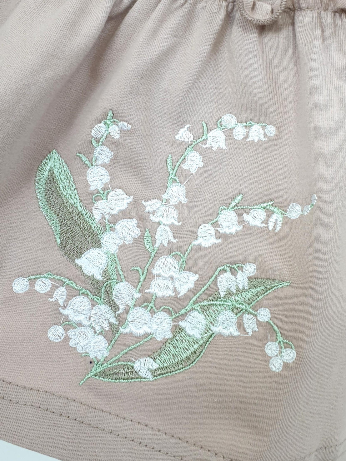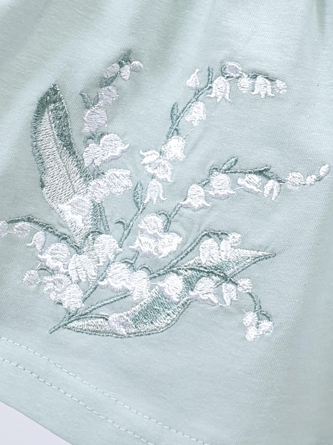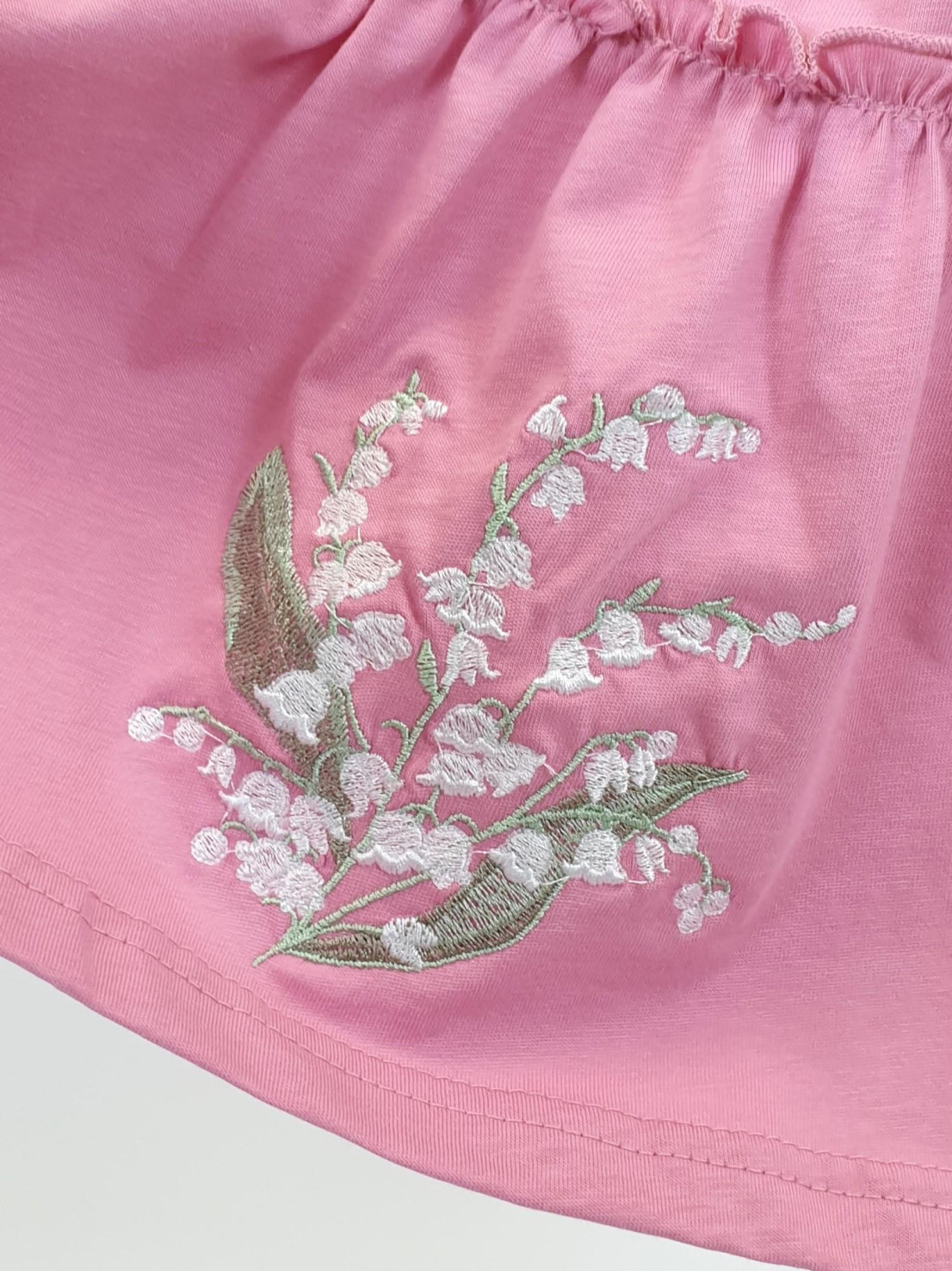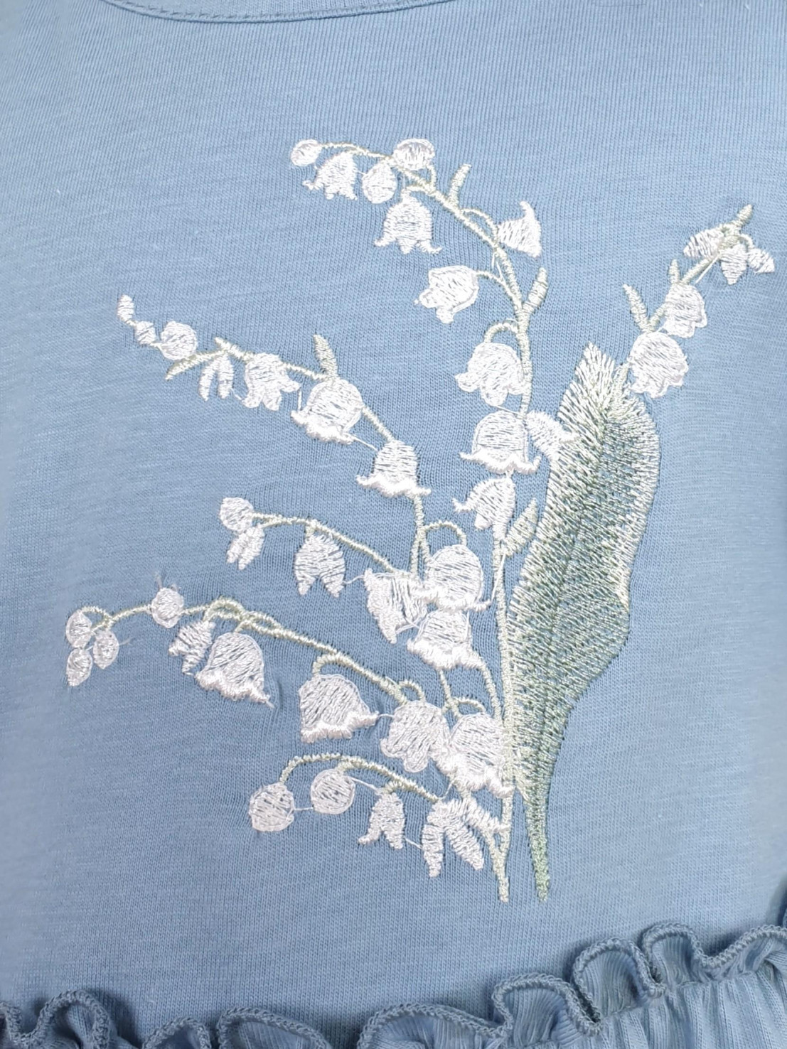 Кулирное полотно:100% х/б. Платье-силуэт трапеция,короткий рукав "фонарик".Юбка переда и спинки из двух воланов,по передднему нижнему волану вышивка.Кокетка переда с вышивкой,застежка по спинке на пуговицы.Горловина окантована.