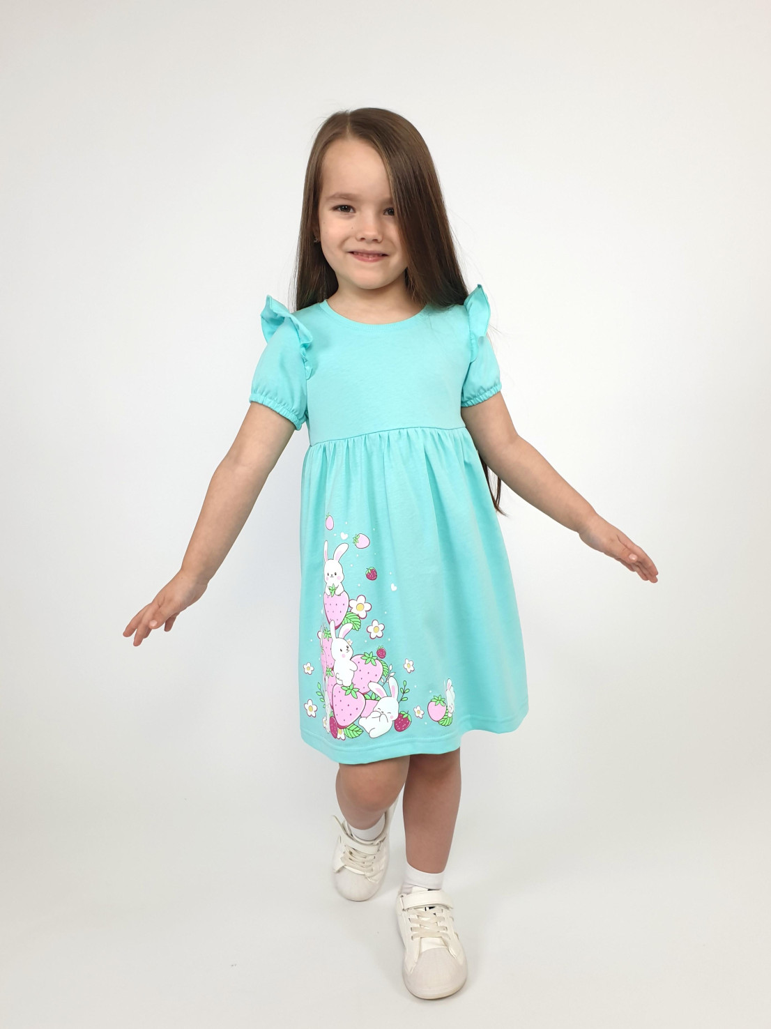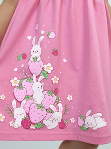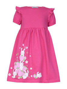 Кулирное полотно:100% х/б. Платье-перед и спинка с кокеткой,сборка по верху юбки.Рукав короткий,внизу собран на резинку,в пройме рюша.Горловина обработана ластиком.Печать на переднем полотнище юбки.