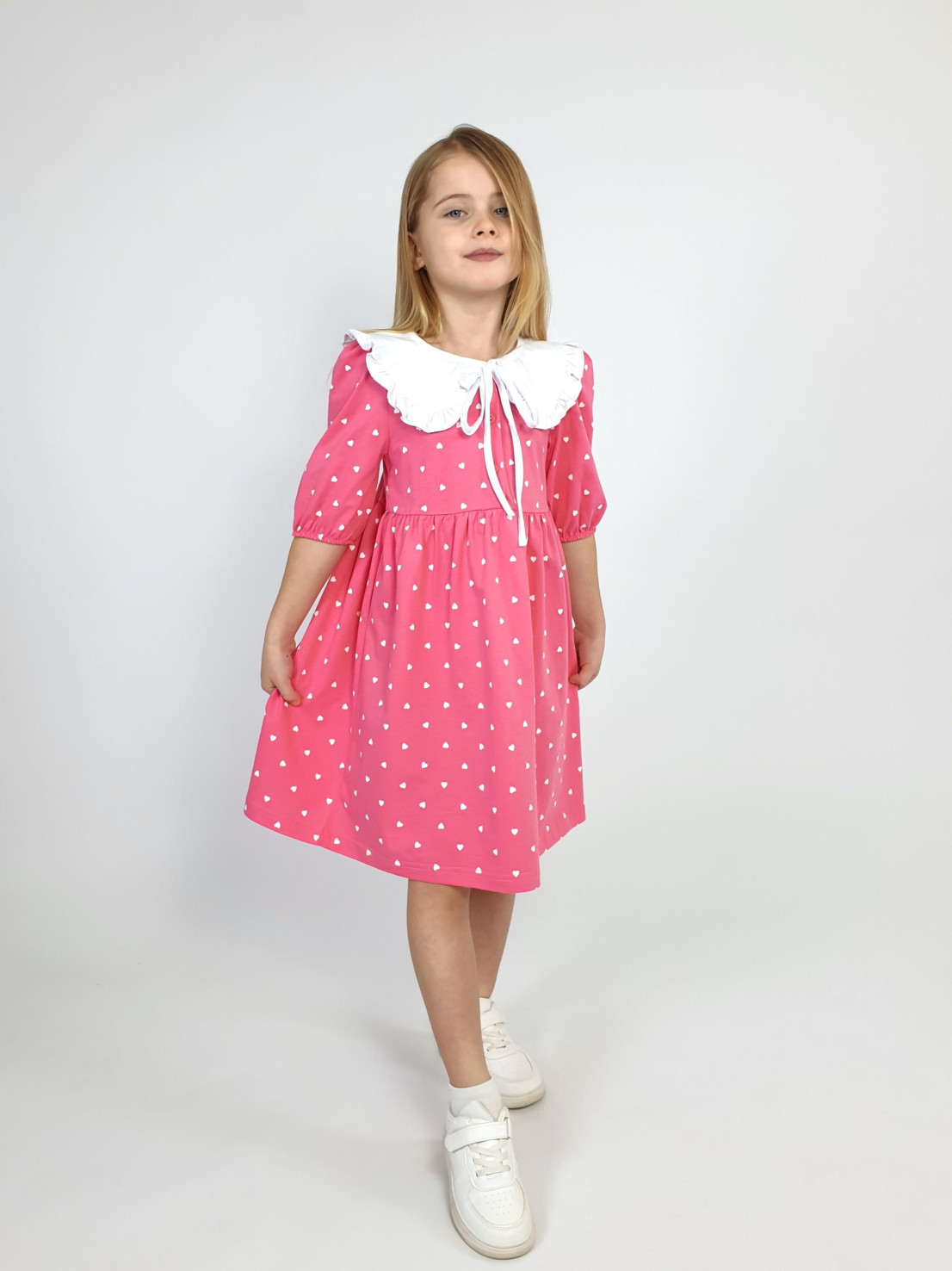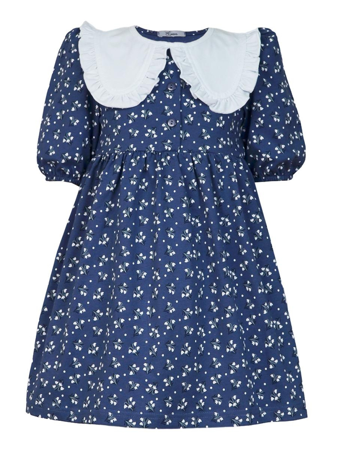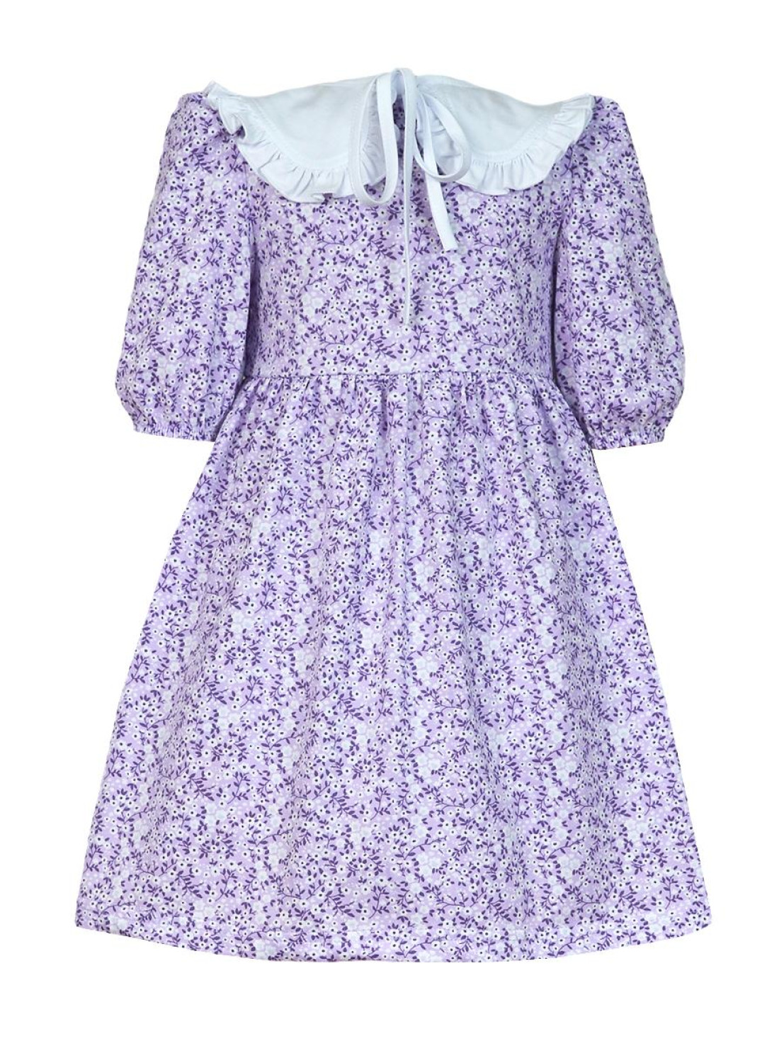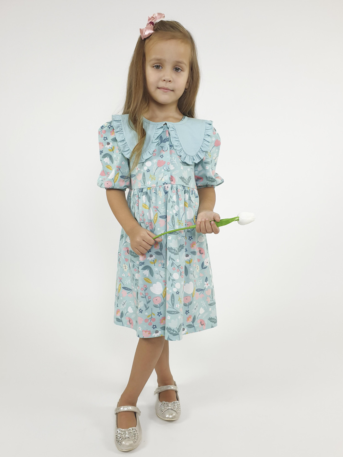 Кулирное полотно:100% х/б. Платье-с отрезной юбкой в сборку.Короткий рукав с резинкой внизу,сборка по окату.Горловина окантована и подшита,застежка центральная на пуговицы.Отделочный съемный воротник с рюшей,завязывающийся на бант.