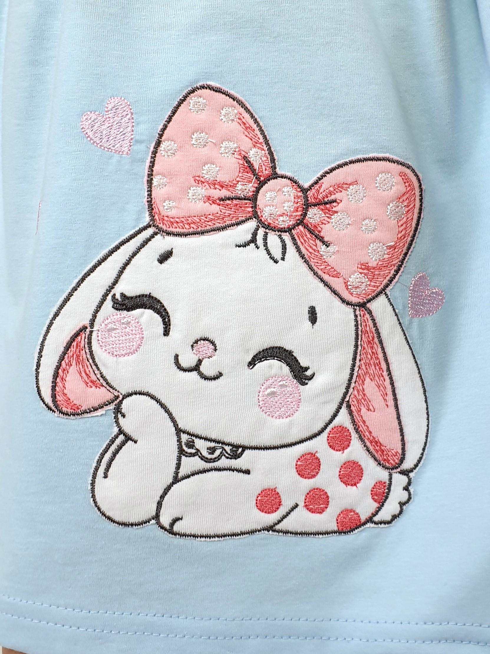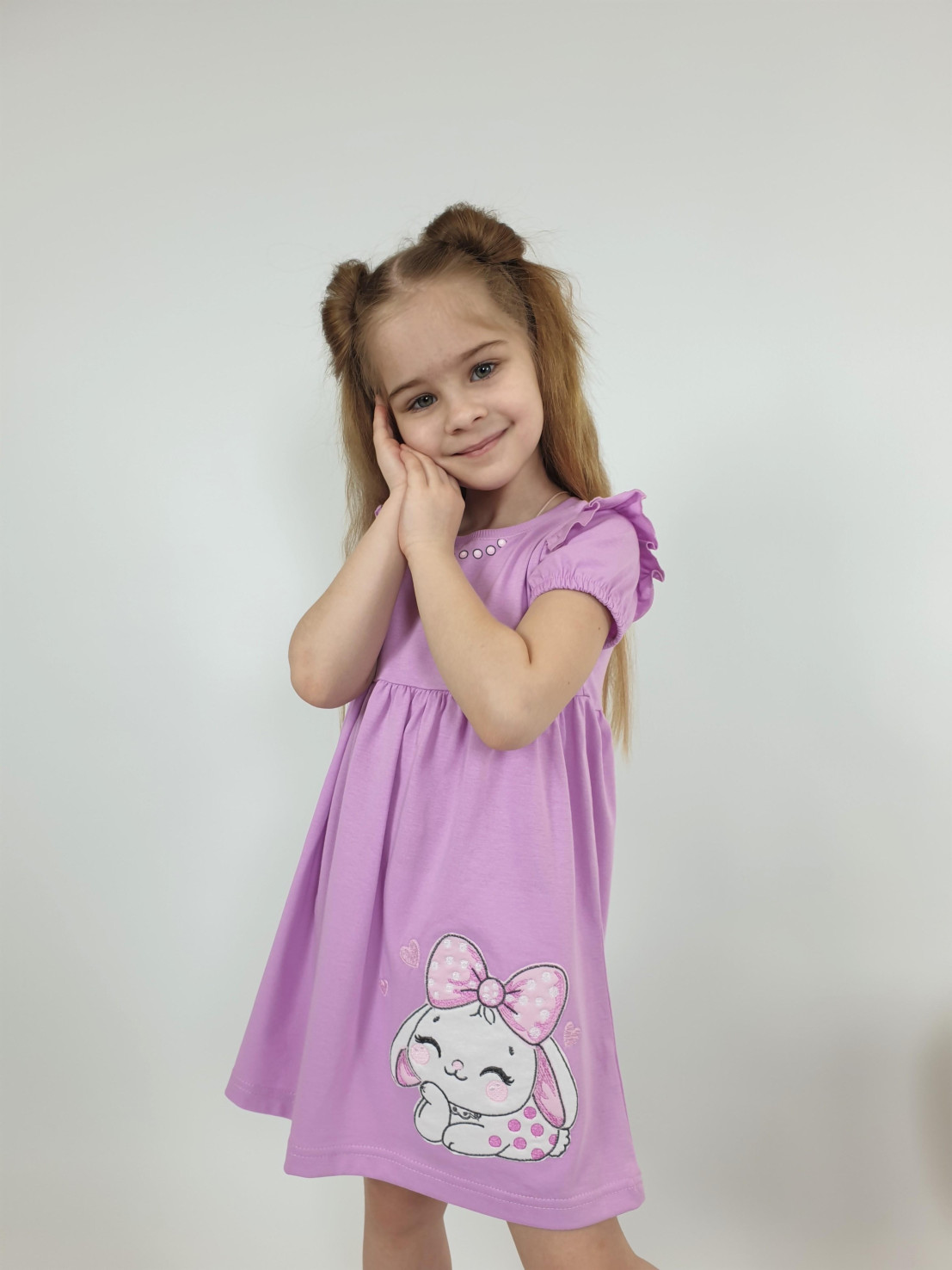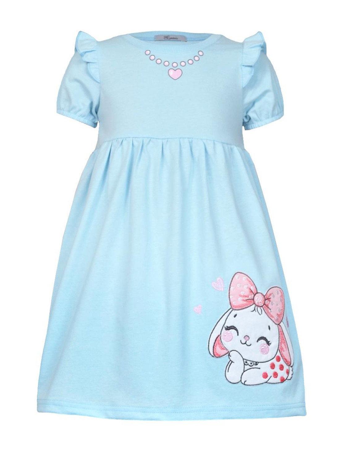 Кулирное полотно:100% х/б. Платье-перед и спинка с кокеткой,сборка по верху юбки.Рукав короткий,внизу собран на резинку.в пройме рюша.Горловина обработана ластиком.Печать на кокетке переда,на переднем полотнище юбки-вышивка.