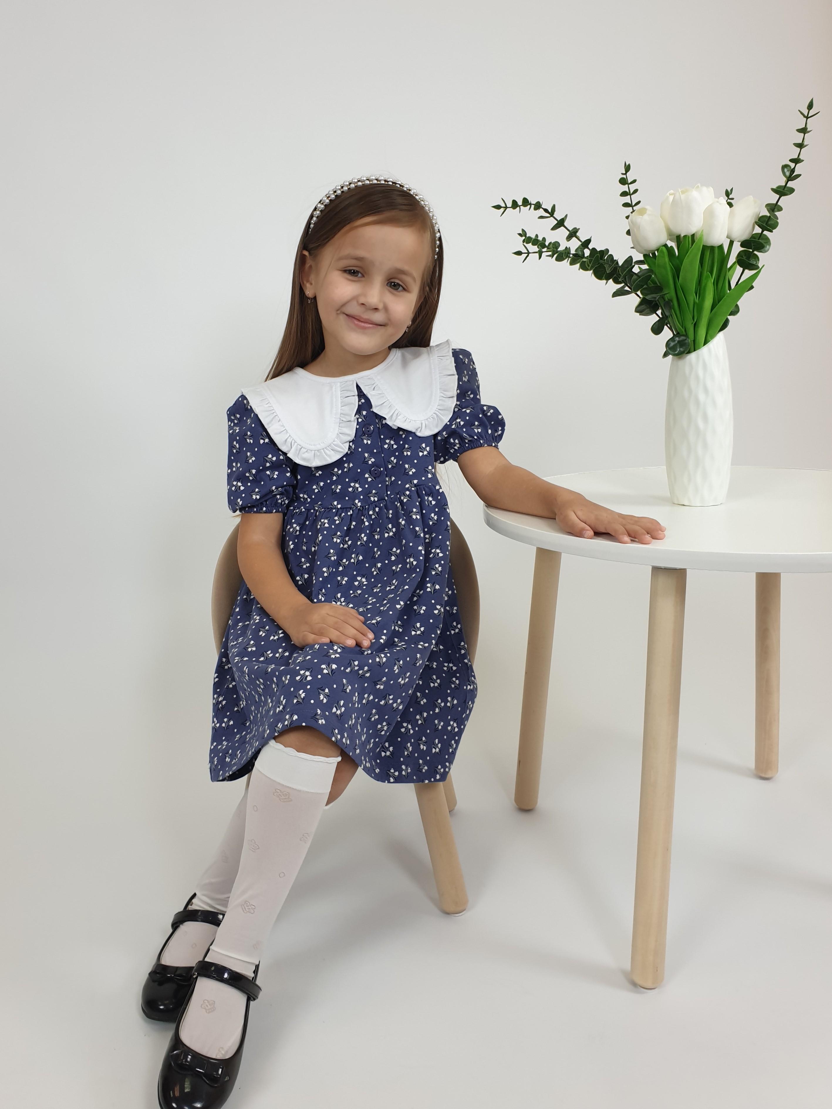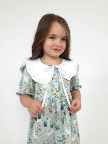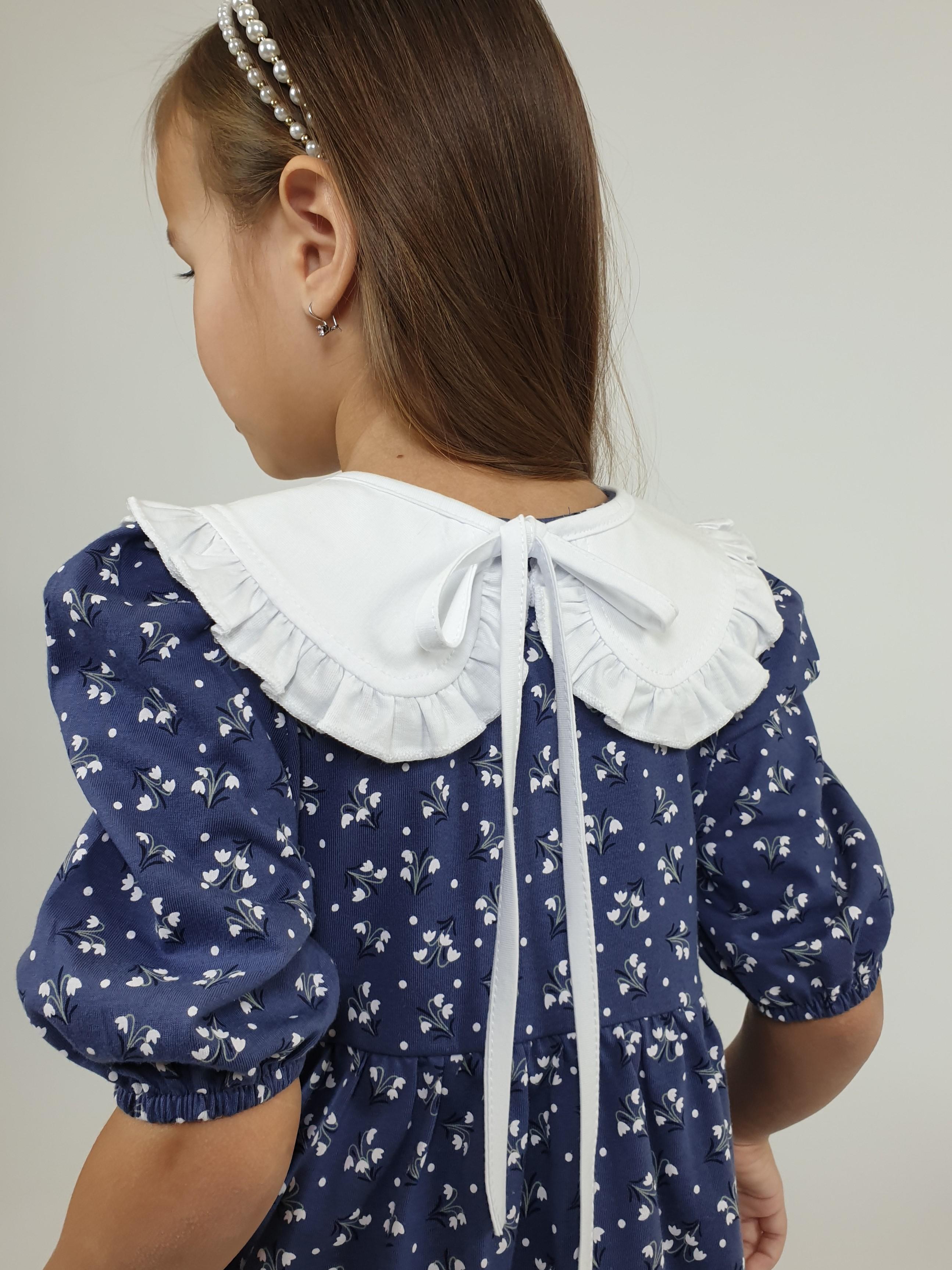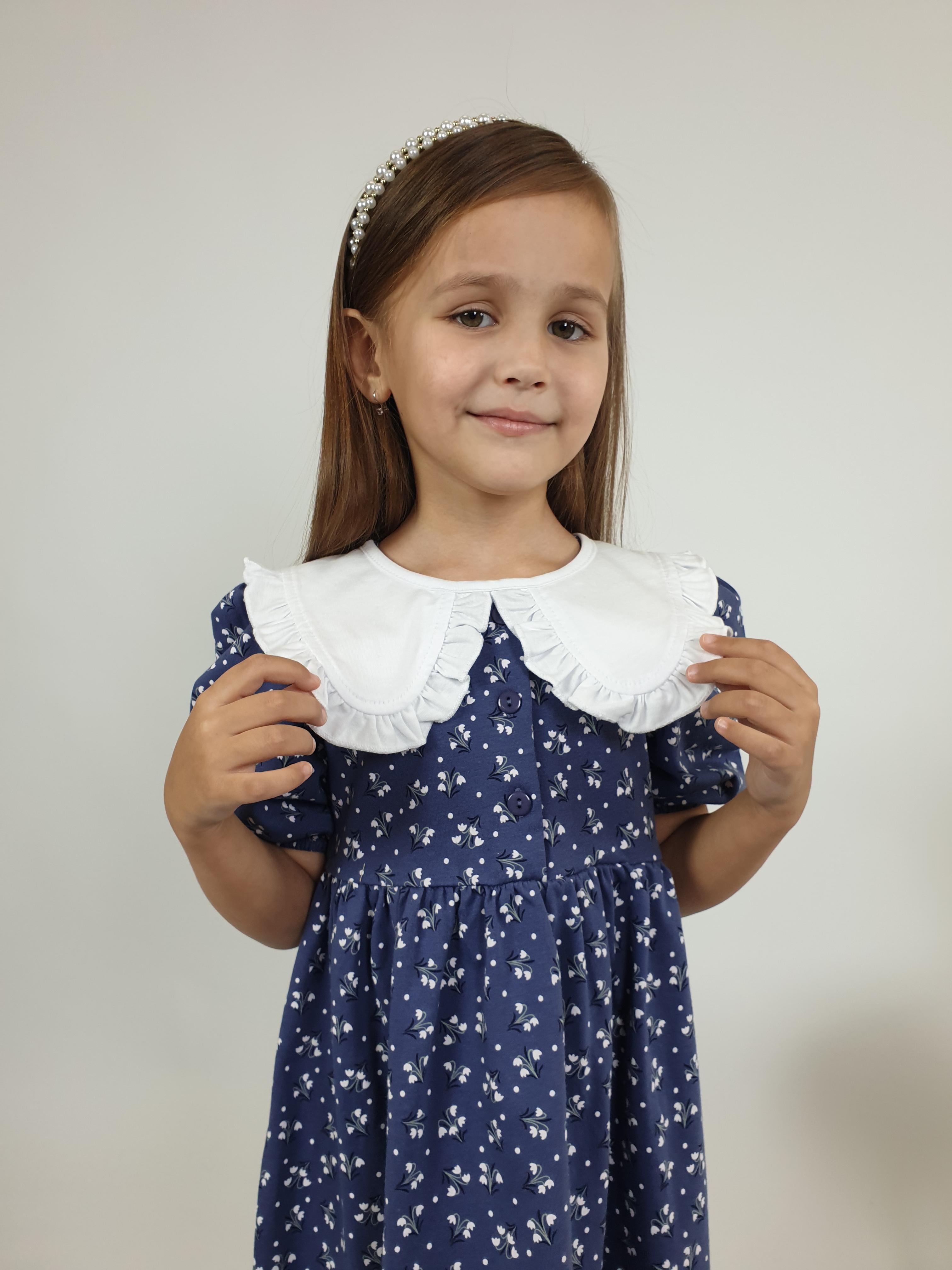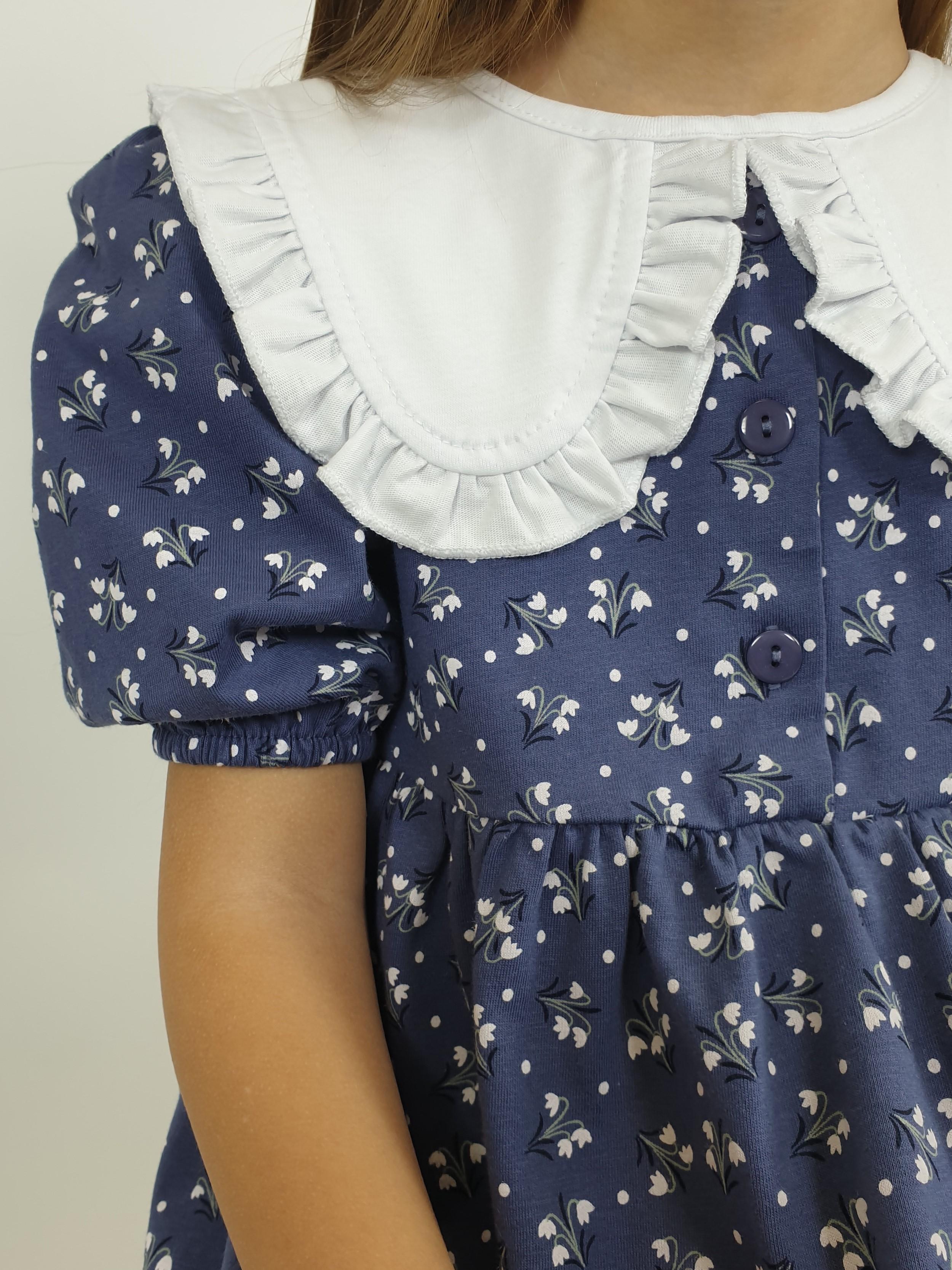 Кулирное полотно:100% х/б. Платье-с отрезной юбкой в сборку.Короткий рукав с резинкой внизу,сборка по окату.Горловина окантована и подшита,застежка центральная на пуговицы.Отделочный съемный воротник с рюшей,завязывающийся на бант.