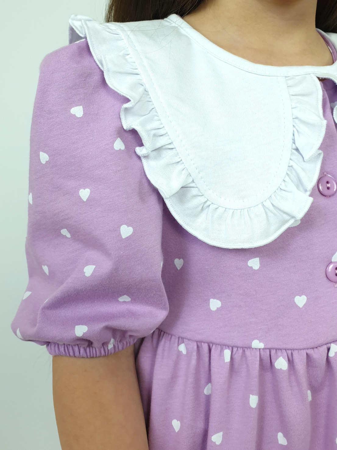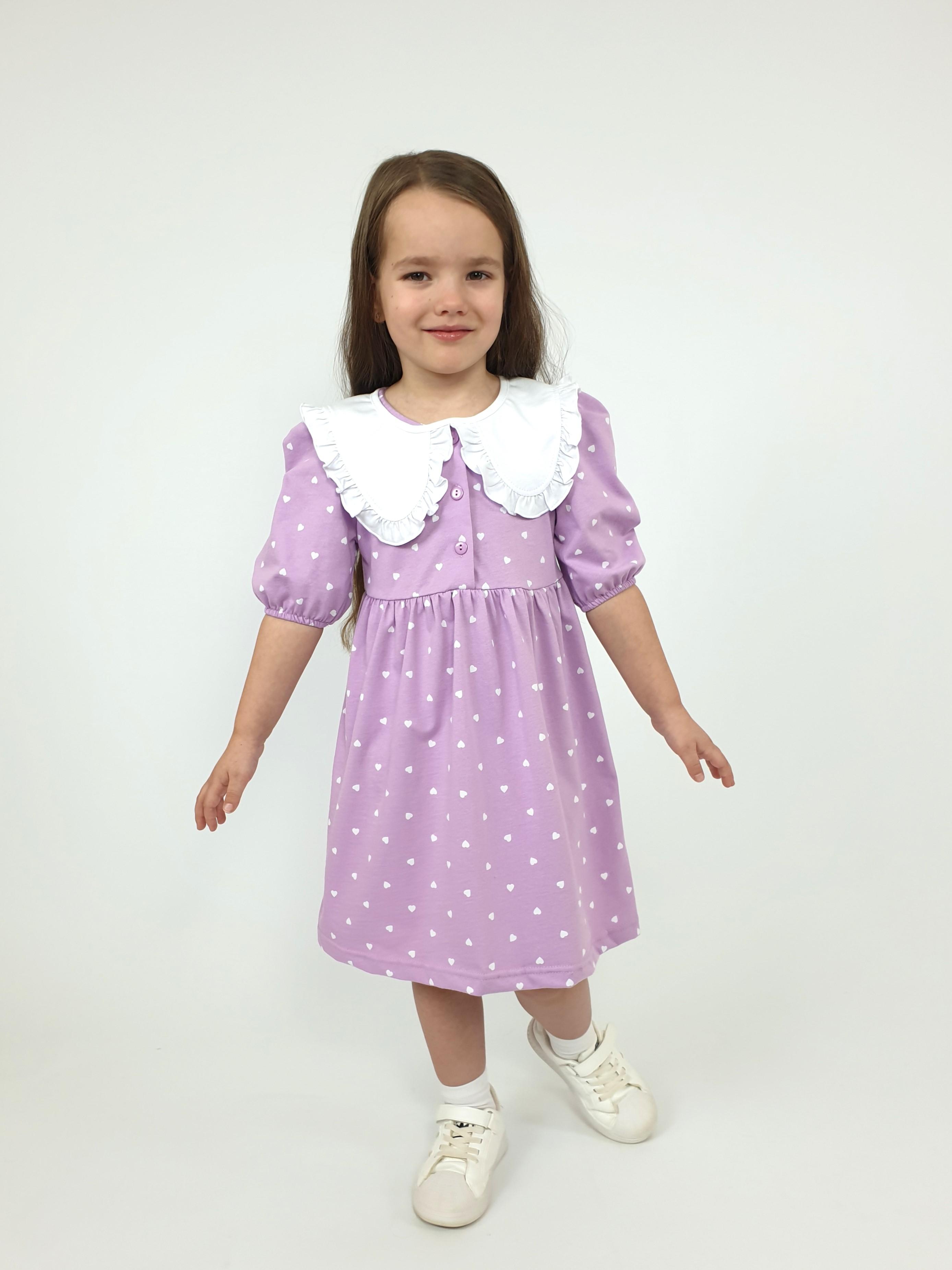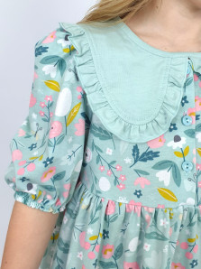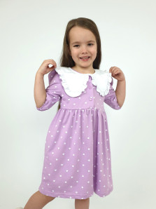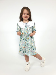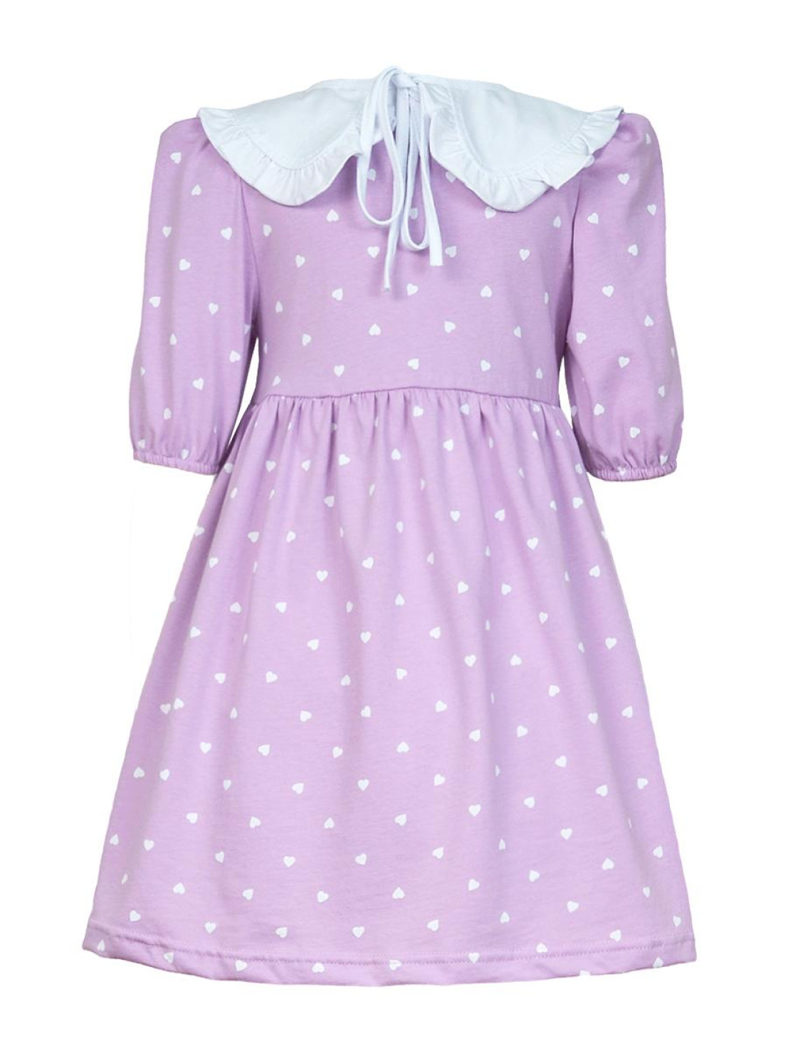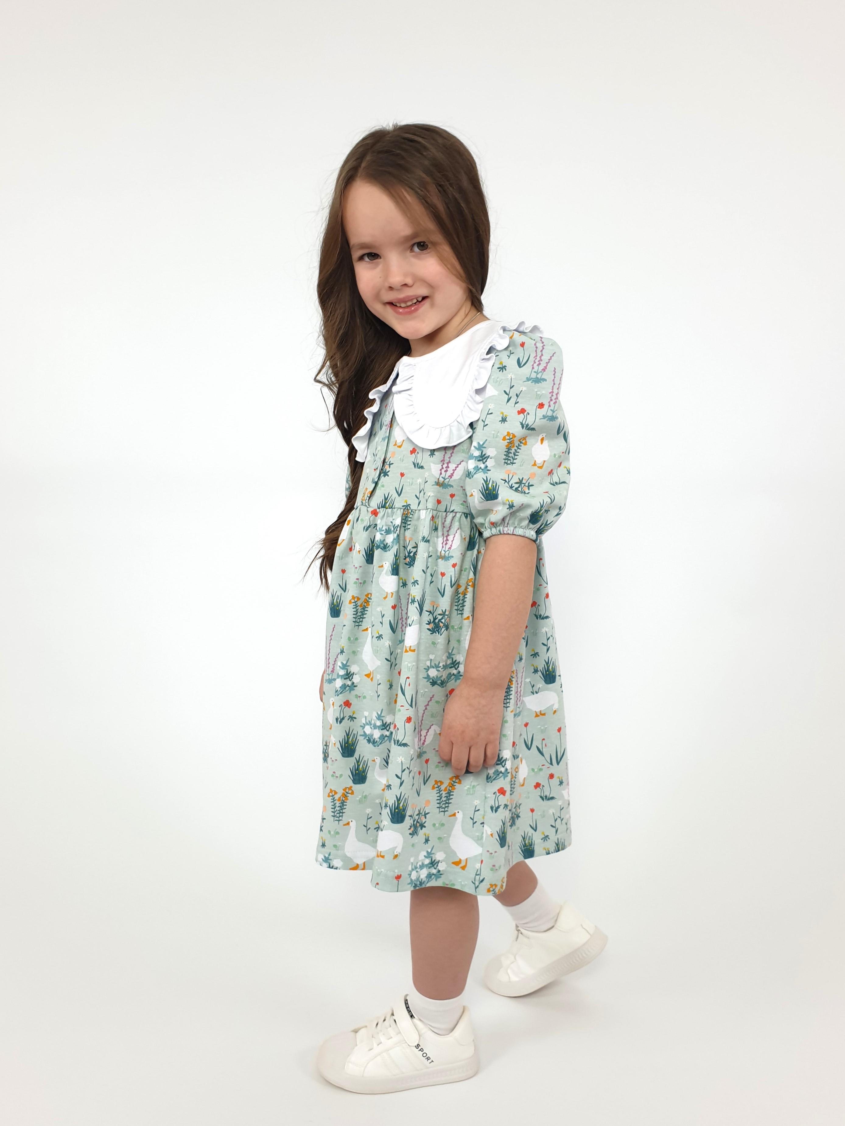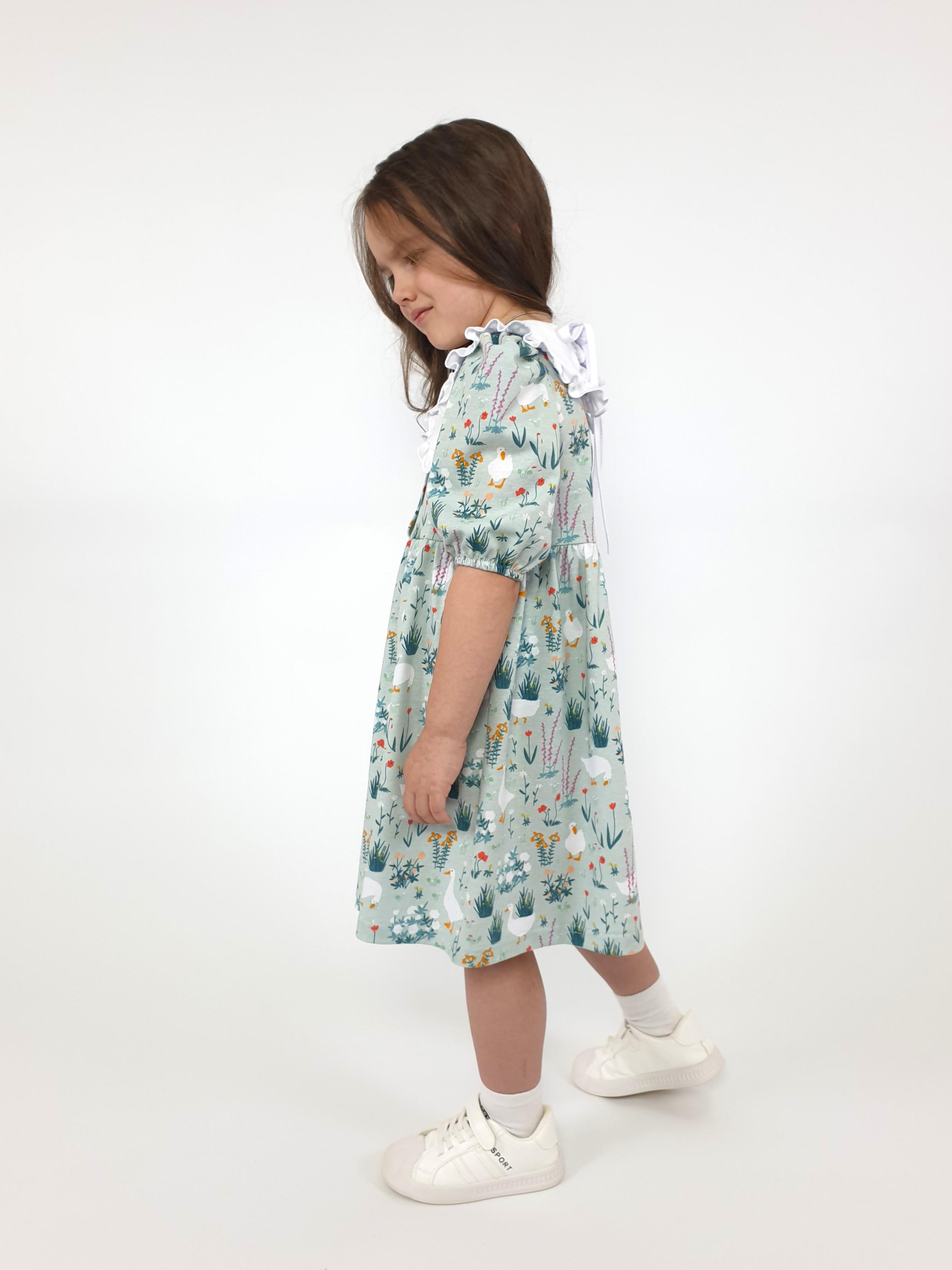 Кулирное полотно:100% х/б. Платье-с отрезной юбкой в сборку.Короткий рукав с резинкой внизу,сборка по окату.Горловина окантована и подшита,застежка центральная на пуговицы.Отделочный съемный воротник с рюшей,завязывающийся на бант.