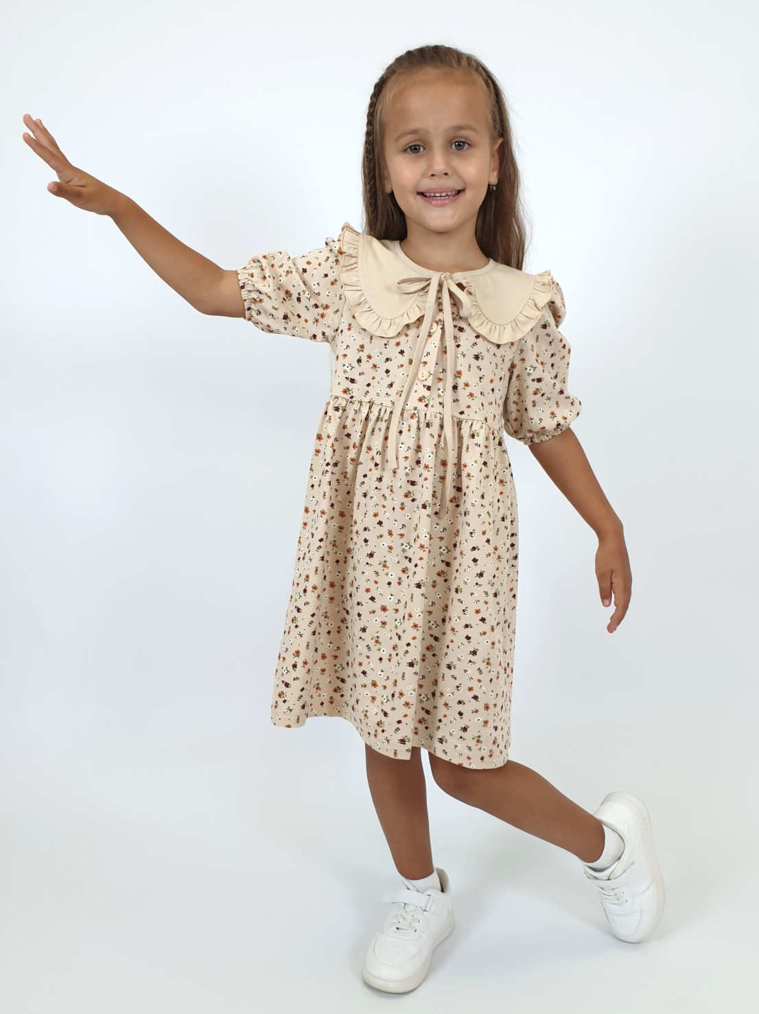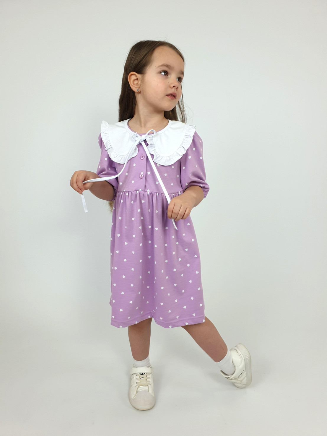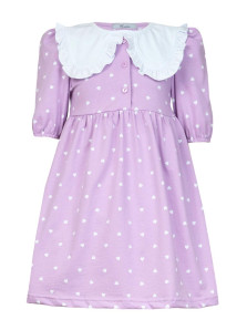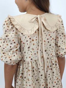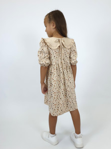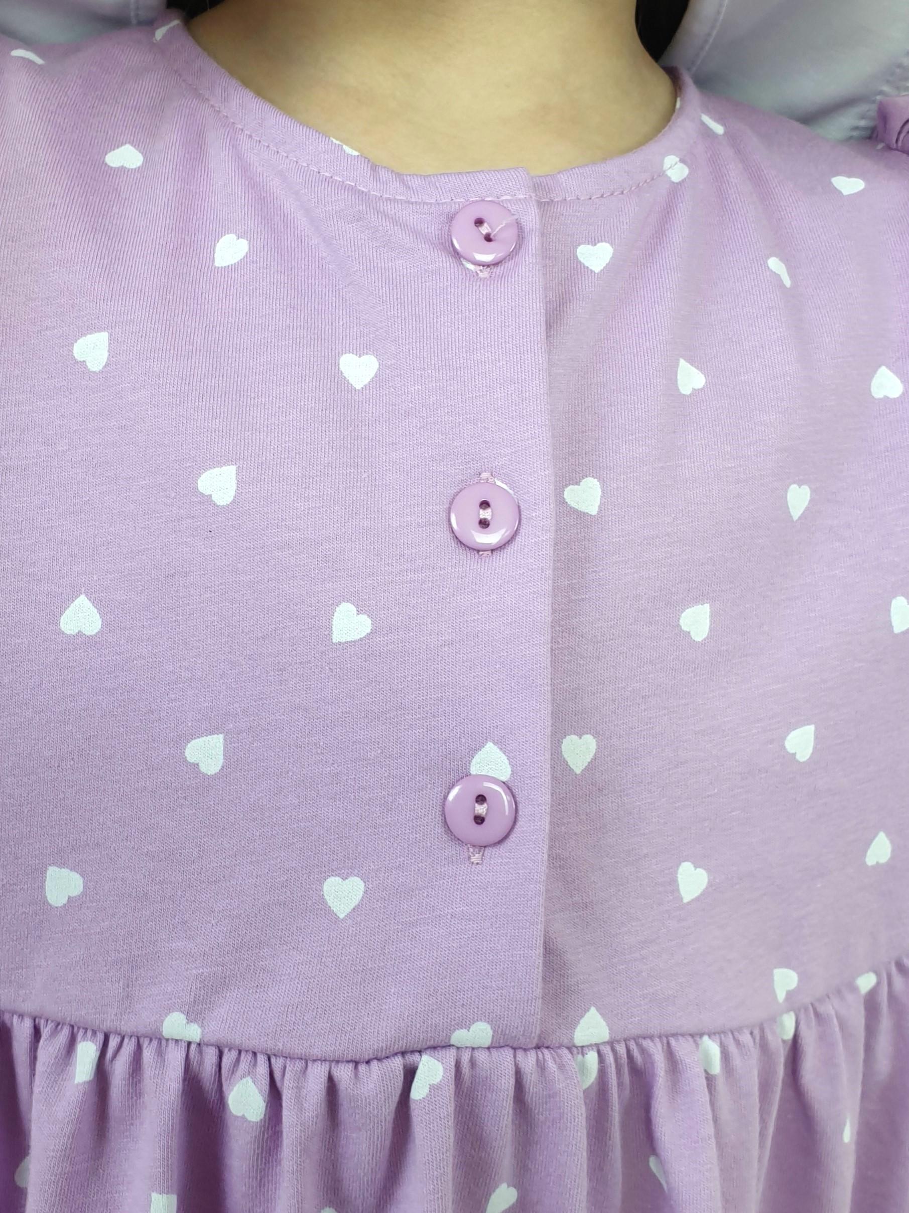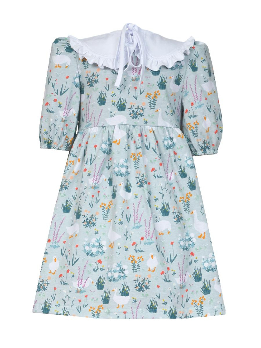 Кулирное полотно:100% х/б. Платье-с отрезной юбкой в сборку.Короткий рукав с резинкой внизу,сборка по окату.Горловина окантована и подшита,застежка центральная на пуговицы.Отделочный съемный воротник с рюшей,завязывающийся на бант.