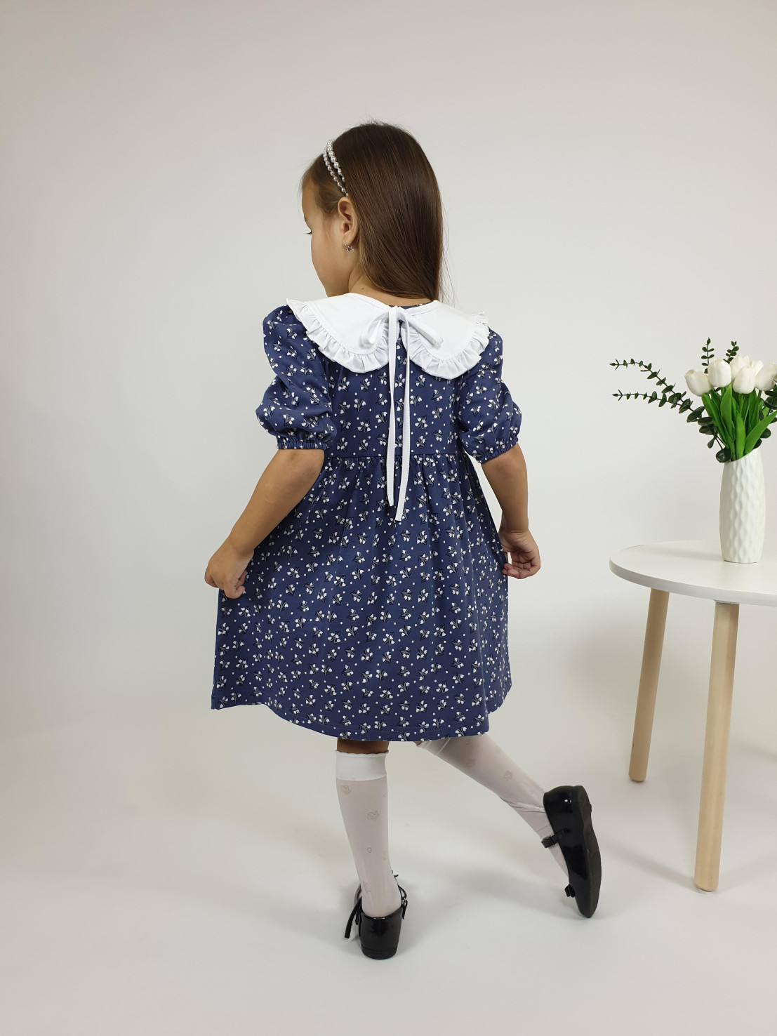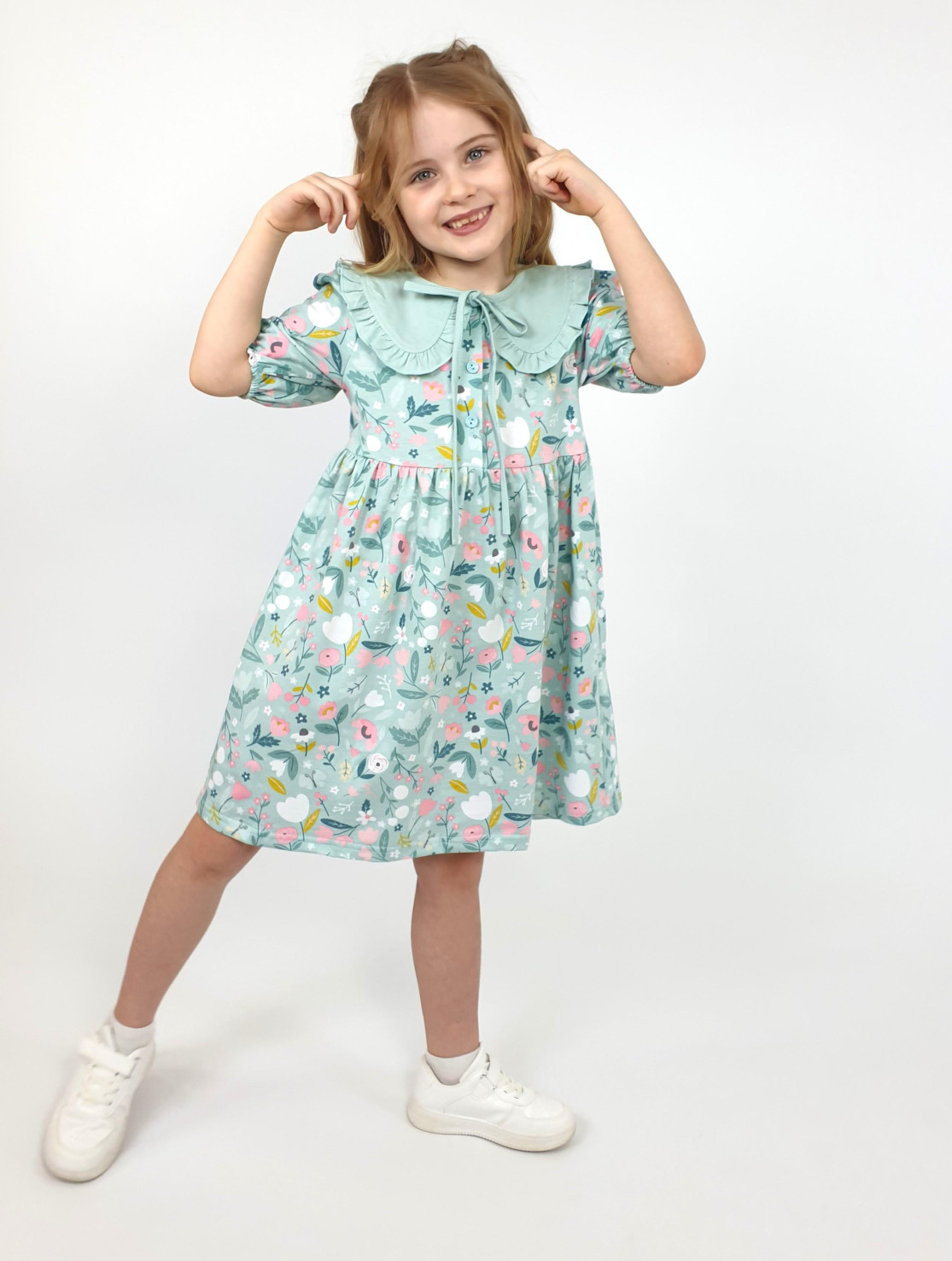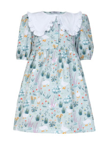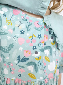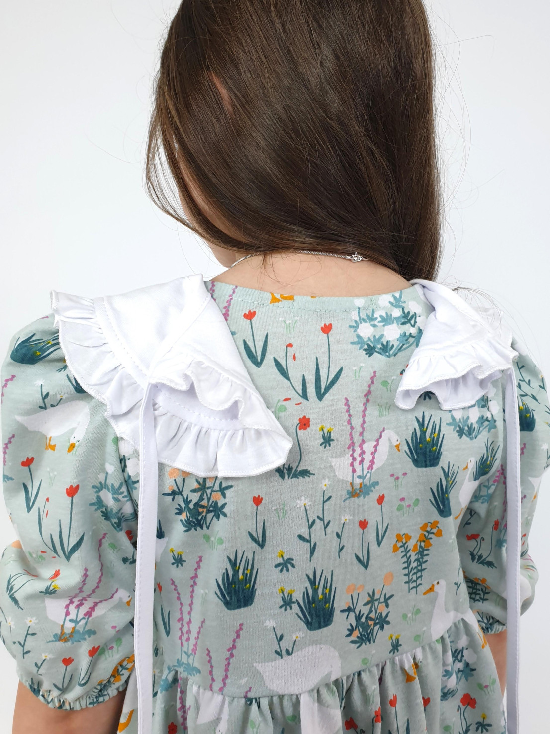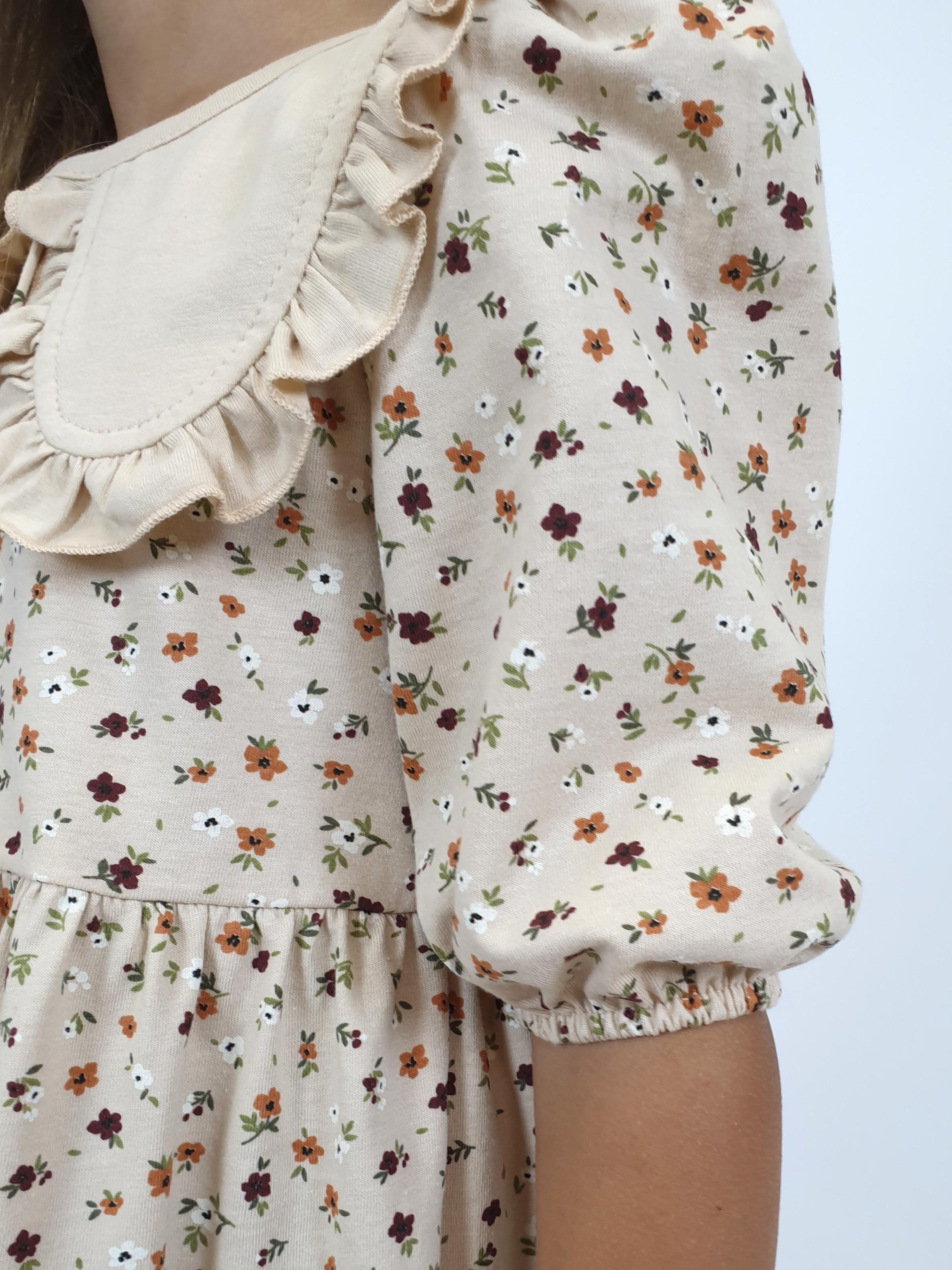 Кулирное полотно:100% х/б. Платье-с отрезной юбкой в сборку.Короткий рукав с резинкой внизу,сборка по окату.Горловина окантована и подшита,застежка центральная на пуговицы.Отделочный съемный воротник с рюшей,завязывающийся на бант.