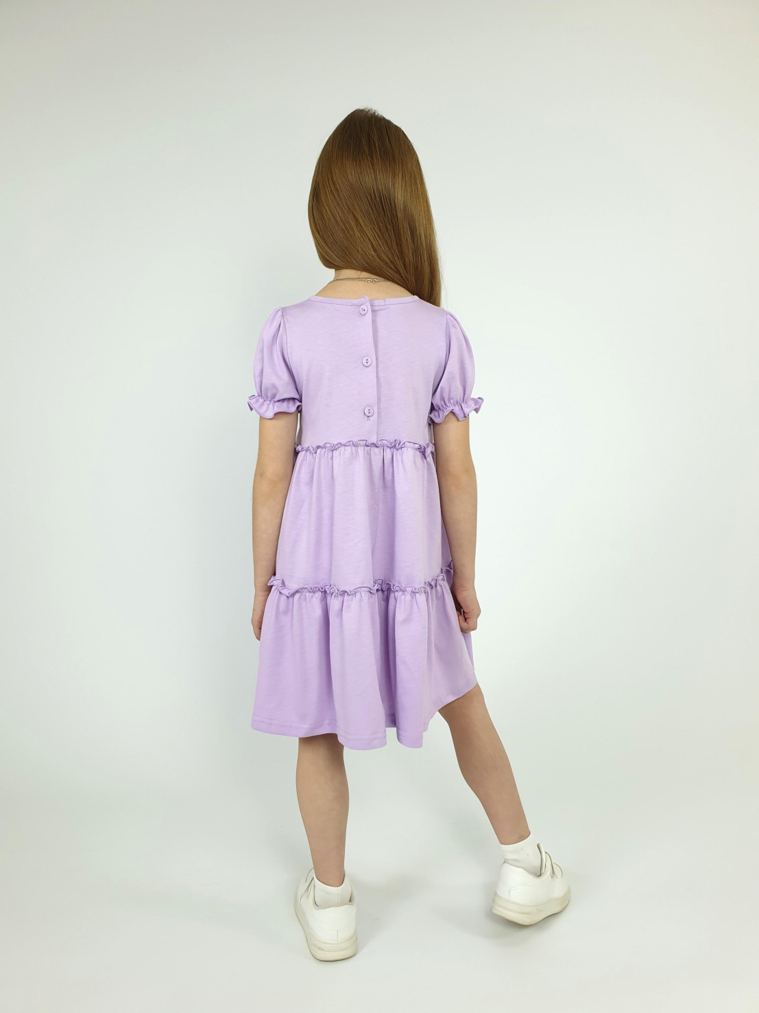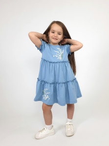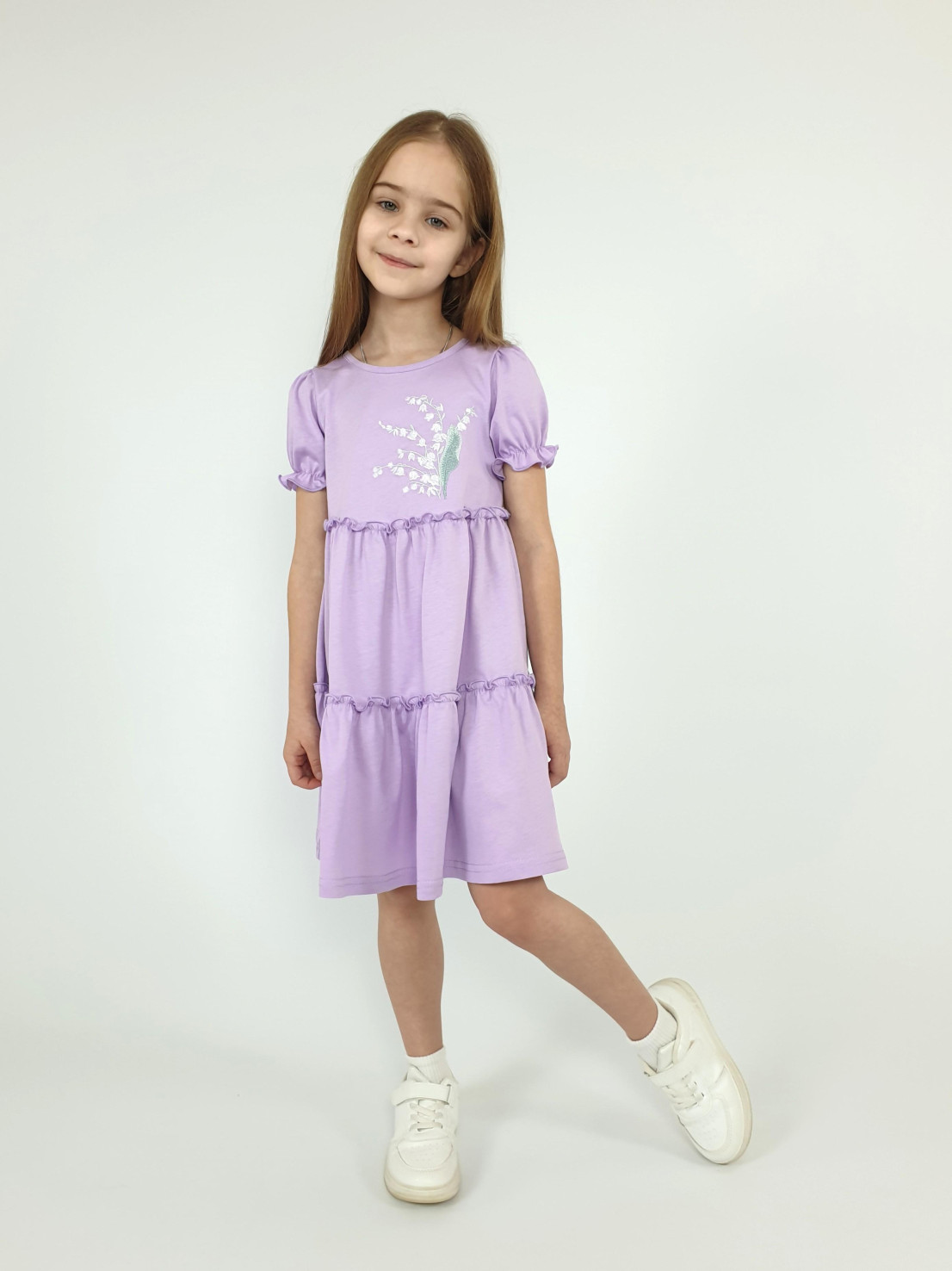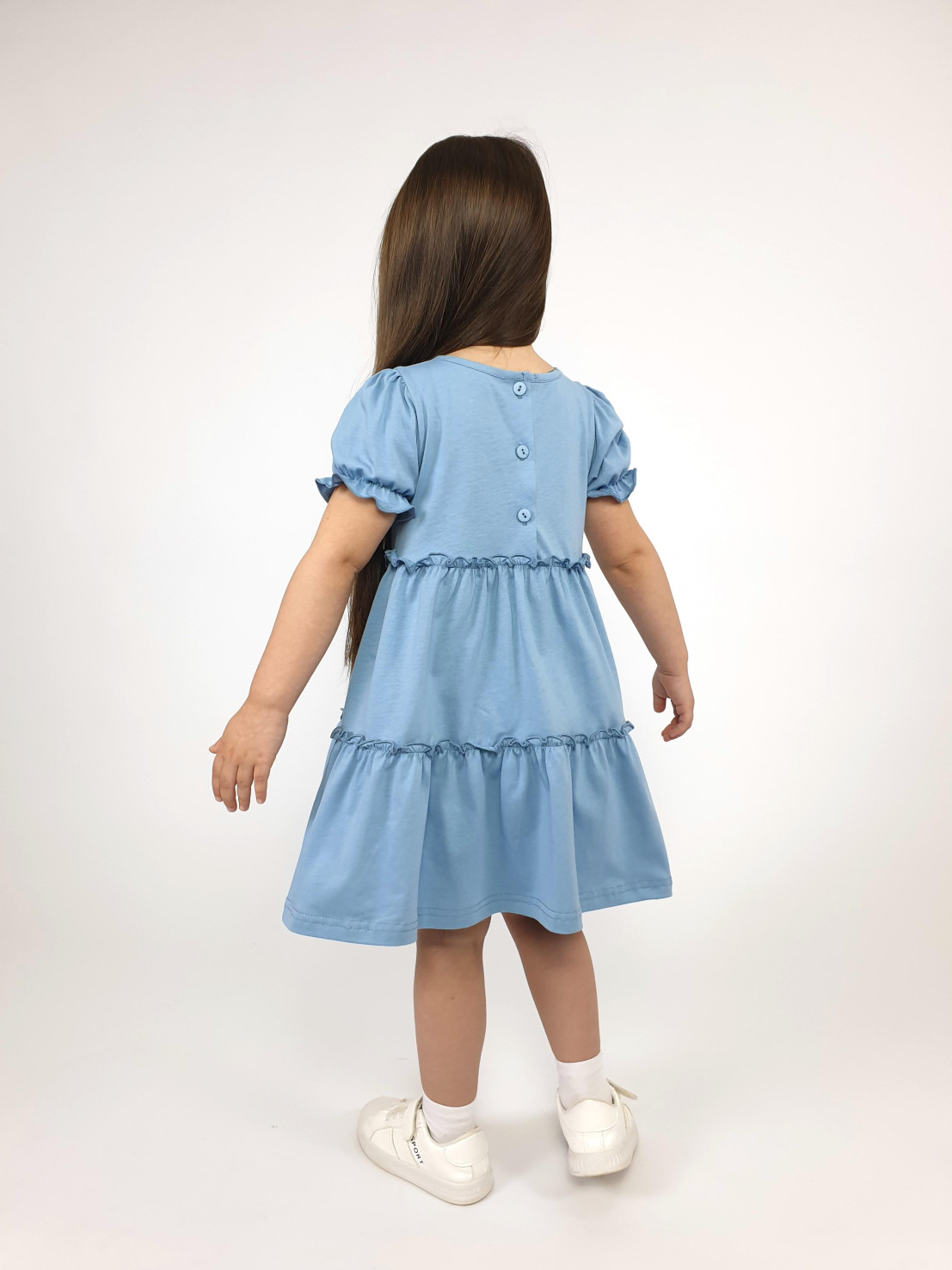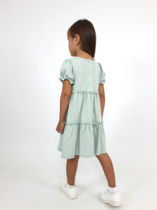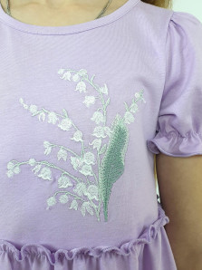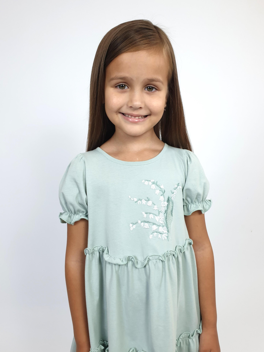 Кулирное полотно:100% х/б. Платье-силуэт трапеция,короткий рукав "фонарик".Юбка переда и спинки из двух воланов,по передднему нижнему волану вышивка.Кокетка переда с вышивкой,застежка по спинке на пуговицы.Горловина окантована.