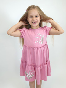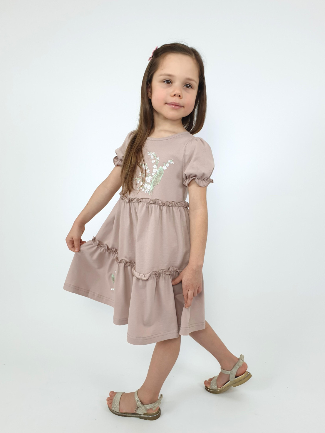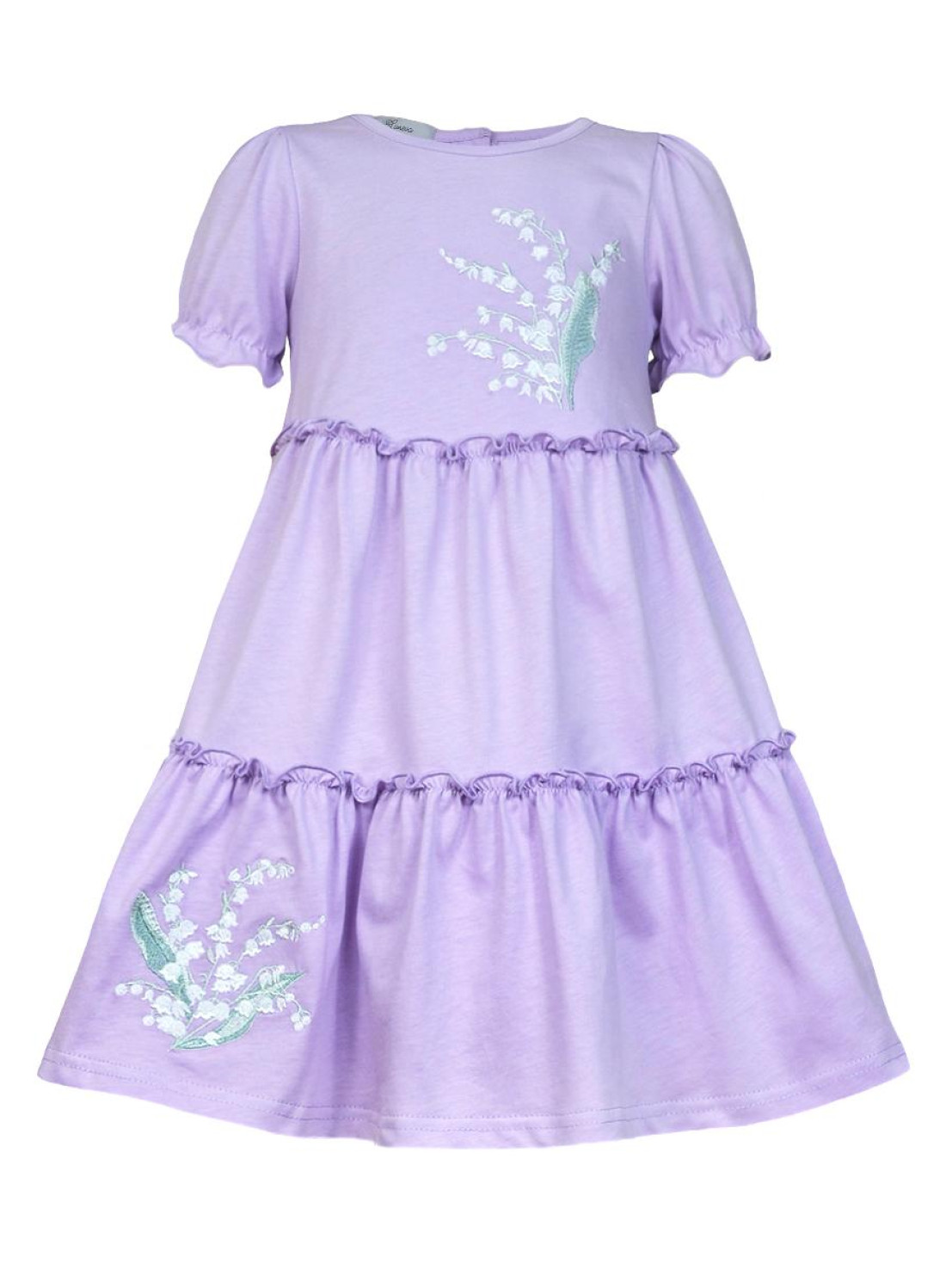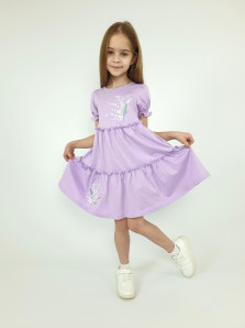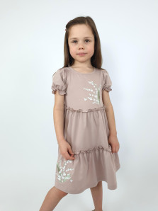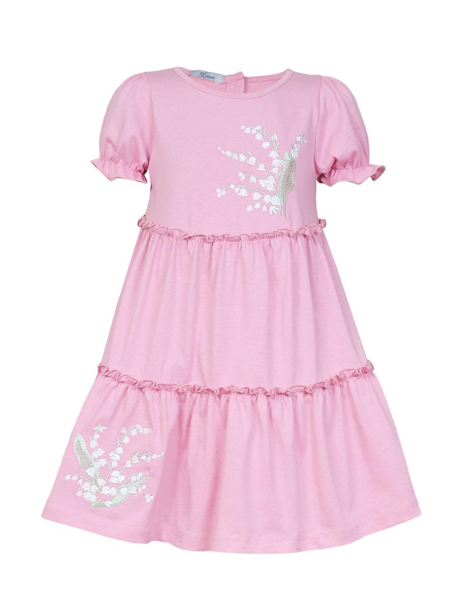 Кулирное полотно:100% х/б. Платье-силуэт трапеция,короткий рукав "фонарик".Юбка переда и спинки из двух воланов,по передднему нижнему волану вышивка.Кокетка переда с вышивкой,застежка по спинке на пуговицы.Горловина окантована.