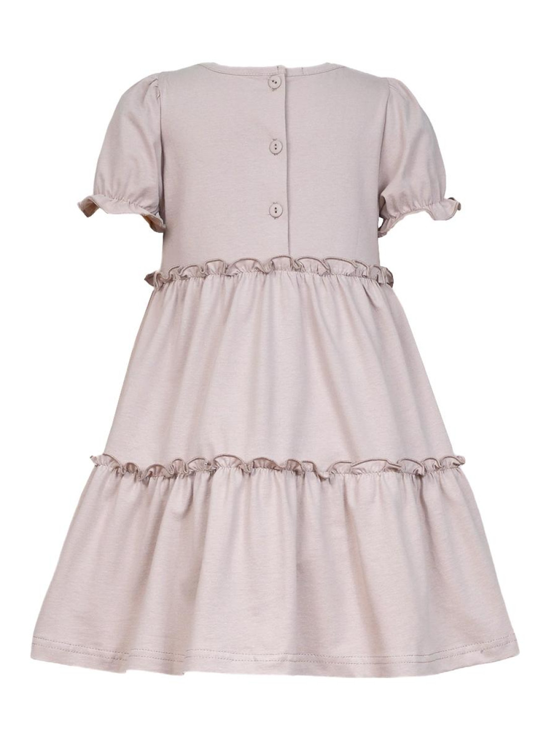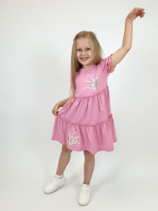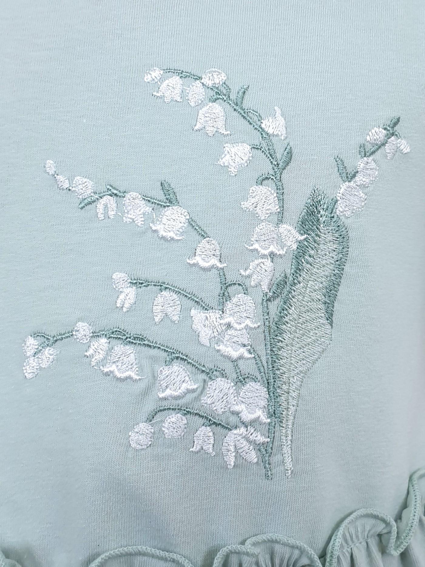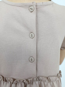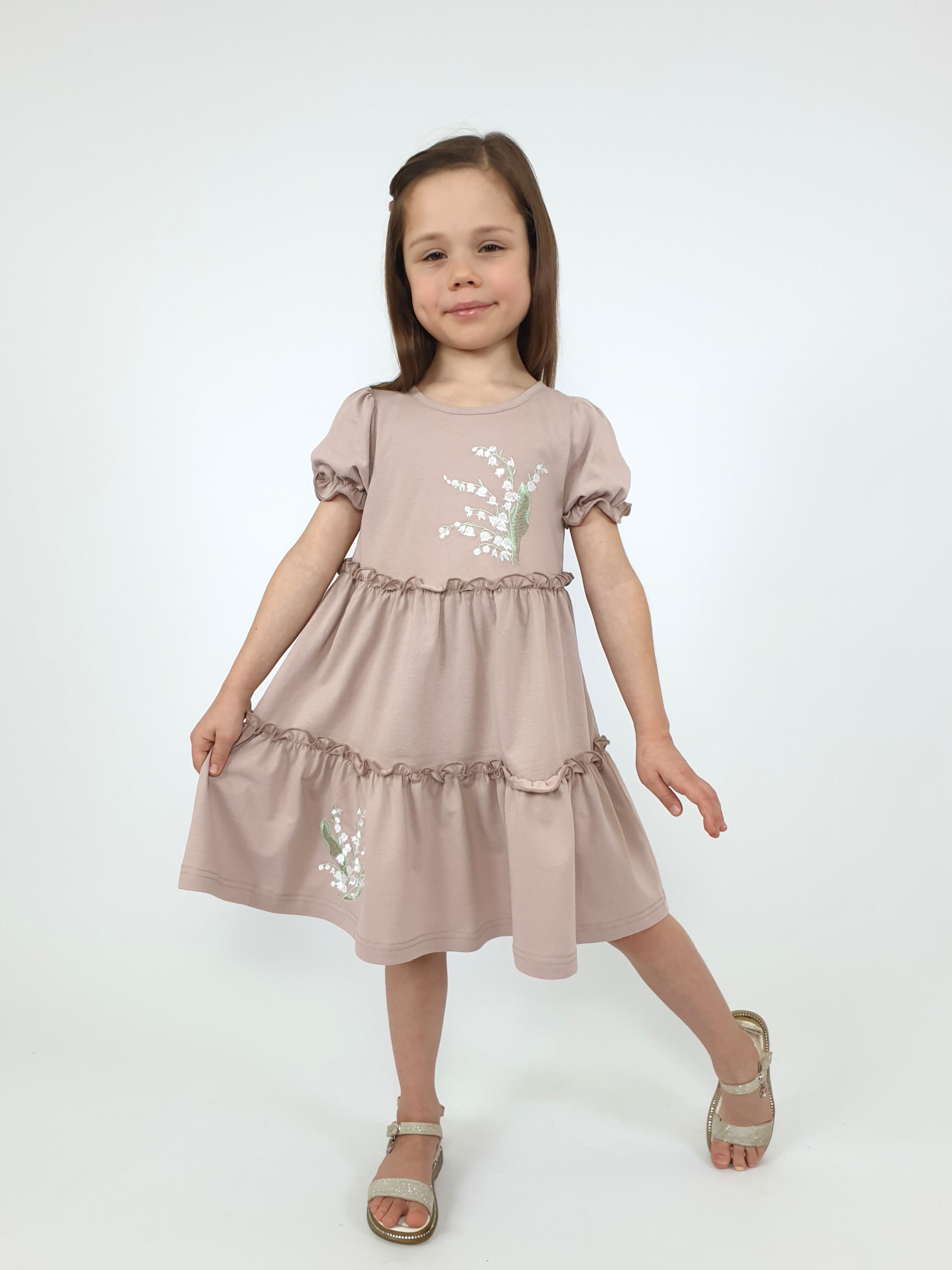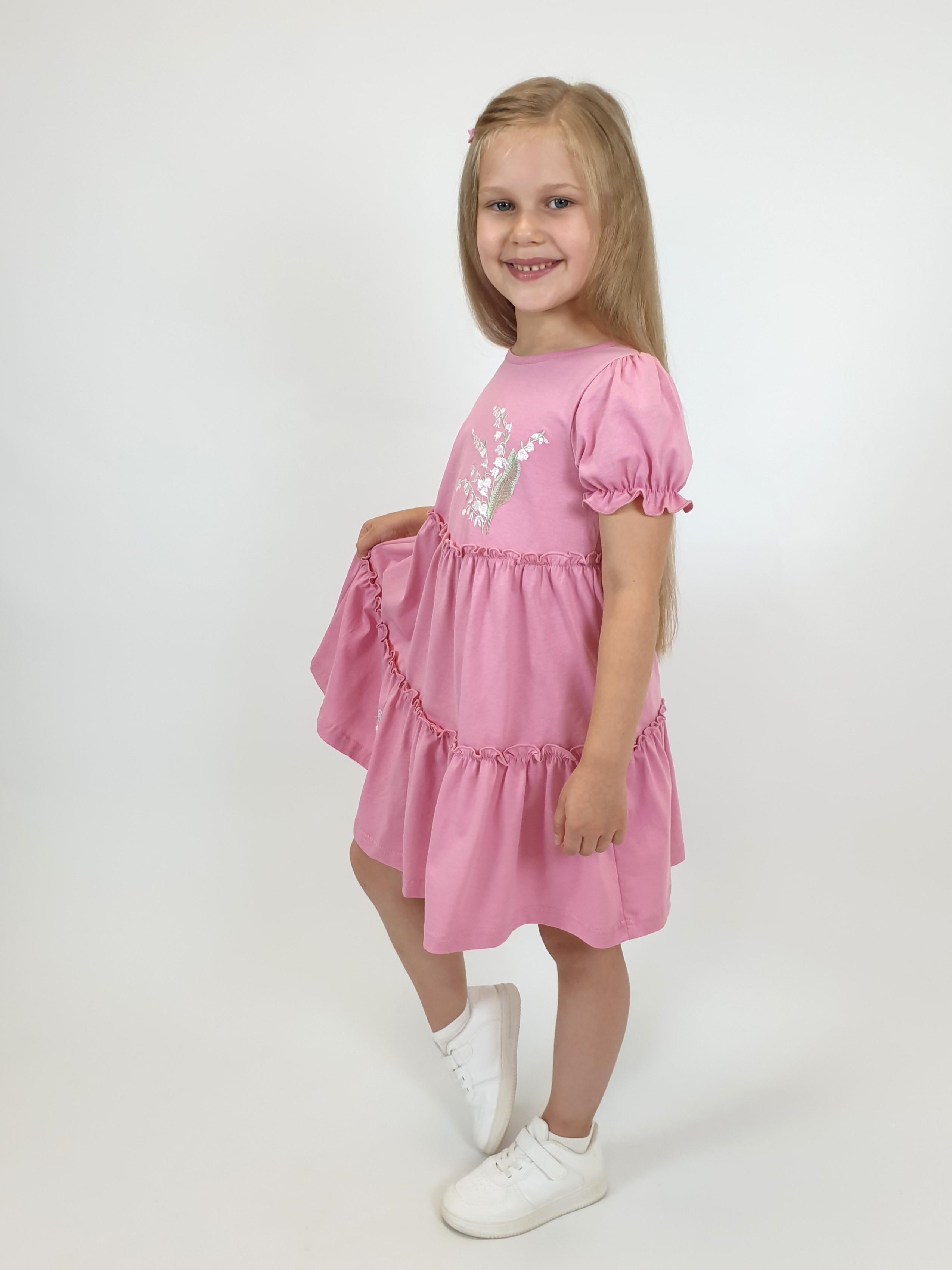 Кулирное полотно:100% х/б. Платье-силуэт трапеция,короткий рукав "фонарик".Юбка переда и спинки из двух воланов,по передднему нижнему волану вышивка.Кокетка переда с вышивкой,застежка по спинке на пуговицы.Горловина окантована.