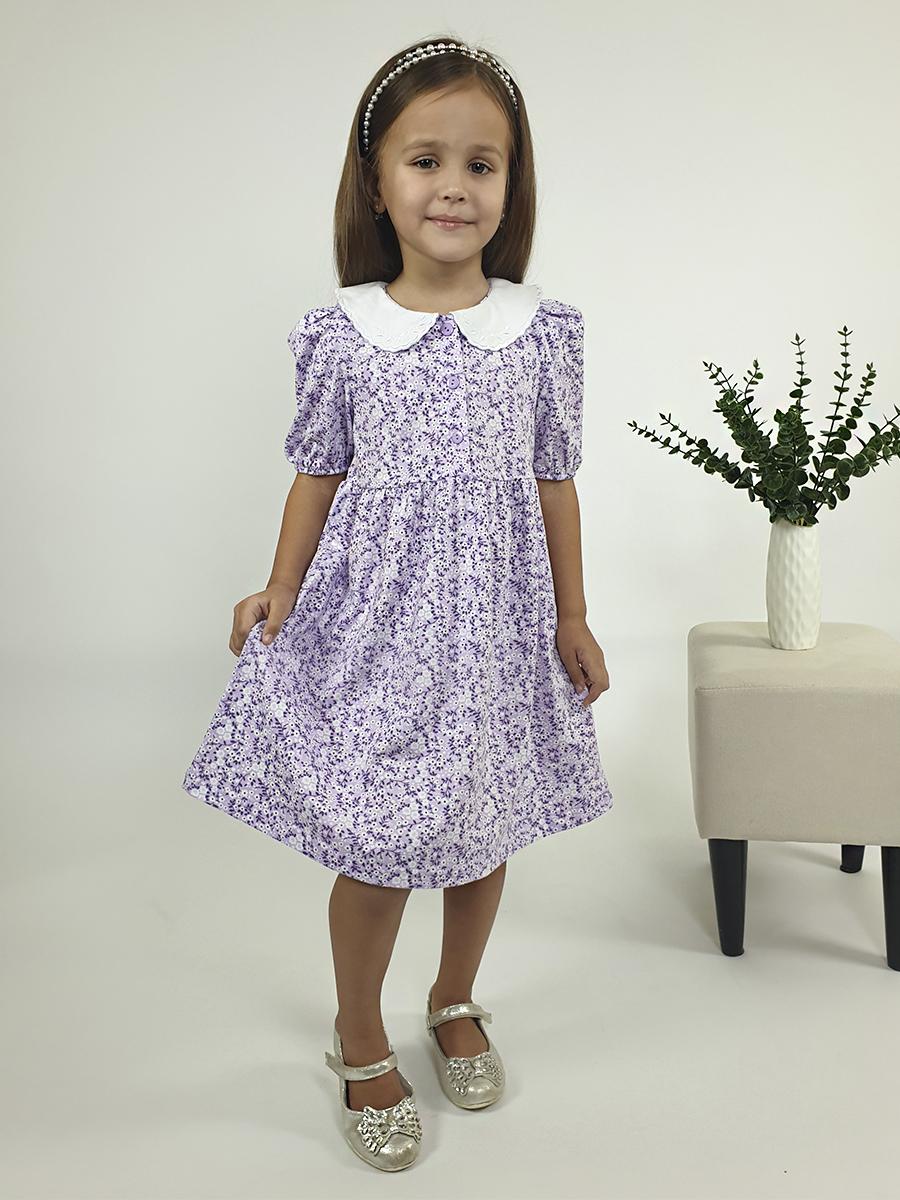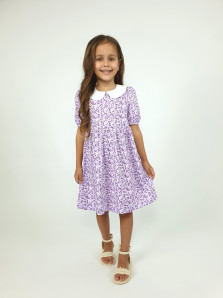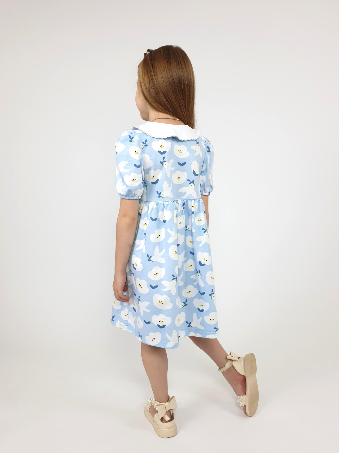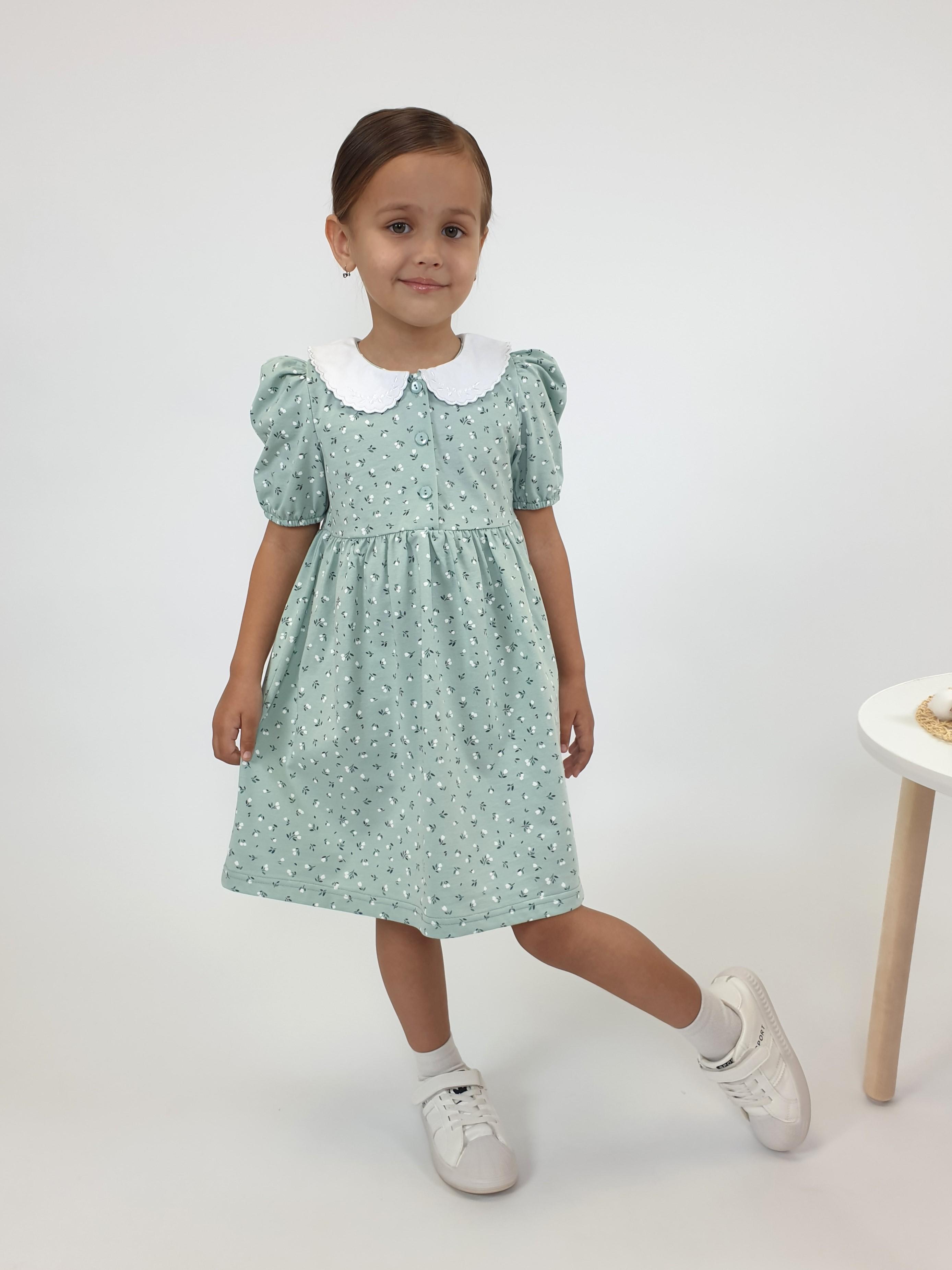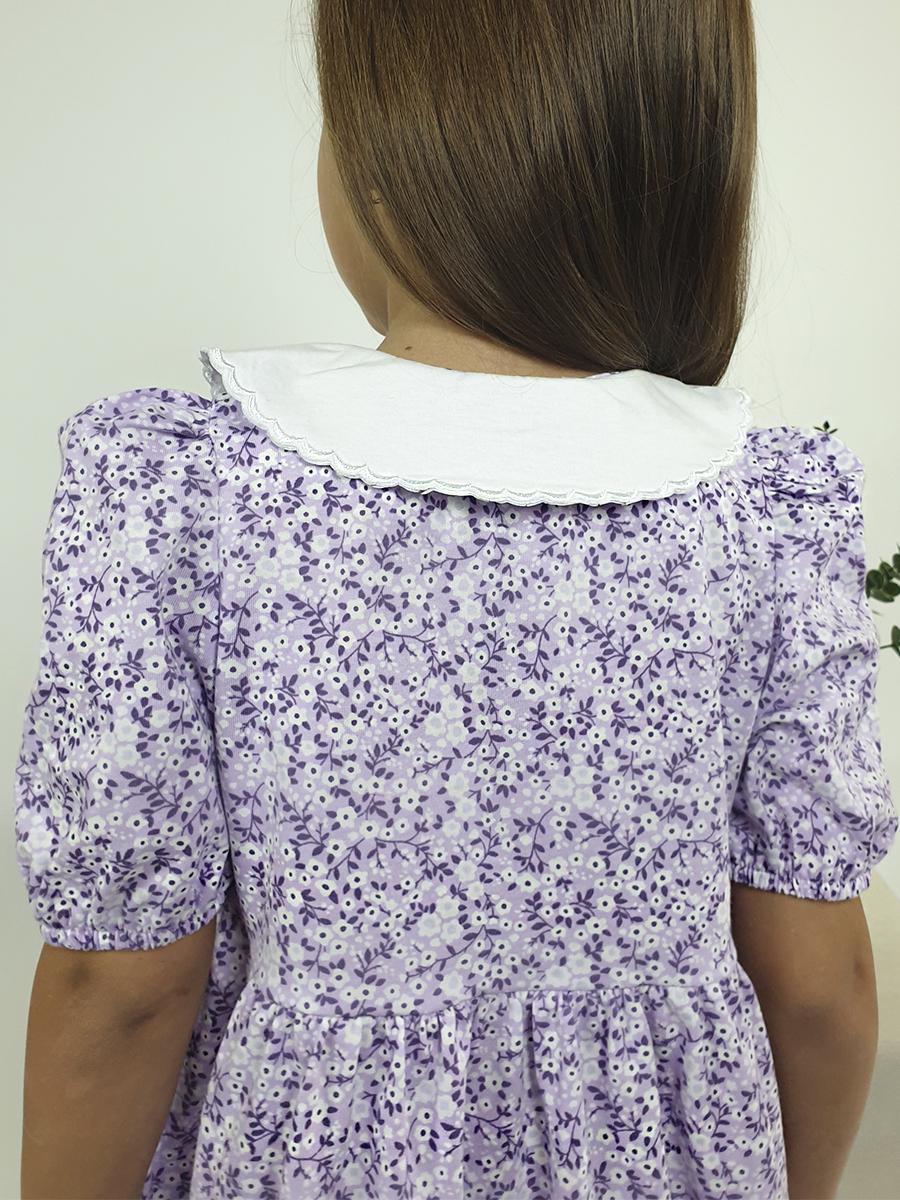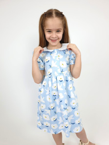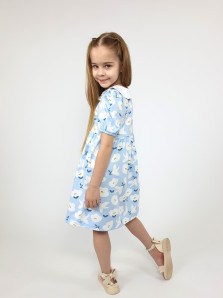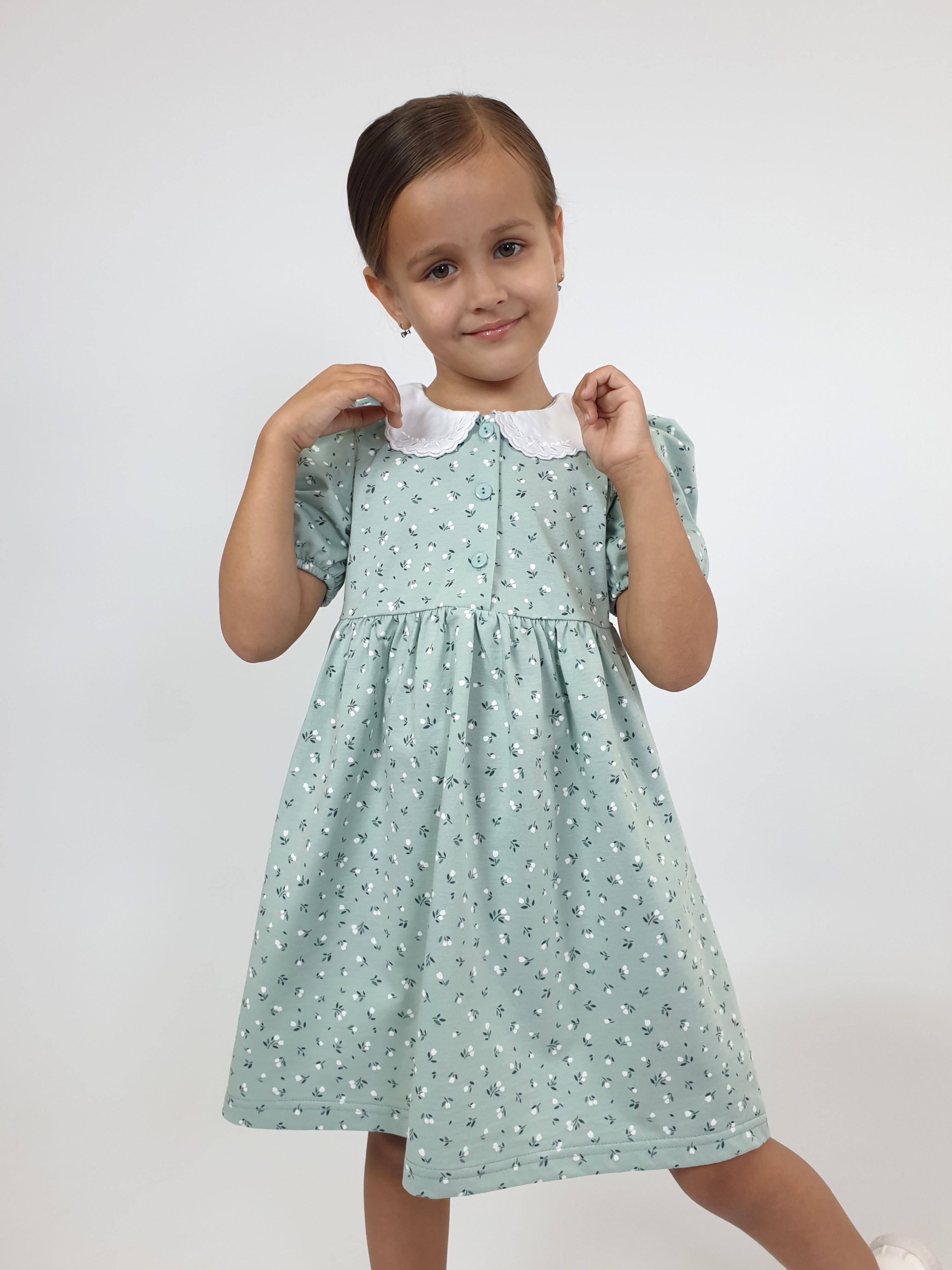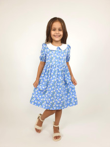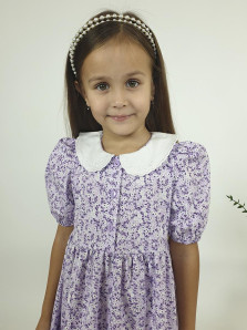Кулирное полотно(набивка):100% х/б. Платье-с отрезной юбкой в сборку.Короткий рукав с резинкой внизу,сборка по окату.Горловина окантована и подшита.Вышитый отделочный воротник,настрочен на окантовку.Застежка центральная на пуговицы.
