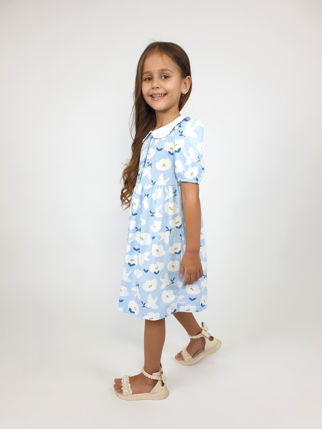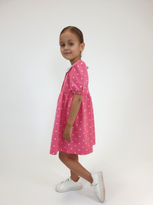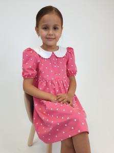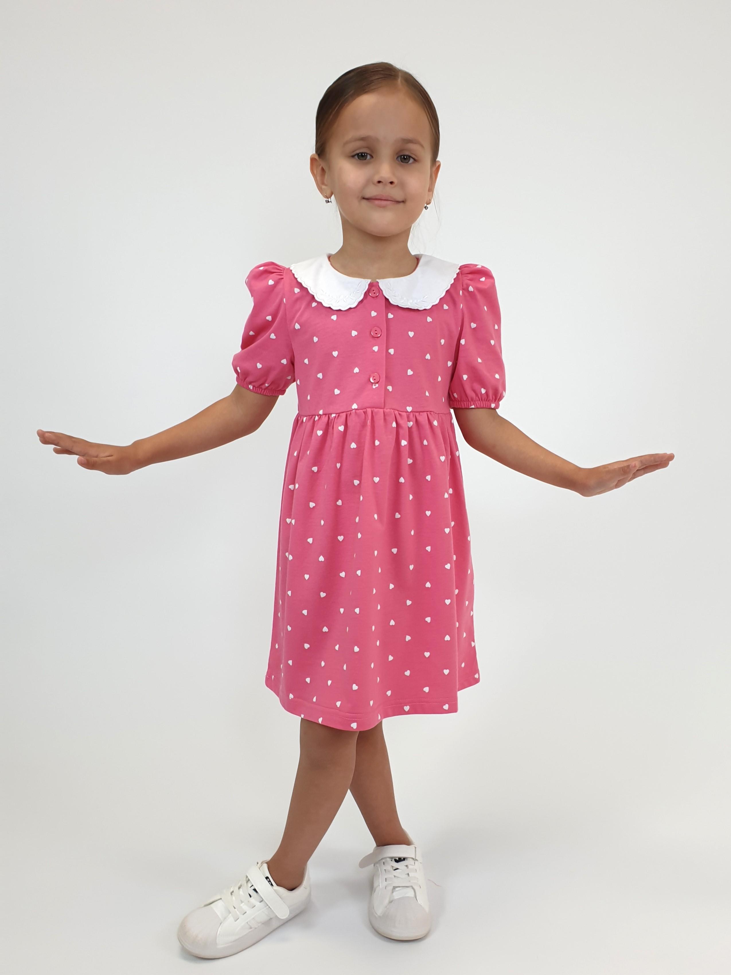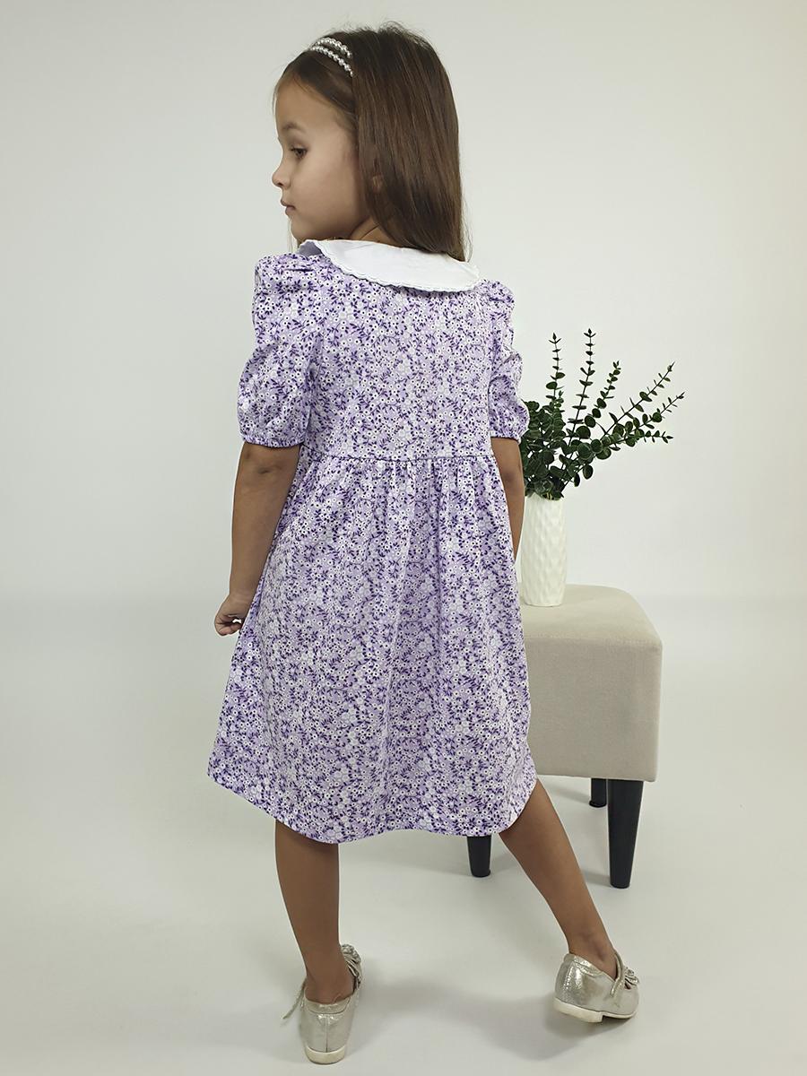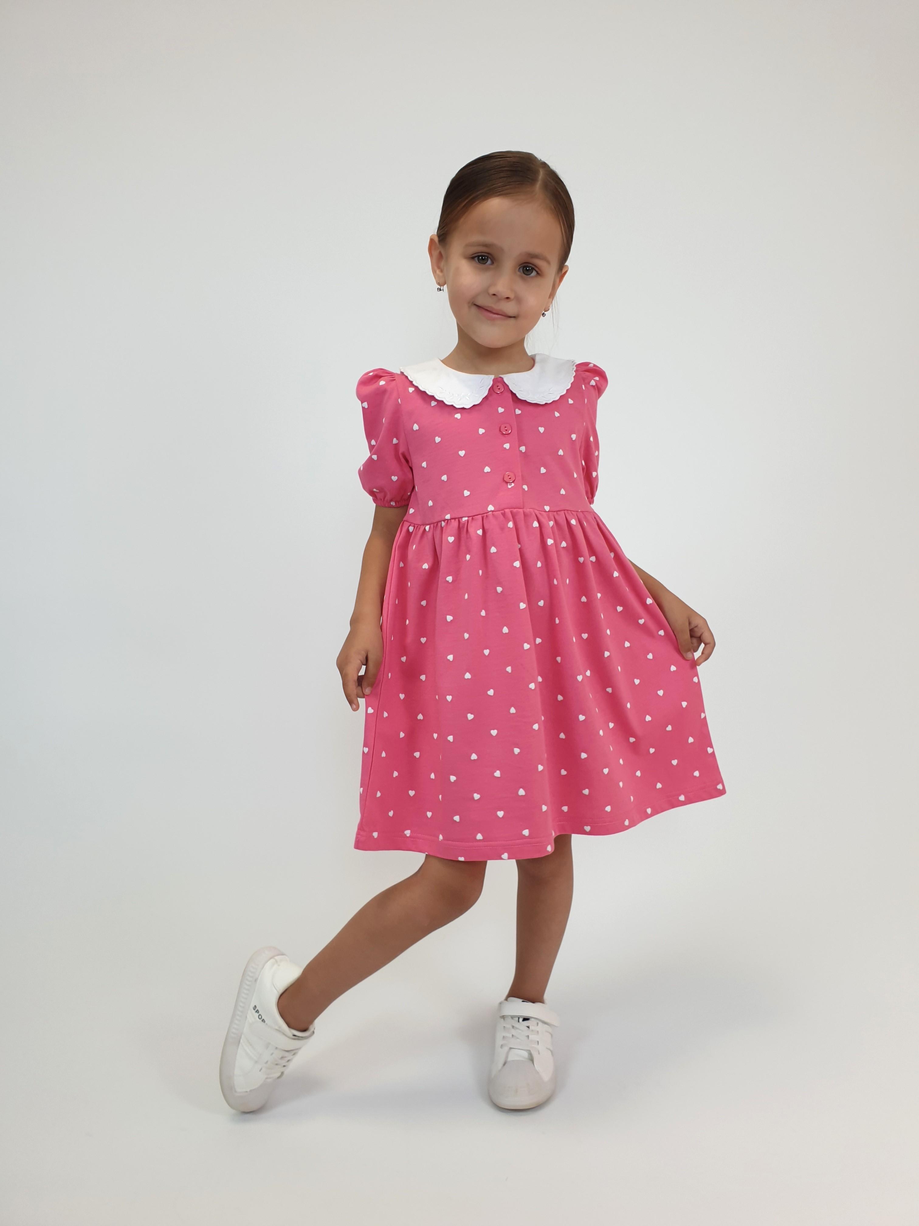 Кулирное полотно(набивка):100% х/б. Платье-с отрезной юбкой в сборку.Короткий рукав с резинкой внизу,сборка по окату.Горловина окантована и подшита.Вышитый отделочный воротник,настрочен на окантовку.Застежка центральная на пуговицы.