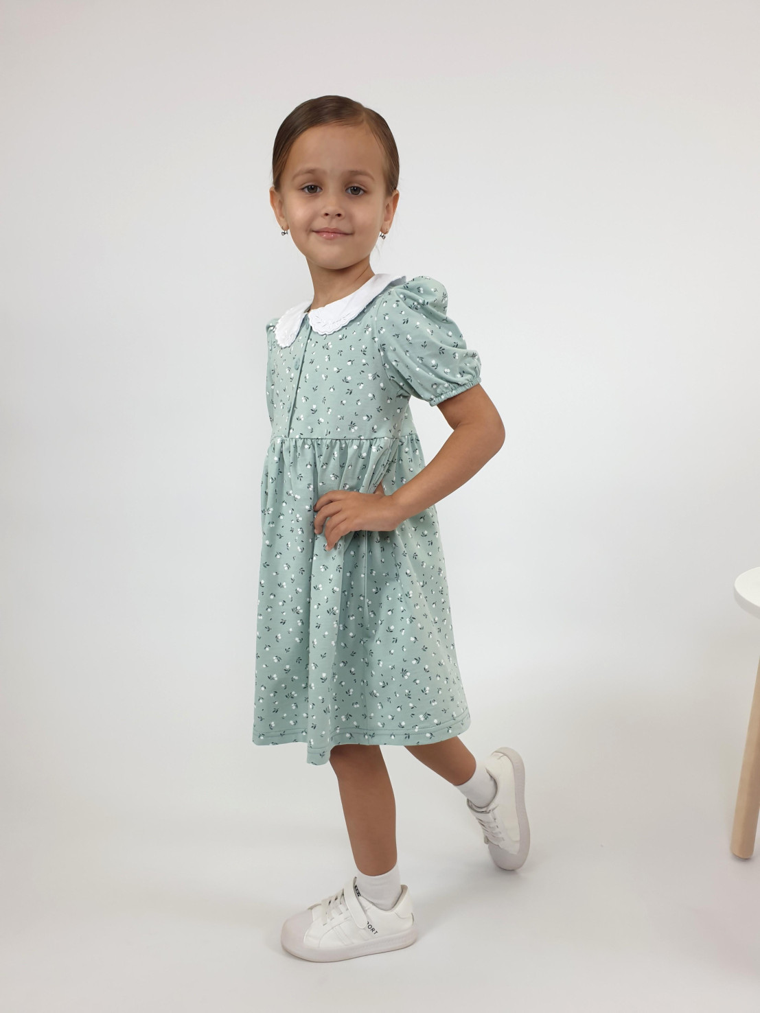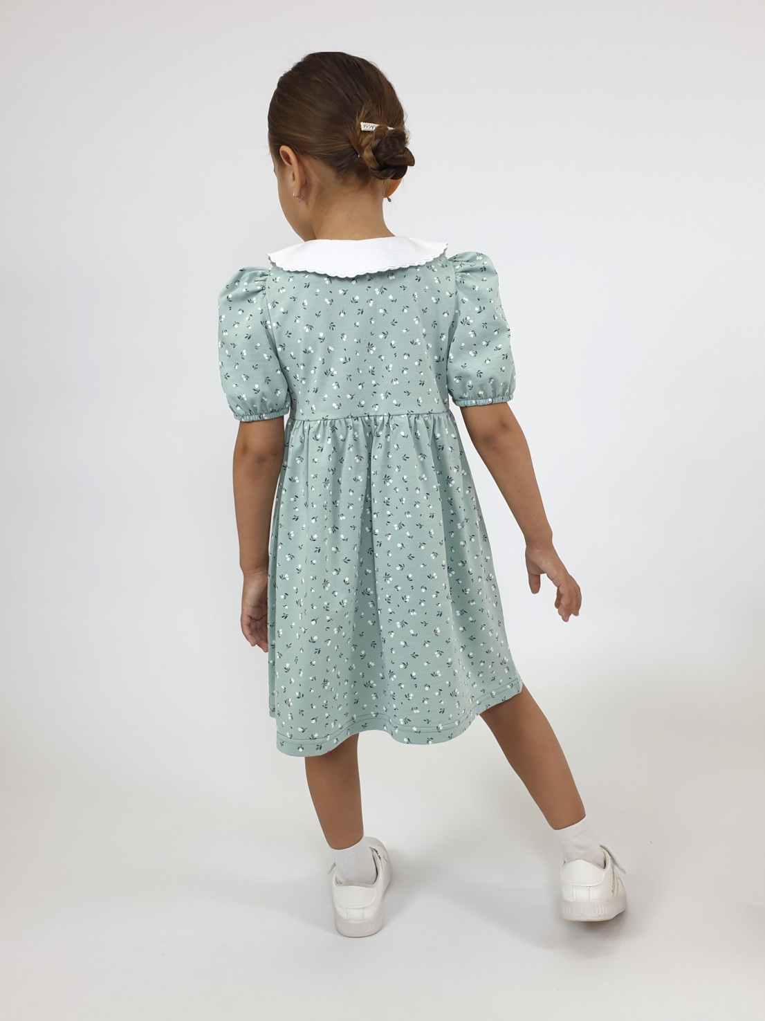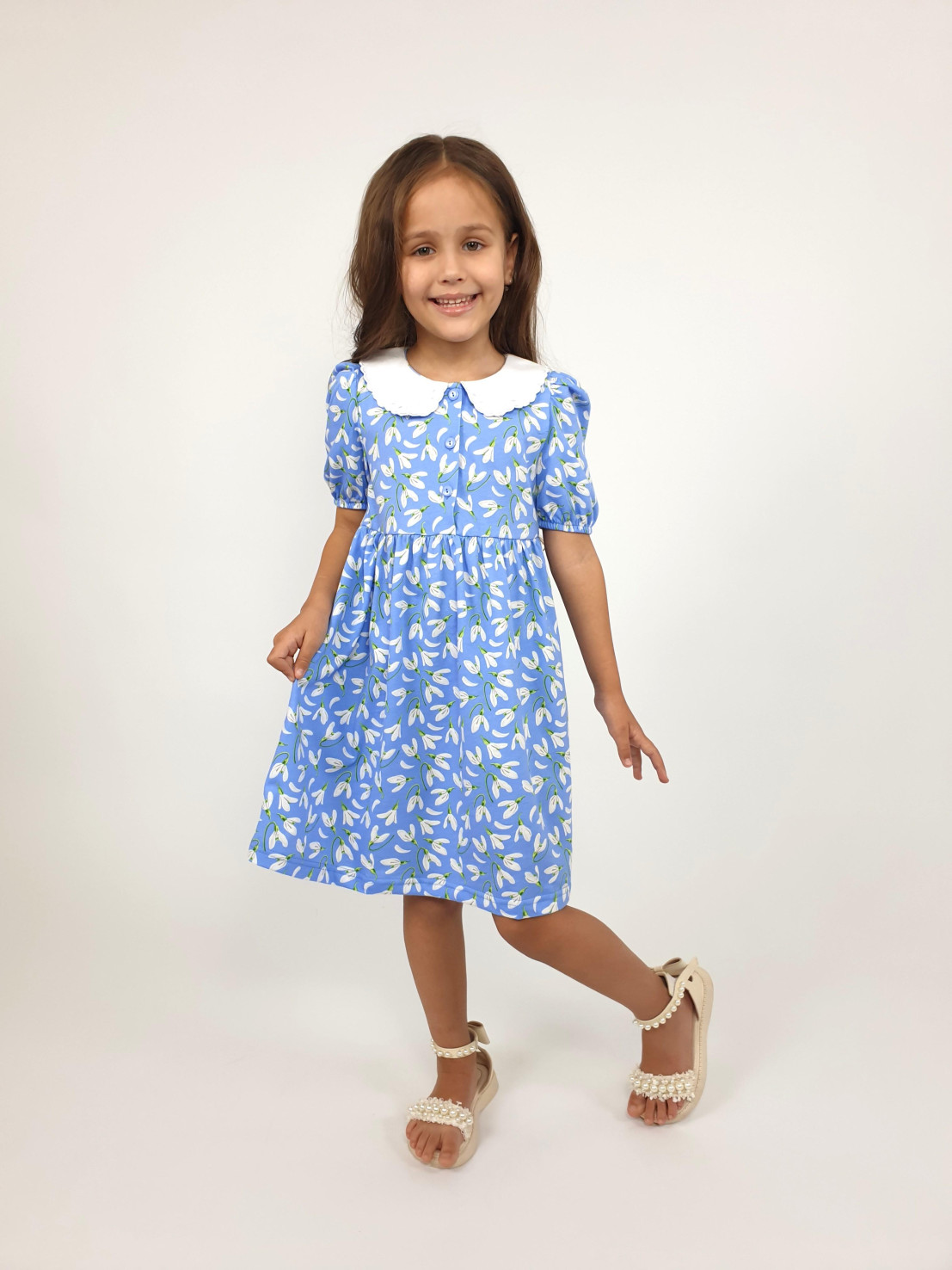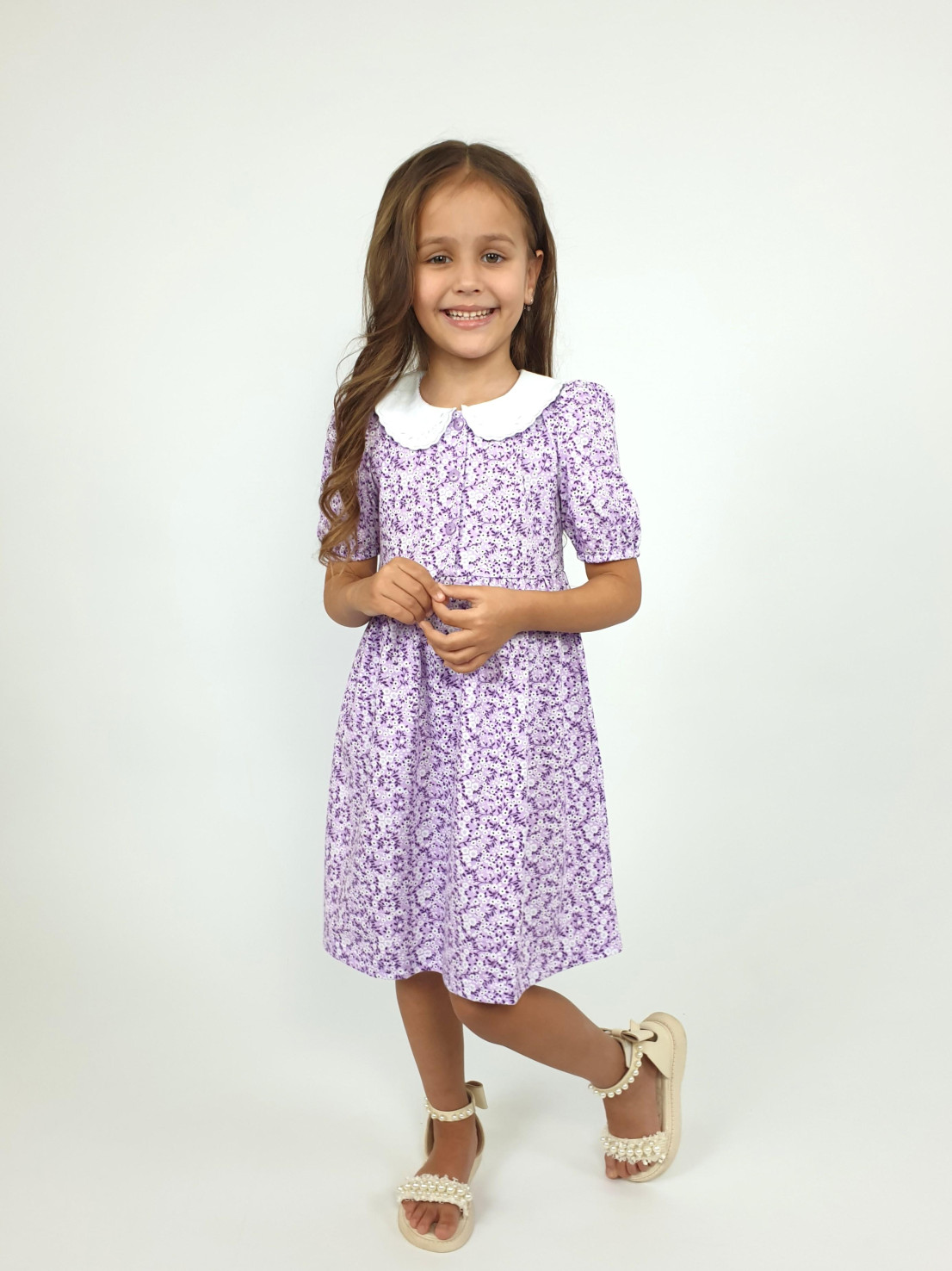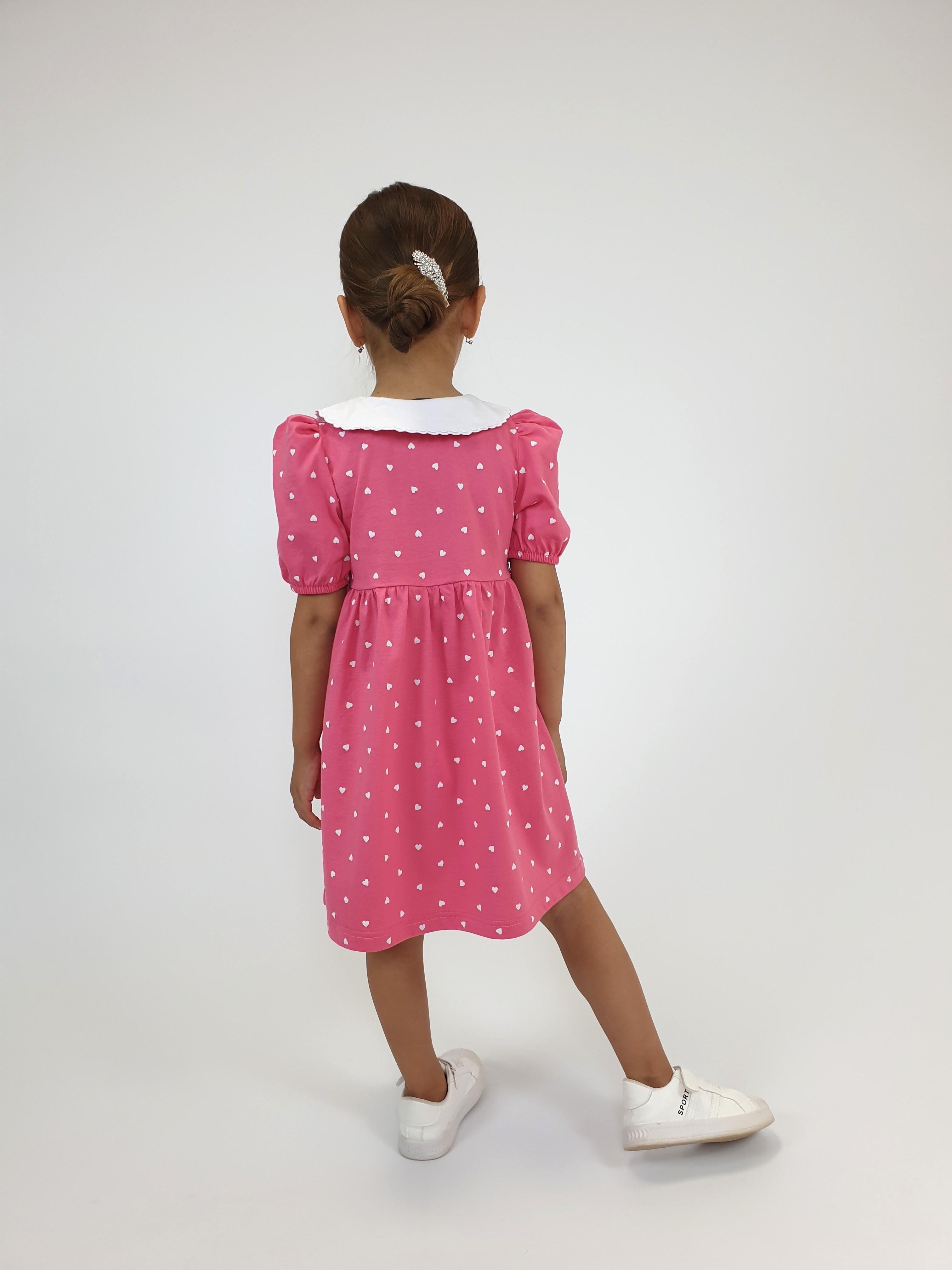 Кулирное полотно(набивка):100% х/б. Платье-с отрезной юбкой в сборку.Короткий рукав с резинкой внизу,сборка по окату.Горловина окантована и подшита.Вышитый отделочный воротник,настрочен на окантовку.Застежка центральная на пуговицы.