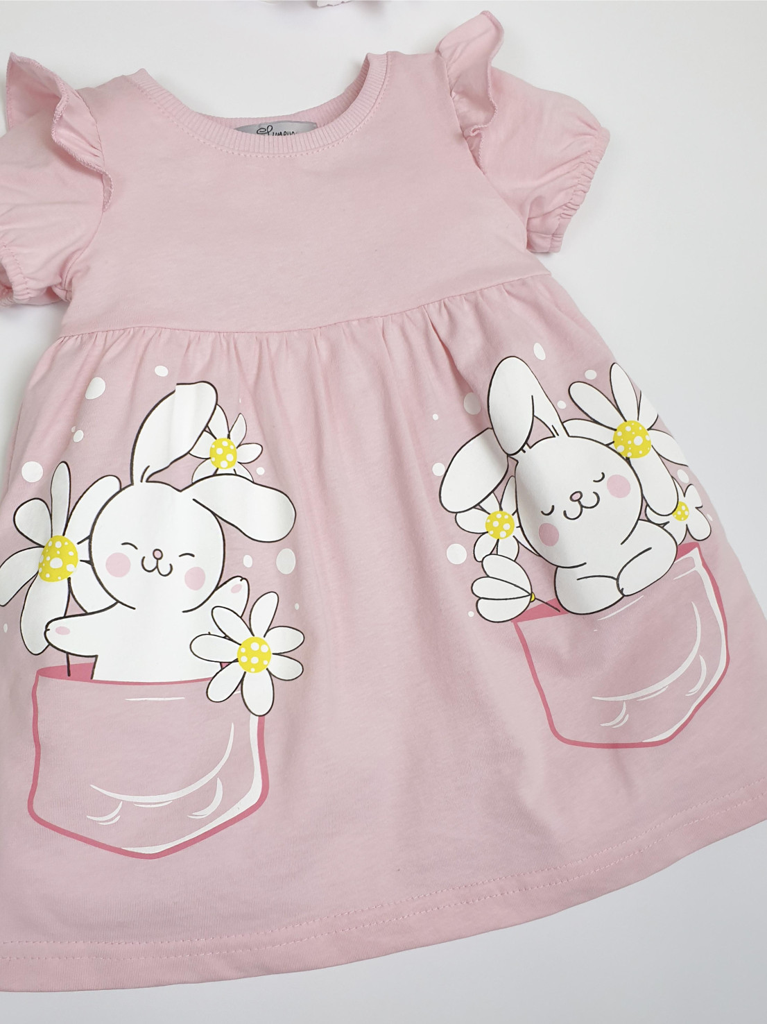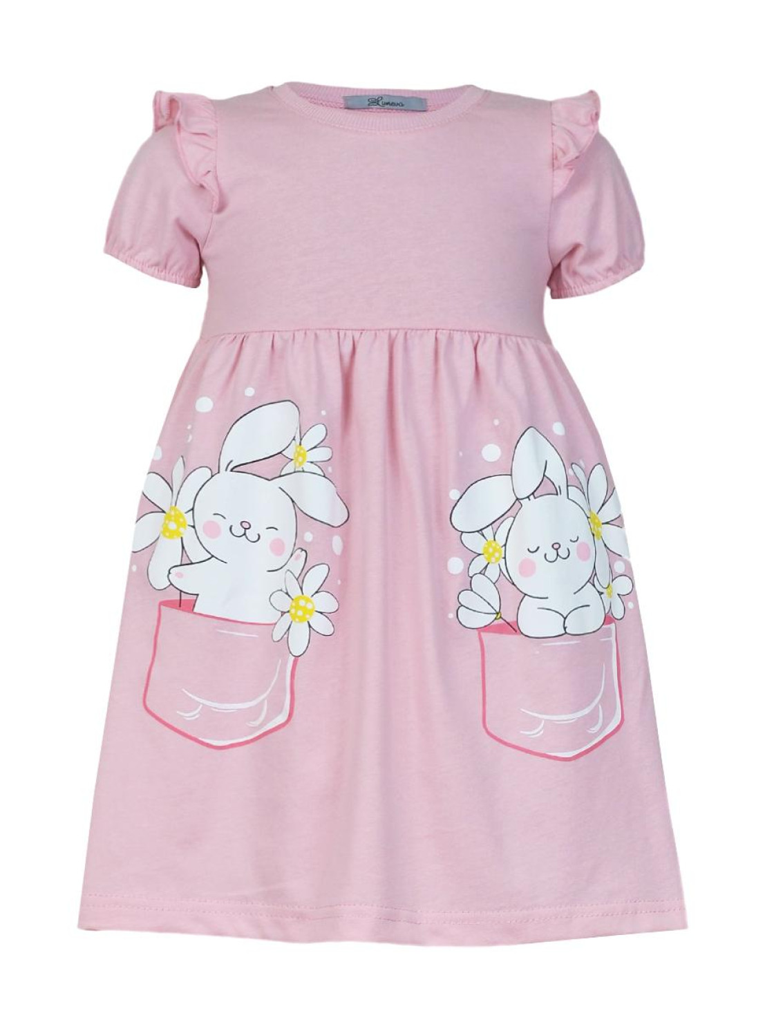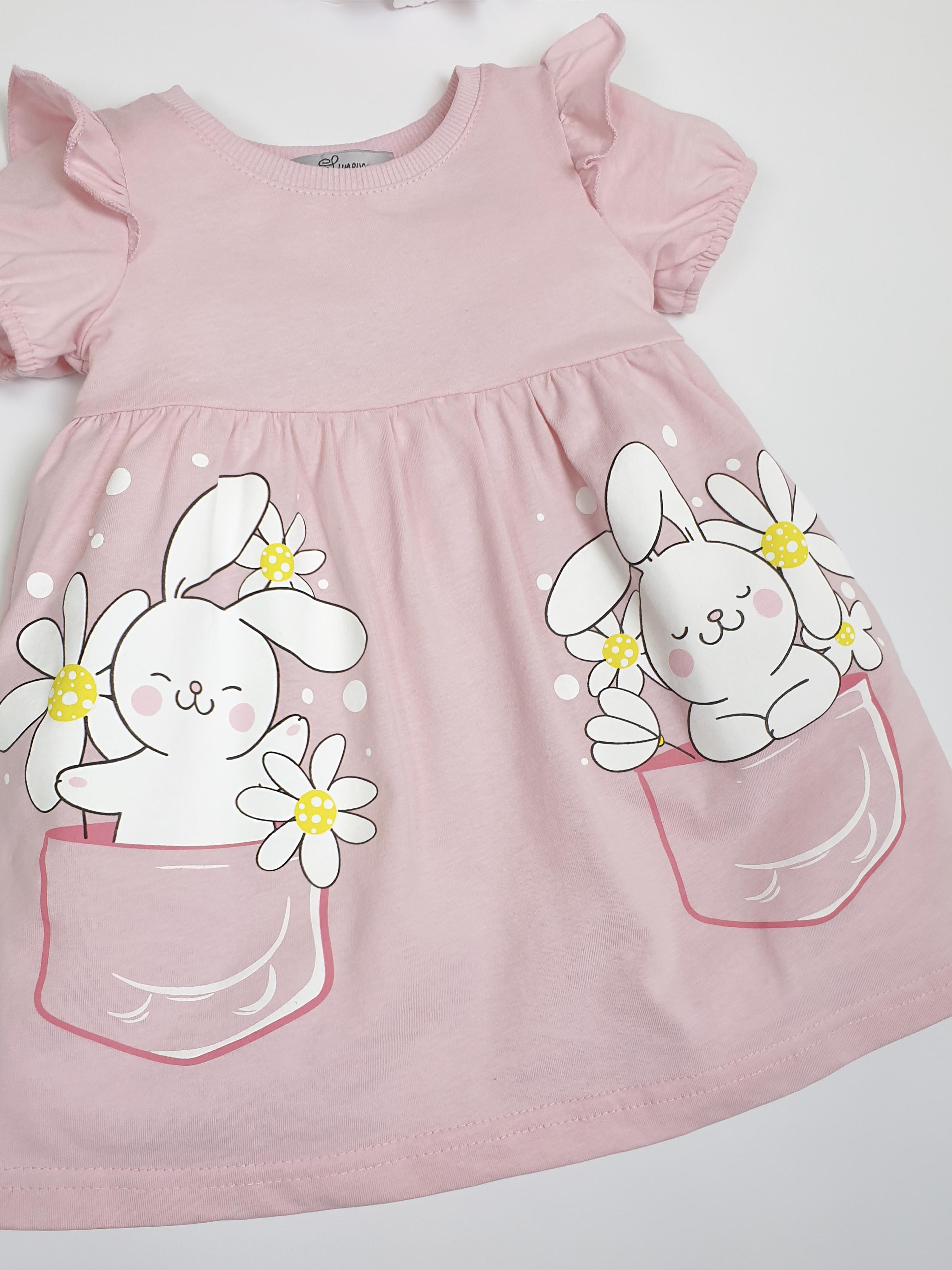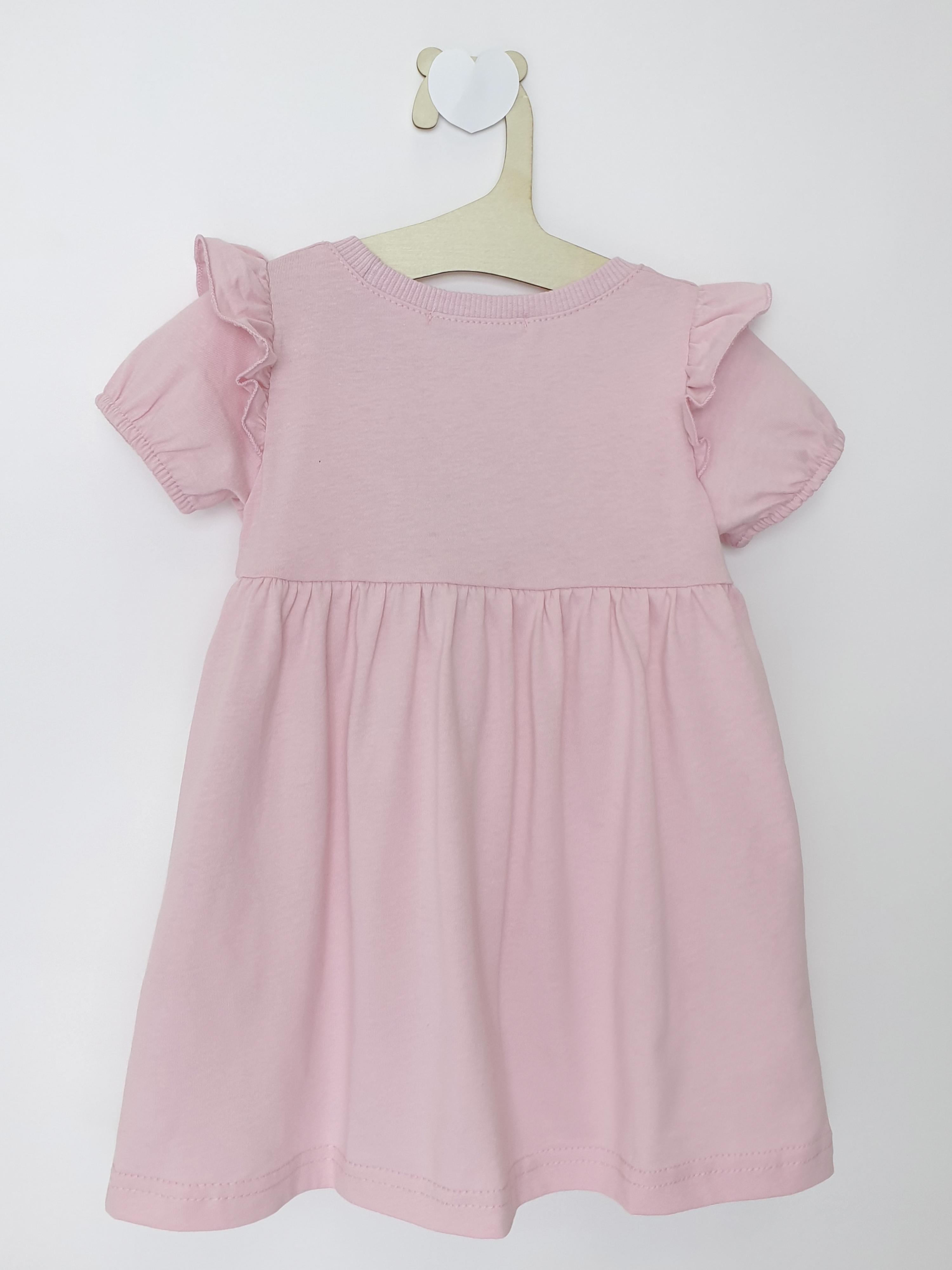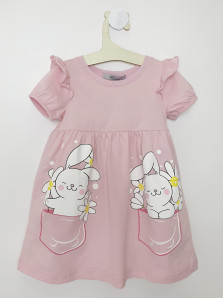 Кулирное полотно:100% х/б. Платье-перед и спинка с кокеткой,сборка по верху юбки.Рукав короткий,внизу собран на резинку,в пройме рюша.Горловина обработана ластиком.Печать на переднем полотнище юбки.