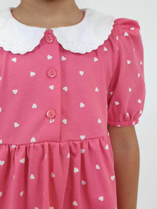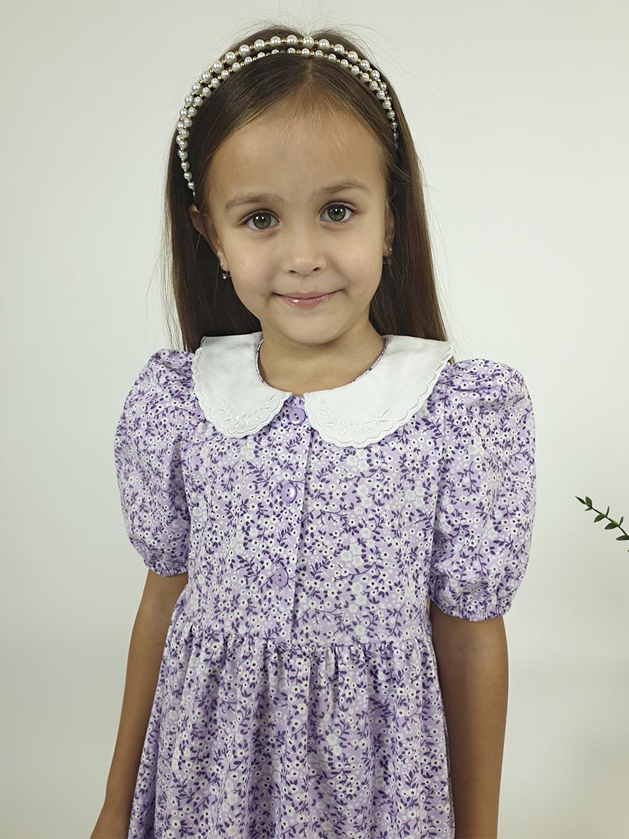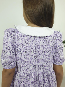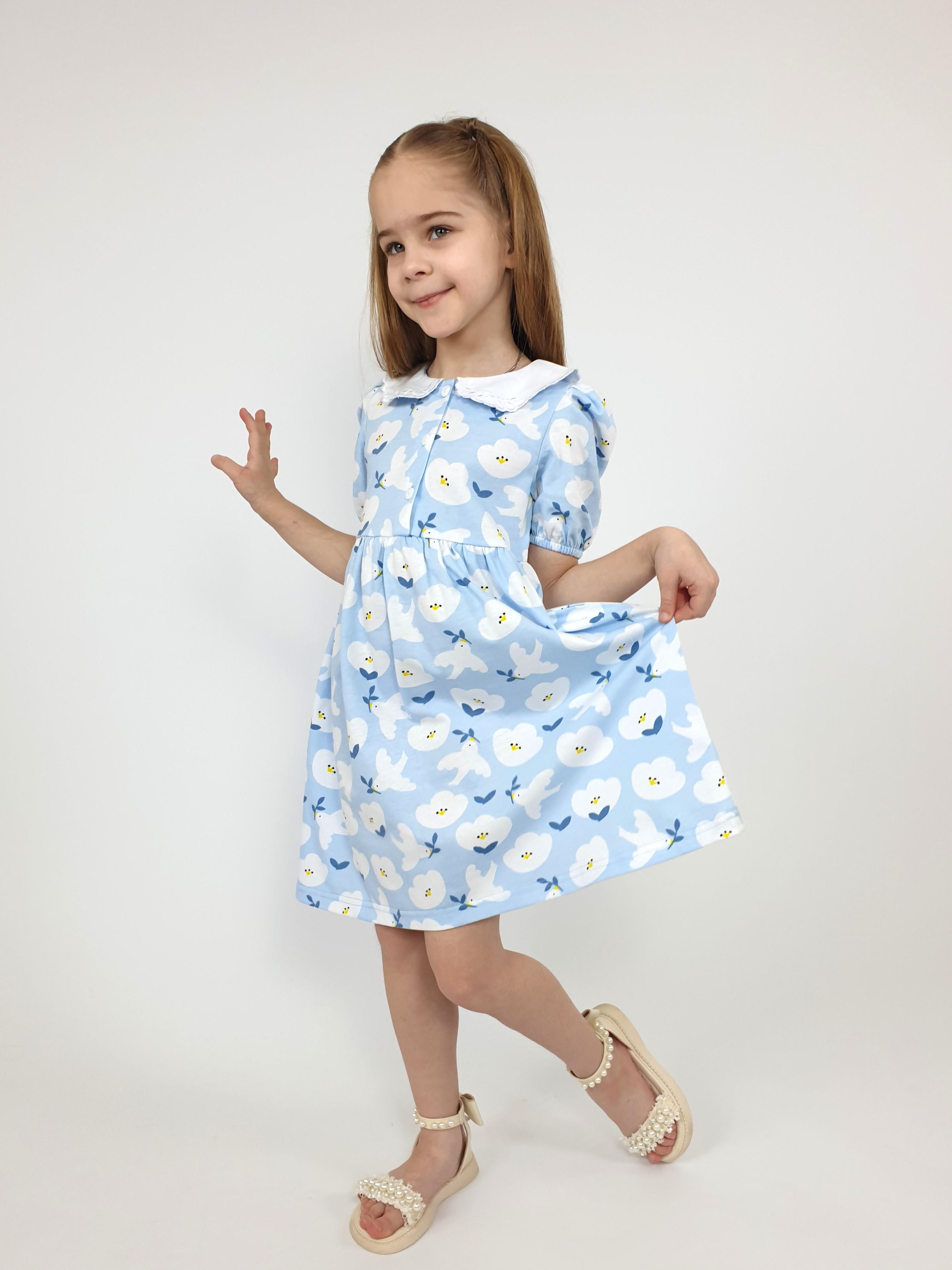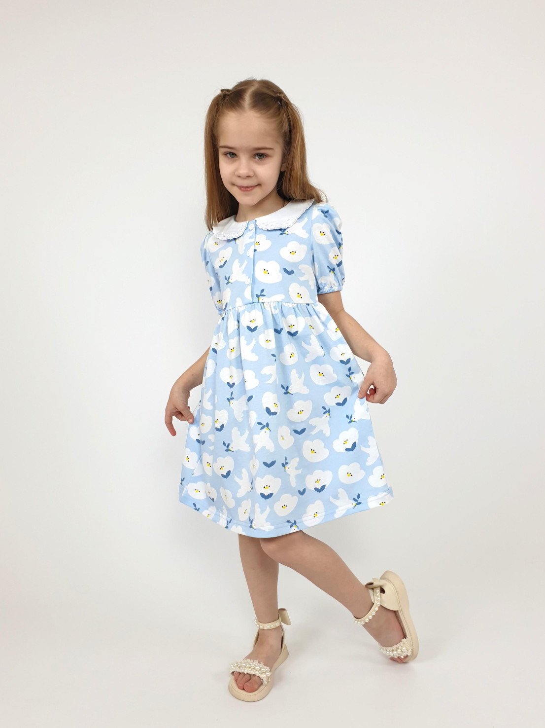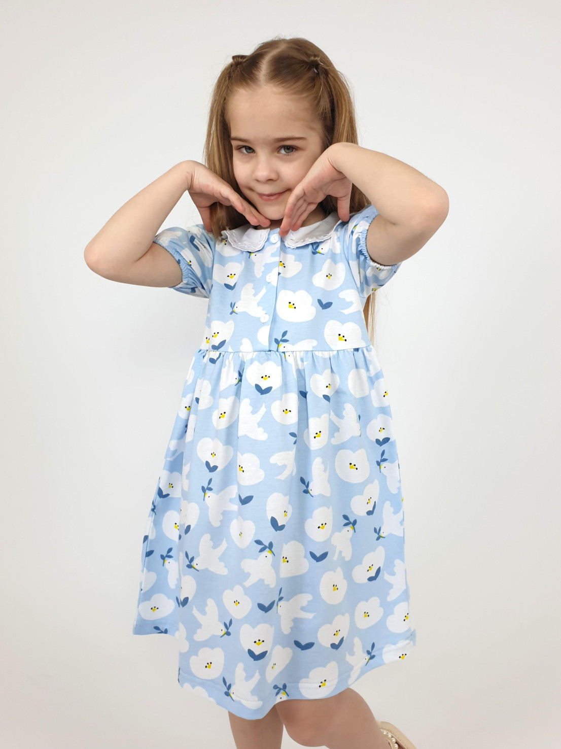 Кулирное полотно(набивка):100% х/б. Платье-с отрезной юбкой в сборку.Короткий рукав с резинкой внизу,сборка по окату.Горловина окантована и подшита.Вышитый отделочный воротник,настрочен на окантовку.Застежка центральная на пуговицы.