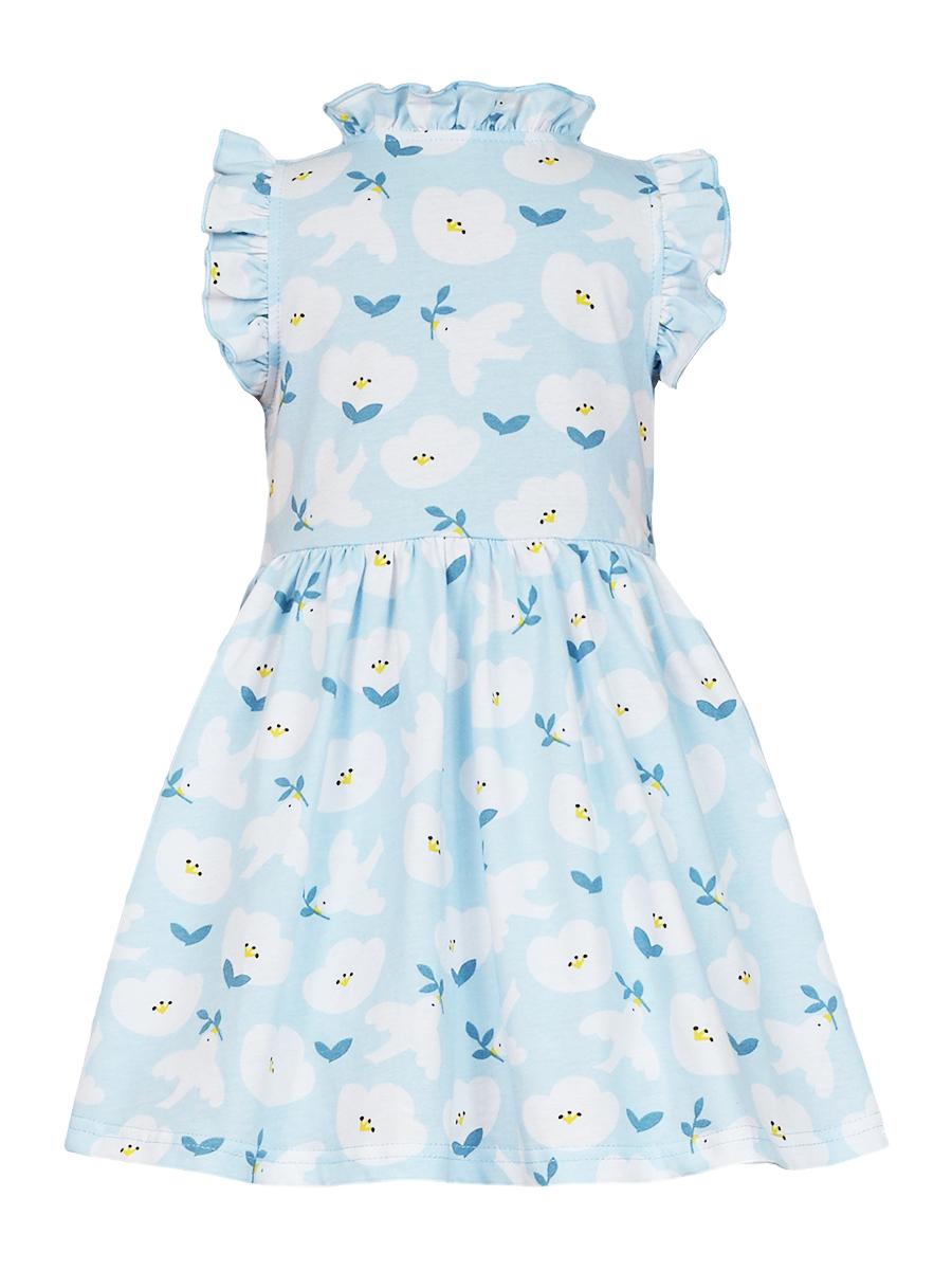 Кулирное полотно(набивка):100% х/б. Платье-полуприлегающего силуэта,без рукава,рюша в горловине и пройме.Отрезная юбка со сборкой.Горловина окантована и подшита,застежка центральная на пуговицы.