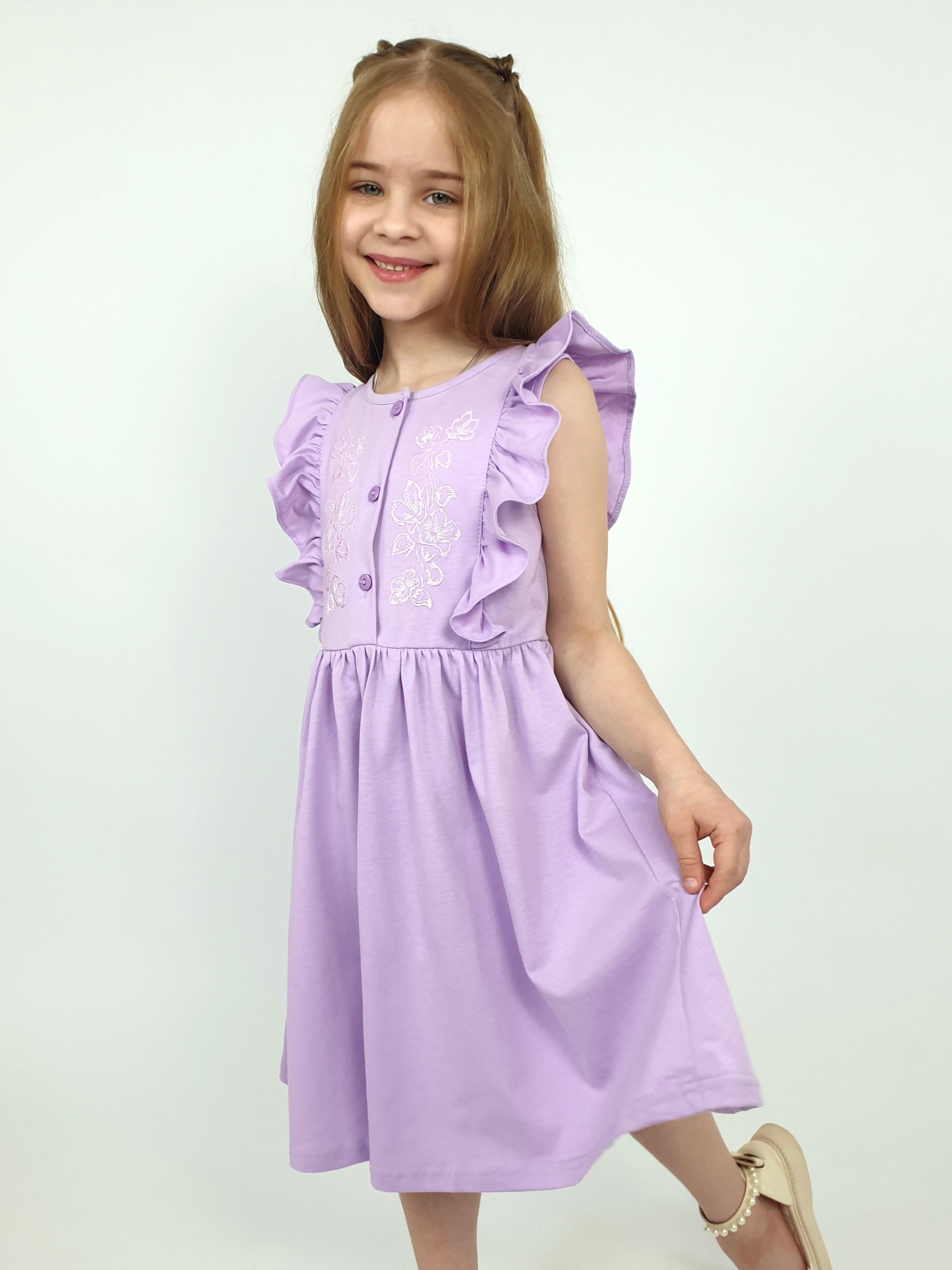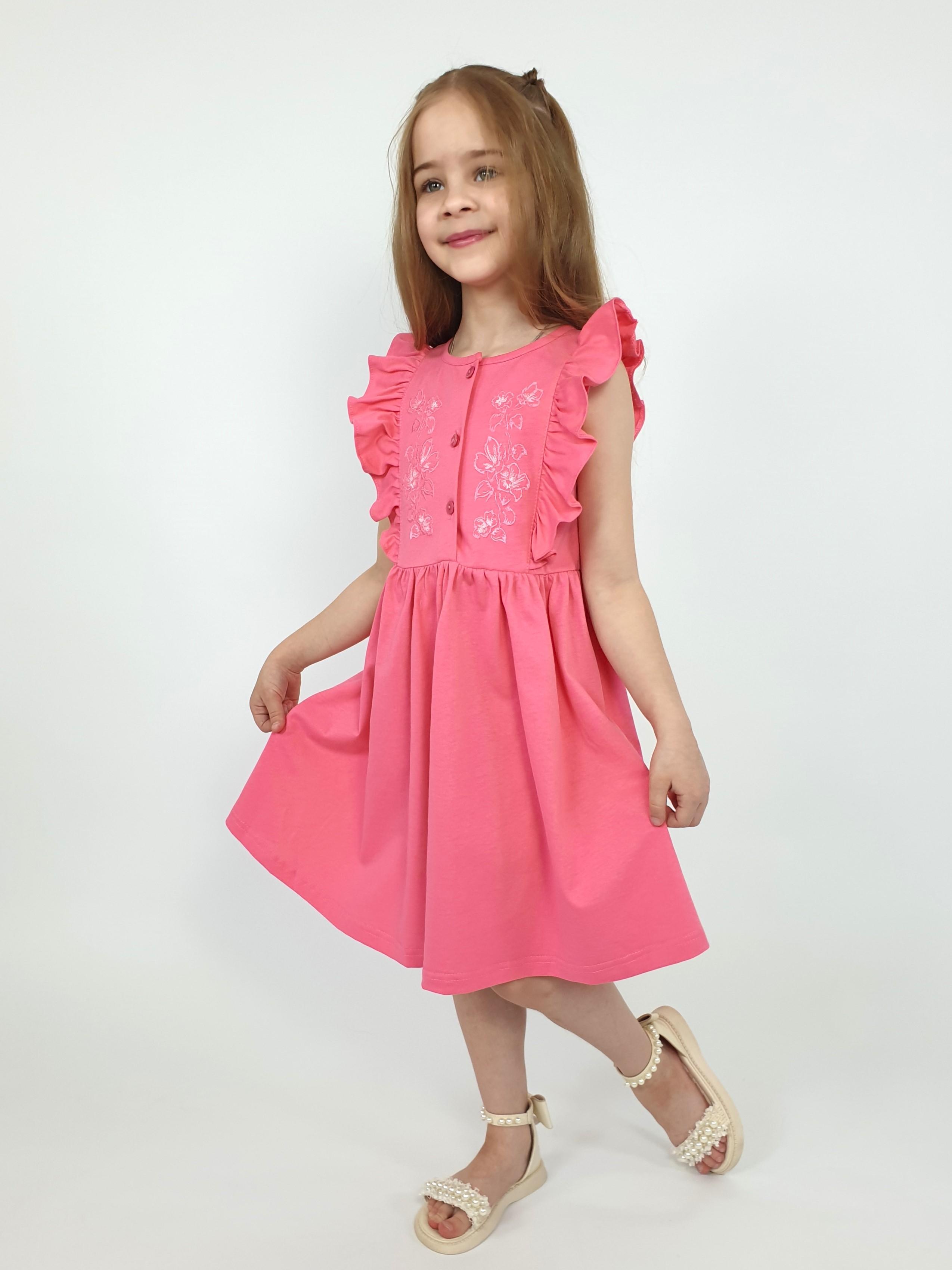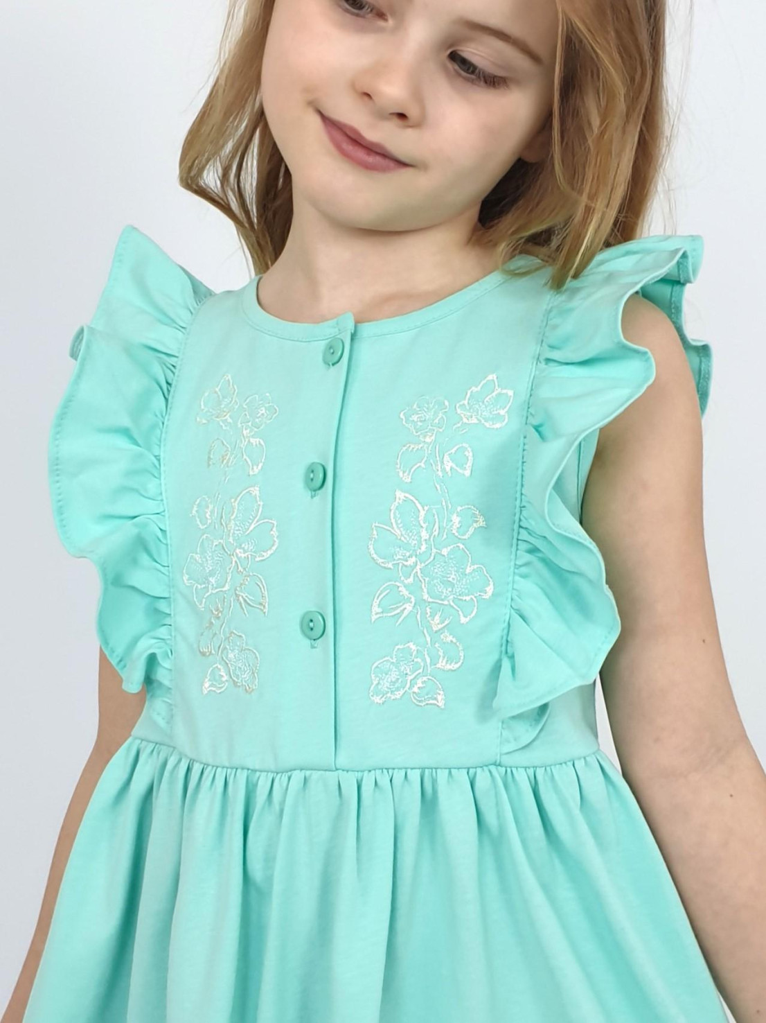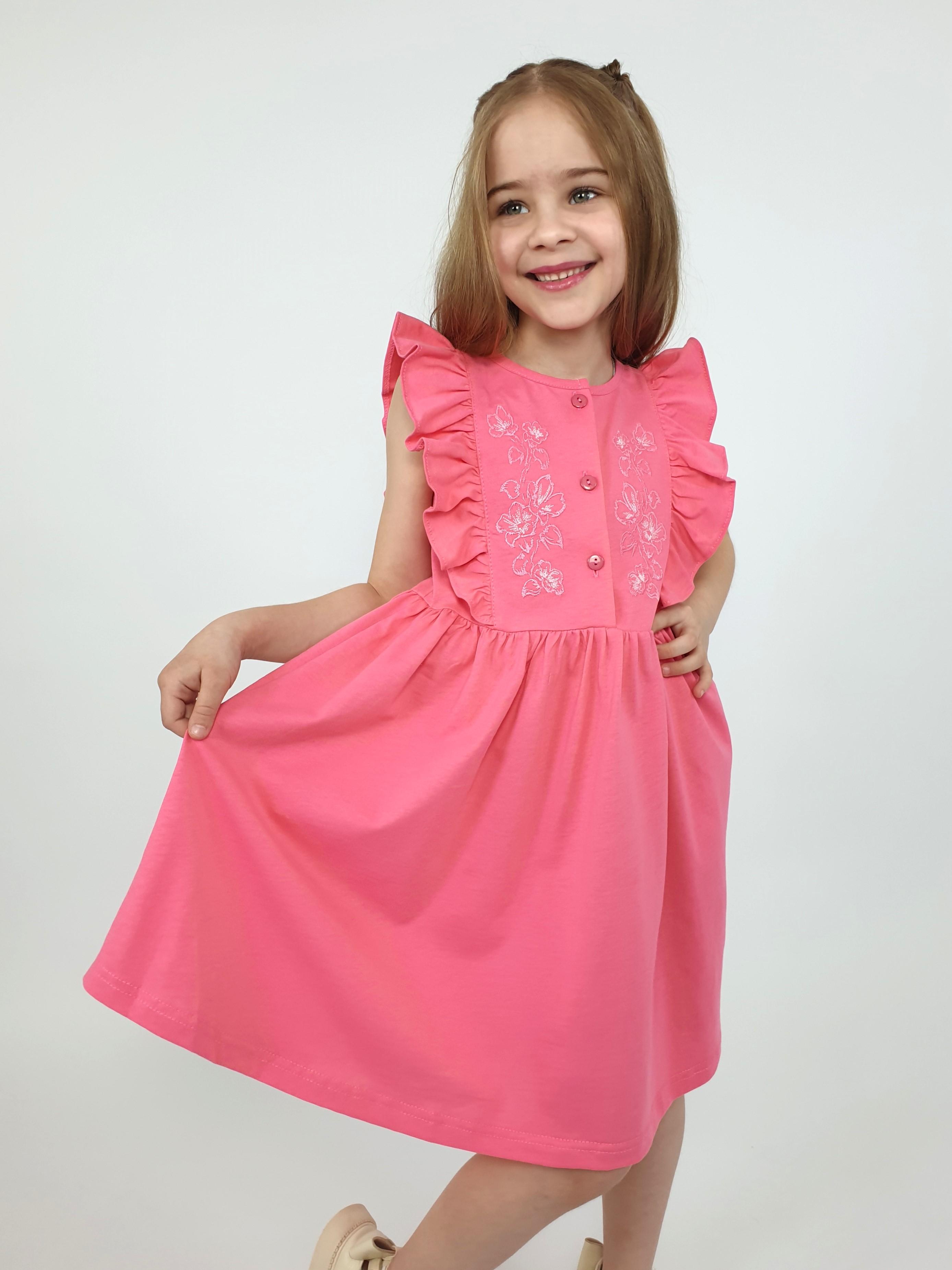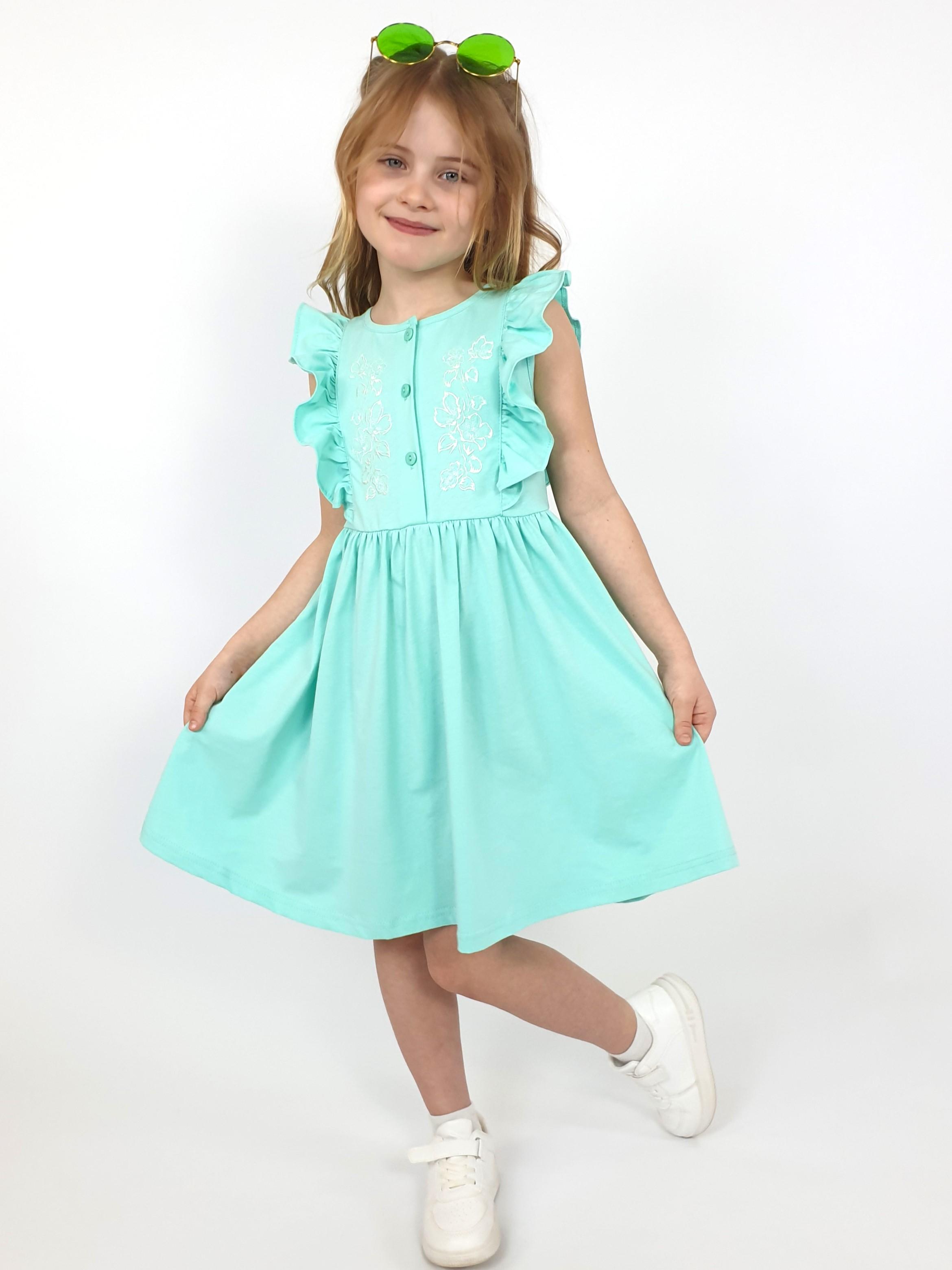 Летнее платье для девочки выполнено из качественного кулирного полотна ( 100% хлопок). Модель полуприлегающего силуэта ,декорирована оригинальным принтом с вышивкой и рюшами . Застёжка по центру на пуговицы.Такое платье идеально подойдёт как на каждый день, так и при особых случаях. Материал легкий, приятный на ощупь, устойчивый к частым стиркам.