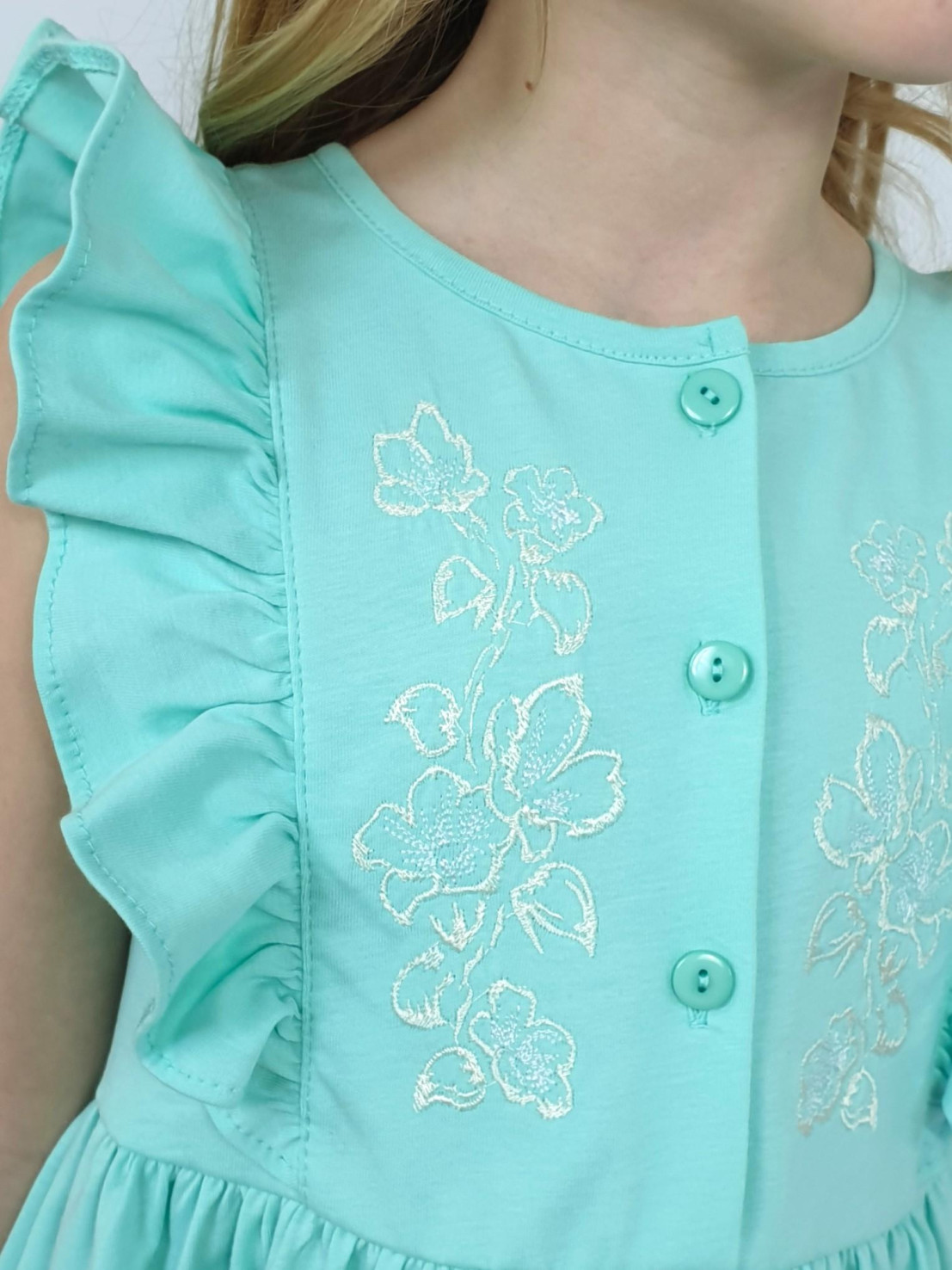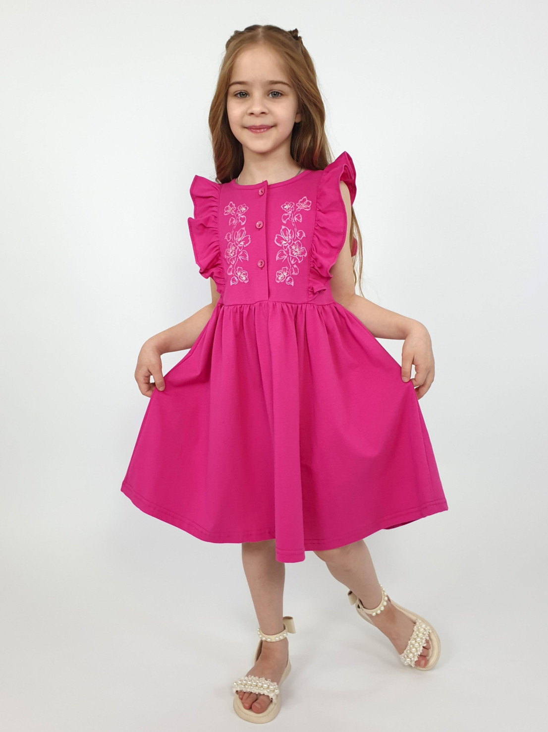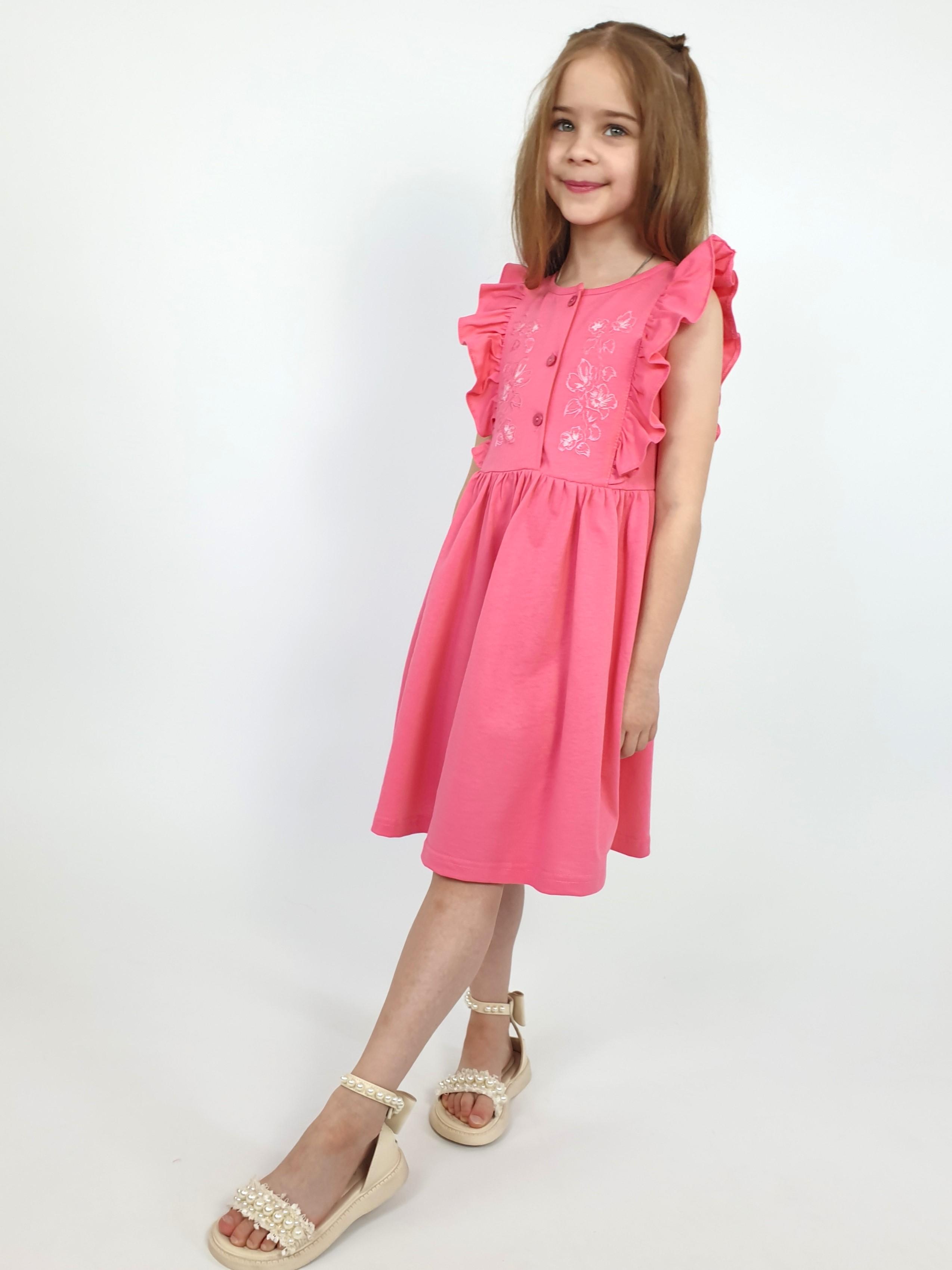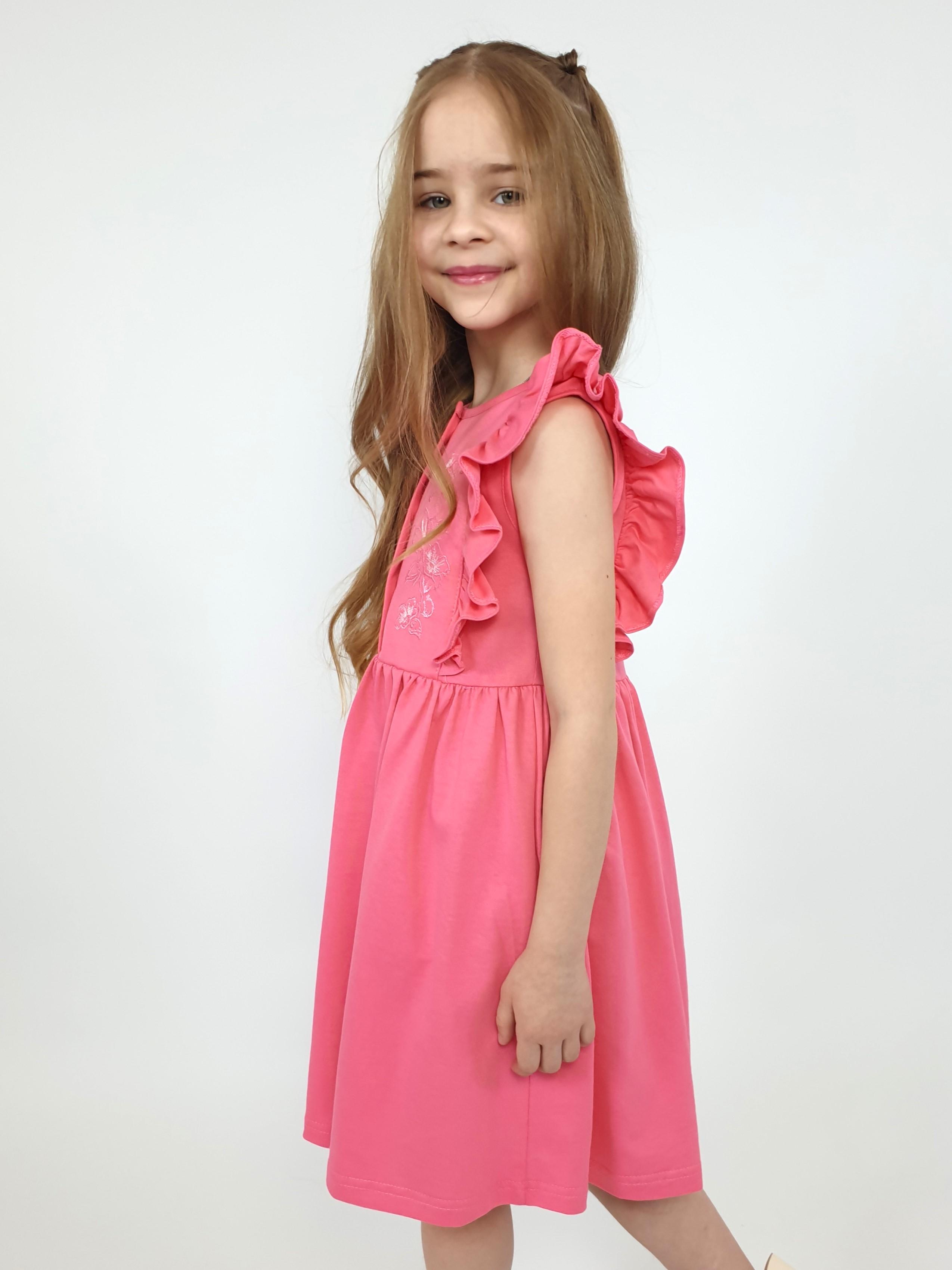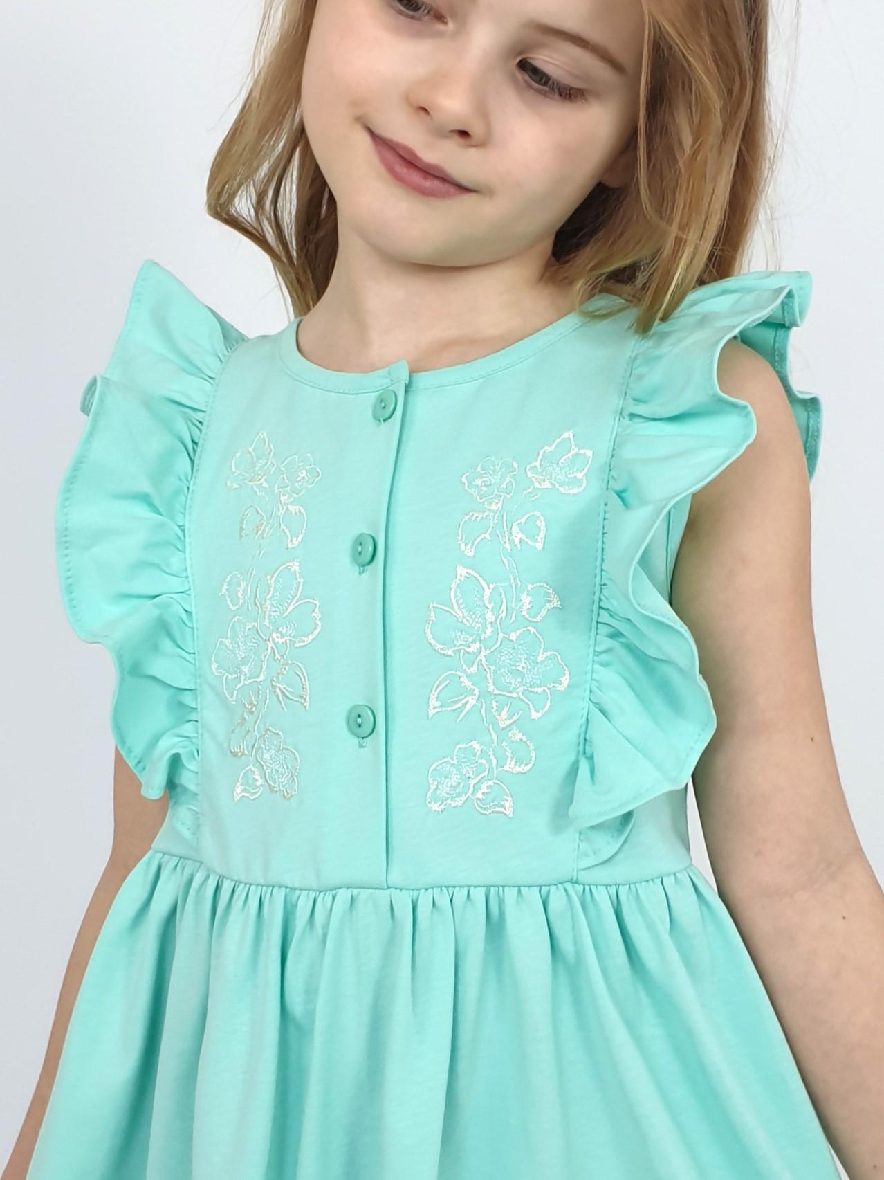 Летнее платье для девочки выполнено из качественного кулирного полотна ( 100% хлопок). Модель полуприлегающего силуэта ,декорирована оригинальным принтом с вышивкой и рюшами . Застёжка по центру на пуговицы.Такое платье идеально подойдёт как на каждый день, так и при особых случаях. Материал легкий, приятный на ощупь, устойчивый к частым стиркам.