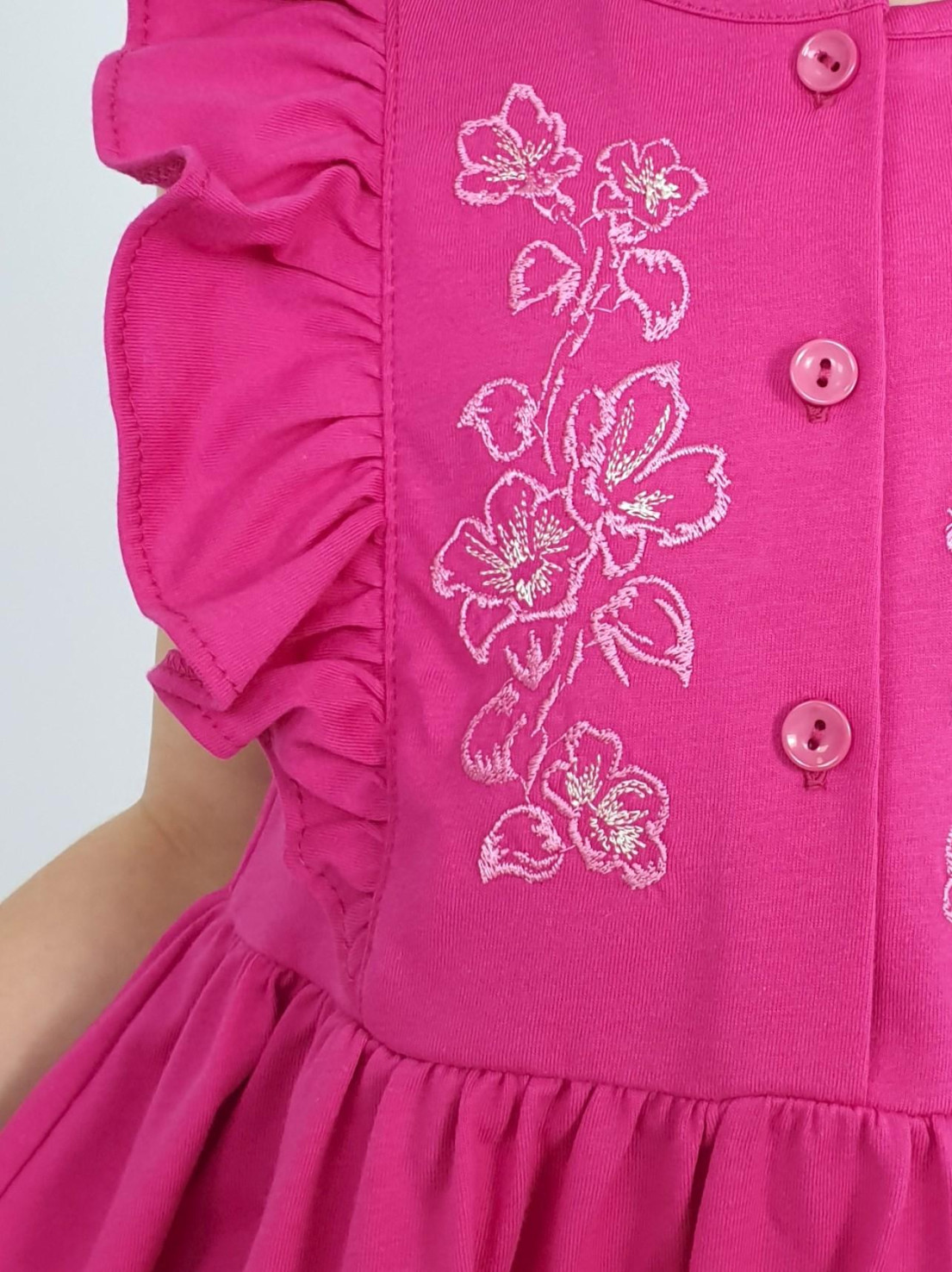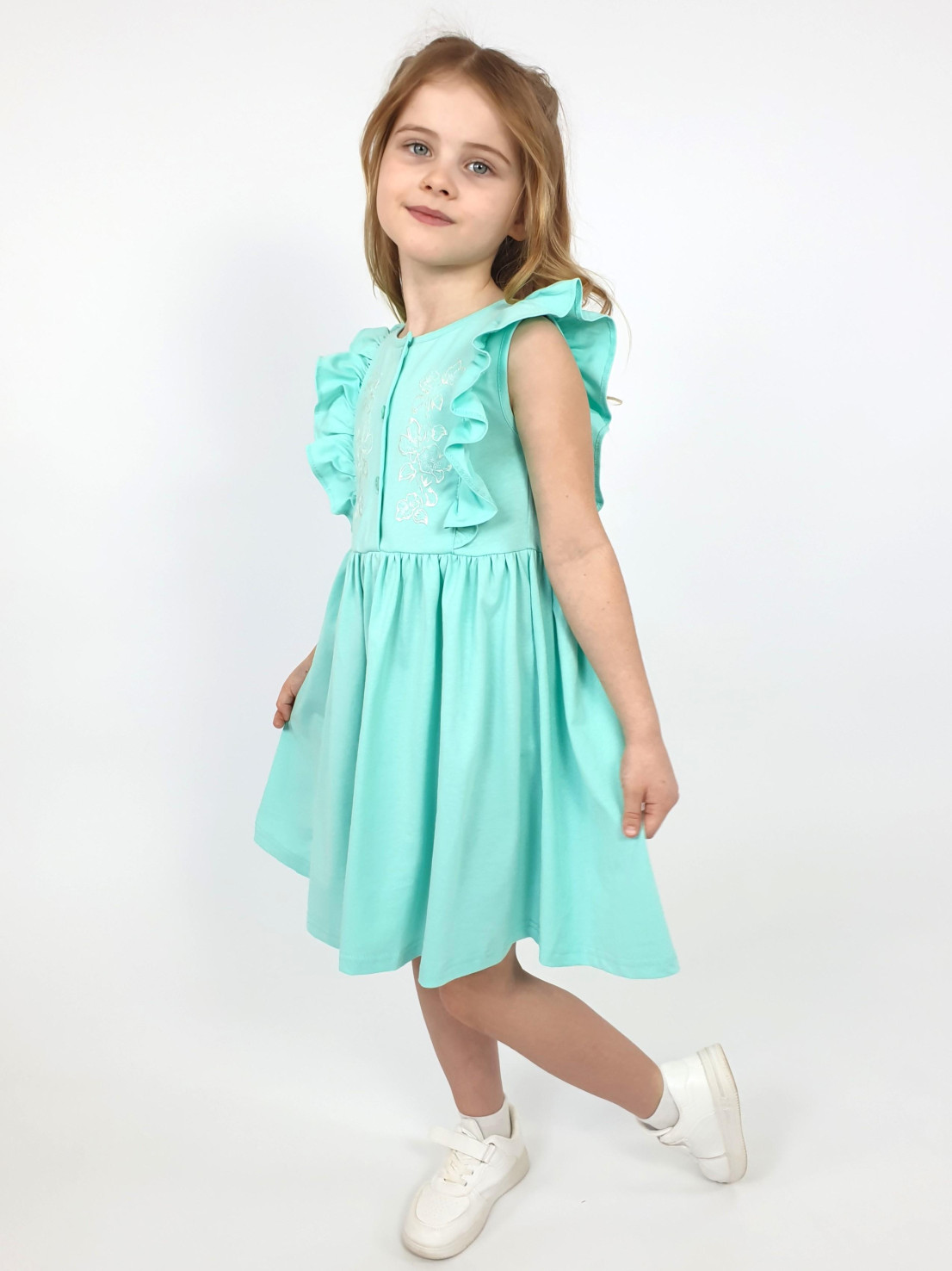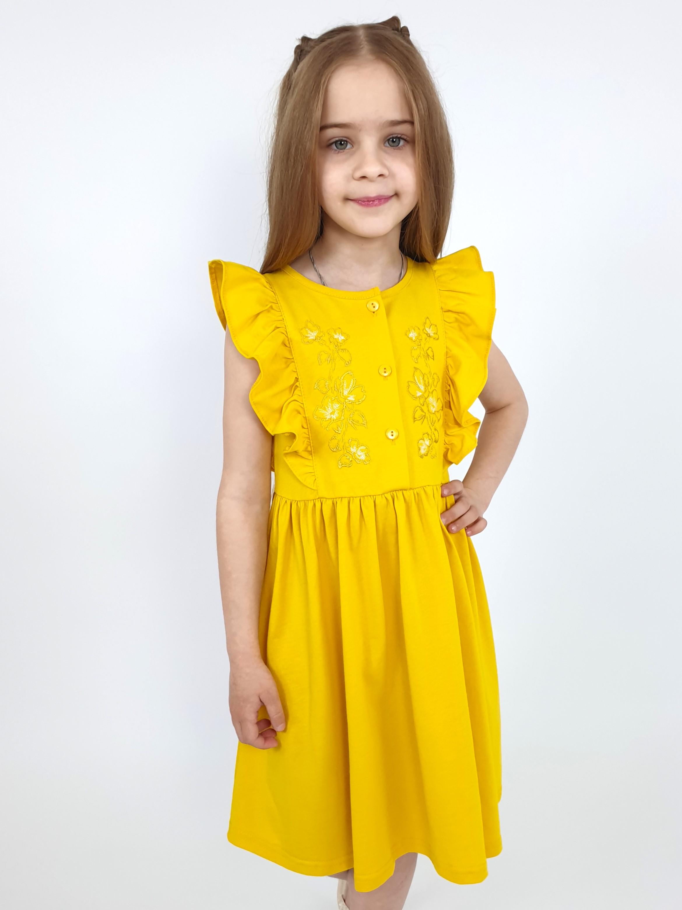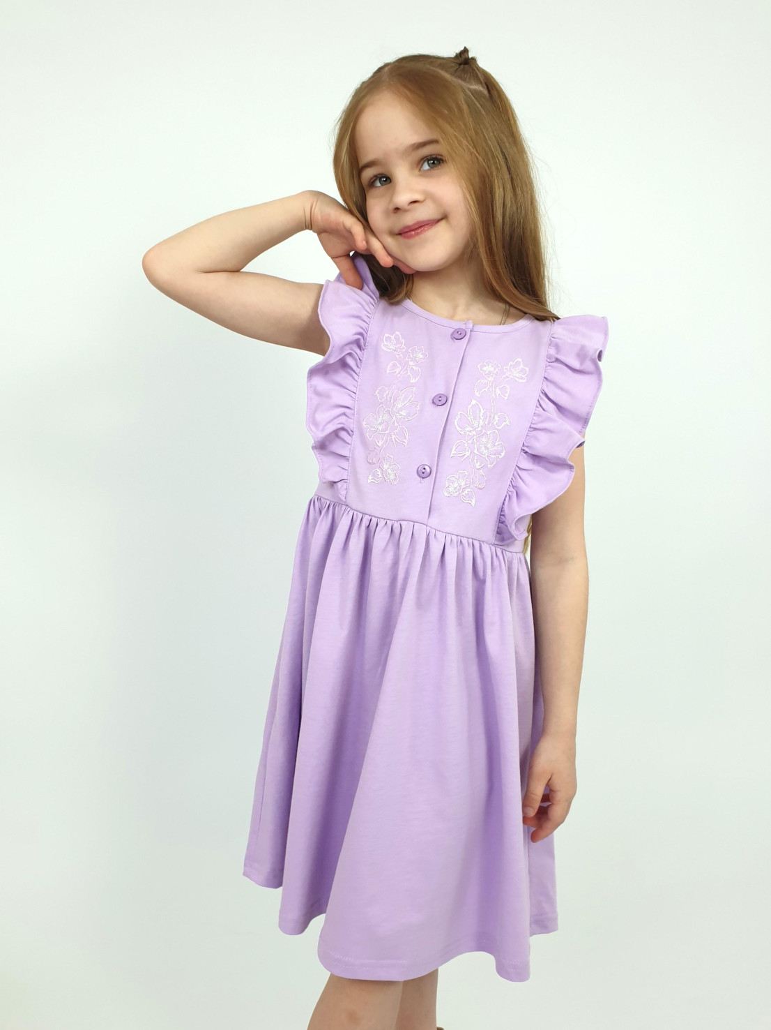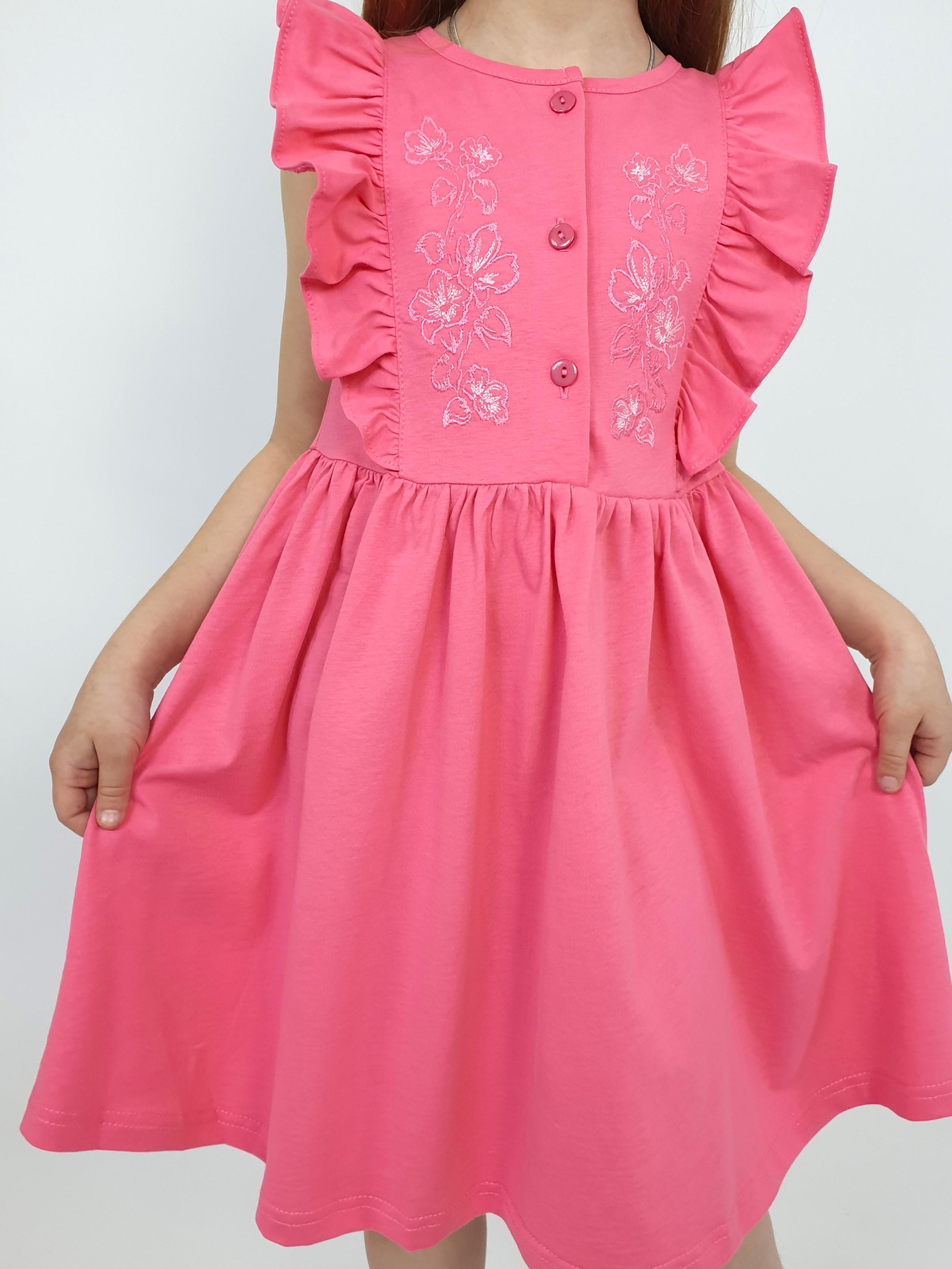 Летнее платье для девочки выполнено из качественного кулирного полотна ( 100% хлопок). Модель полуприлегающего силуэта ,декорирована оригинальным принтом с вышивкой и рюшами . Застёжка по центру на пуговицы.Такое платье идеально подойдёт как на каждый день, так и при особых случаях. Материал легкий, приятный на ощупь, устойчивый к частым стиркам.