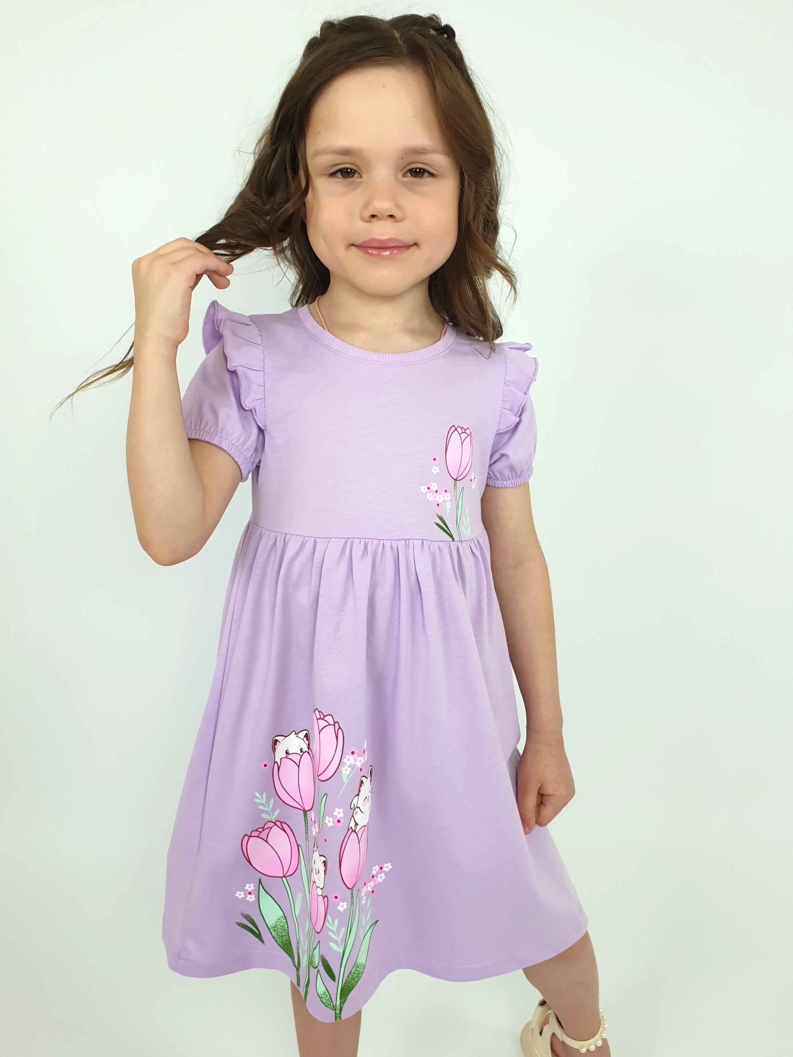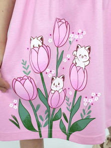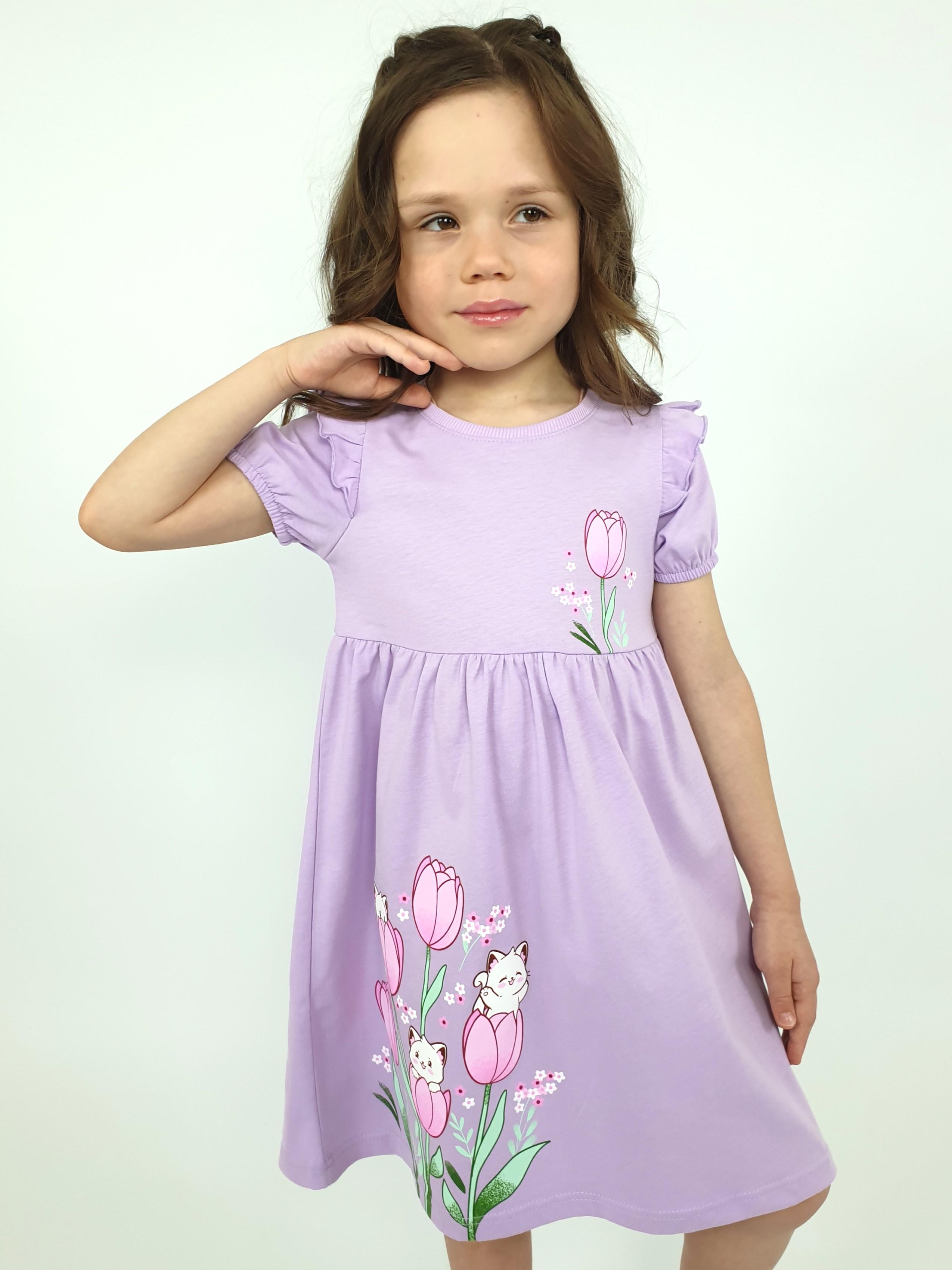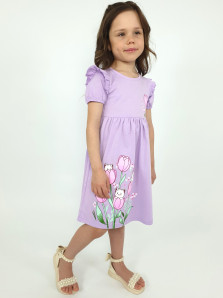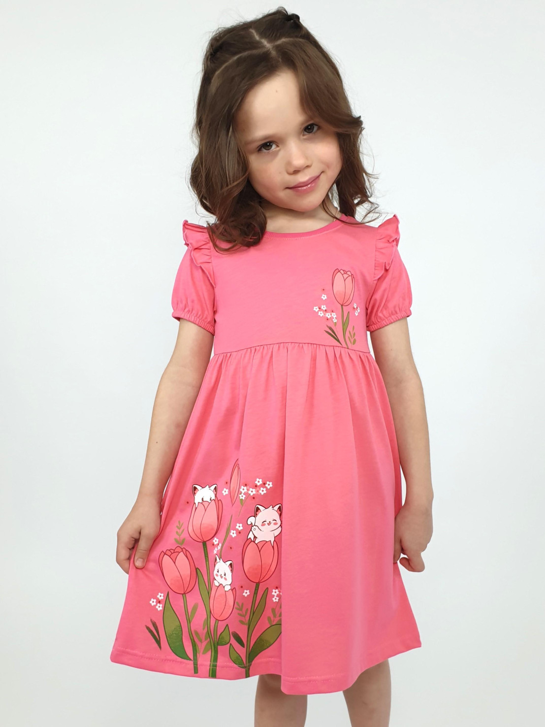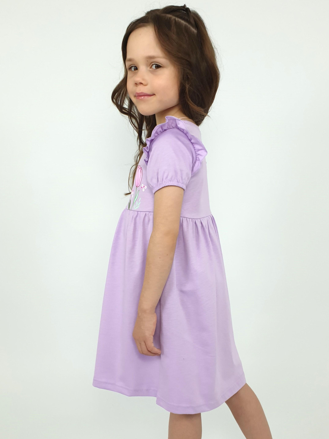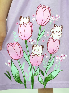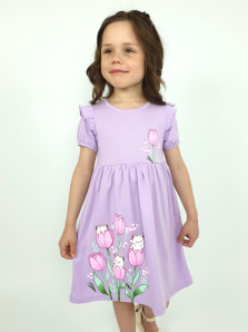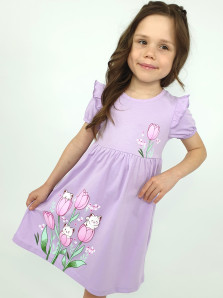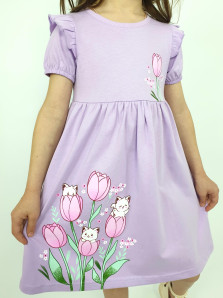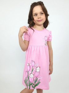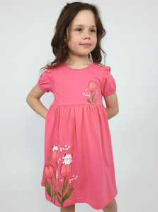 Кулирное полотно:100% х/б. Платье-перед и спинка с кокеткой,сборка по верху юбки.Рукав короткий,внизу собран на резинку,в пройме рюша.Горловина обработана ластиком.Печать на кокетке переда и переднем полотнище юбки.
