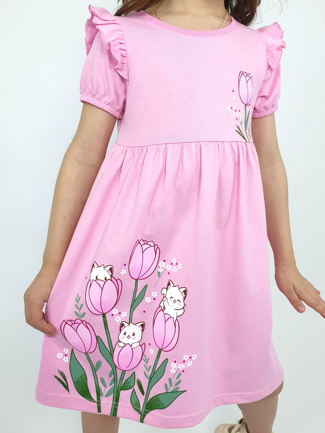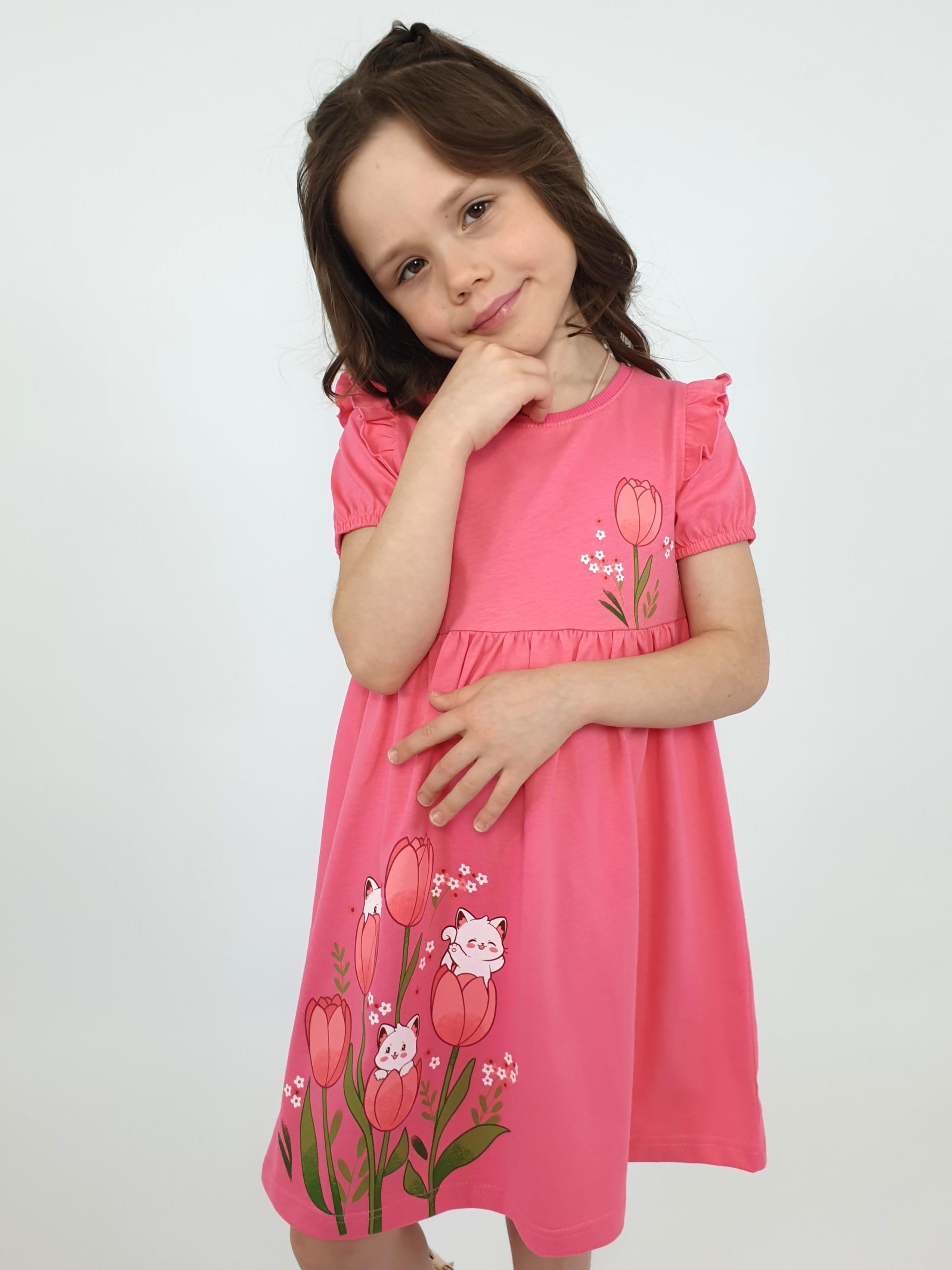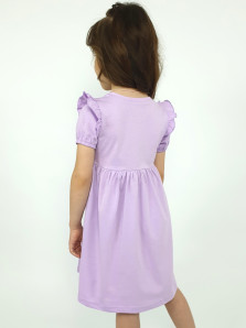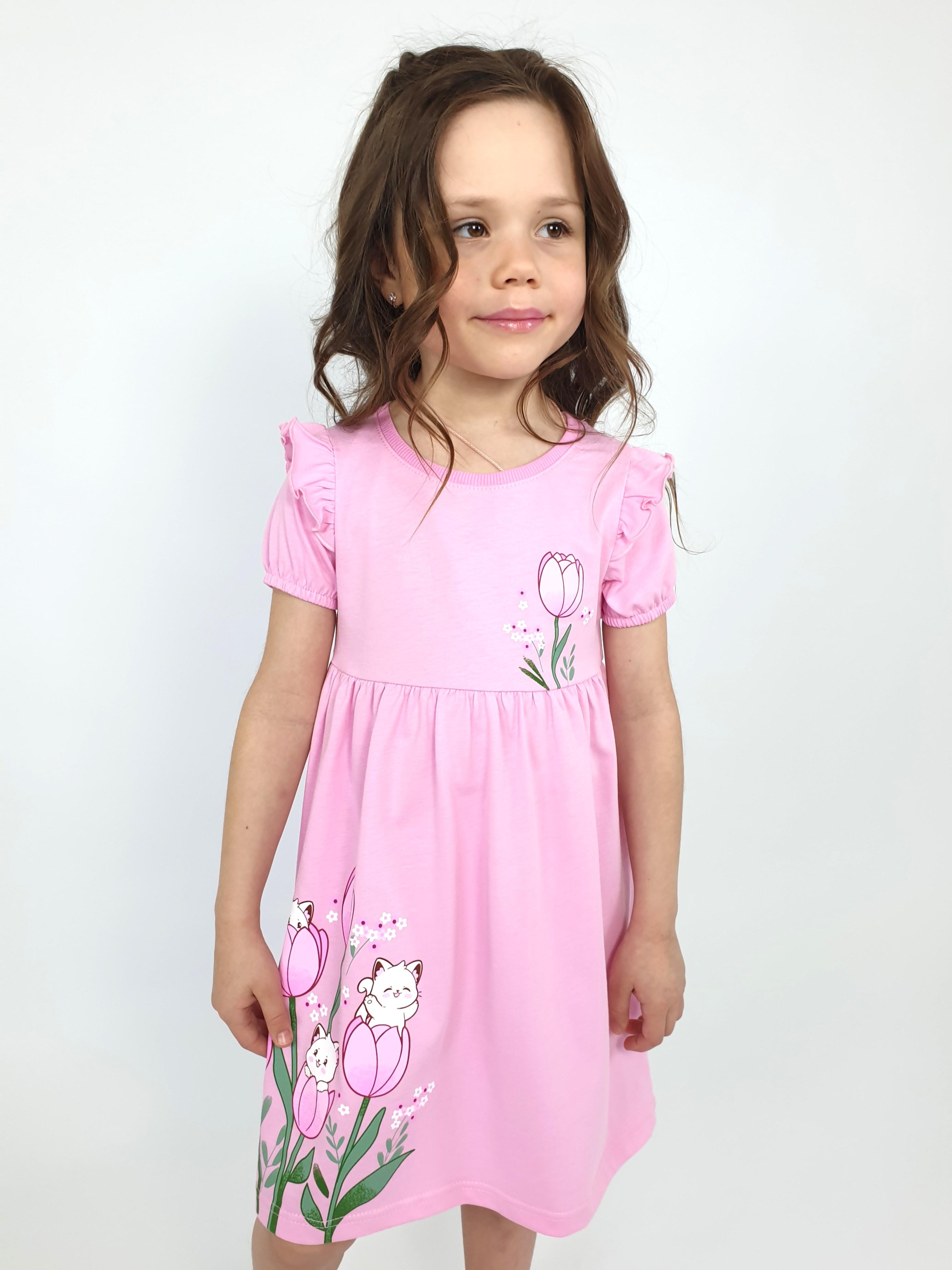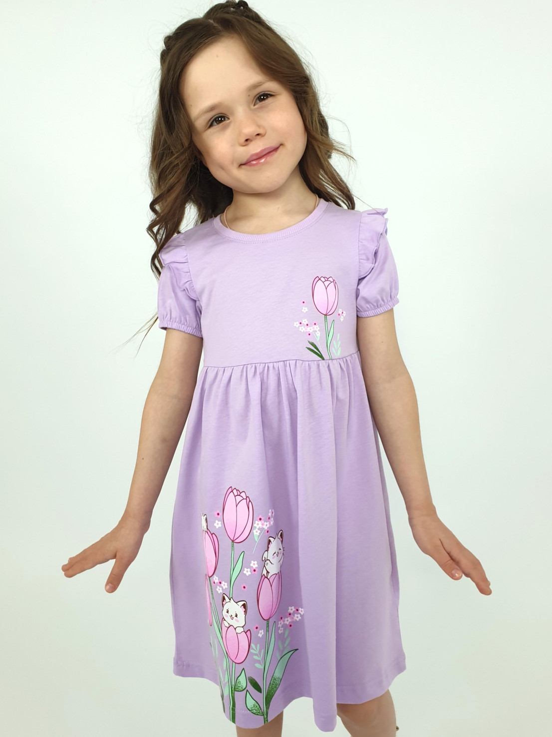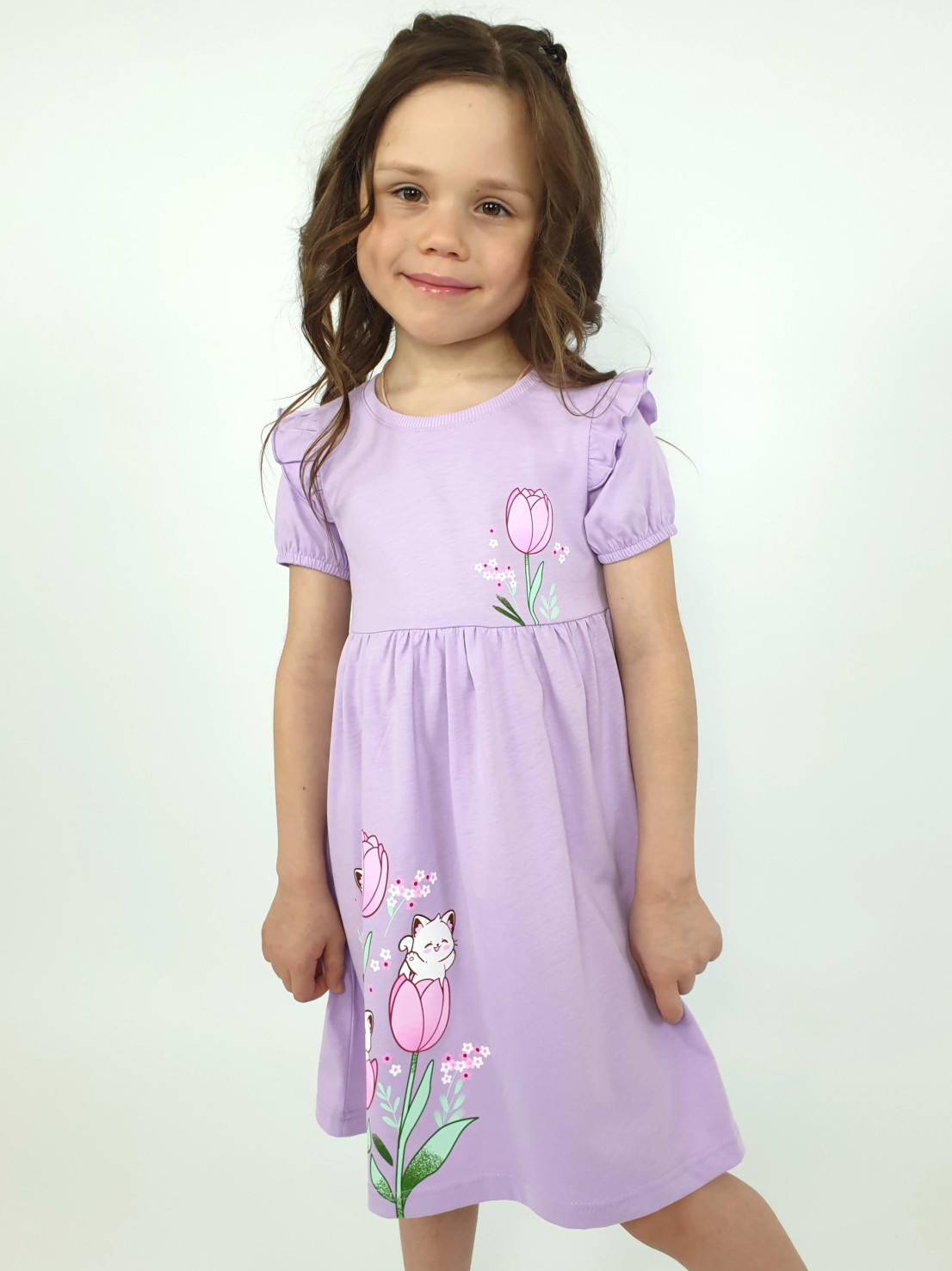 Кулирное полотно:100% х/б. Платье-перед и спинка с кокеткой,сборка по верху юбки.Рукав короткий,внизу собран на резинку,в пройме рюша.Горловина обработана ластиком.Печать на кокетке переда и переднем полотнище юбки.