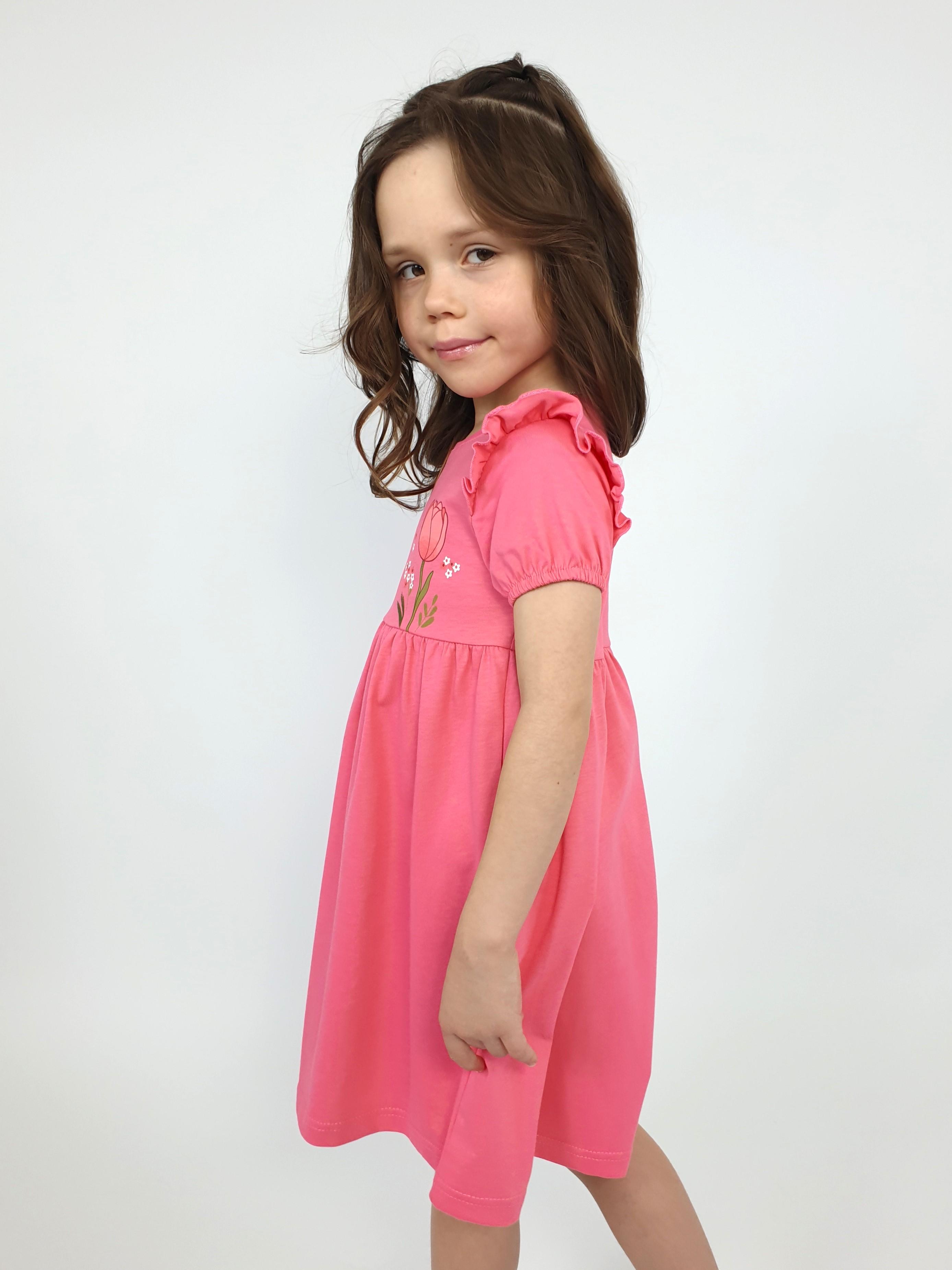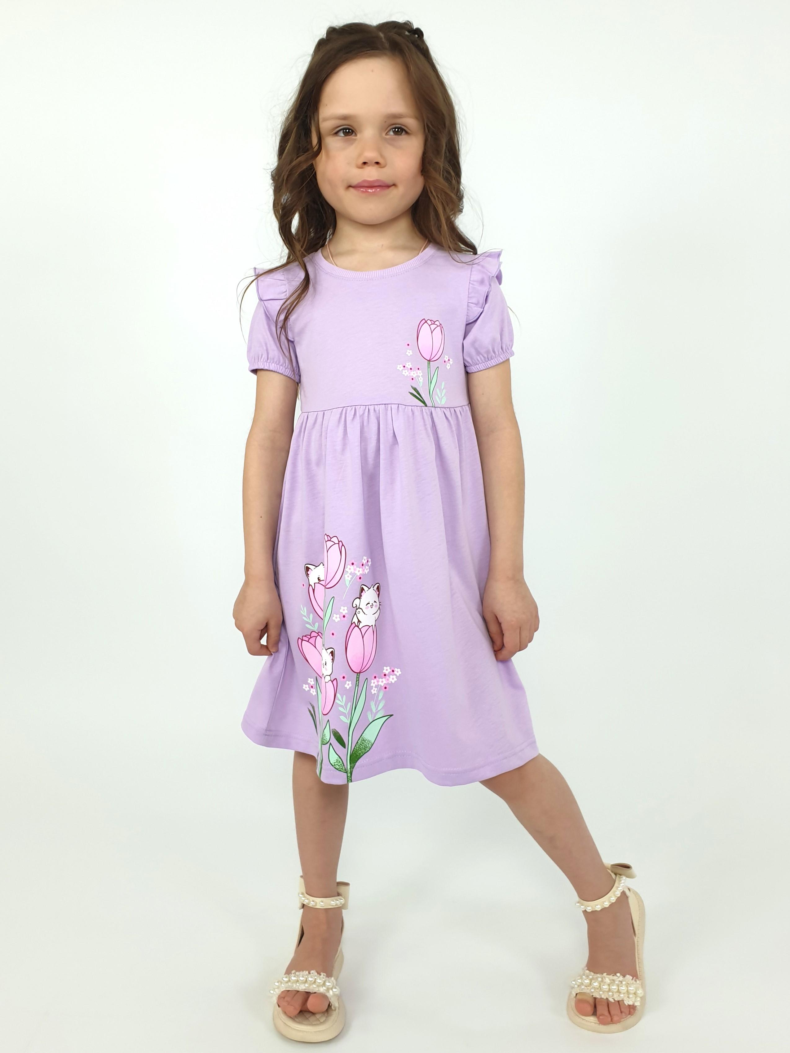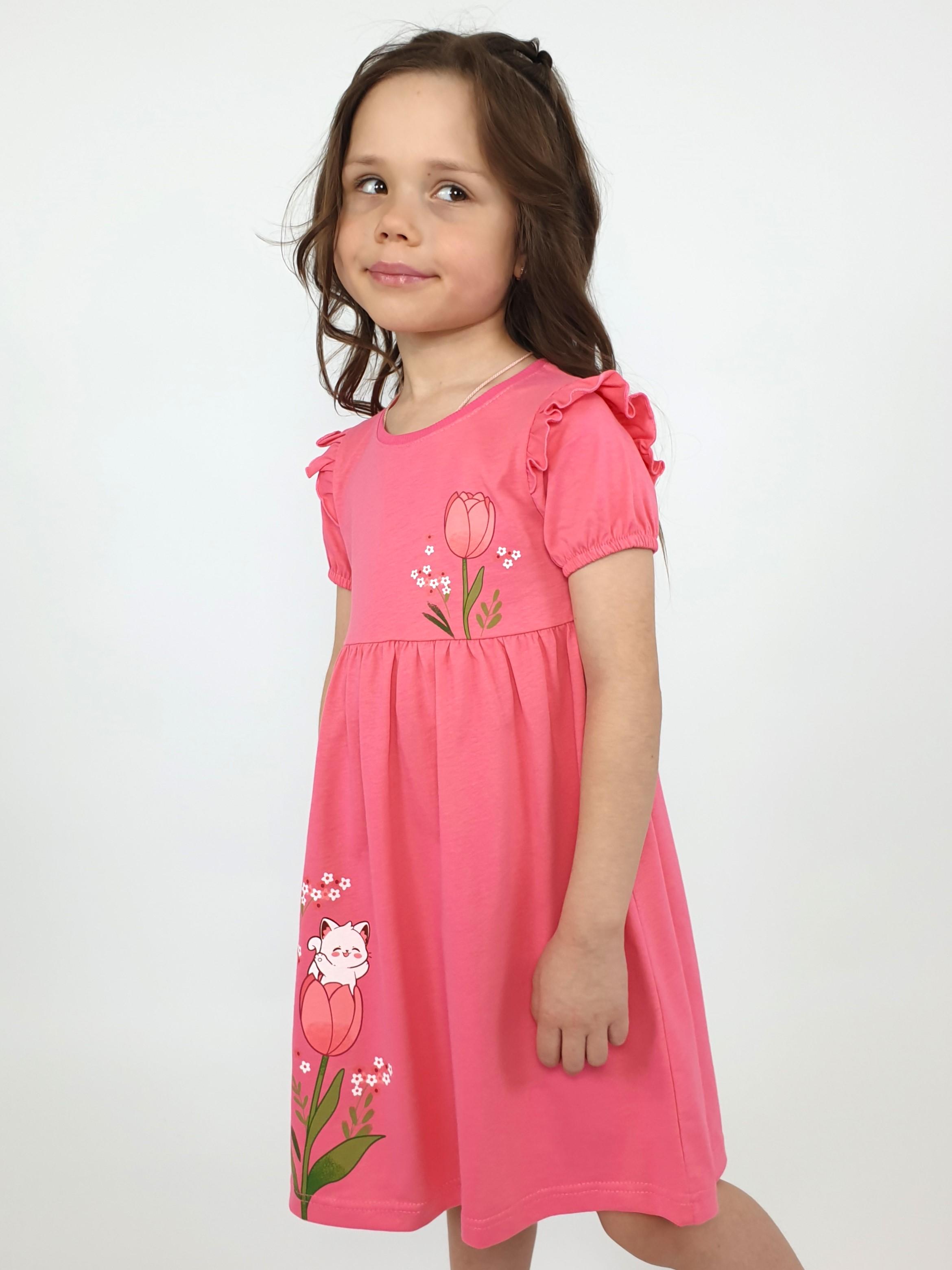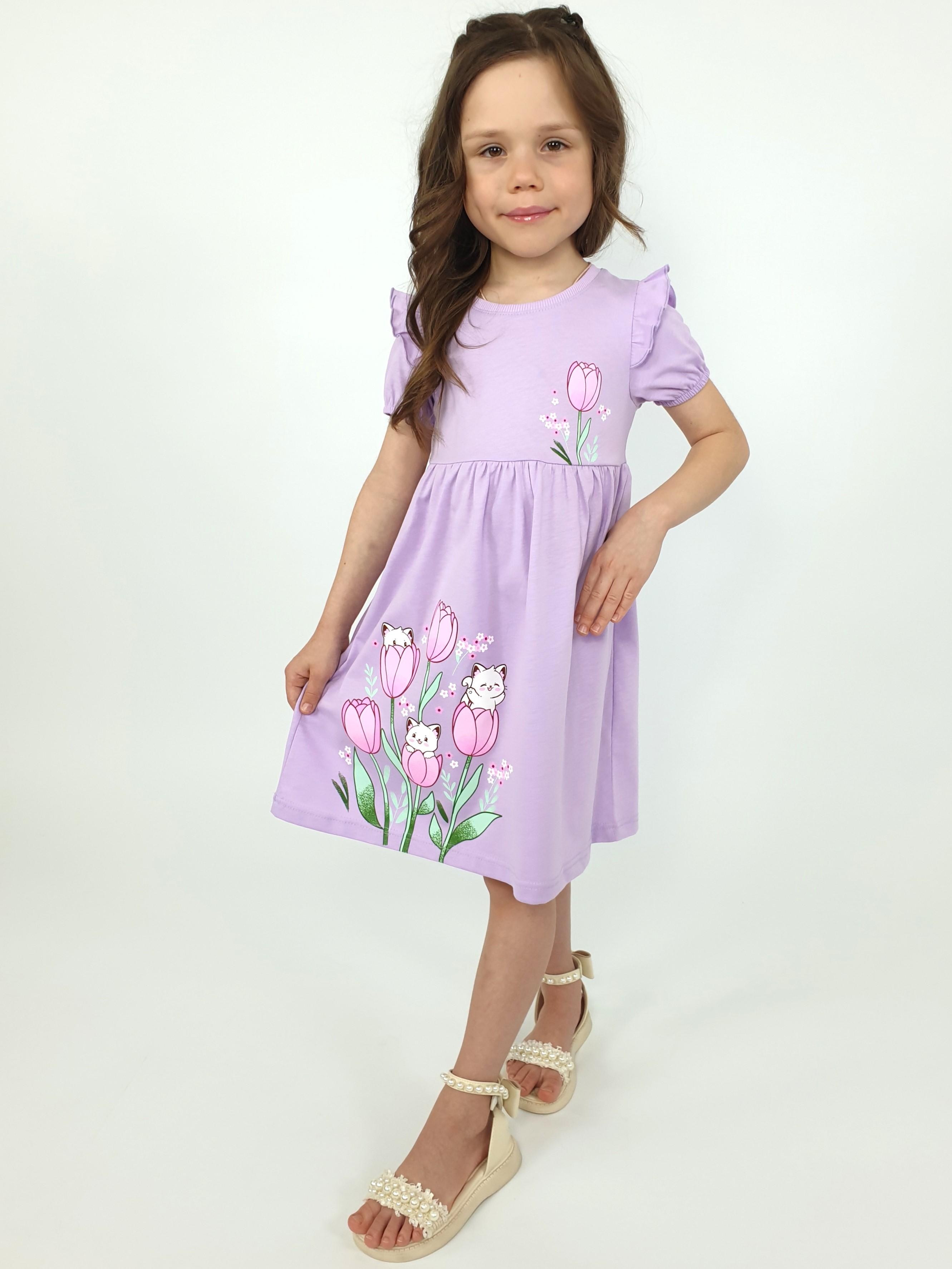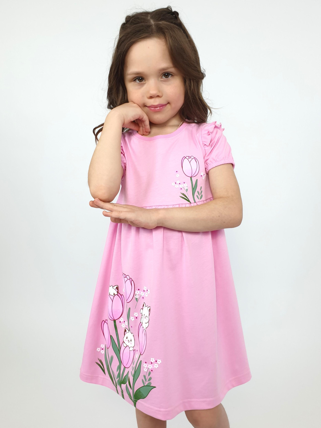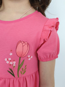 Кулирное полотно:100% х/б. Платье-перед и спинка с кокеткой,сборка по верху юбки.Рукав короткий,внизу собран на резинку,в пройме рюша.Горловина обработана ластиком.Печать на кокетке переда и переднем полотнище юбки.