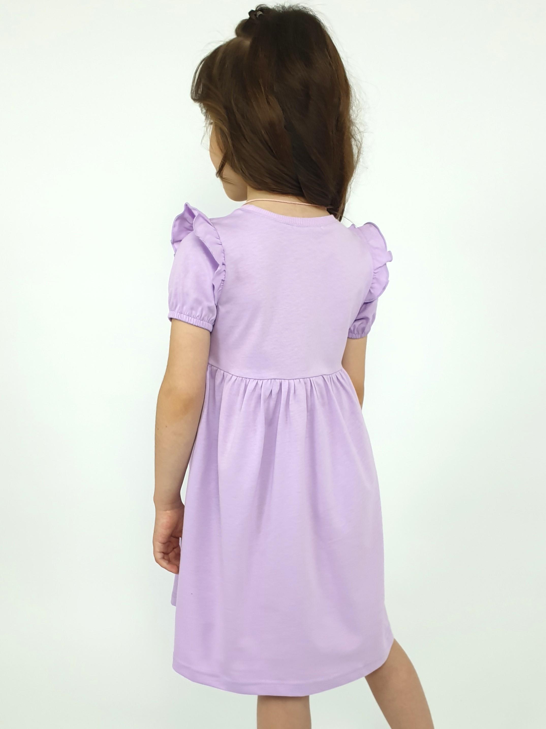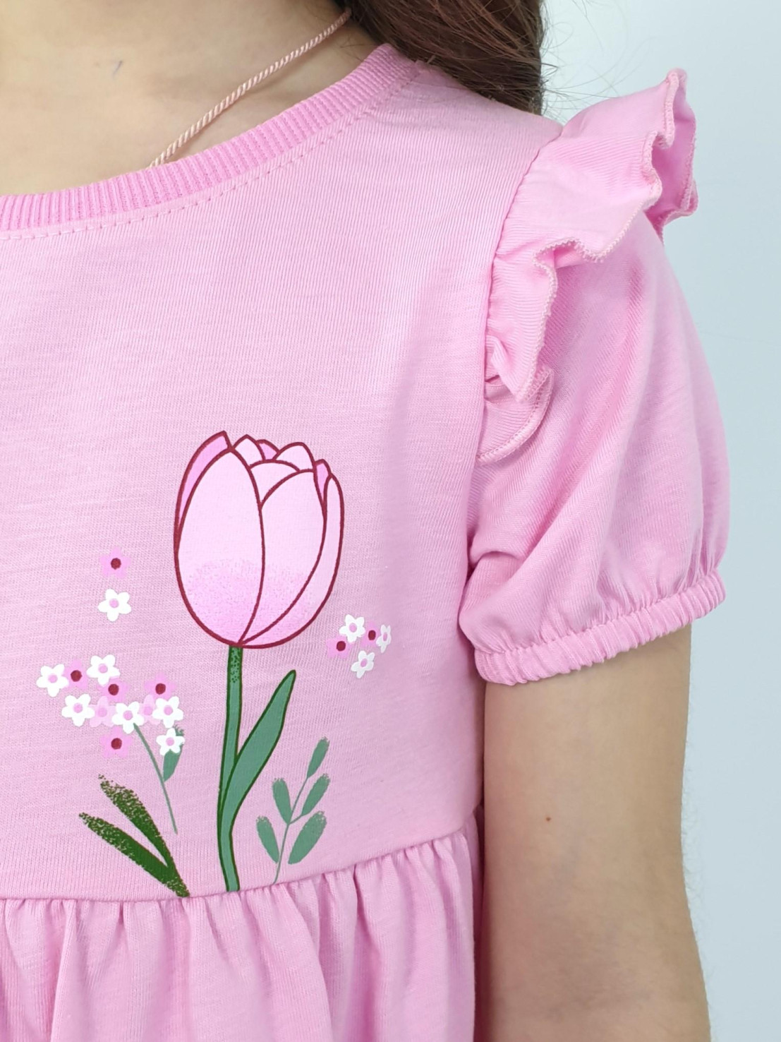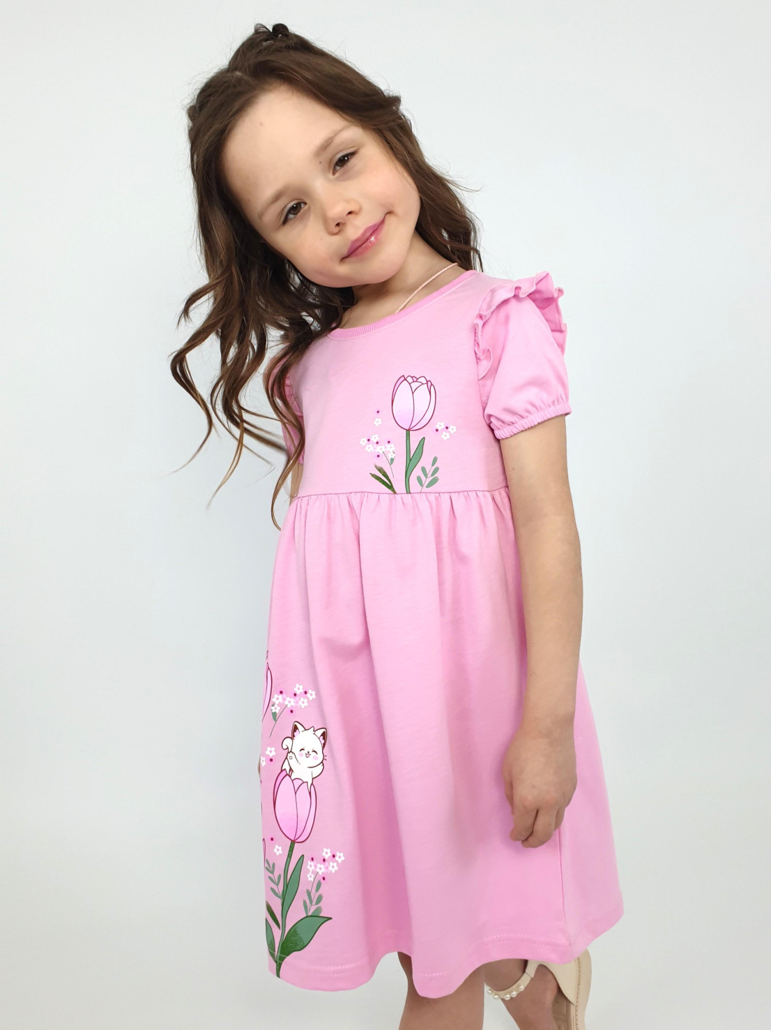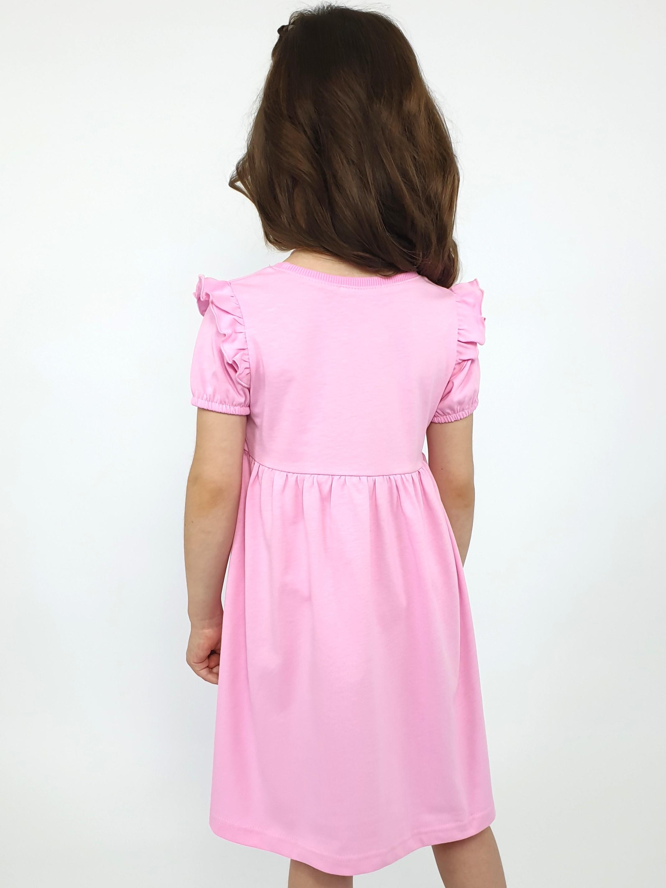 Кулирное полотно:100% х/б. Платье-перед и спинка с кокеткой,сборка по верху юбки.Рукав короткий,внизу собран на резинку,в пройме рюша.Горловина обработана ластиком.Печать на кокетке переда и переднем полотнище юбки.