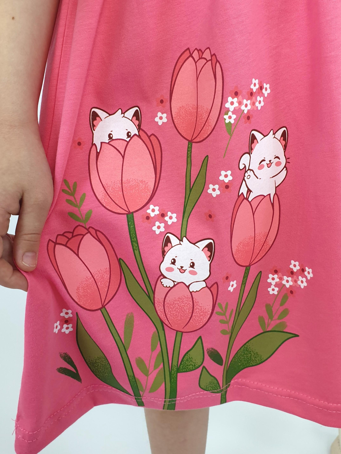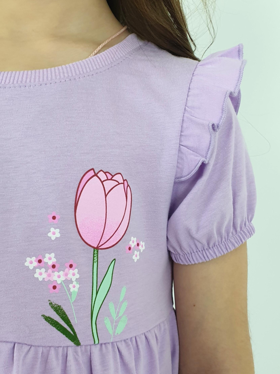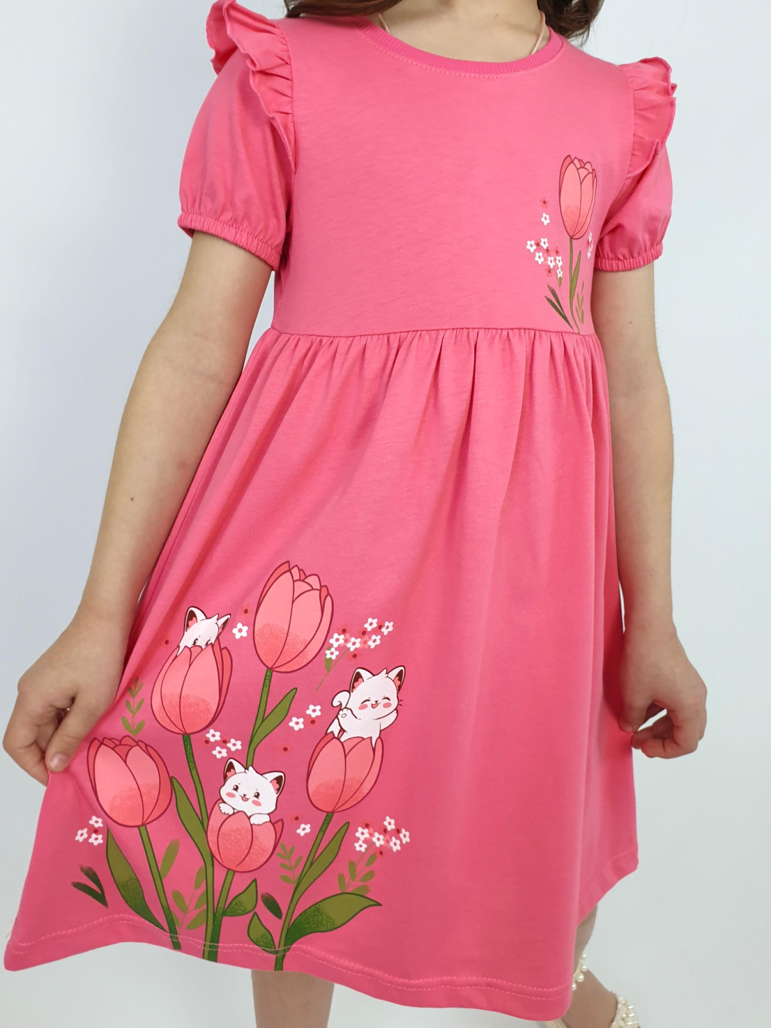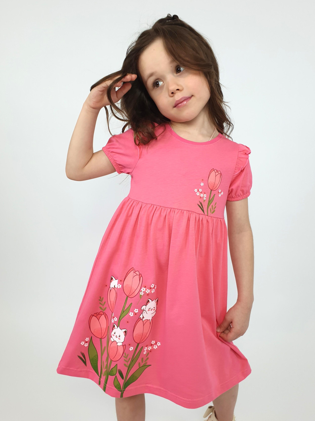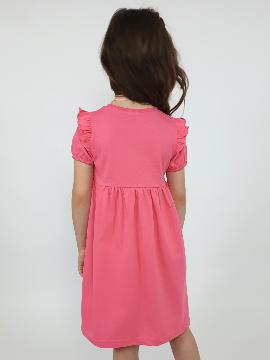 Кулирное полотно:100% х/б. Платье-перед и спинка с кокеткой,сборка по верху юбки.Рукав короткий,внизу собран на резинку,в пройме рюша.Горловина обработана ластиком.Печать на кокетке переда и переднем полотнище юбки.