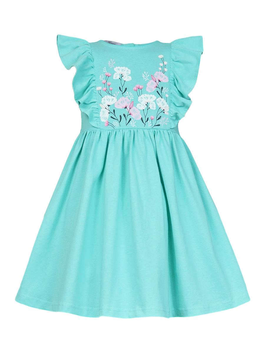 Кулирное полотно:100% х/б. Платье- полуприлегающего силуэта. Отрезная юбка со сборкой, рельефы с рюшей. Печать на переде. Горловина окантована и подшита, застежка сзади на пуговицы.