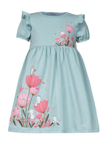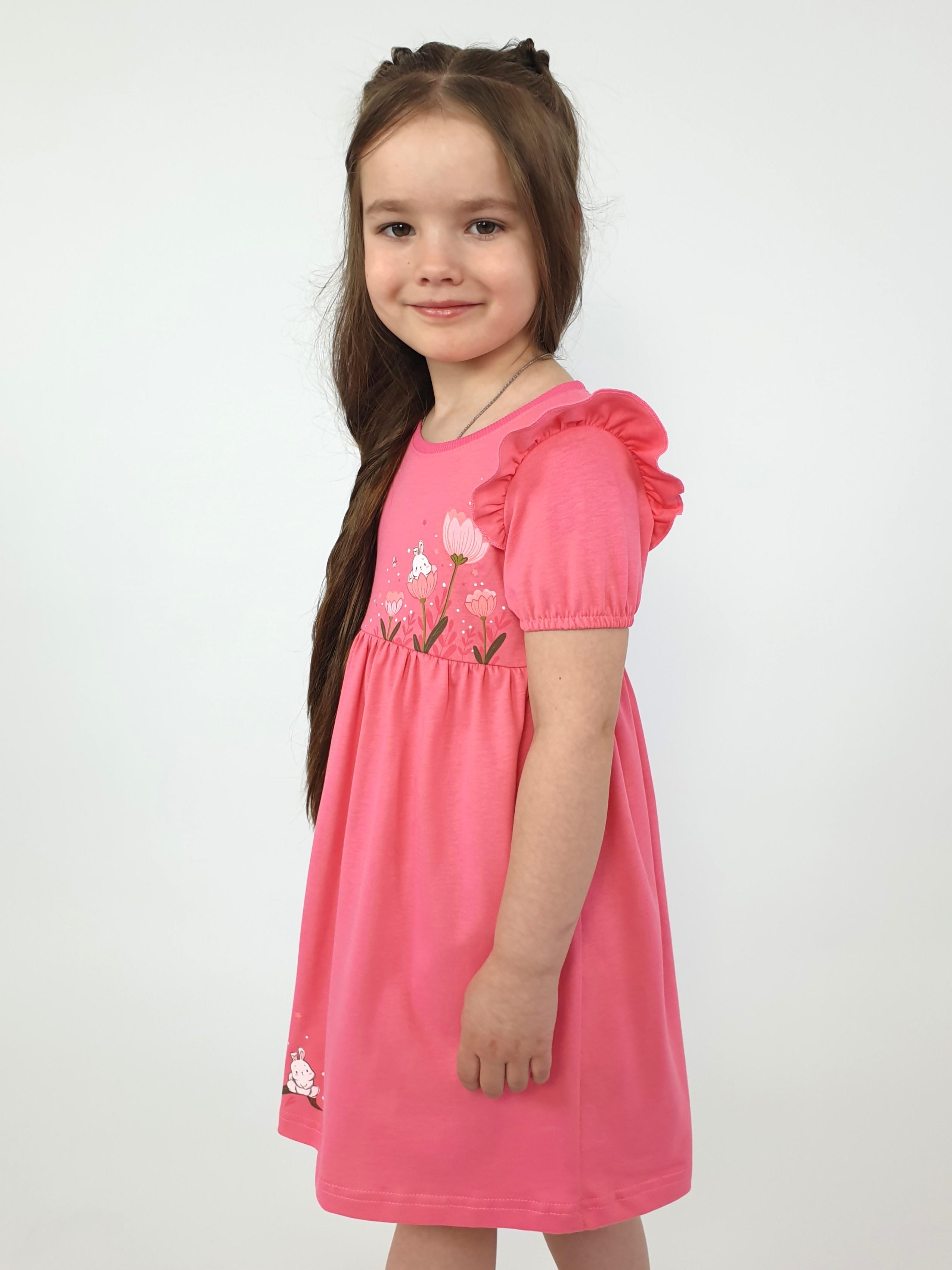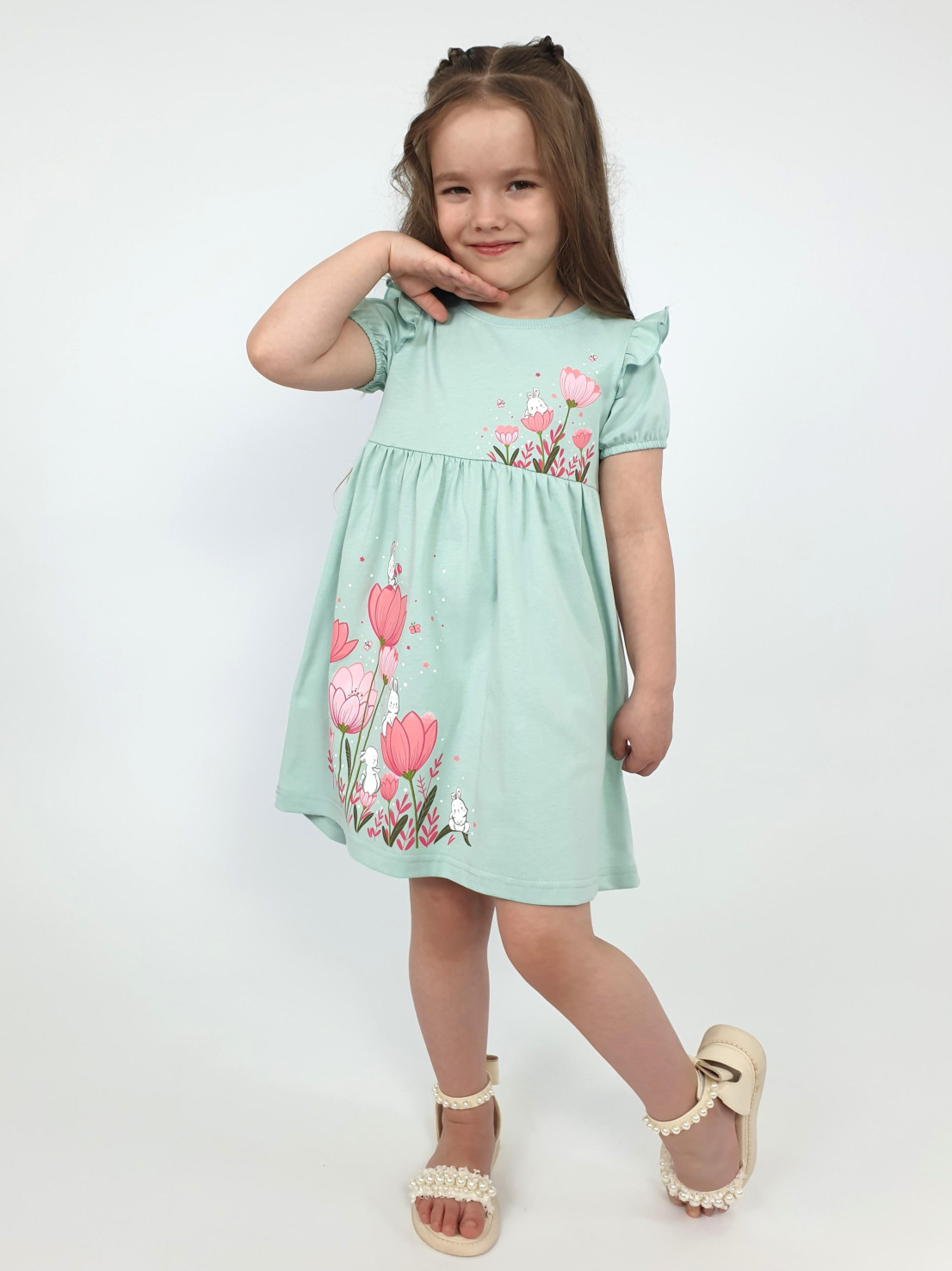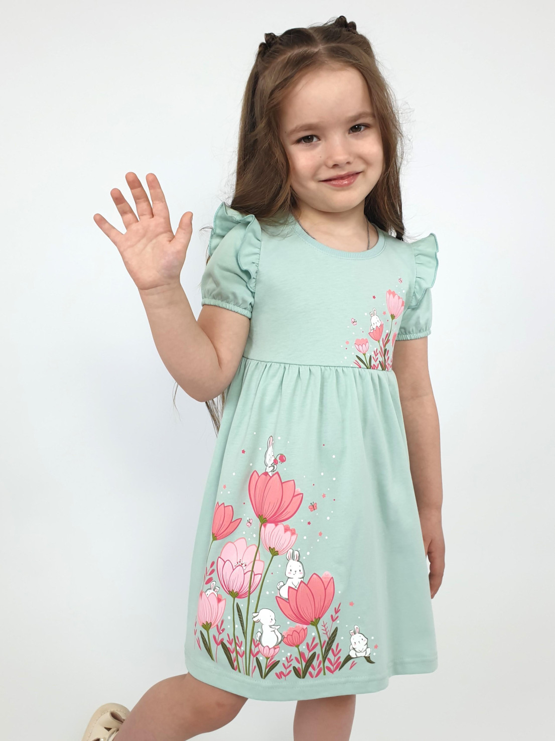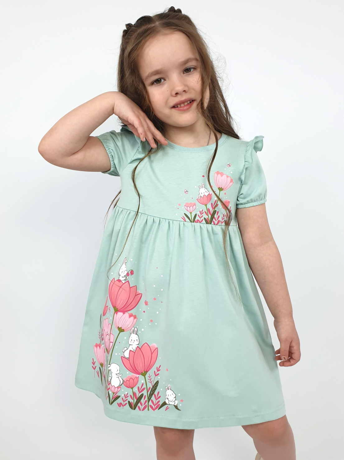 Кулирное полотно:100% х/б. Платье-перед и спинка с кокеткой,сборка по верху юбки.Рукав короткий,внизу собран на резинку,в пройме рюша.Горловина обработана ластиком.Печать на кокетке переда и переднем полотнище юбки.