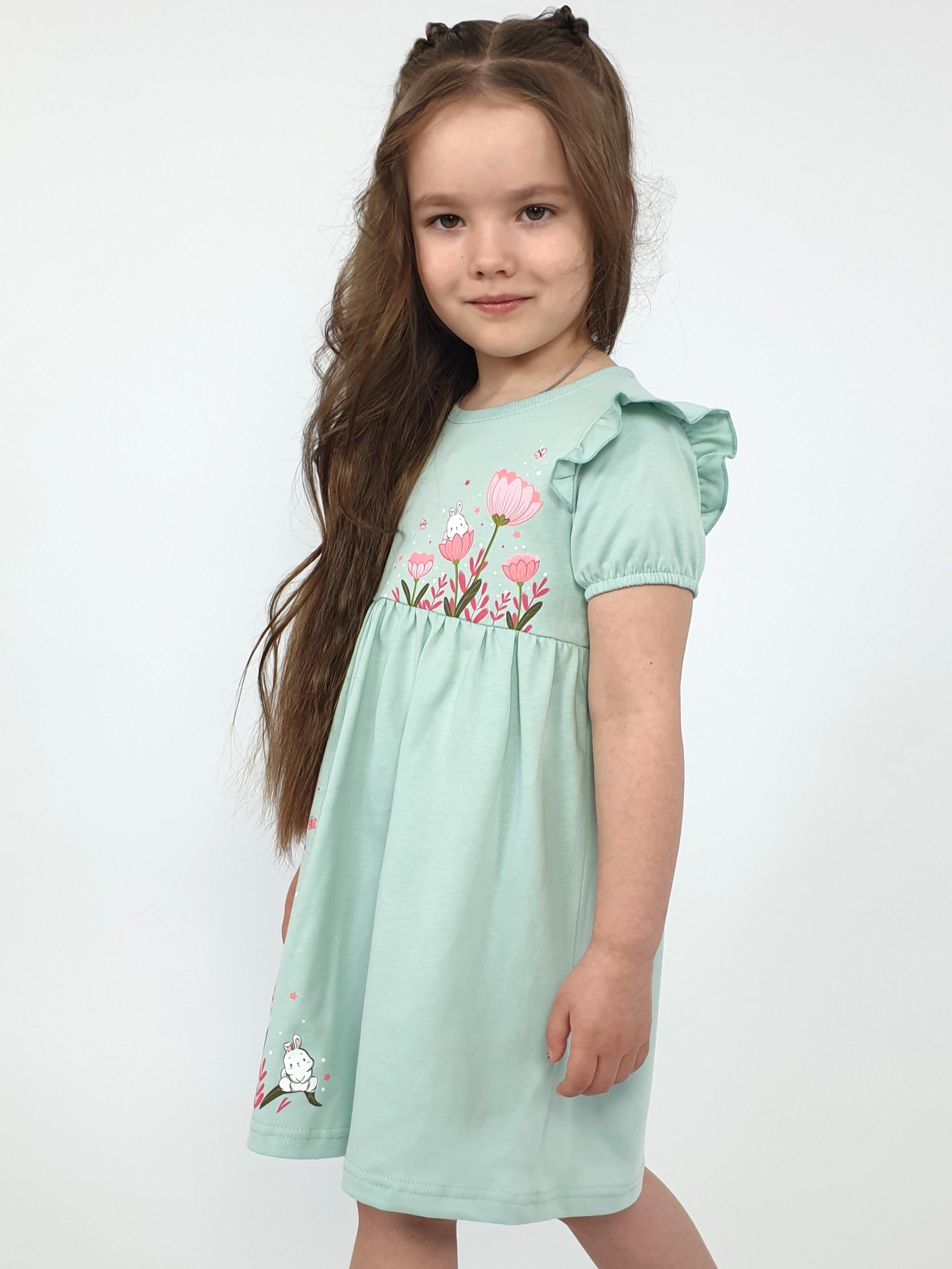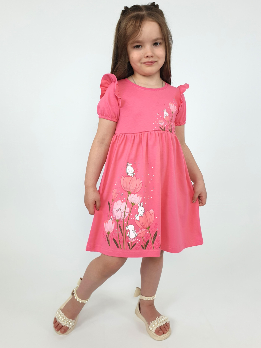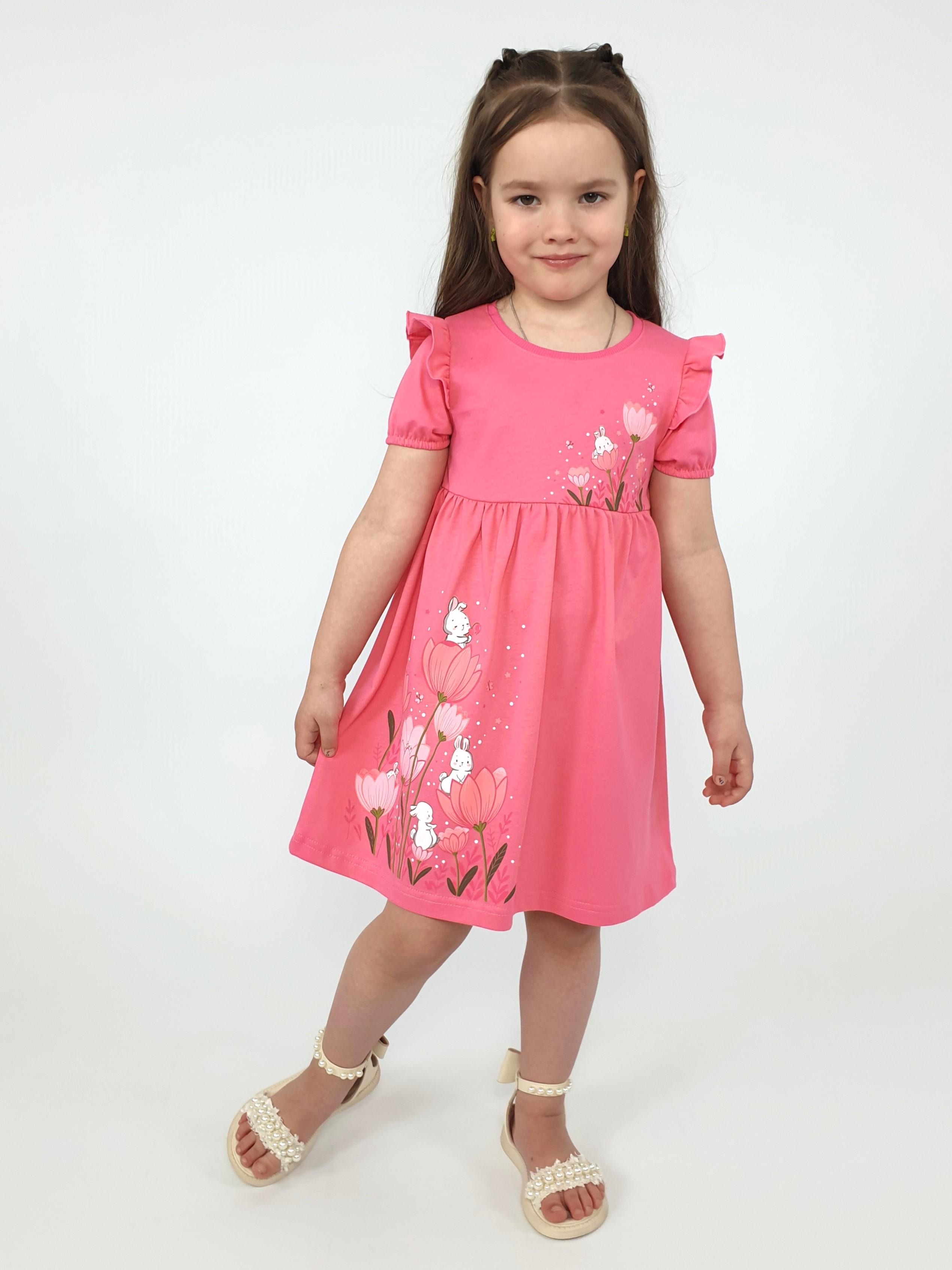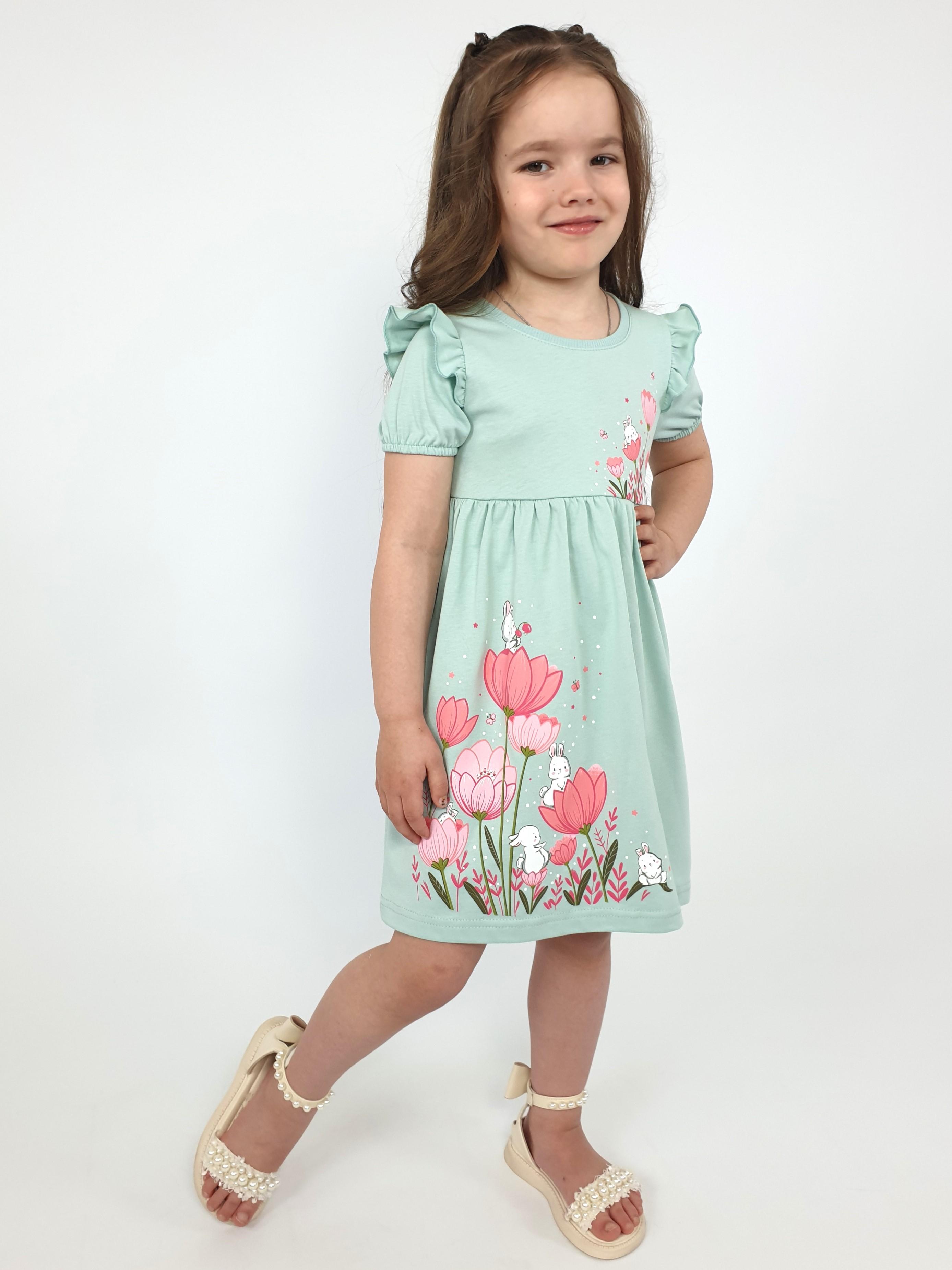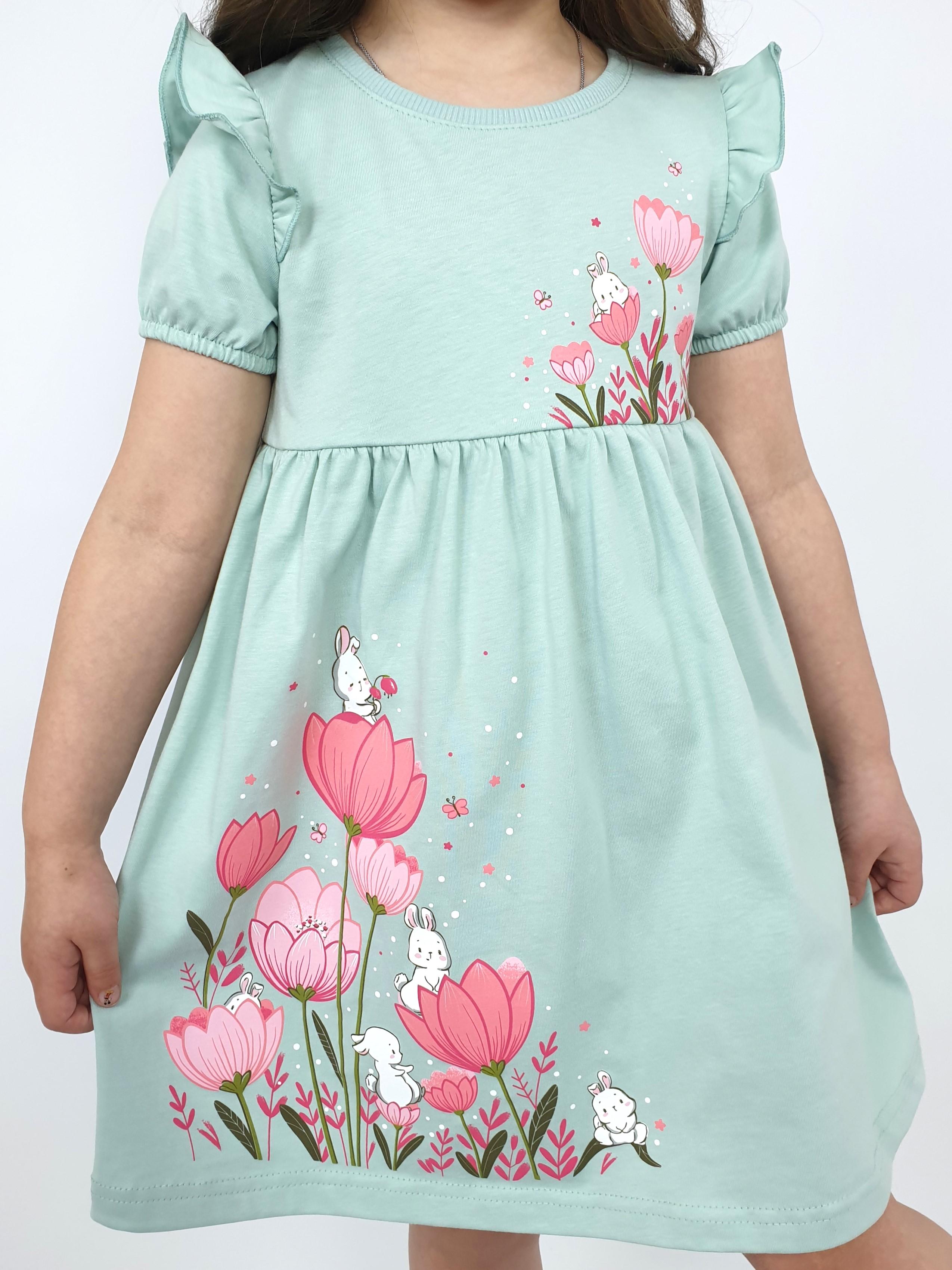 Кулирное полотно:100% х/б. Платье-перед и спинка с кокеткой,сборка по верху юбки.Рукав короткий,внизу собран на резинку,в пройме рюша.Горловина обработана ластиком.Печать на кокетке переда и переднем полотнище юбки.