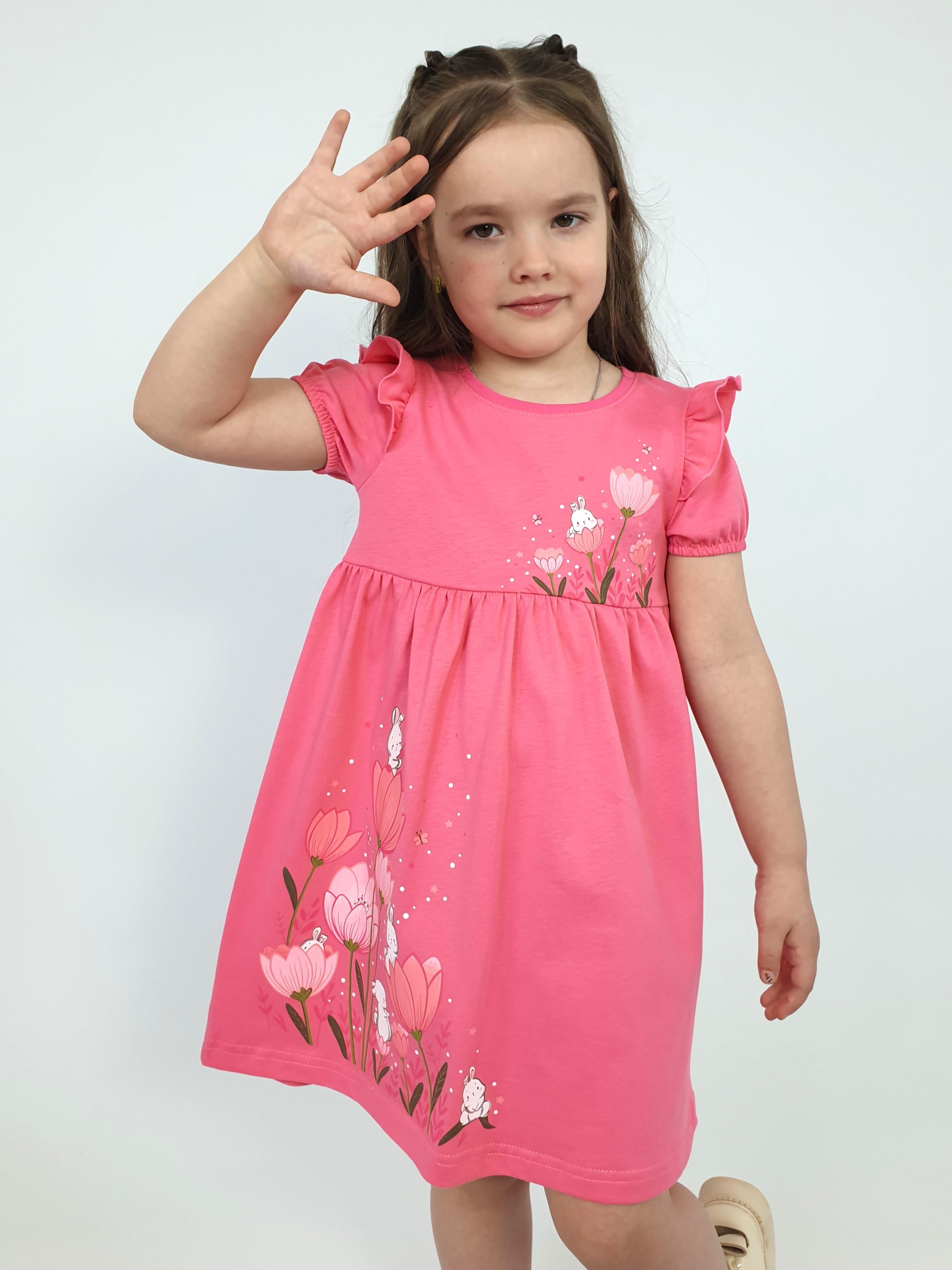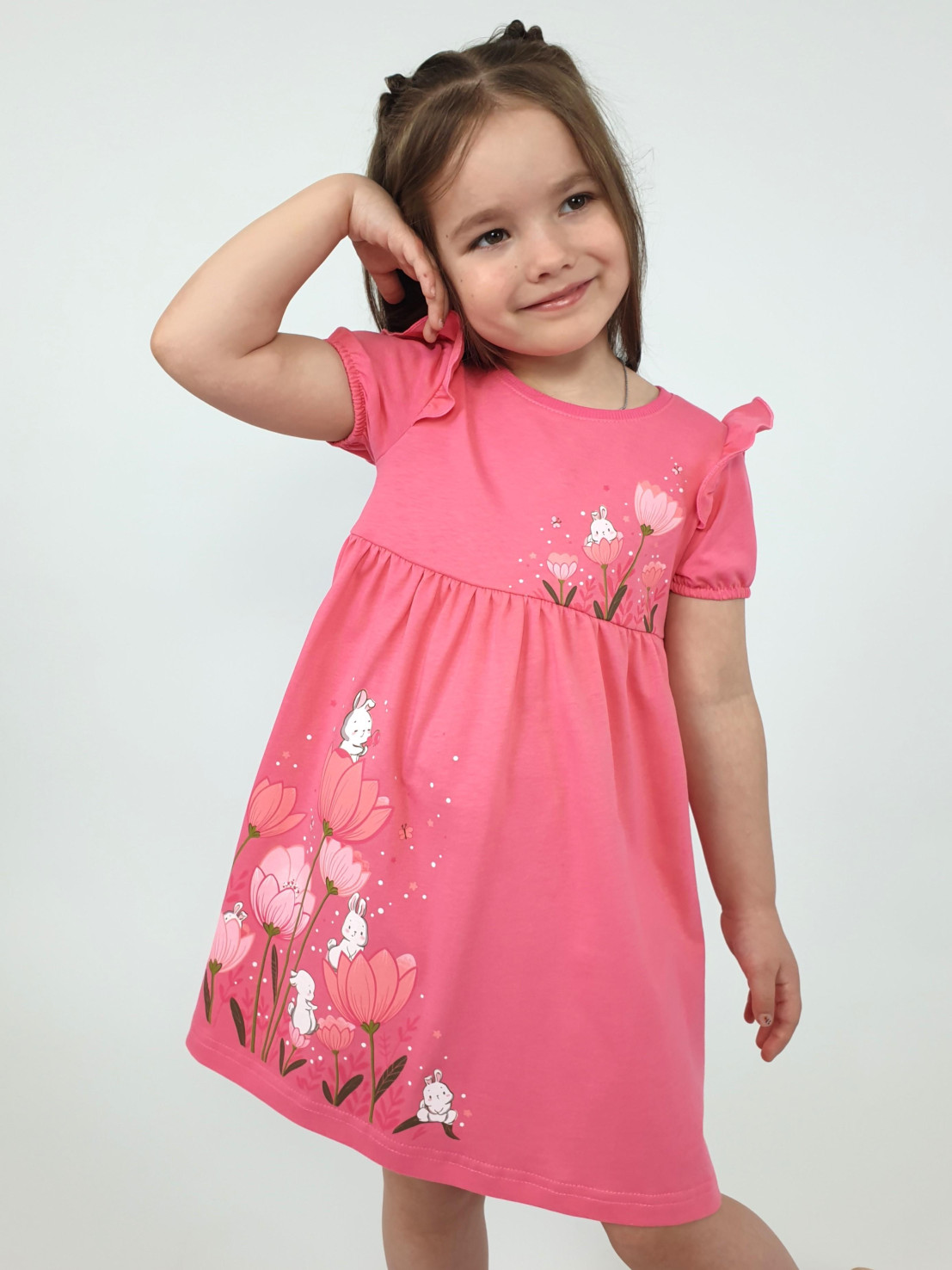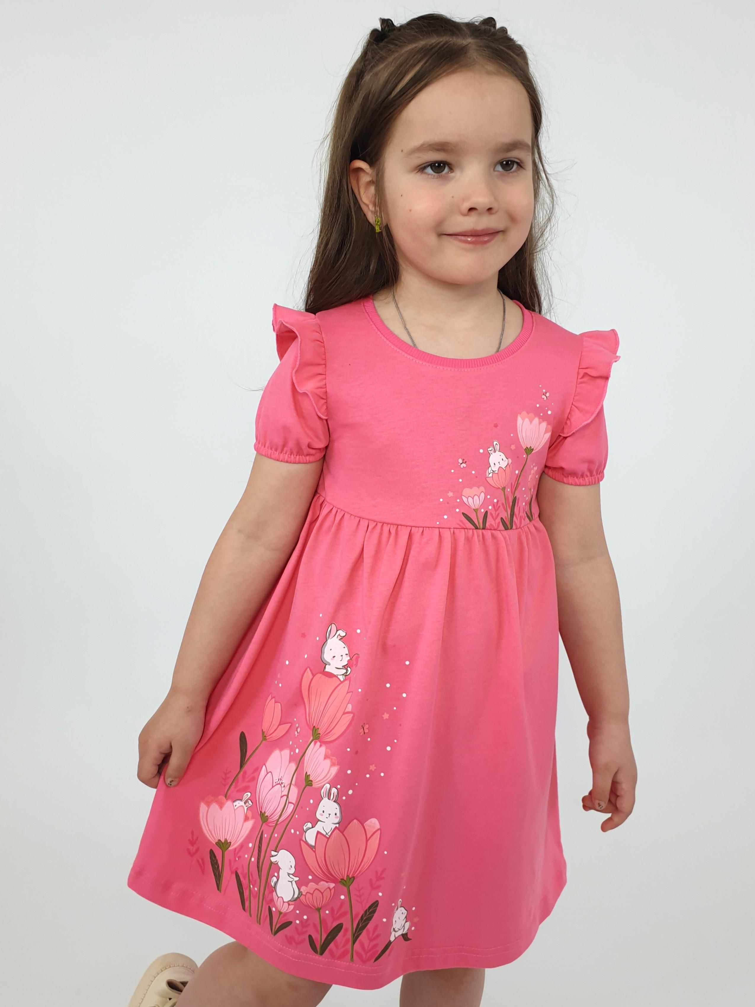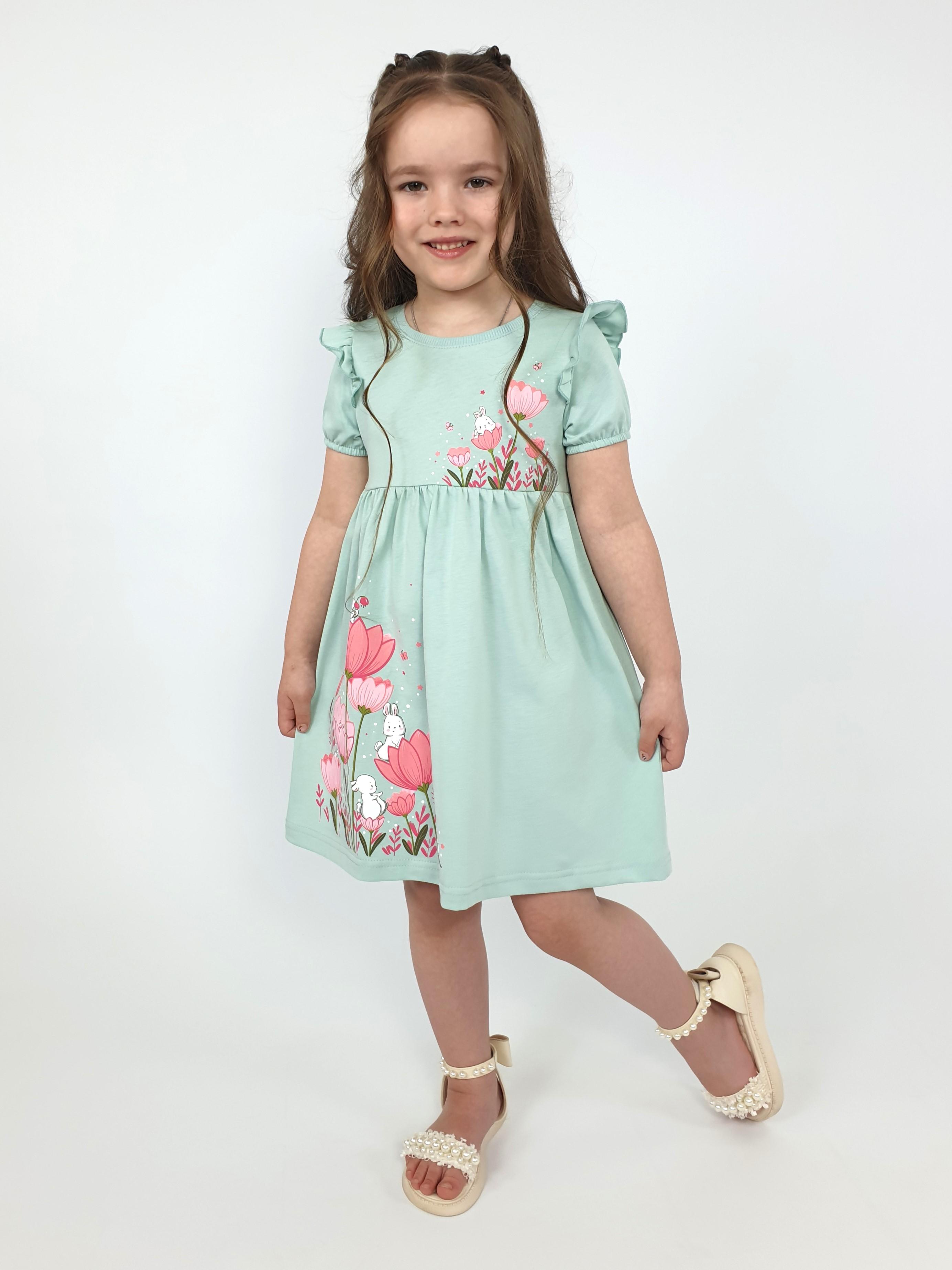 Кулирное полотно:100% х/б. Платье-перед и спинка с кокеткой,сборка по верху юбки.Рукав короткий,внизу собран на резинку,в пройме рюша.Горловина обработана ластиком.Печать на кокетке переда и переднем полотнище юбки.
