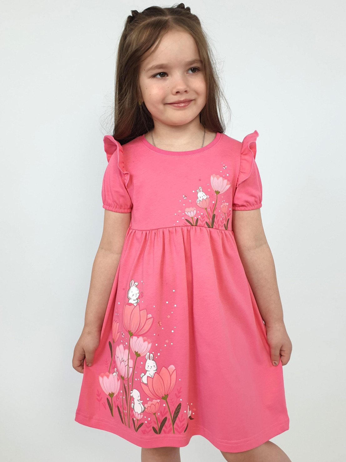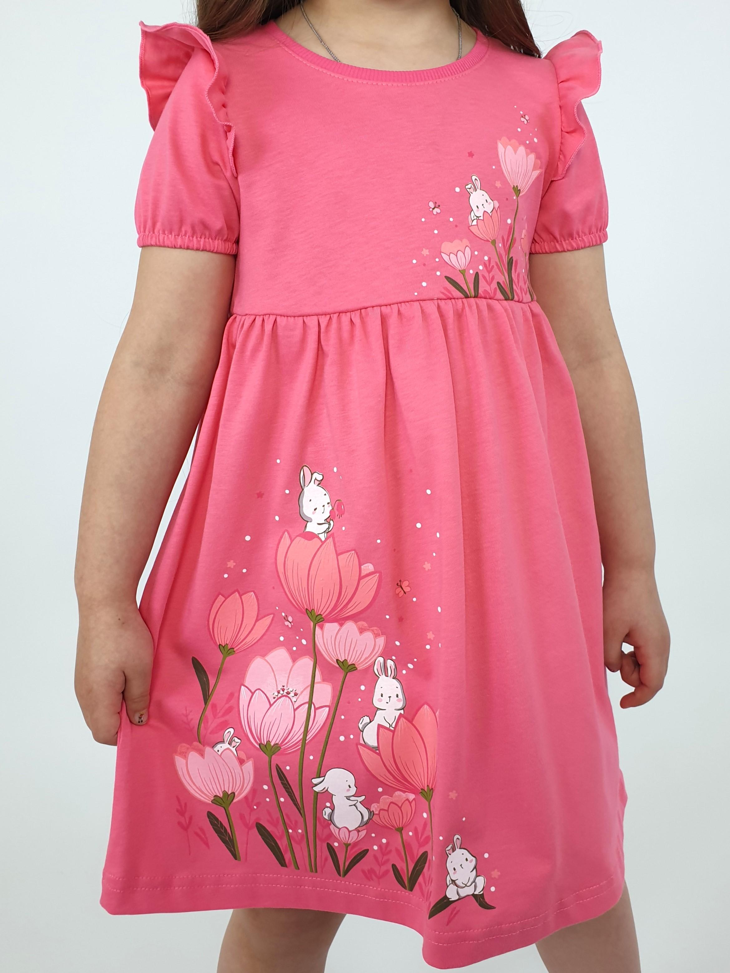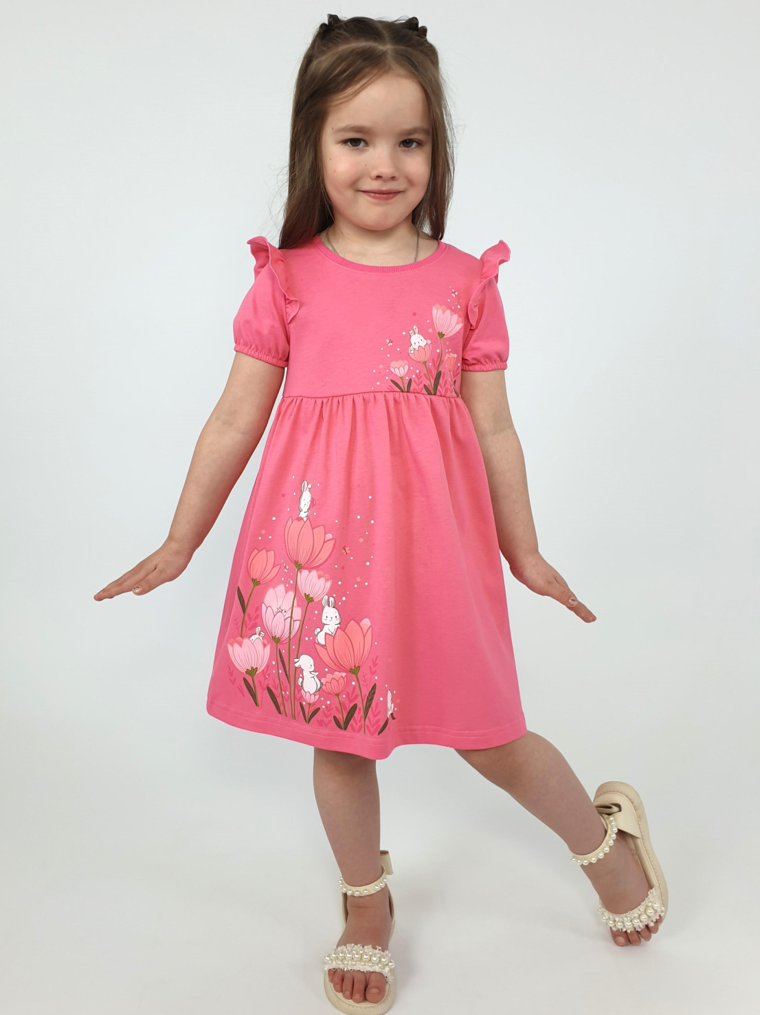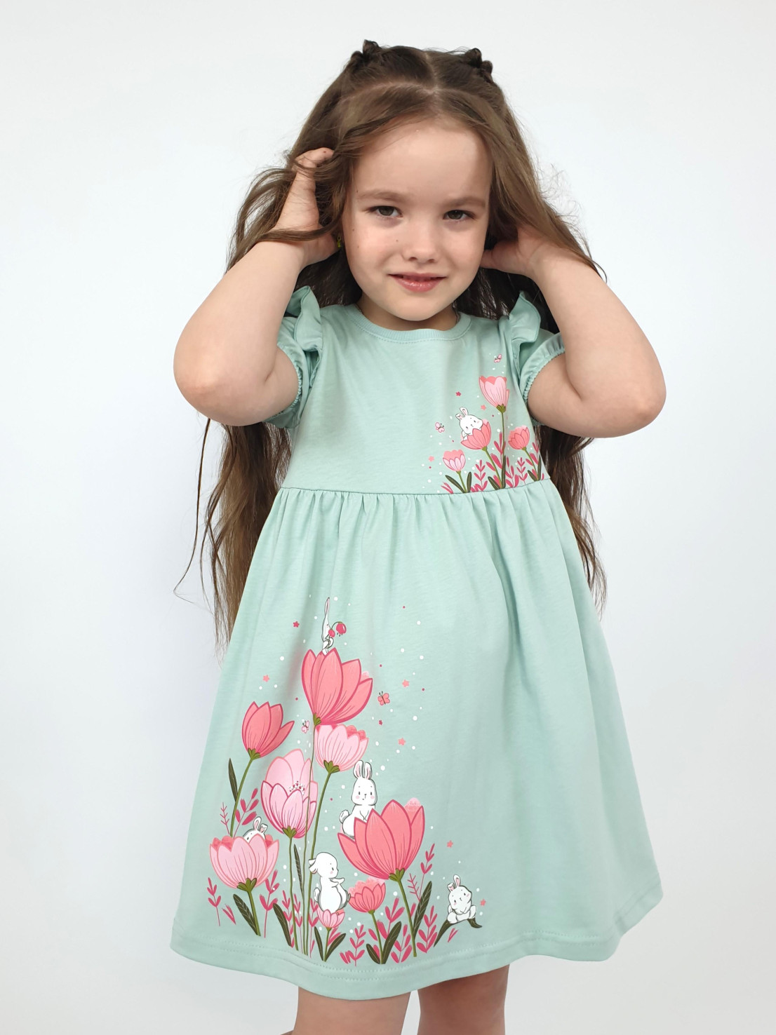 Кулирное полотно:100% х/б. Платье-перед и спинка с кокеткой,сборка по верху юбки.Рукав короткий,внизу собран на резинку,в пройме рюша.Горловина обработана ластиком.Печать на кокетке переда и переднем полотнище юбки.
