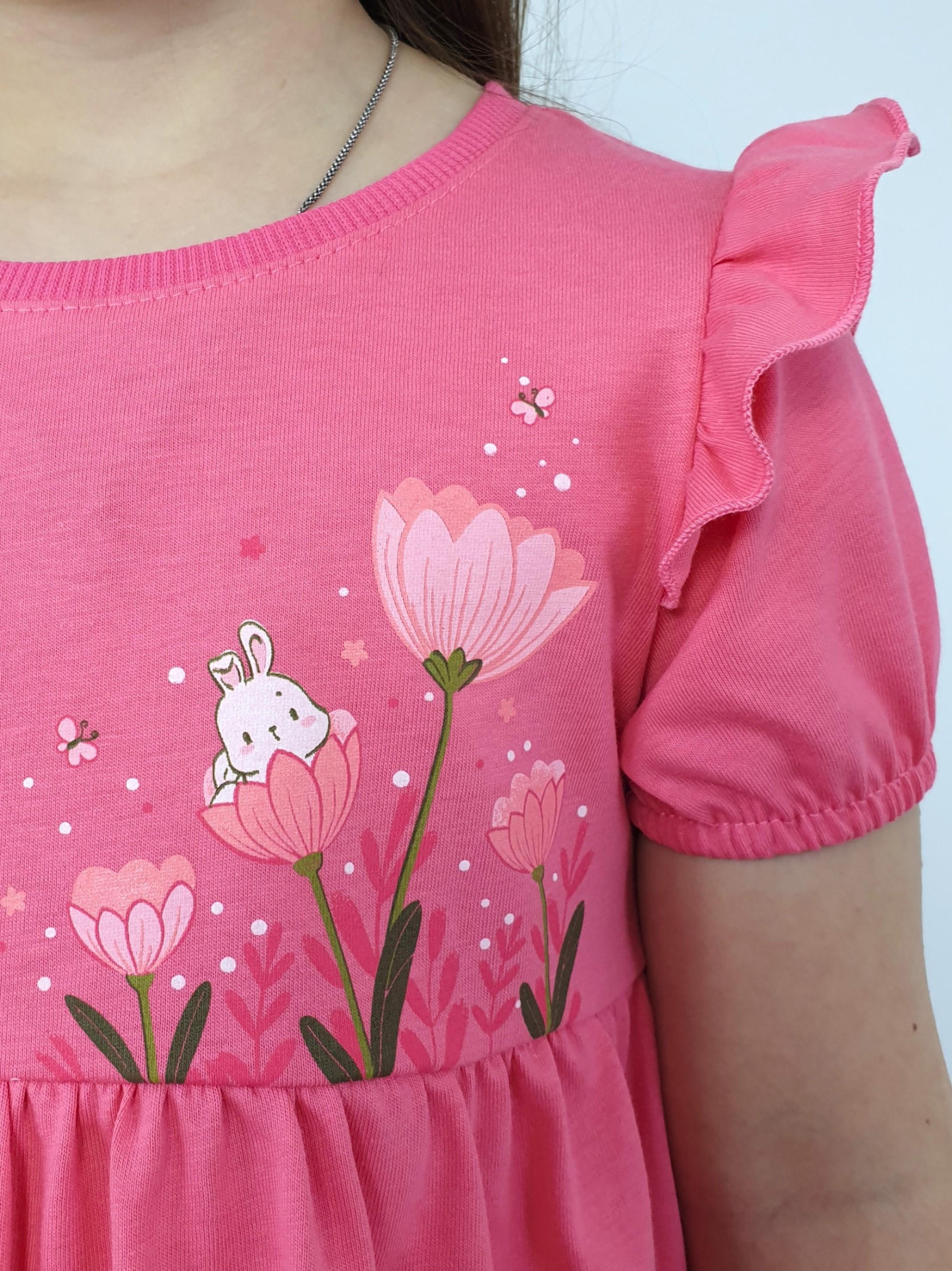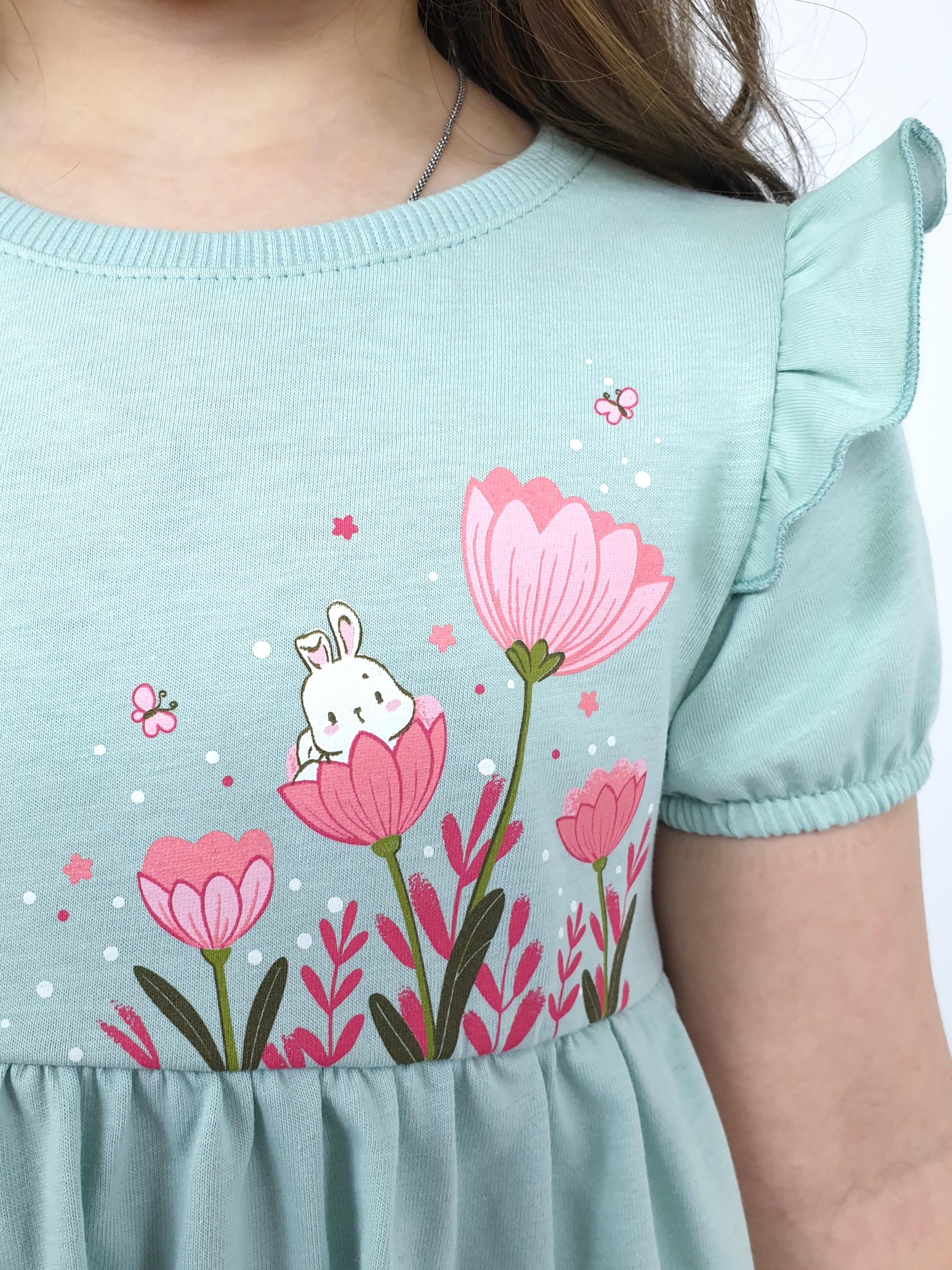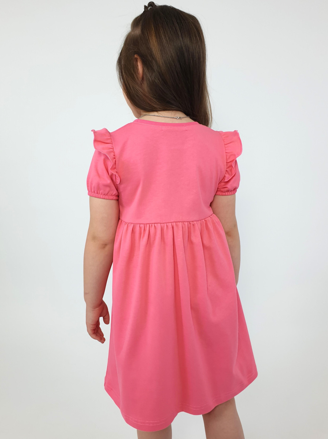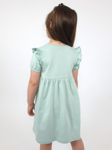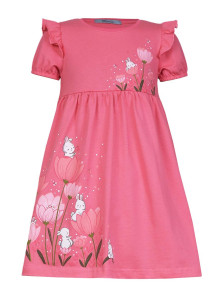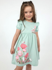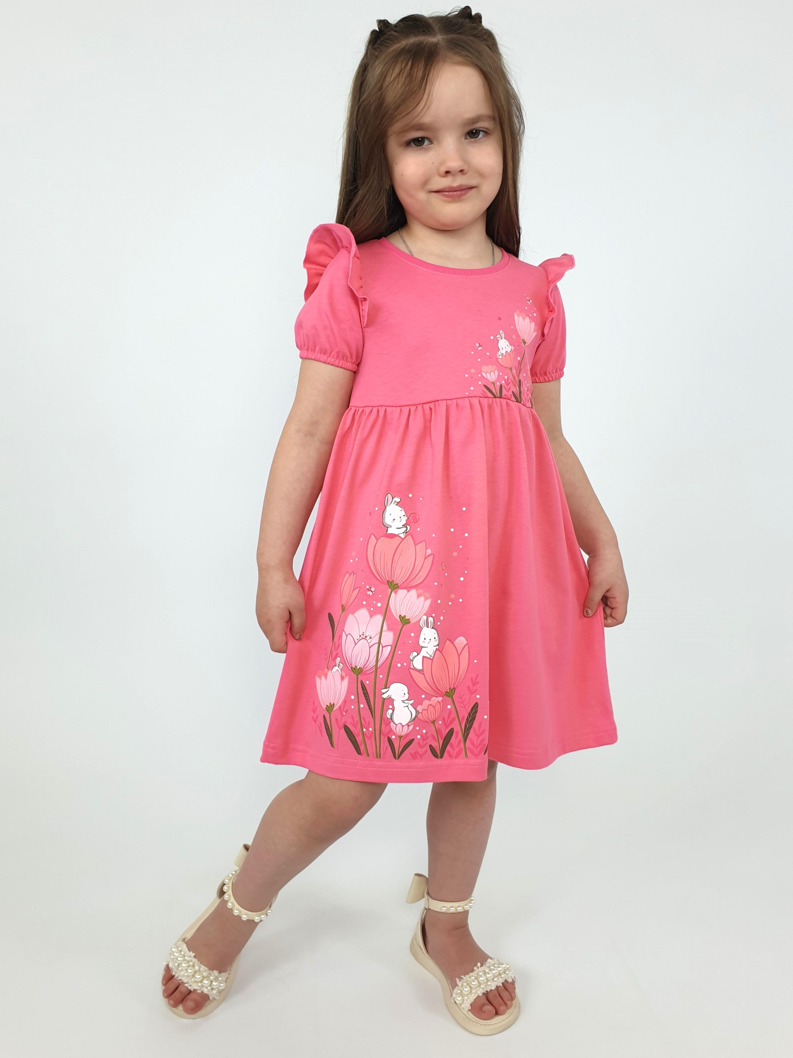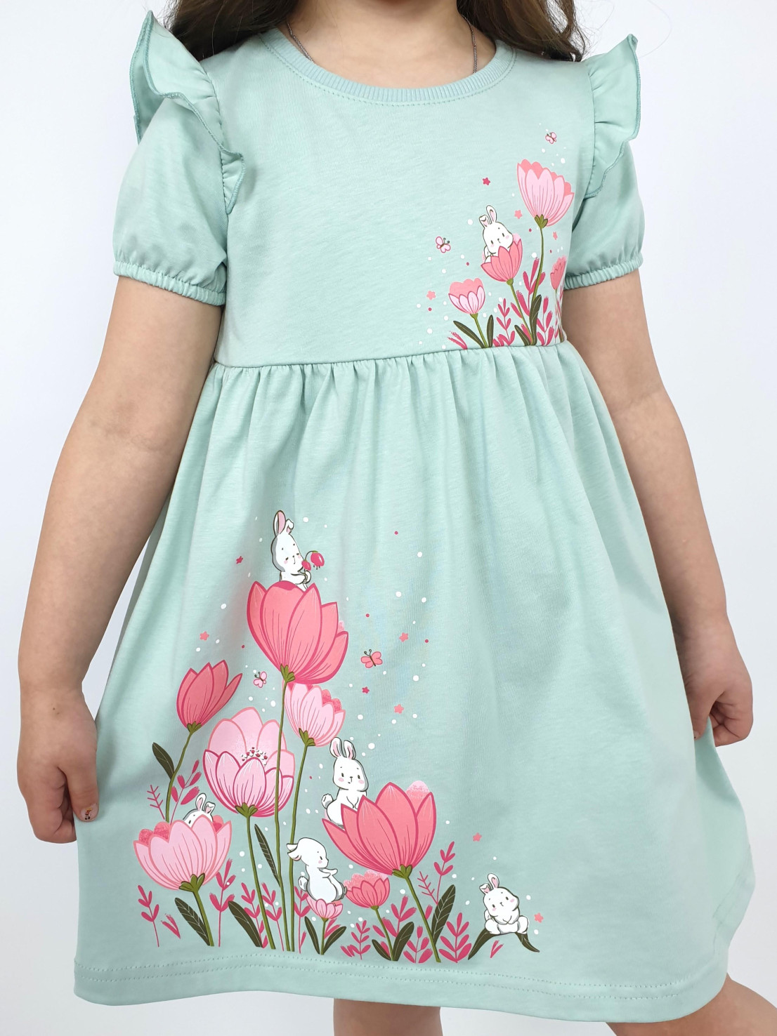 Кулирное полотно:100% х/б. Платье-перед и спинка с кокеткой,сборка по верху юбки.Рукав короткий,внизу собран на резинку,в пройме рюша.Горловина обработана ластиком.Печать на кокетке переда и переднем полотнище юбки.