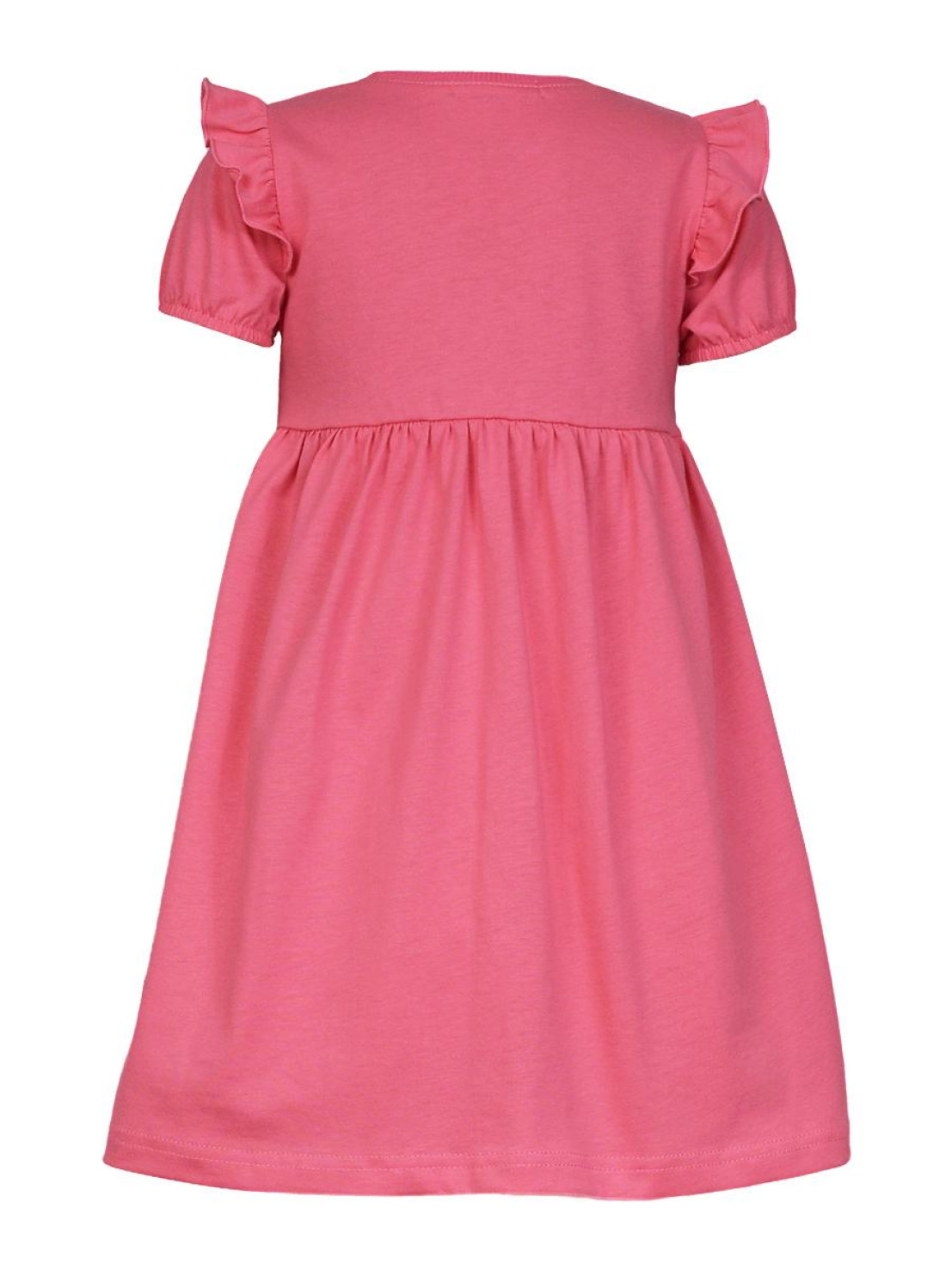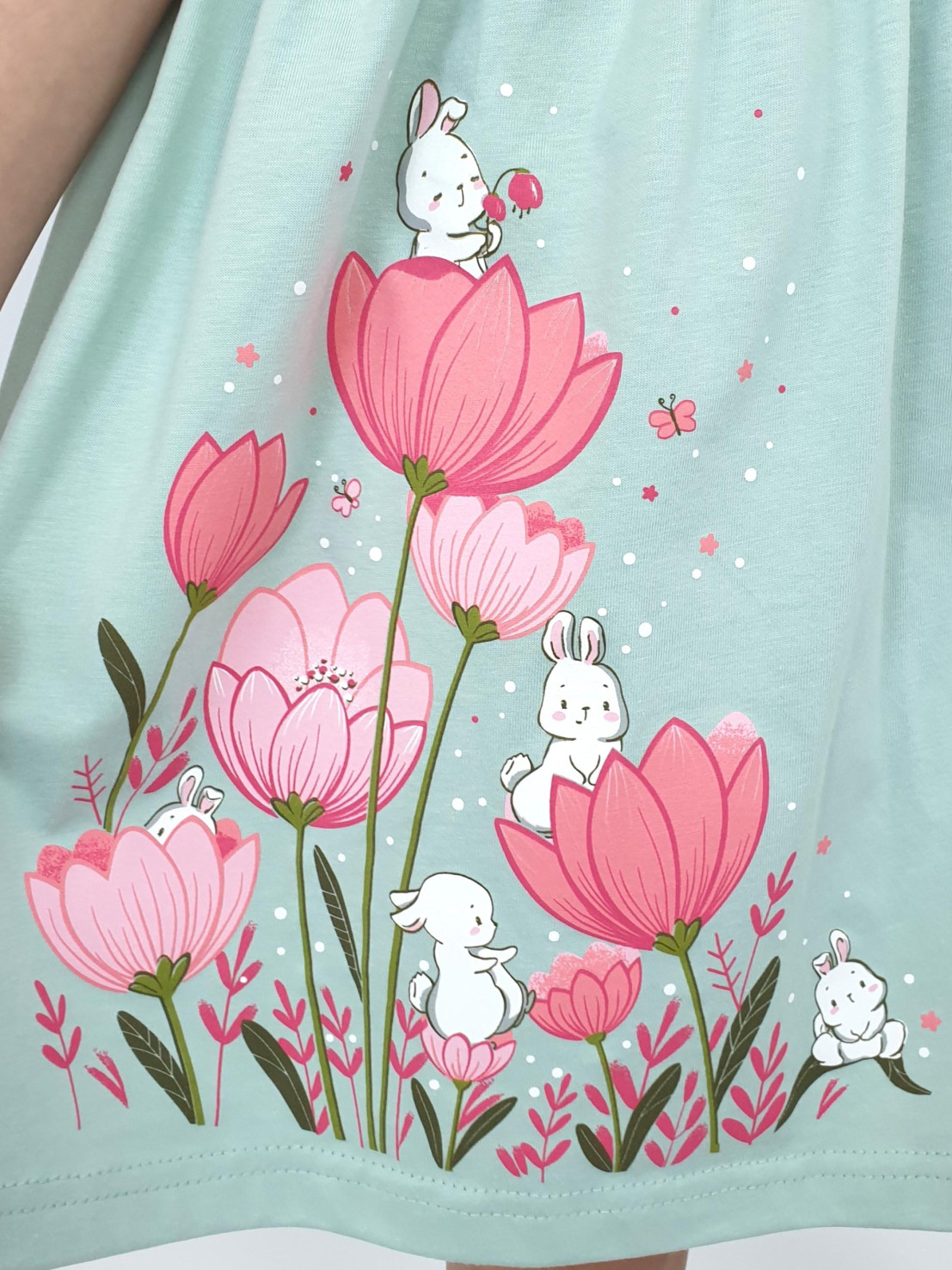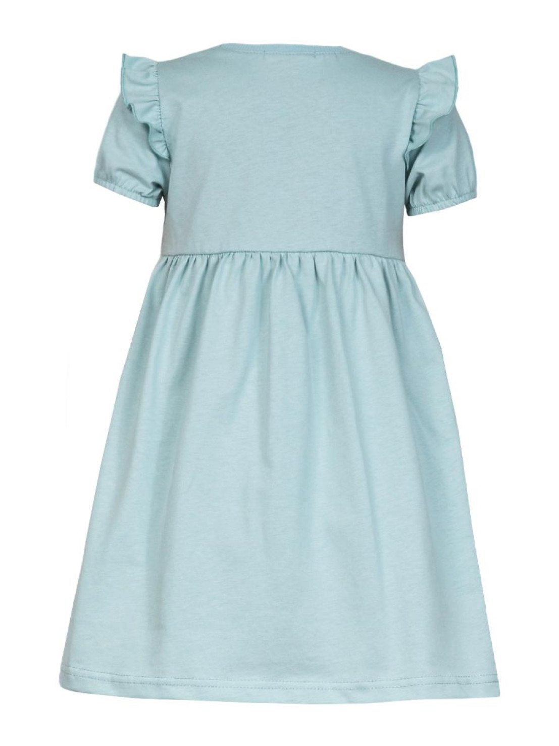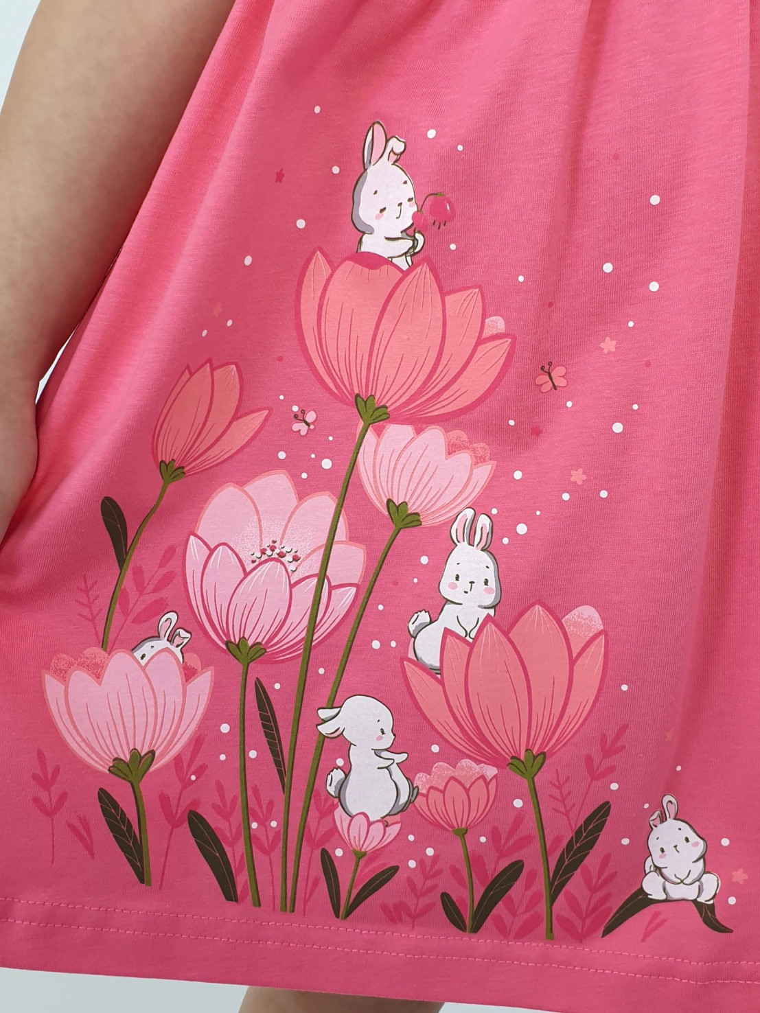 Кулирное полотно:100% х/б. Платье-перед и спинка с кокеткой,сборка по верху юбки.Рукав короткий,внизу собран на резинку,в пройме рюша.Горловина обработана ластиком.Печать на кокетке переда и переднем полотнище юбки.