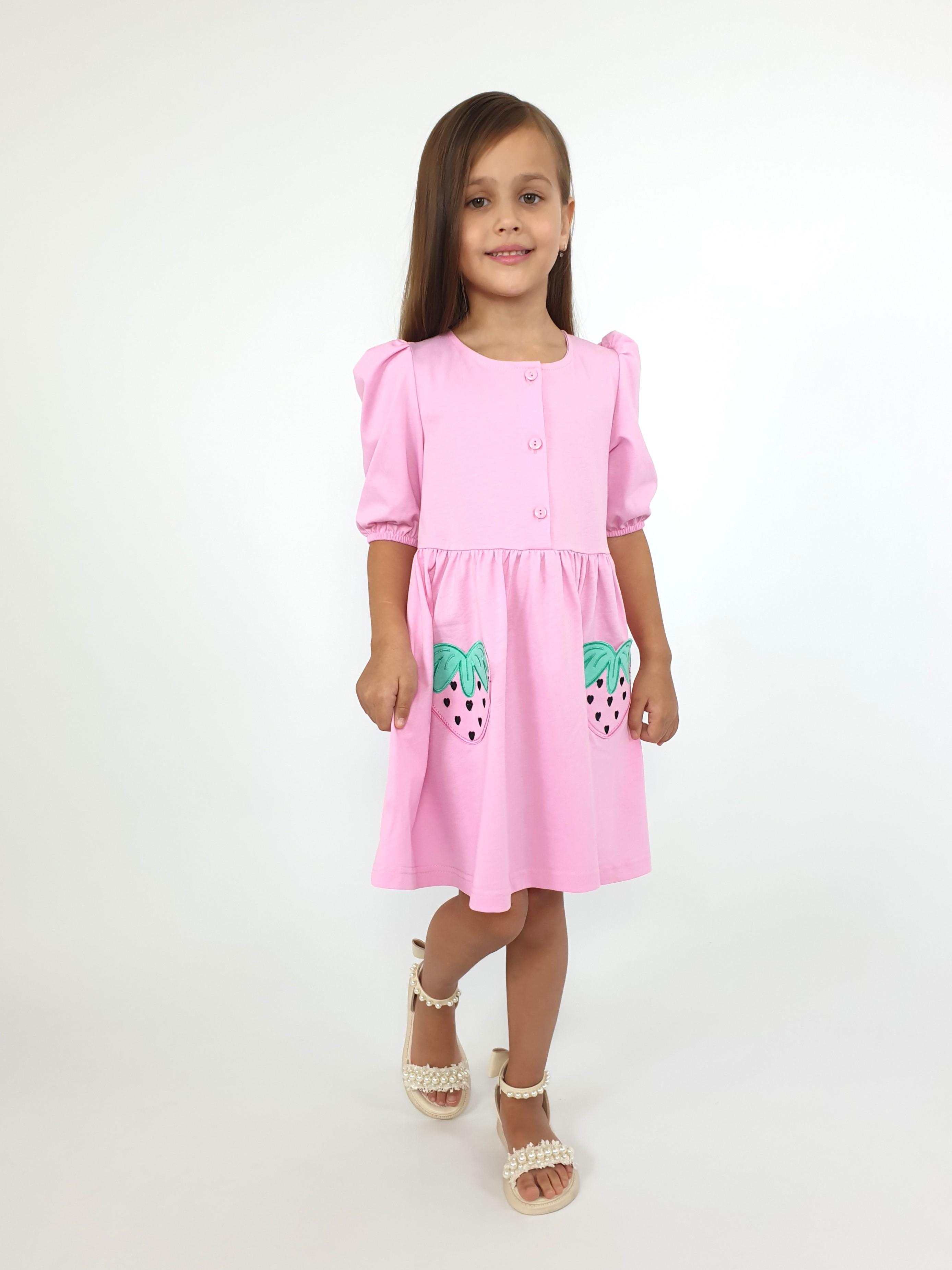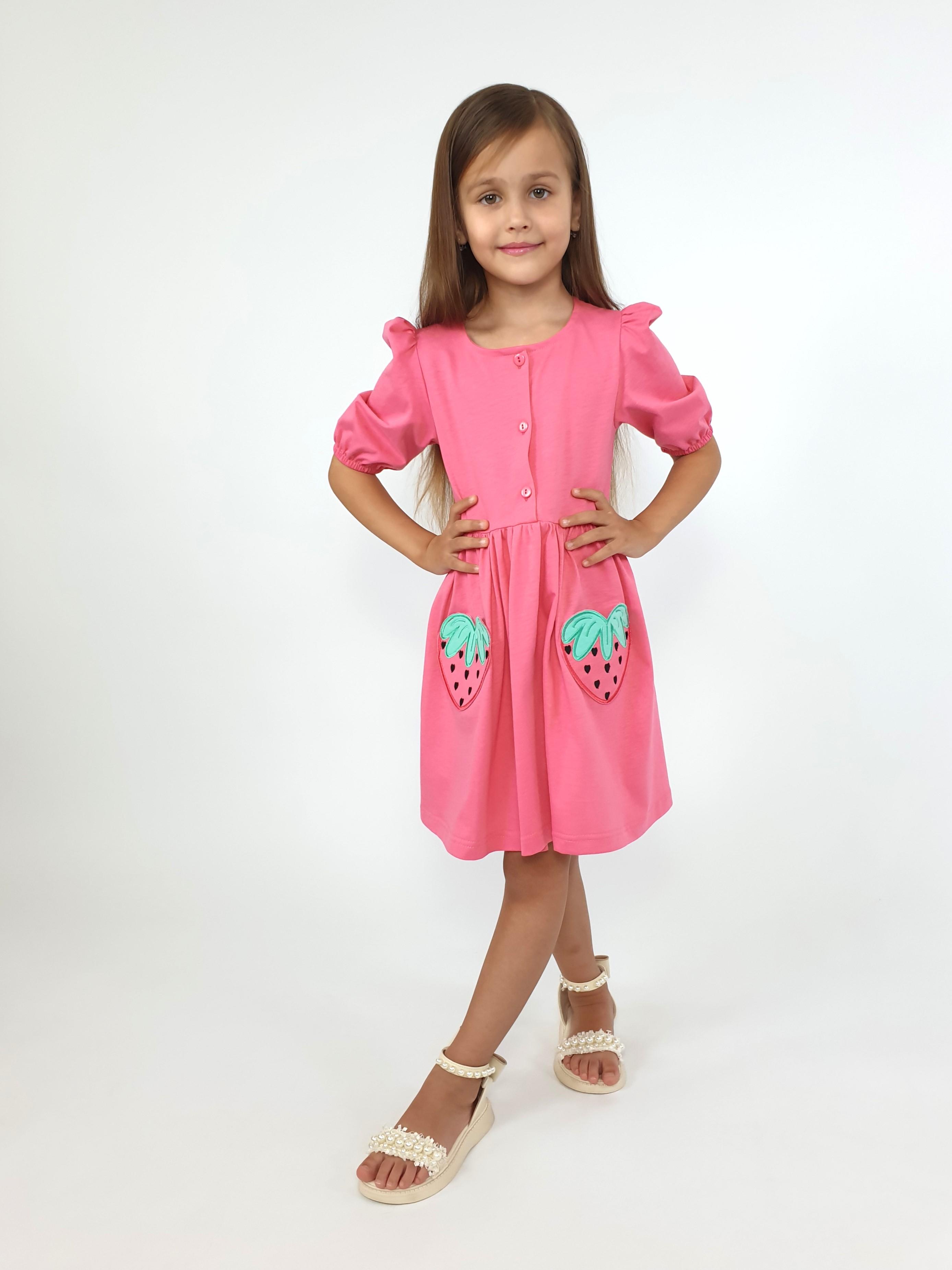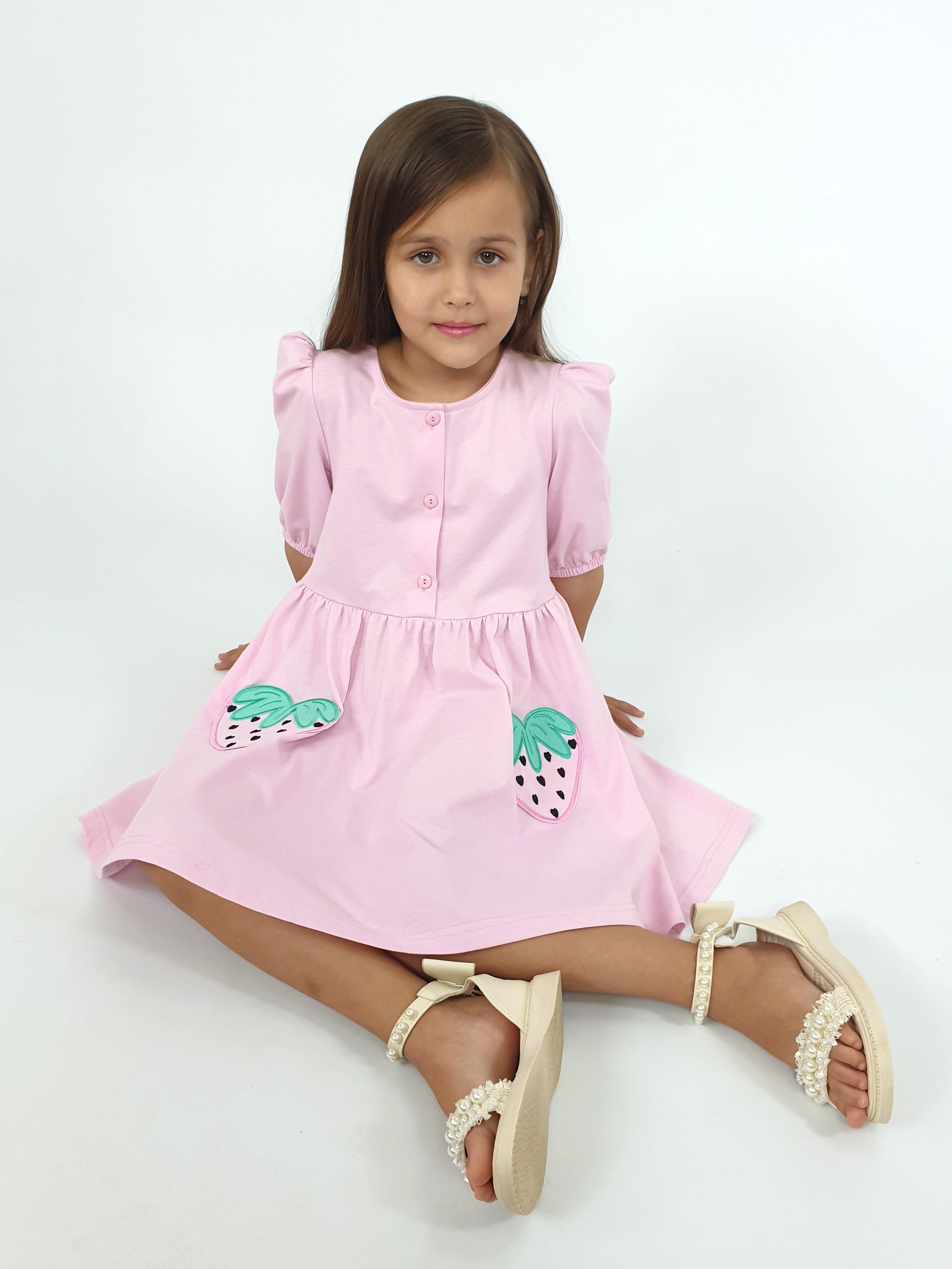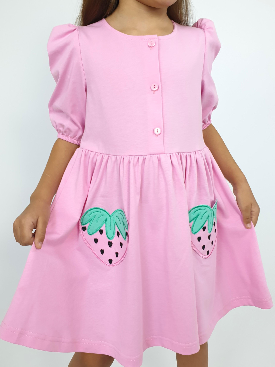 Кулирное полотно:100% х/б. Платье-с отрезной юбкой в сборку,два кармана с вышивкой.Короткий рукав с резинкой внизу,сборка по окату.Горловина окантована и подшита,застежка центральная на пуговицы.
