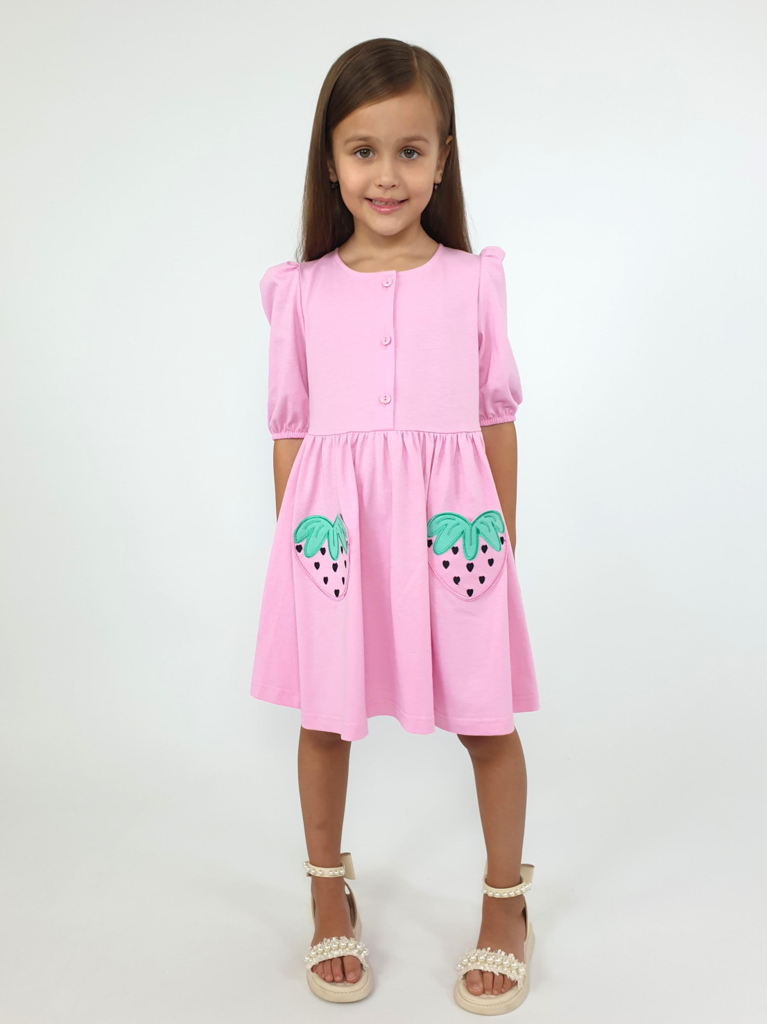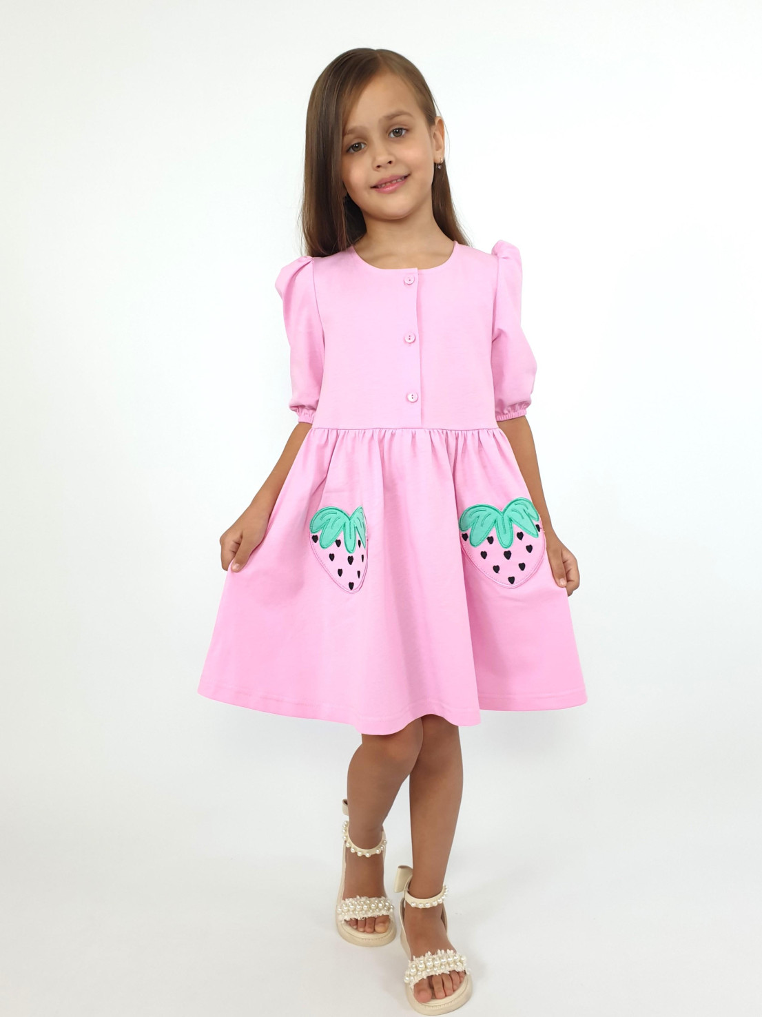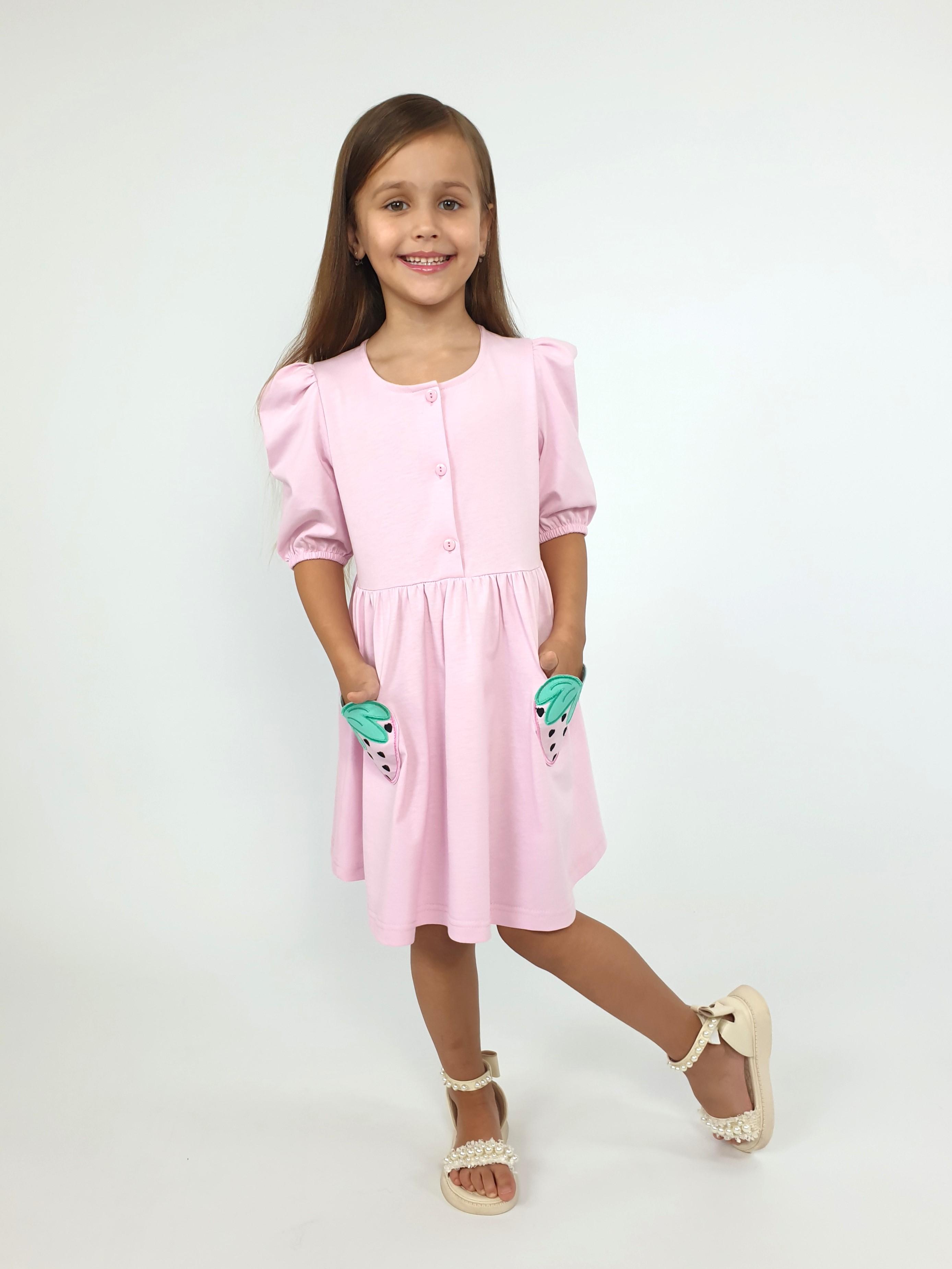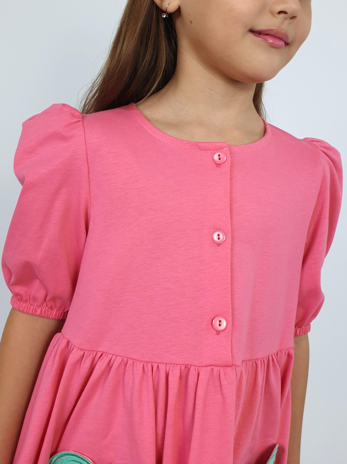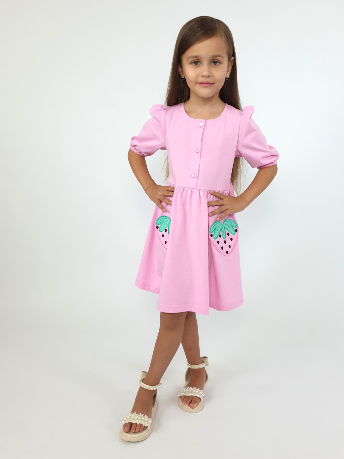 Кулирное полотно:100% х/б. Платье-с отрезной юбкой в сборку,два кармана с вышивкой.Короткий рукав с резинкой внизу,сборка по окату.Горловина окантована и подшита,застежка центральная на пуговицы.