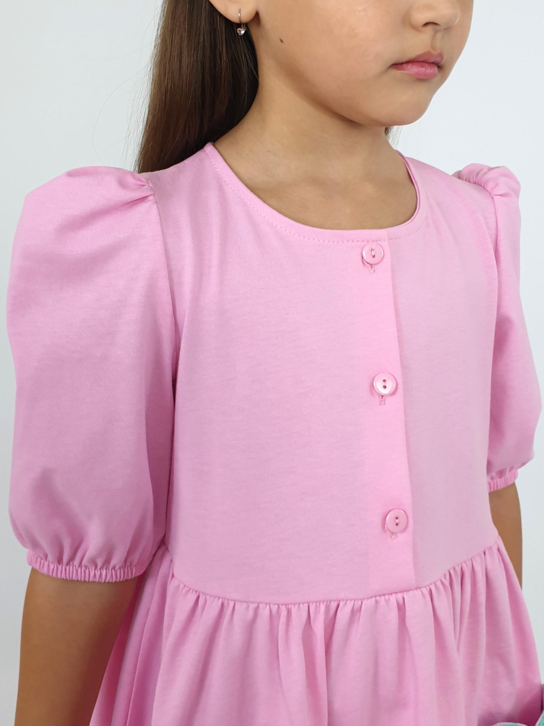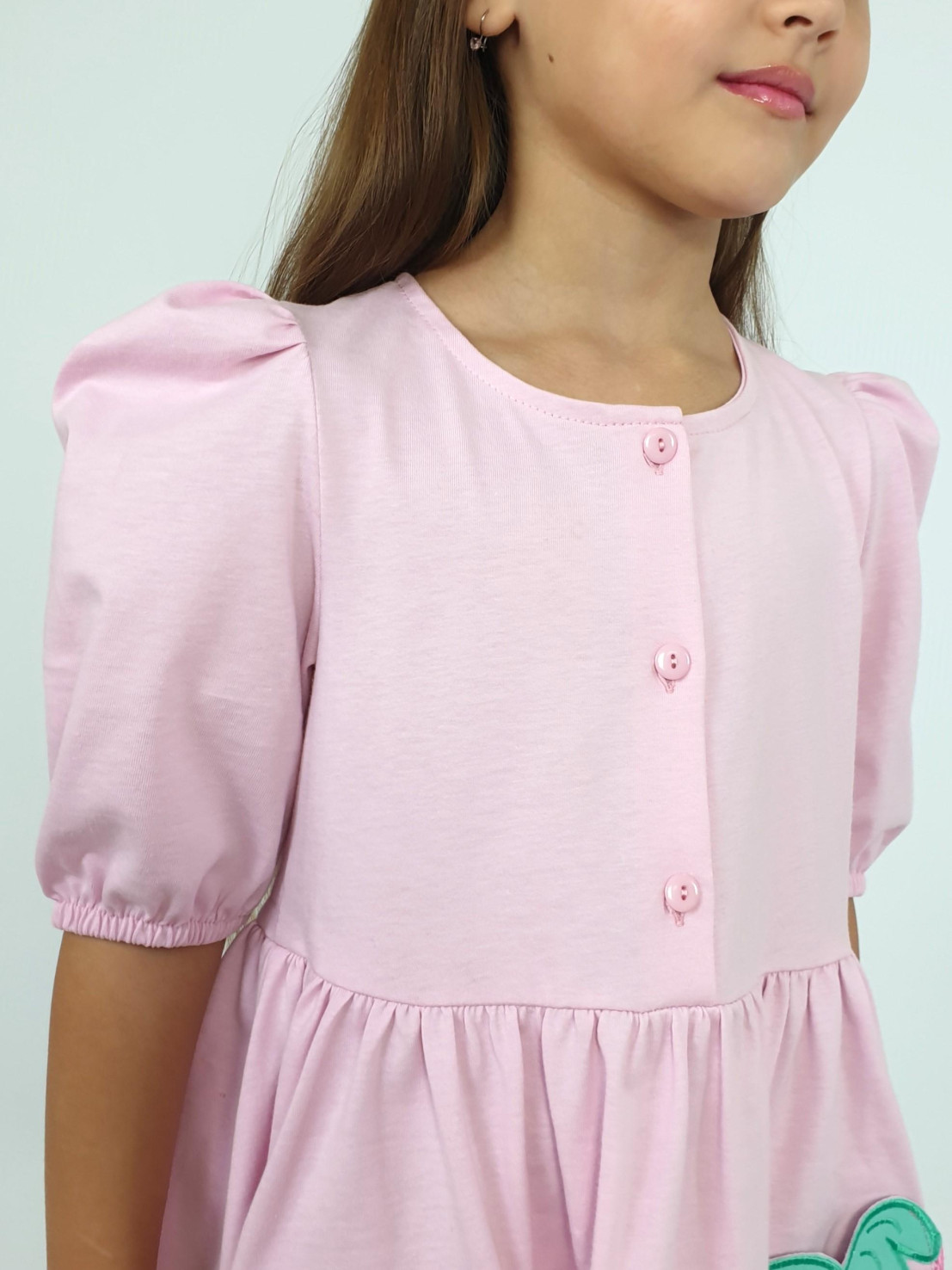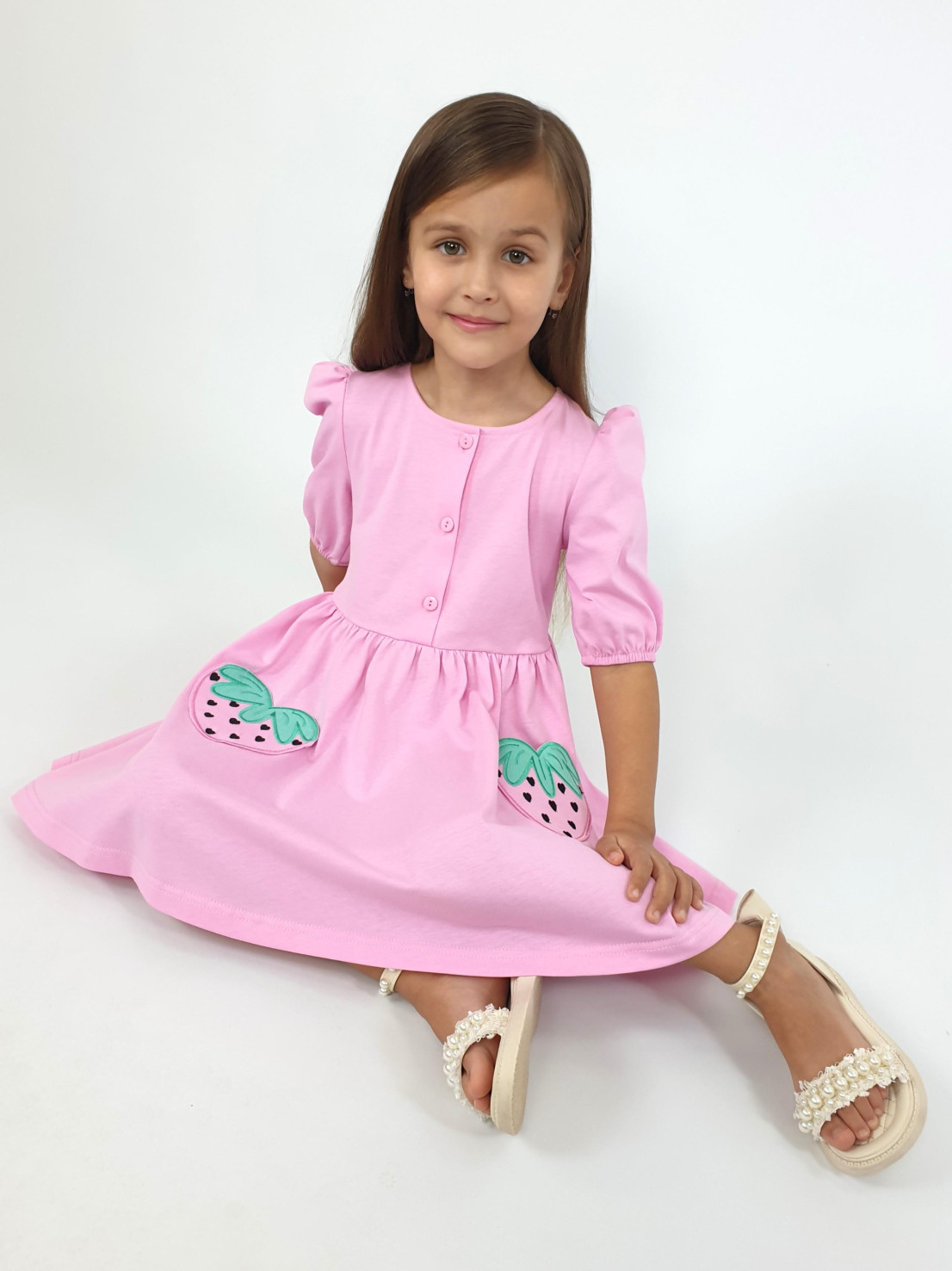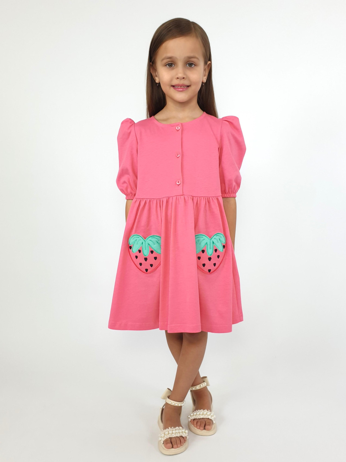Кулирное полотно:100% х/б. Платье-с отрезной юбкой в сборку,два кармана с вышивкой.Короткий рукав с резинкой внизу,сборка по окату.Горловина окантована и подшита,застежка центральная на пуговицы.