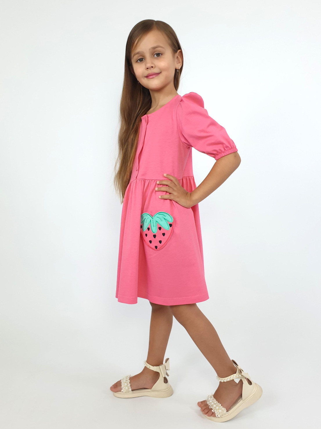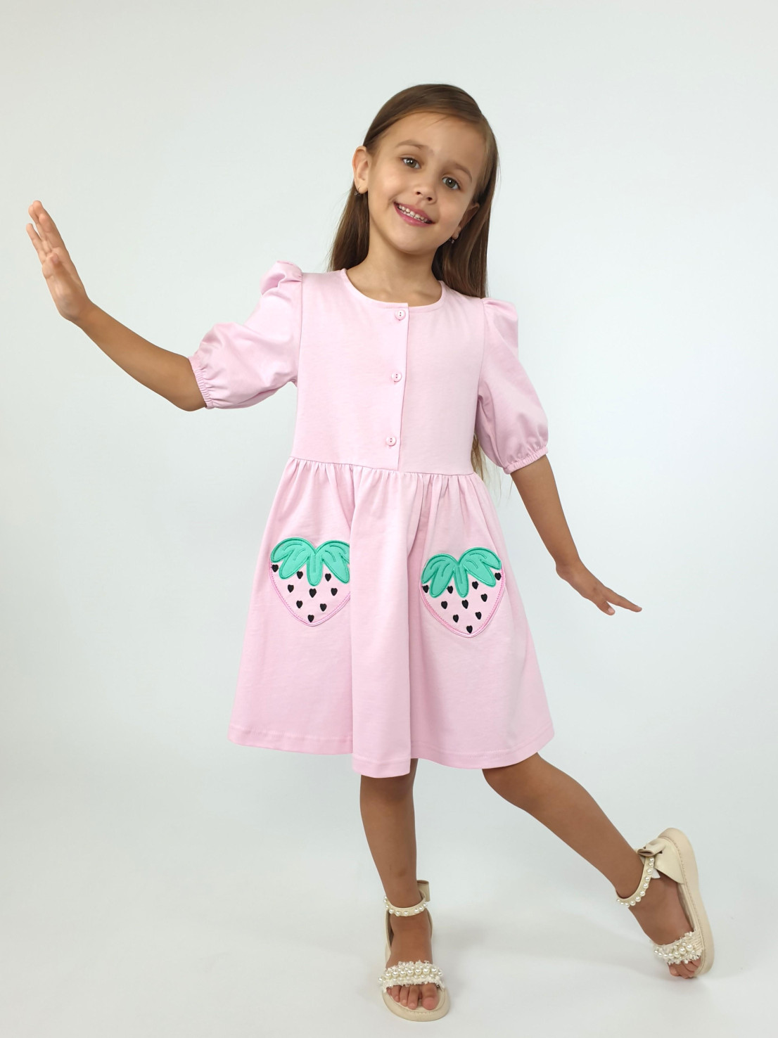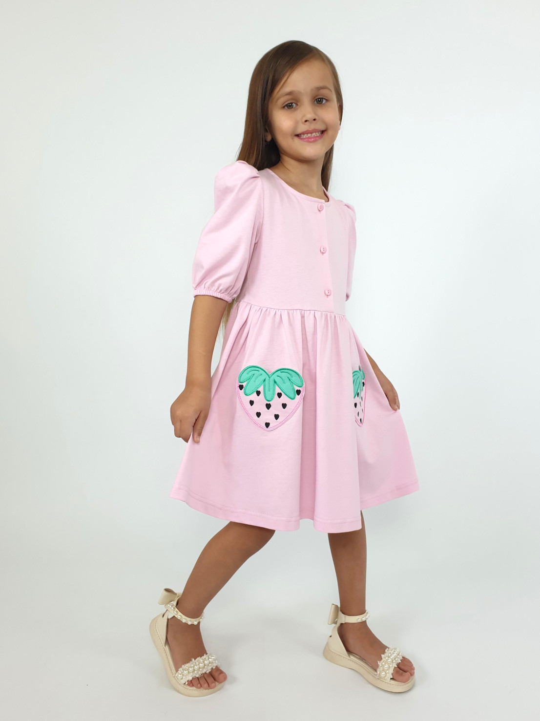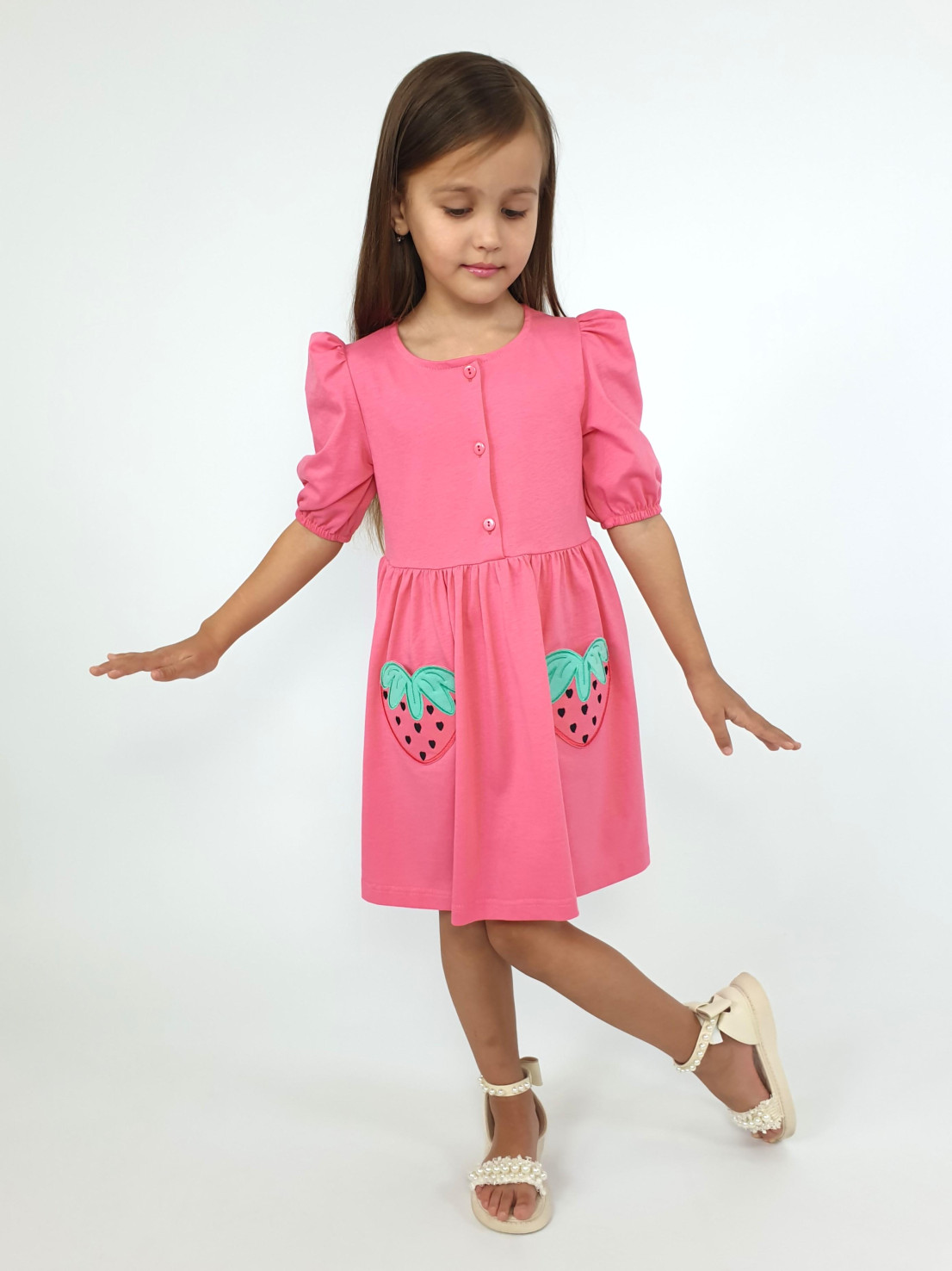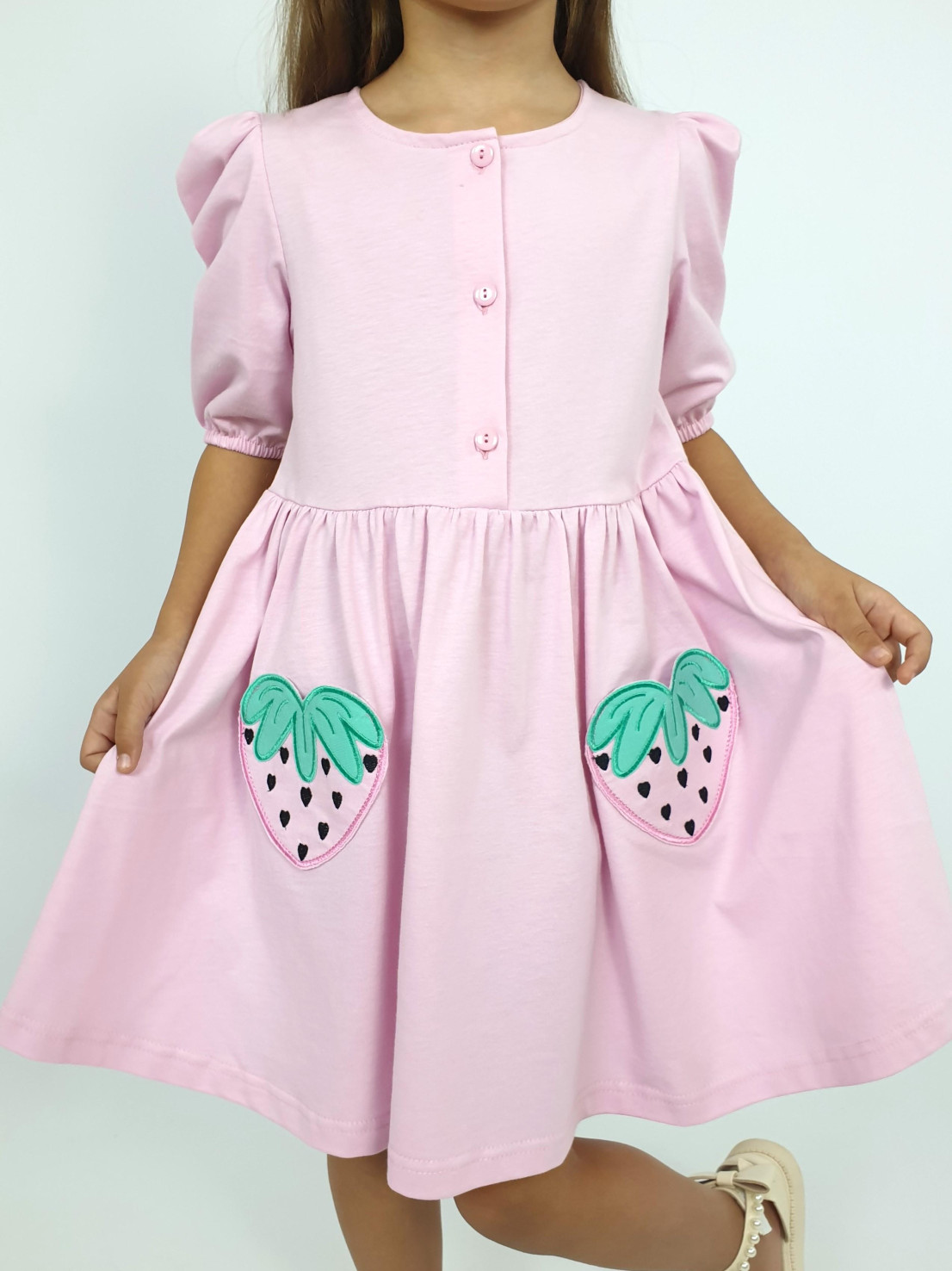 Кулирное полотно:100% х/б. Платье-с отрезной юбкой в сборку,два кармана с вышивкой.Короткий рукав с резинкой внизу,сборка по окату.Горловина окантована и подшита,застежка центральная на пуговицы.