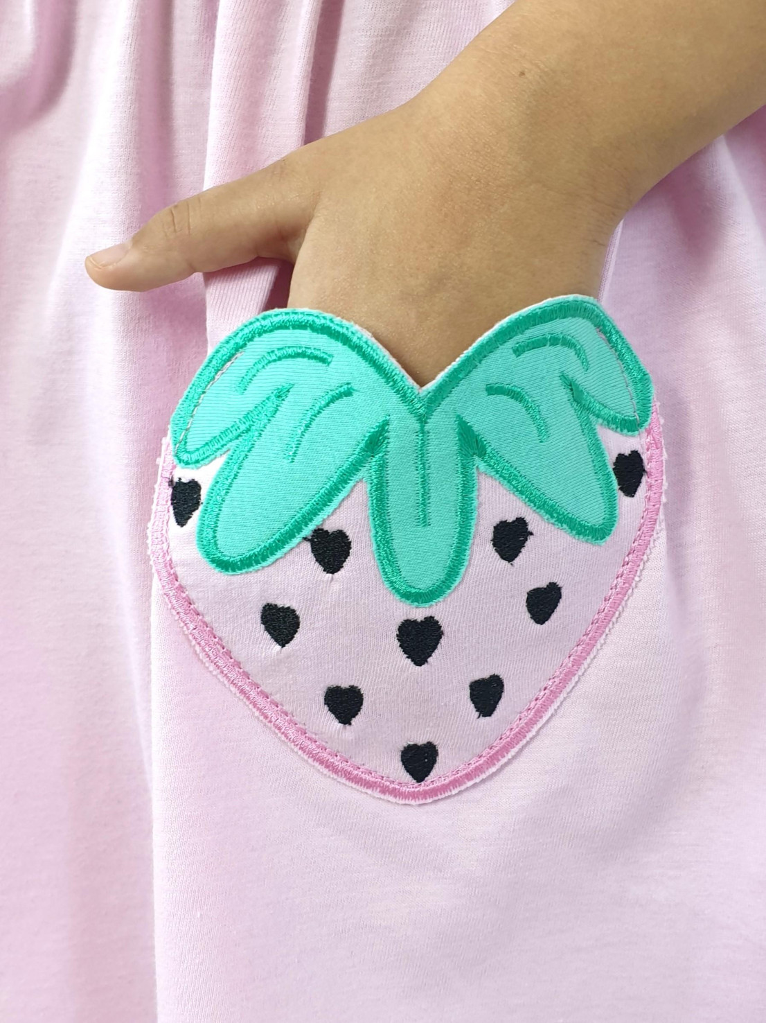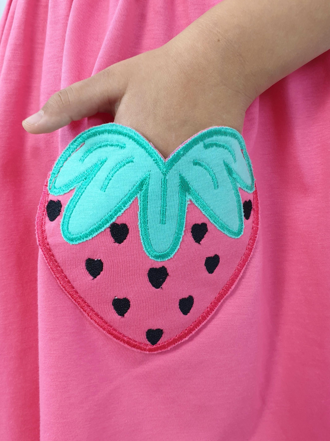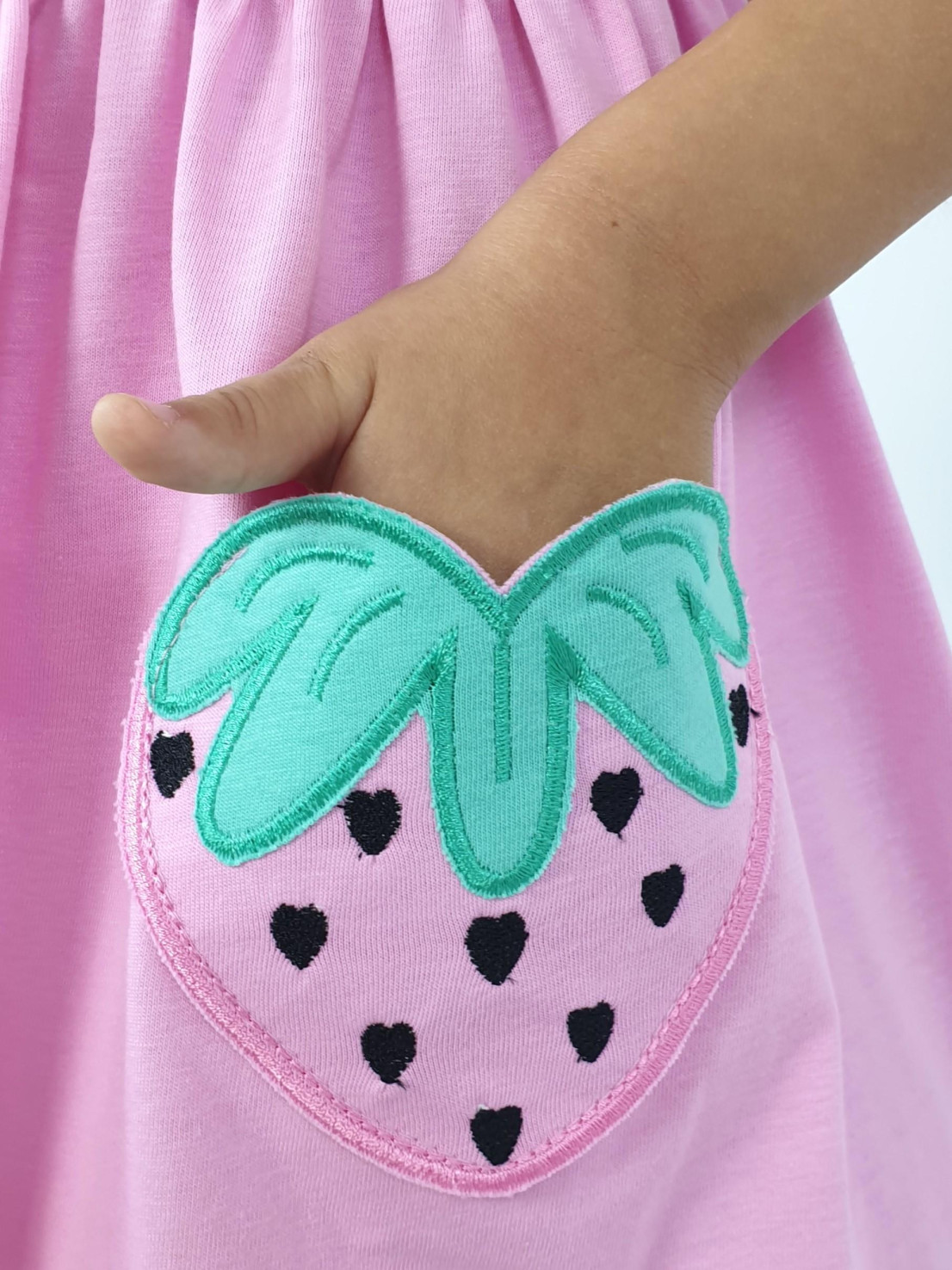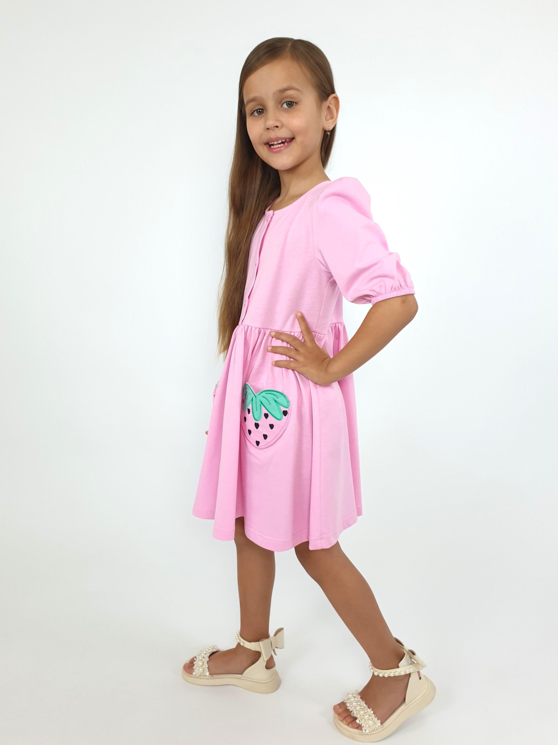 Кулирное полотно:100% х/б. Платье-с отрезной юбкой в сборку,два кармана с вышивкой.Короткий рукав с резинкой внизу,сборка по окату.Горловина окантована и подшита,застежка центральная на пуговицы.