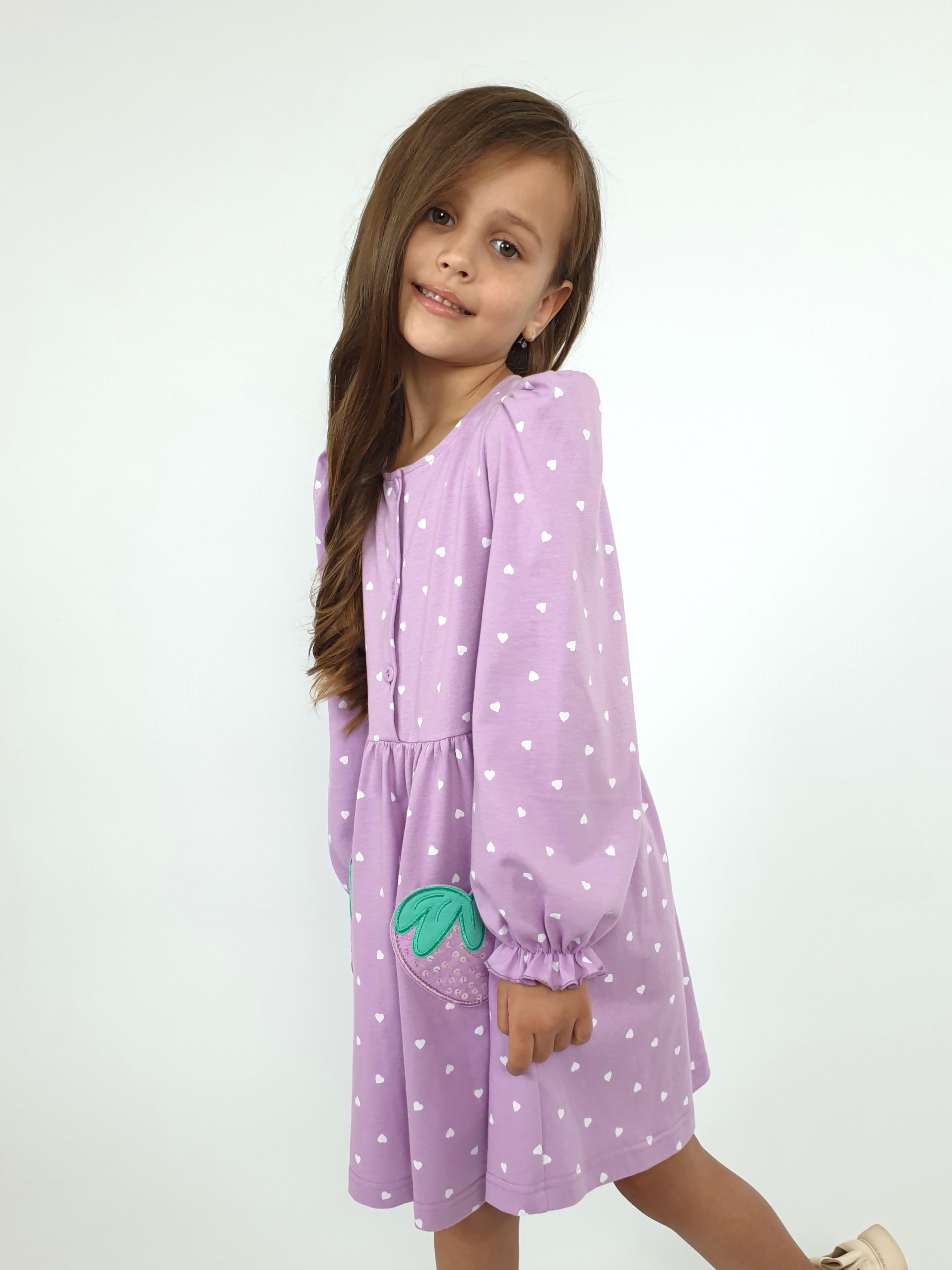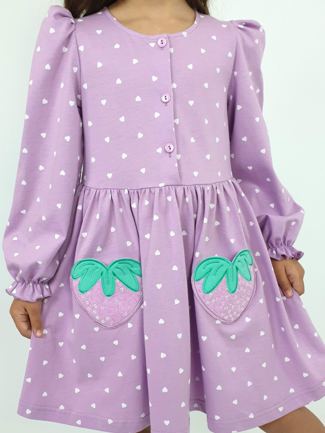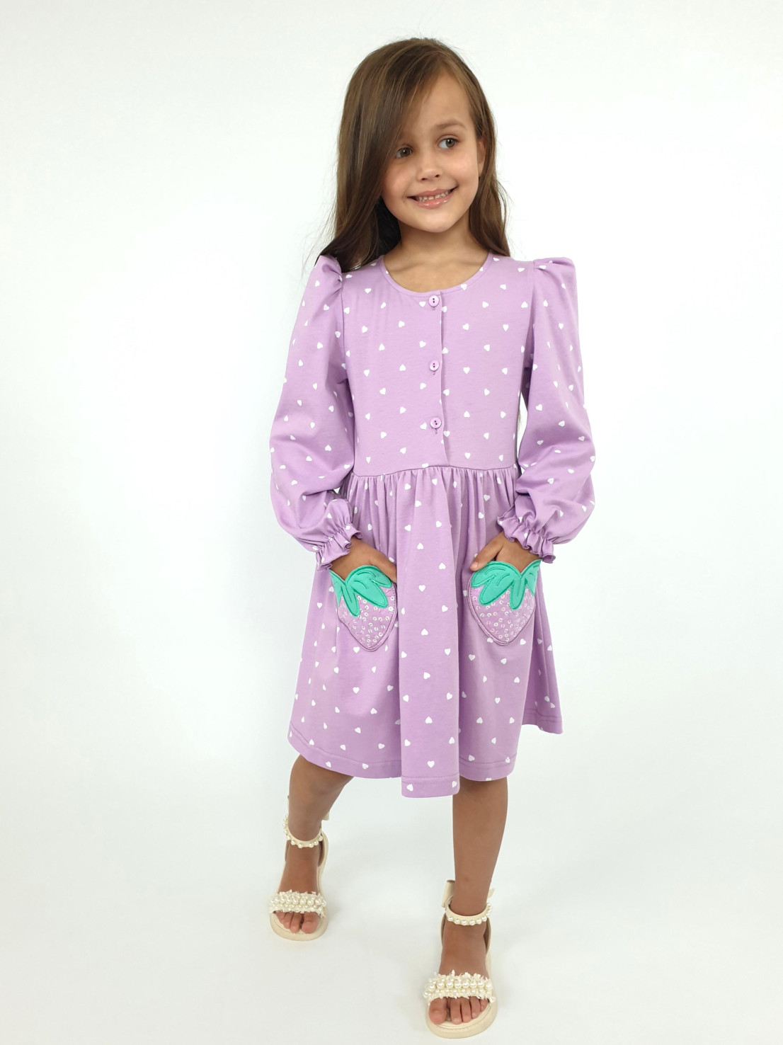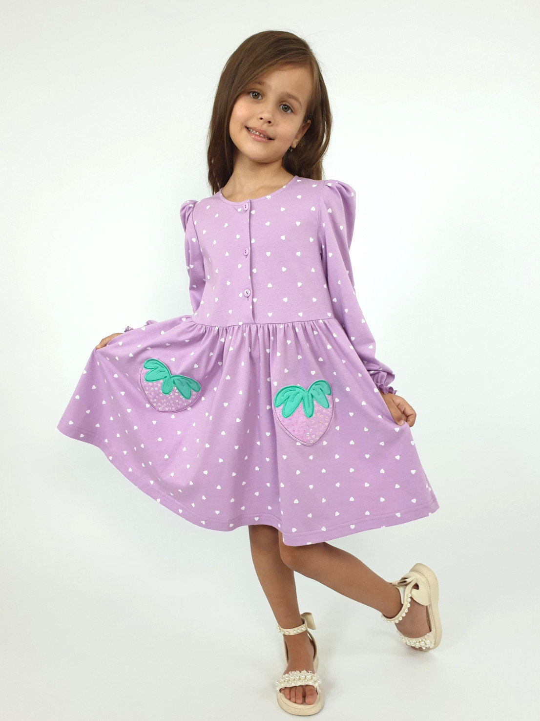 Кулирное полотно (набивка):100% х/б. Платье-с отрезной юбкой в сборку,два кармана с вышивкой(пайетки).Длинный рукав с резинкой внизу,сборка по окату.Горловина окантована и подшита,застежка центральная на пуговицы.