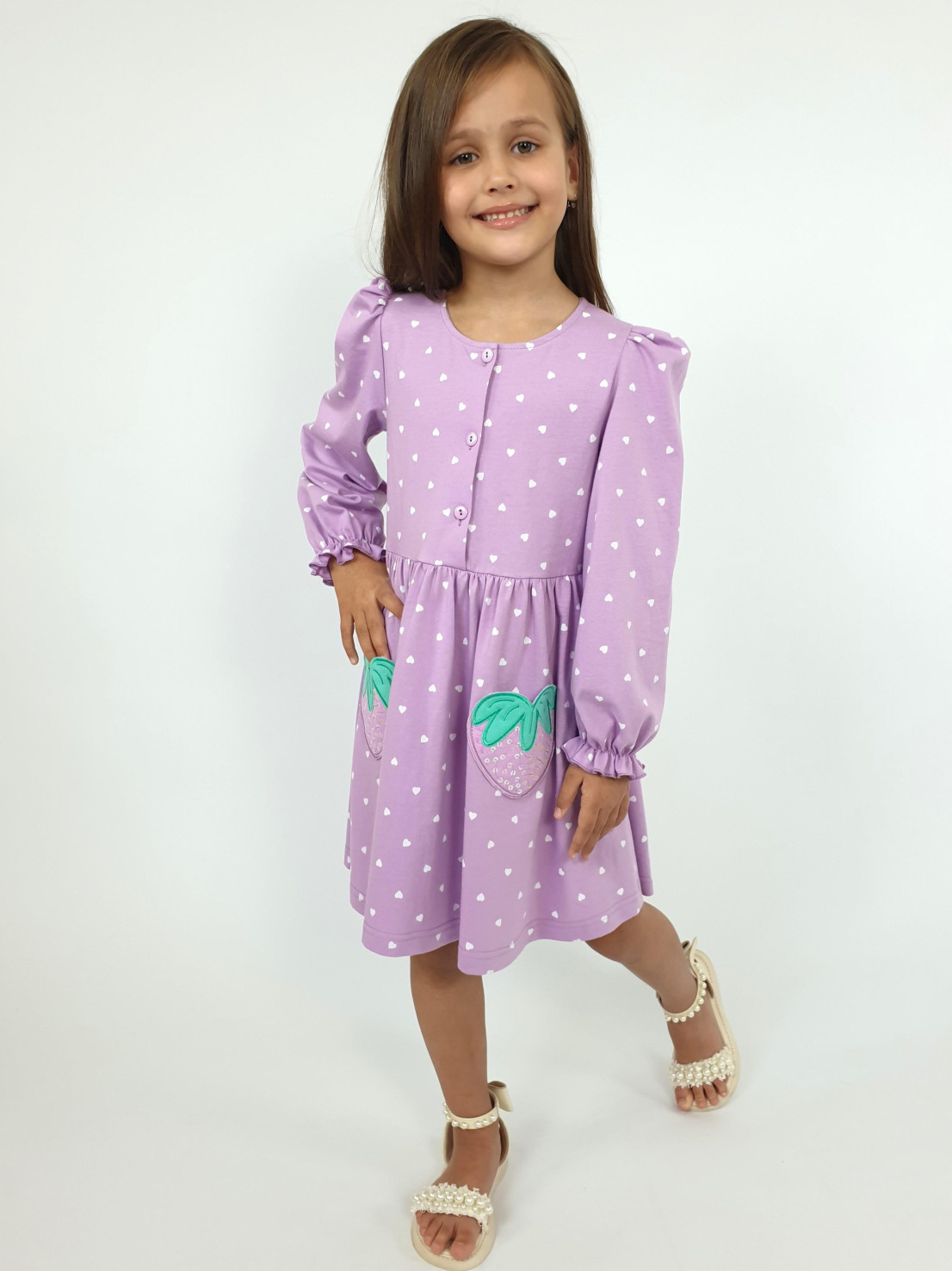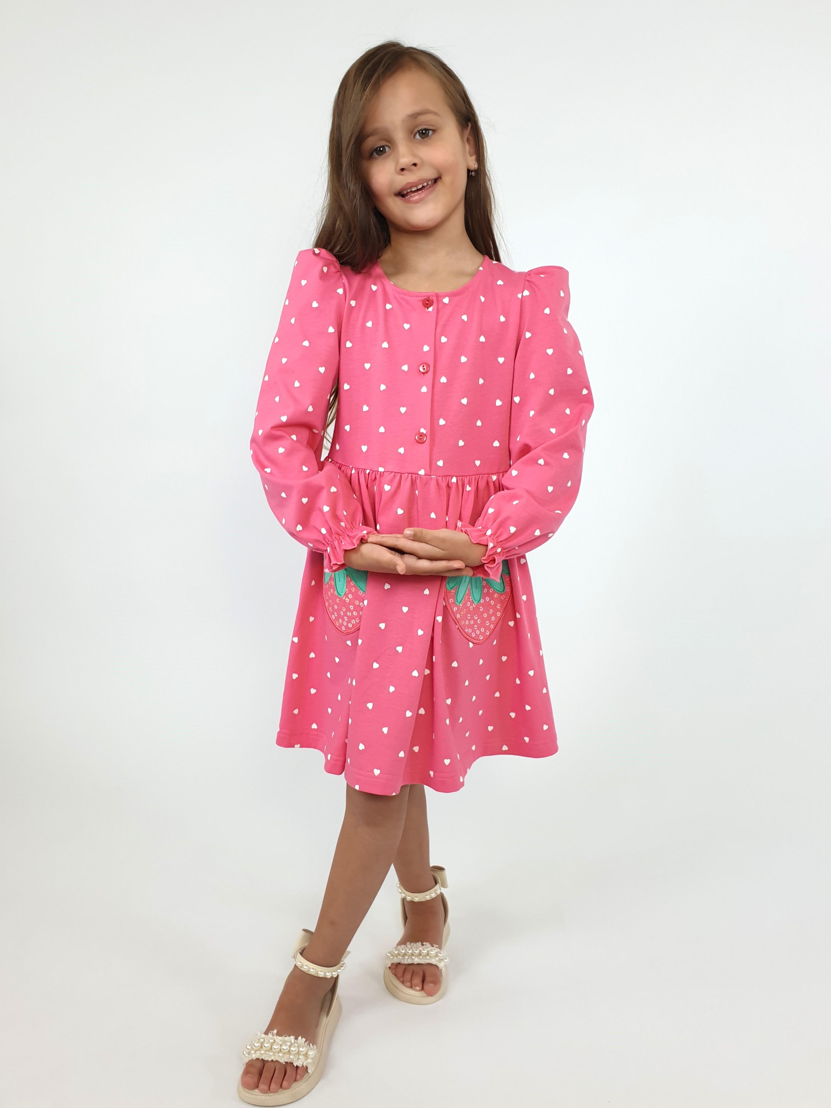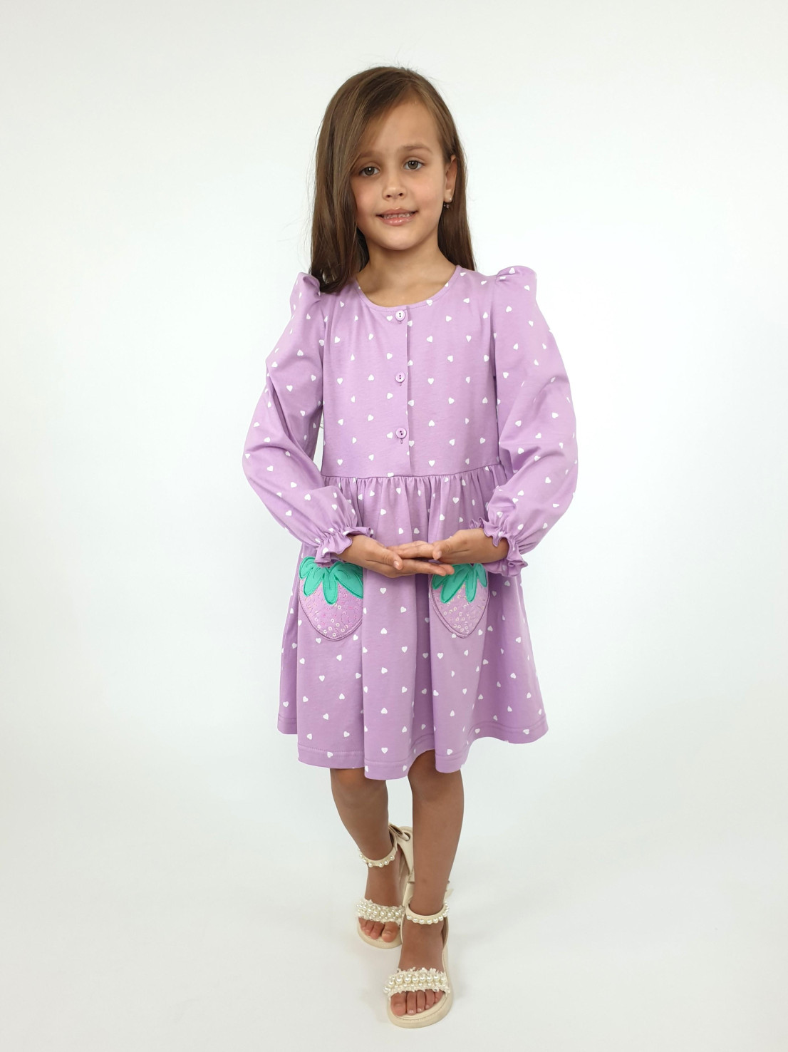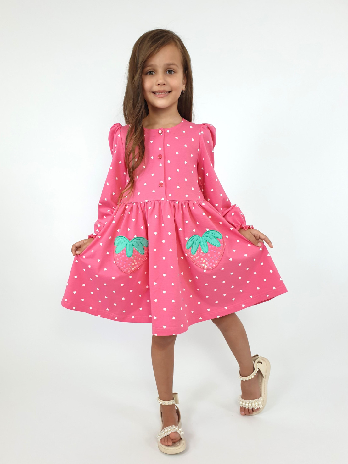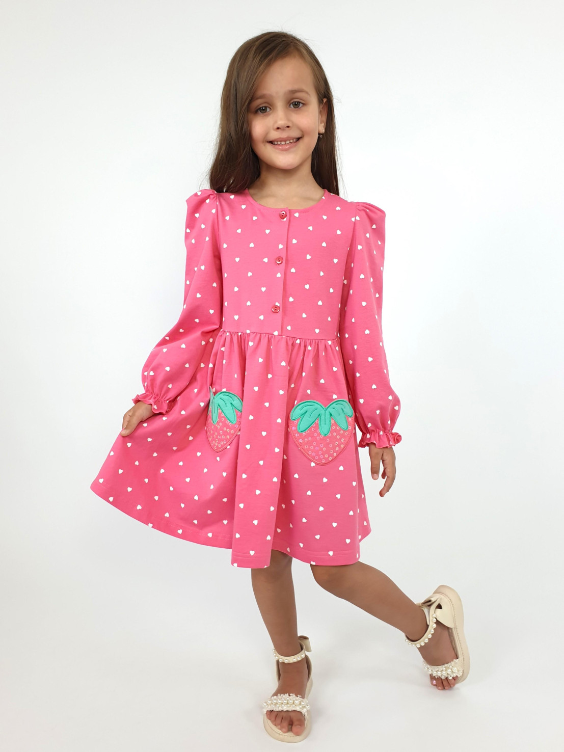 Кулирное полотно (набивка):100% х/б. Платье-с отрезной юбкой в сборку,два кармана с вышивкой(пайетки).Длинный рукав с резинкой внизу,сборка по окату.Горловина окантована и подшита,застежка центральная на пуговицы.