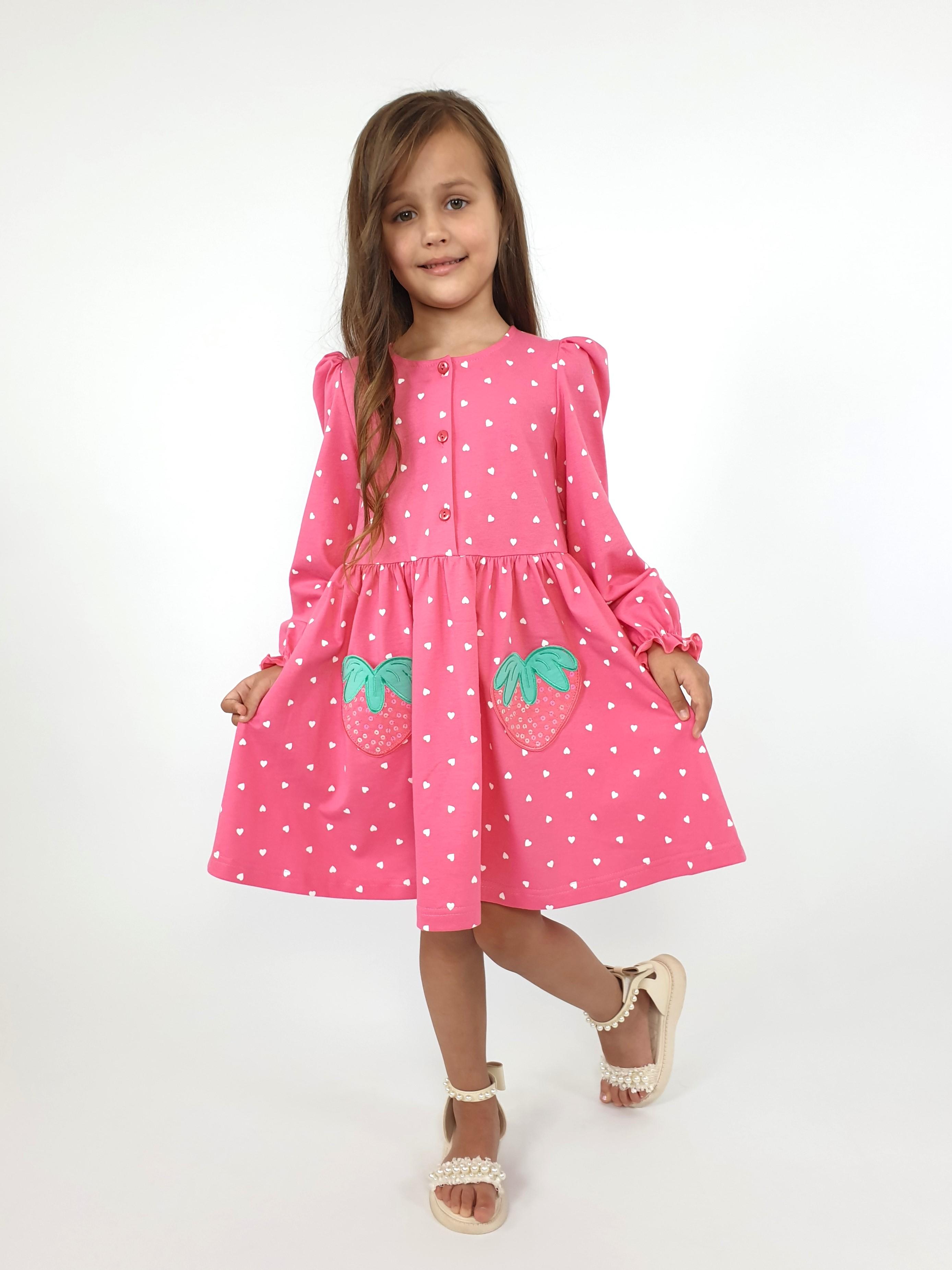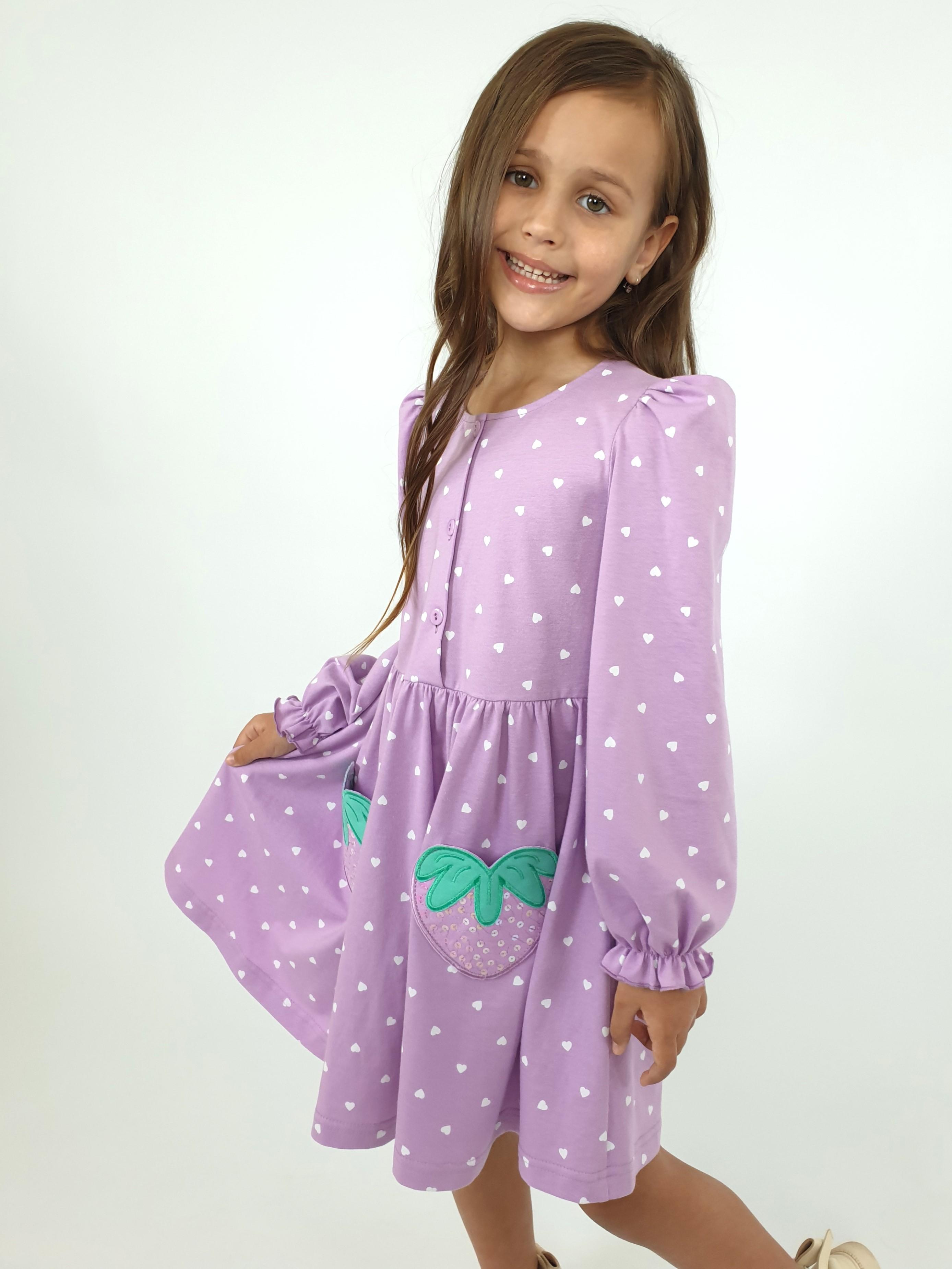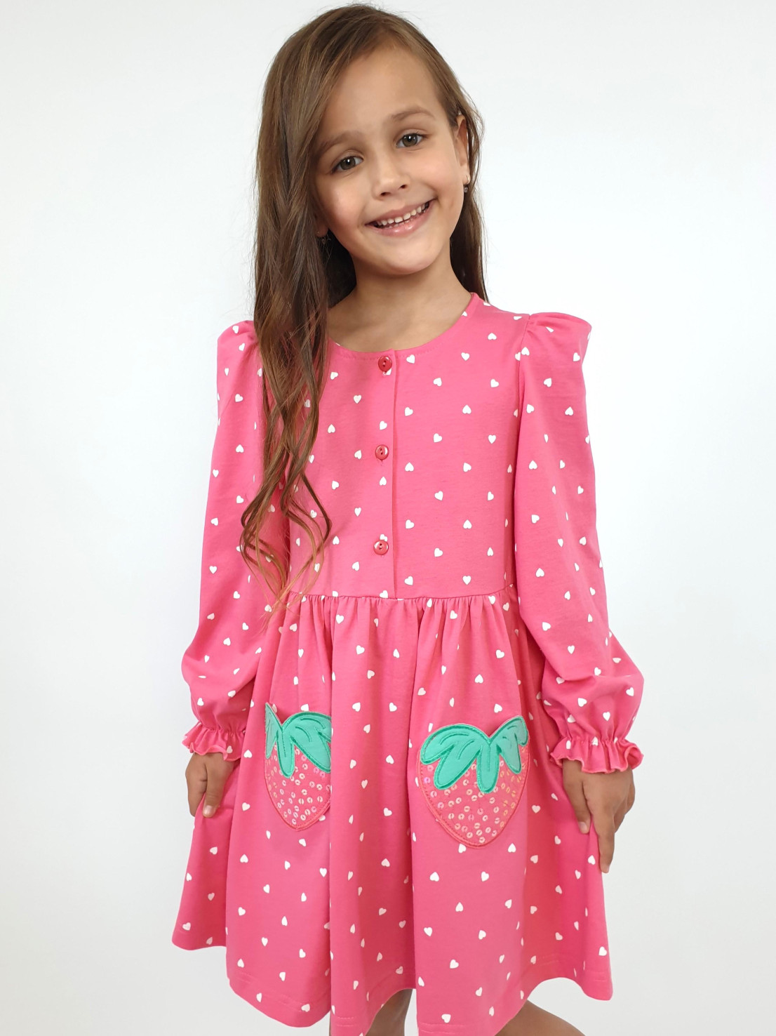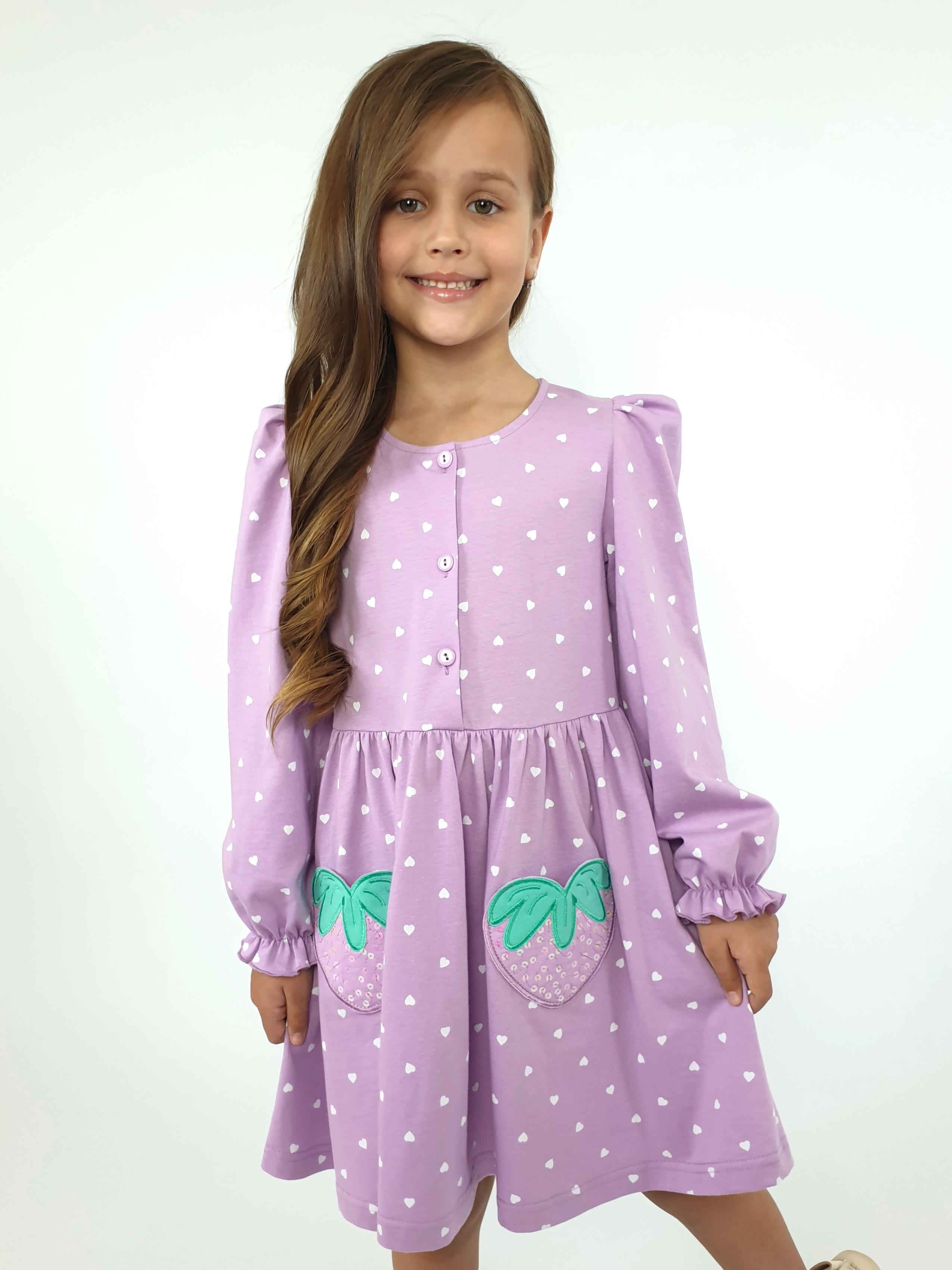 Кулирное полотно (набивка):100% х/б. Платье-с отрезной юбкой в сборку,два кармана с вышивкой(пайетки).Длинный рукав с резинкой внизу,сборка по окату.Горловина окантована и подшита,застежка центральная на пуговицы.